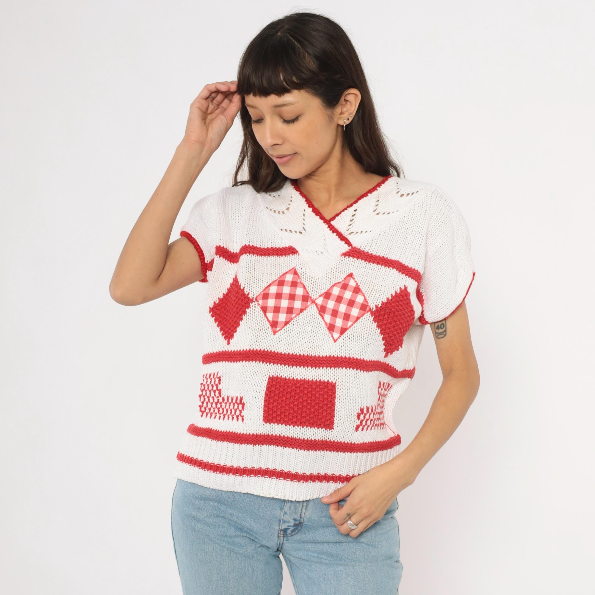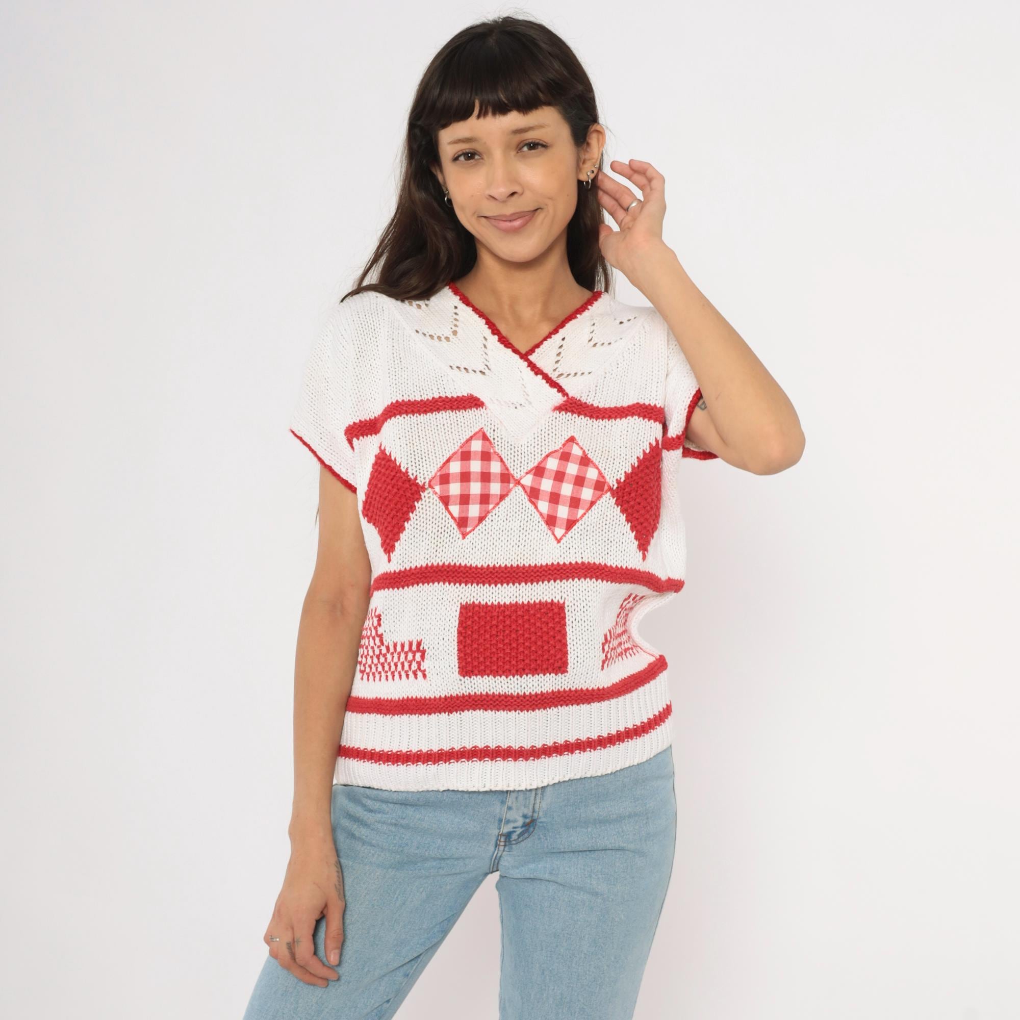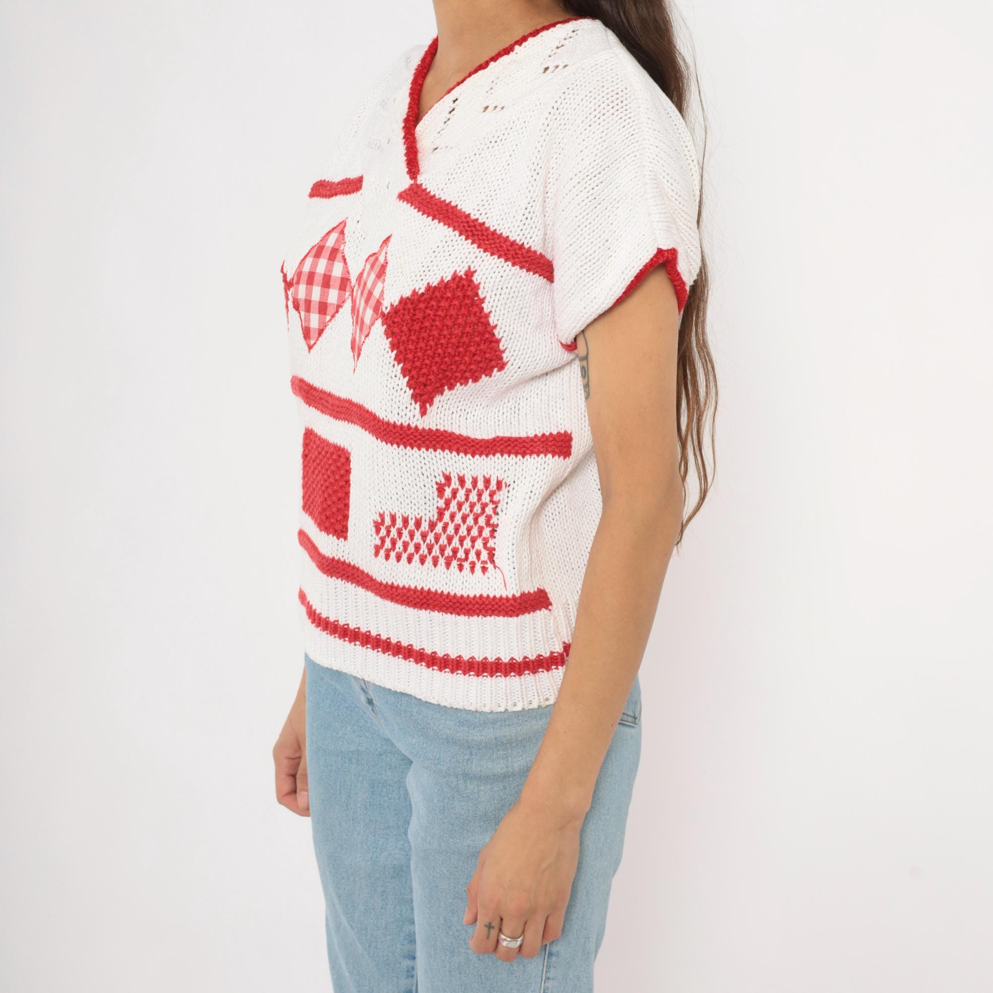 80s white and red knit top from SML Sport with a crossover V-neckline trimmed in red. Two gingham fabric diamond patches sit at the chest, surrounded by red knit geometric shapes, a red square pocket detail, and horizontal red stripes. Short cap sleeves with red edging, open pointelle knit detail across the upper chest and shoulders, and a ribbed hem with red accent stripe.