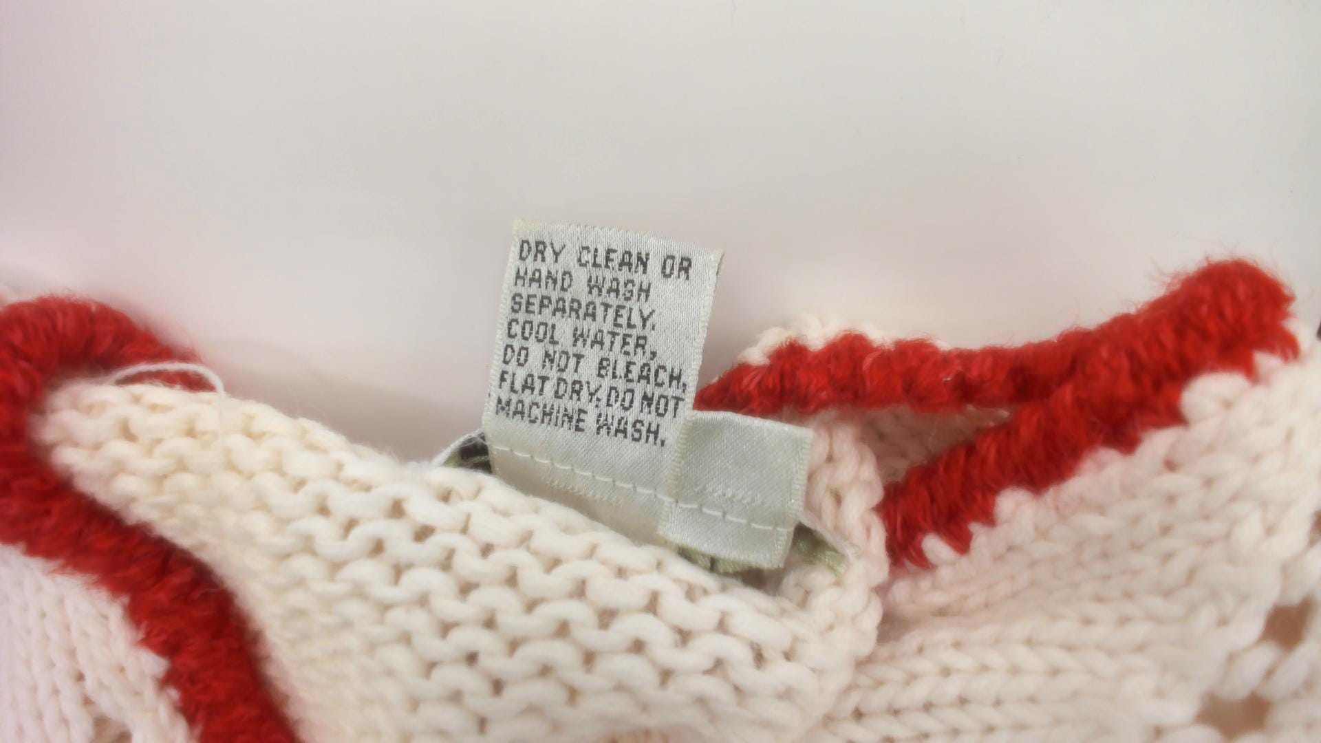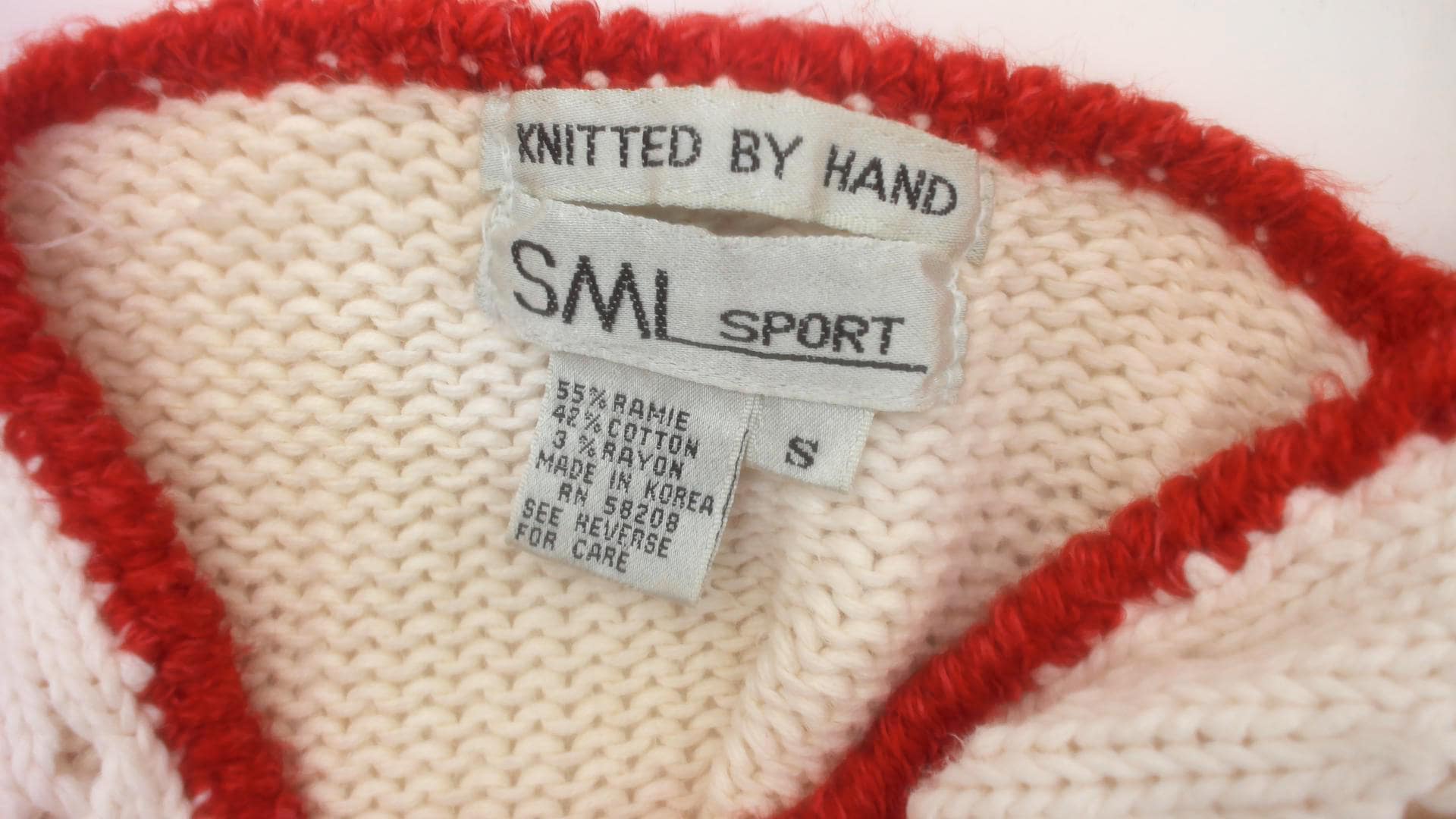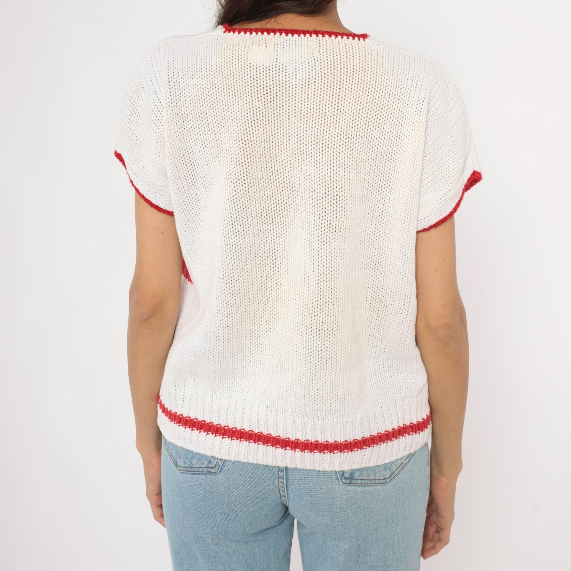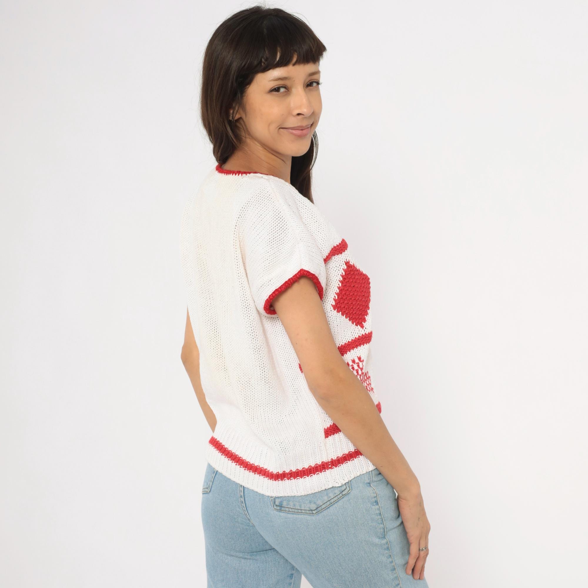 80s white and red knit top from SML Sport with a crossover V-neckline trimmed in red. Two gingham fabric diamond patches sit at the chest, surrounded by red knit geometric shapes, a red square pocket detail, and horizontal red stripes. Short cap sleeves with red edging, open pointelle knit detail across the upper chest and shoulders, and a ribbed hem with red accent stripe.