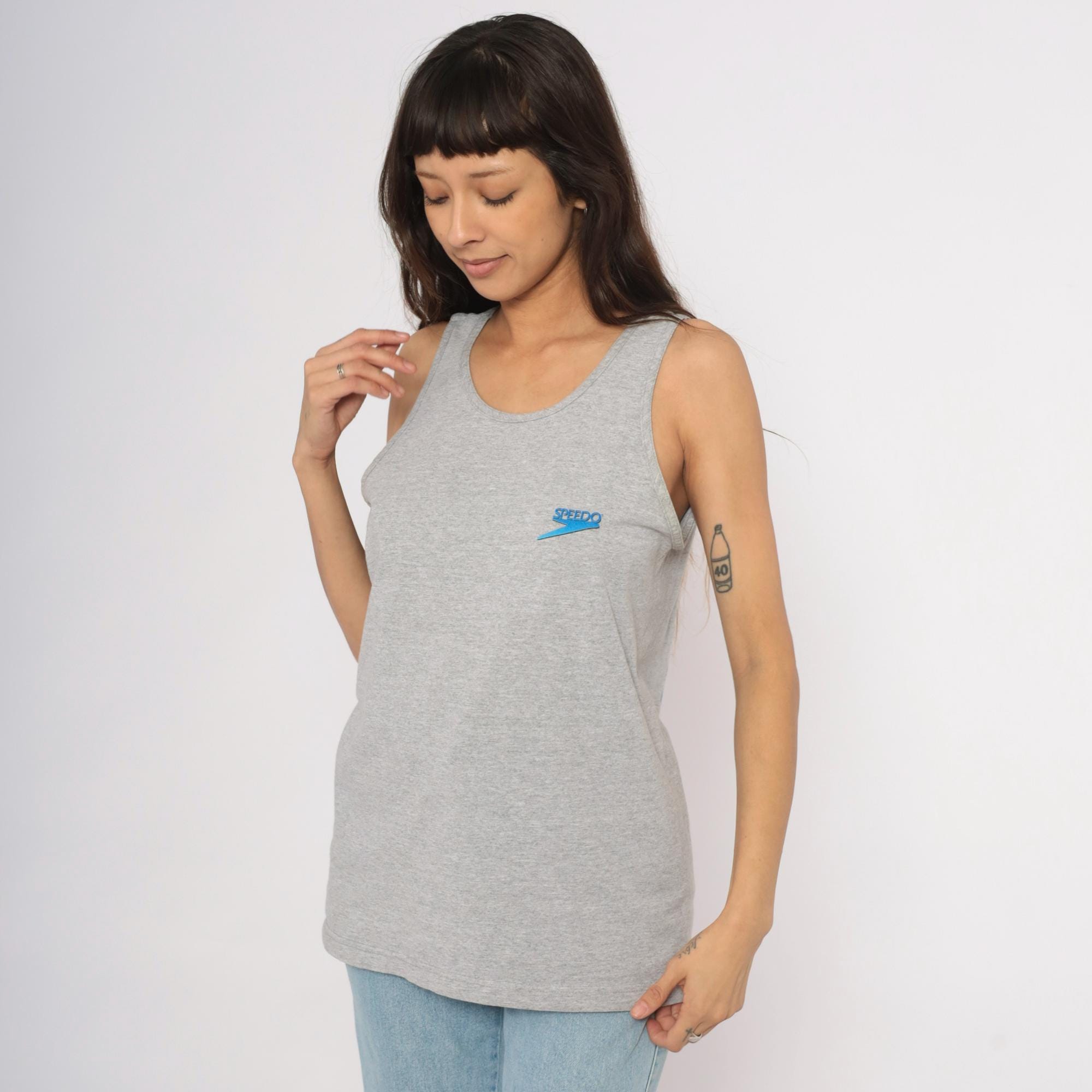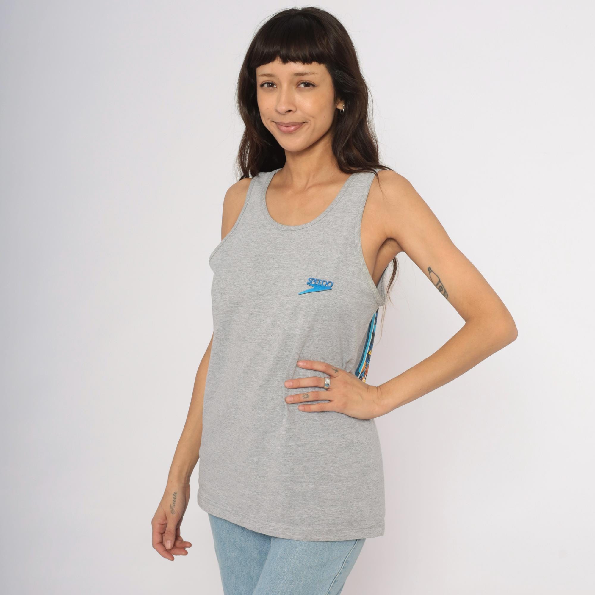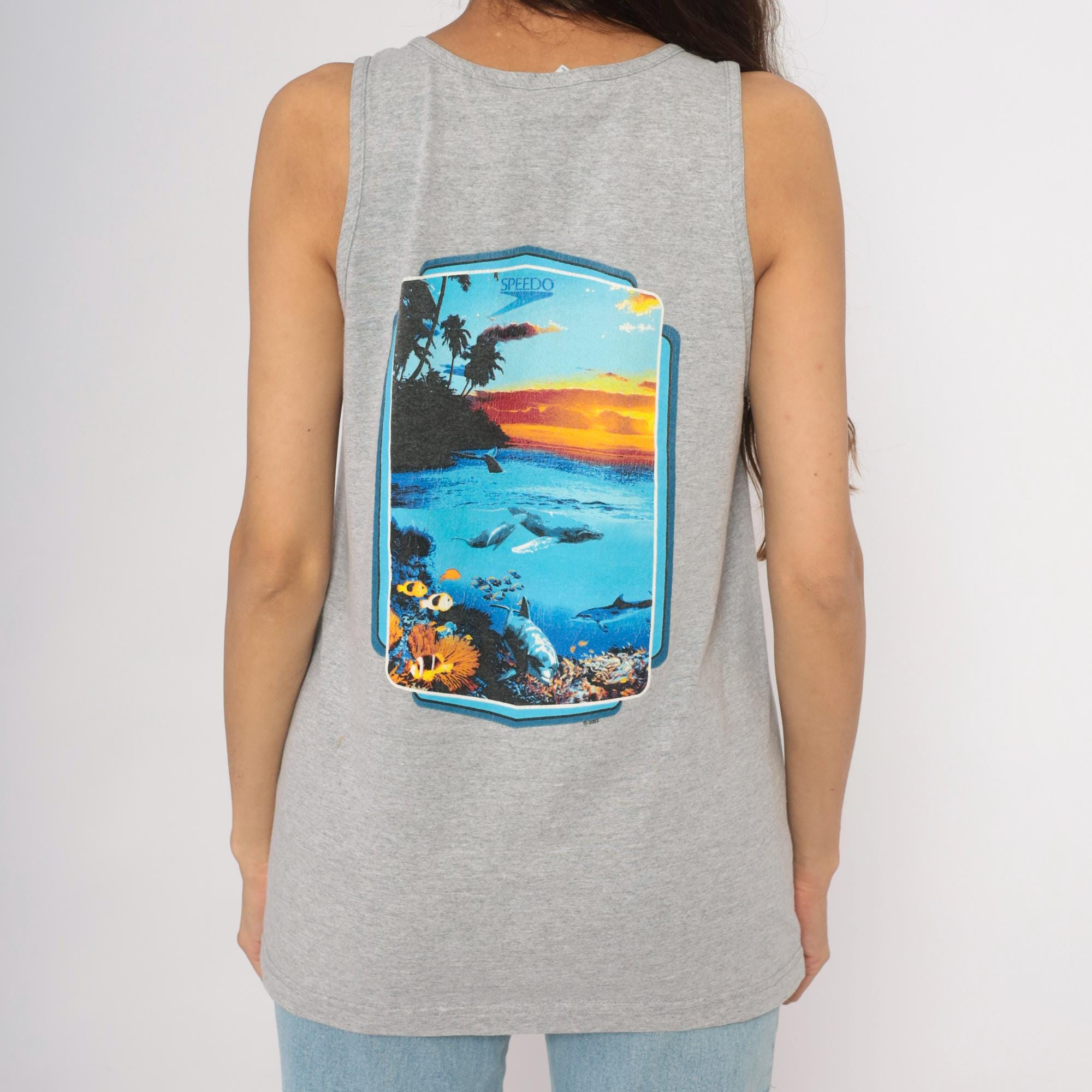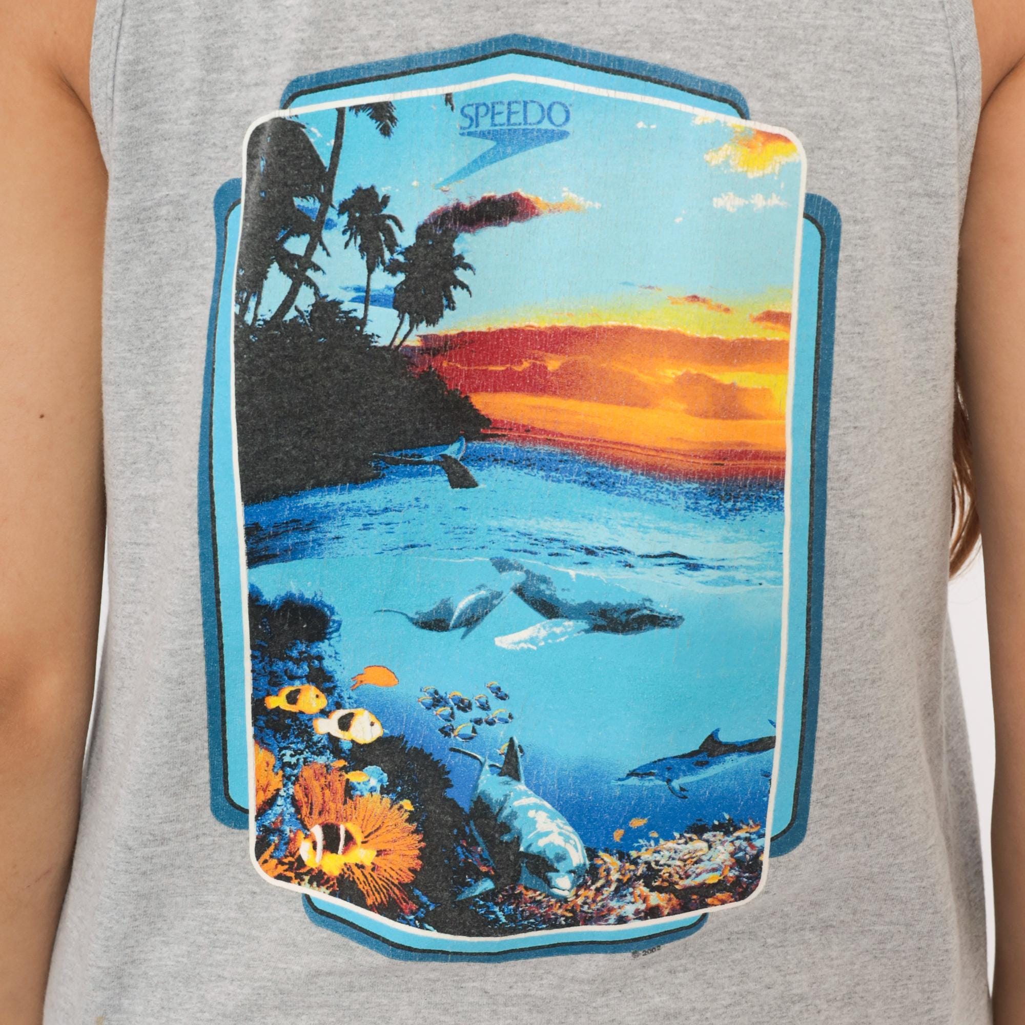 90s Speedo tank top in heather gray with a small blue logo on the left chest. Large tropical back graphic depicting a sunset ocean scene with dolphins, coral reef, palm trees, and tropical fish within a framed border.