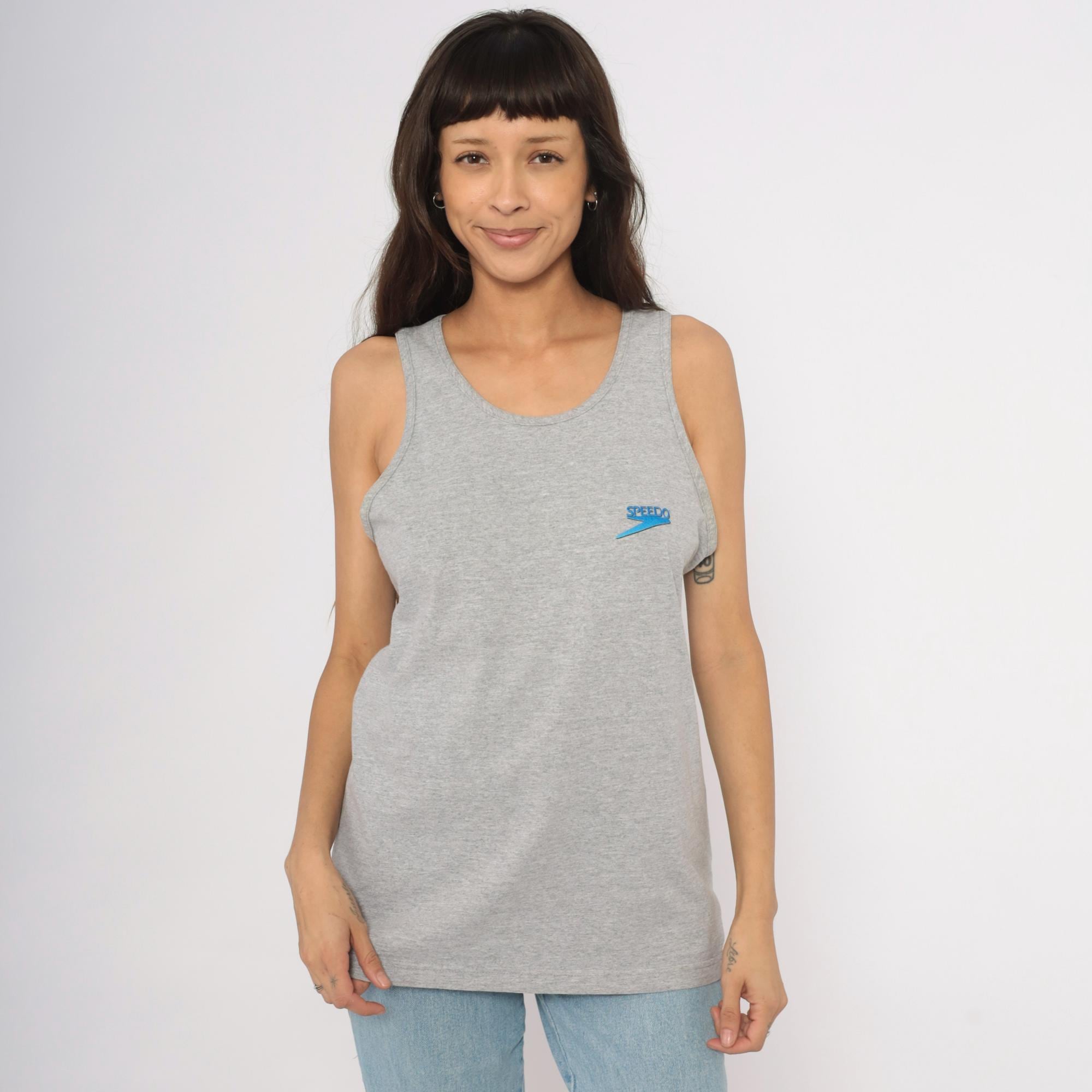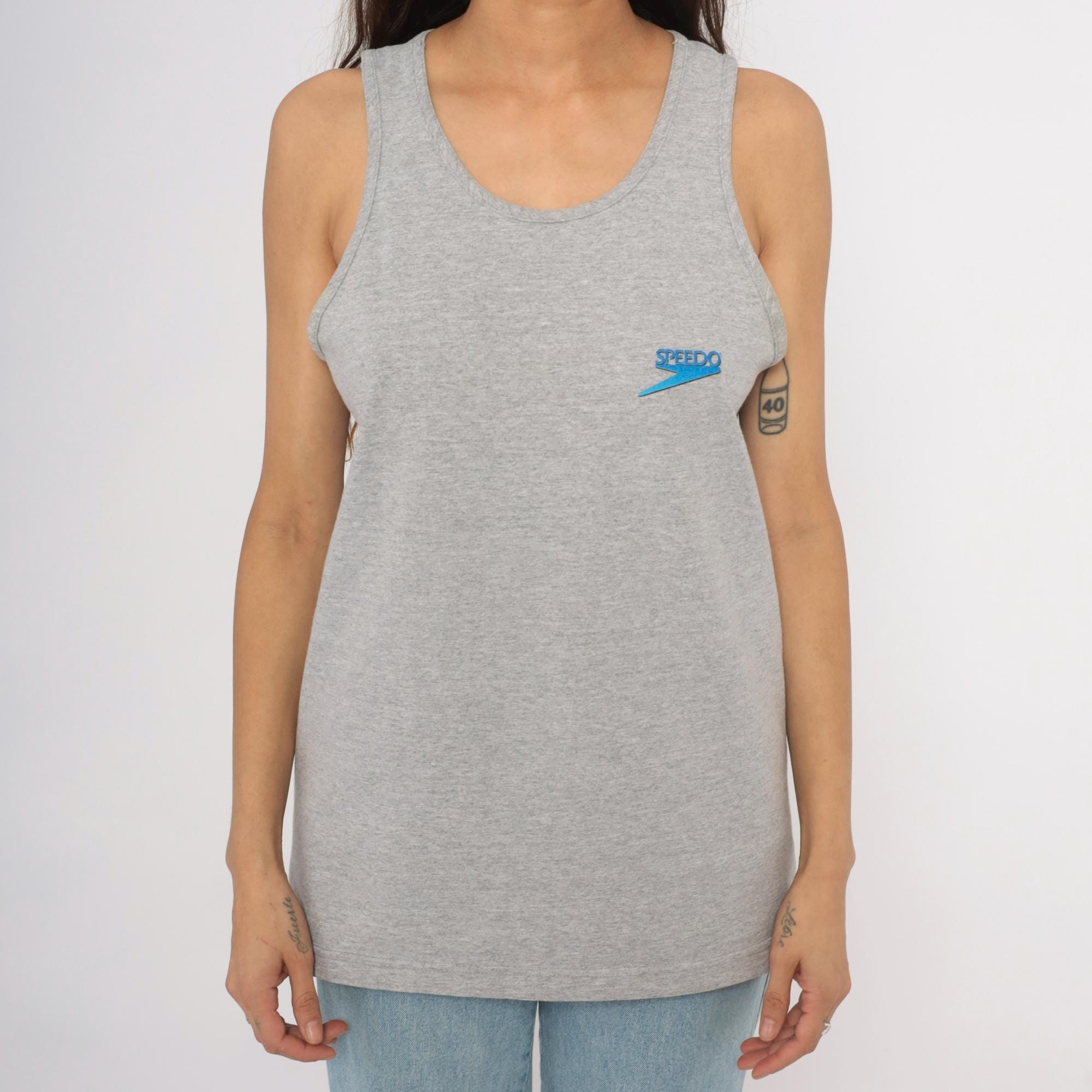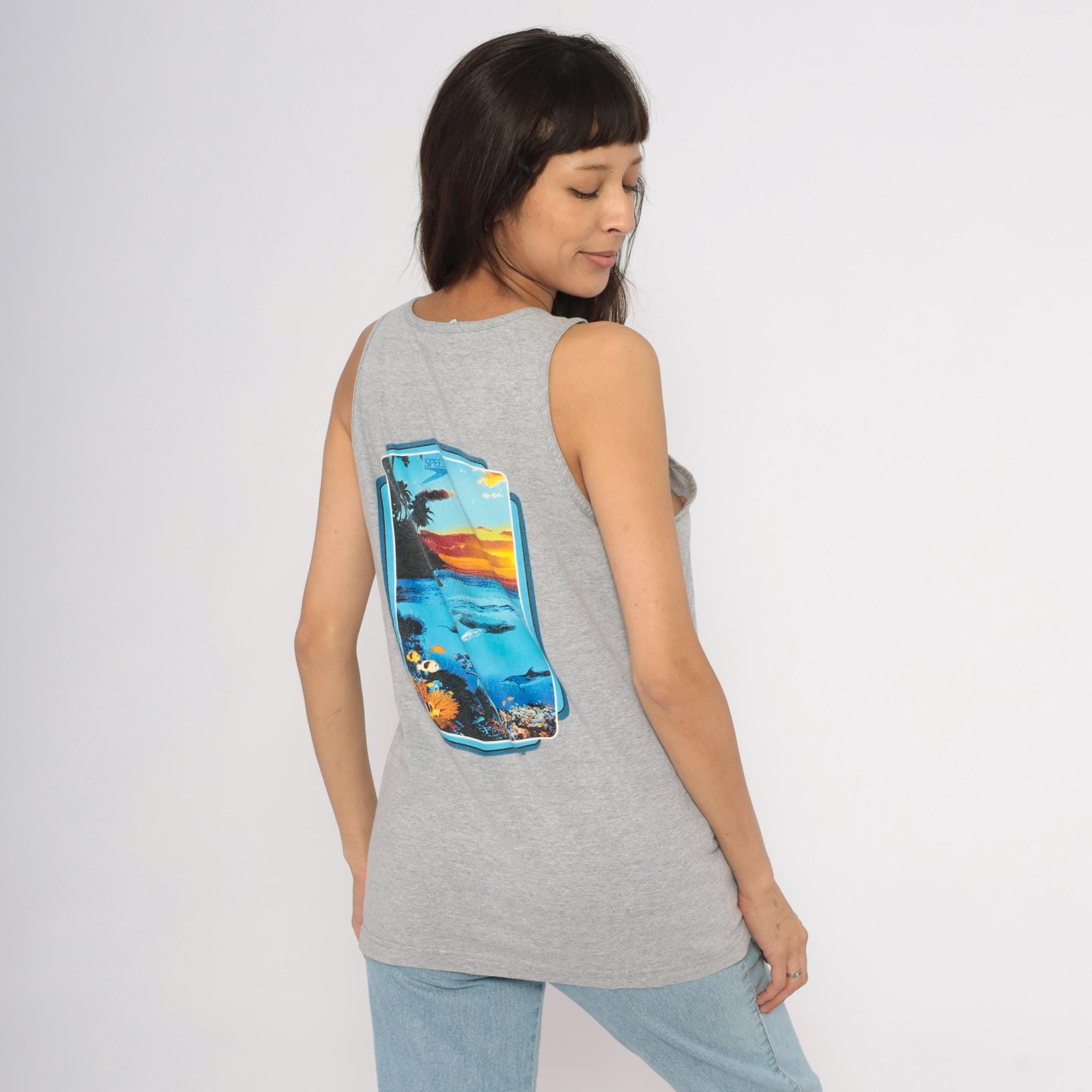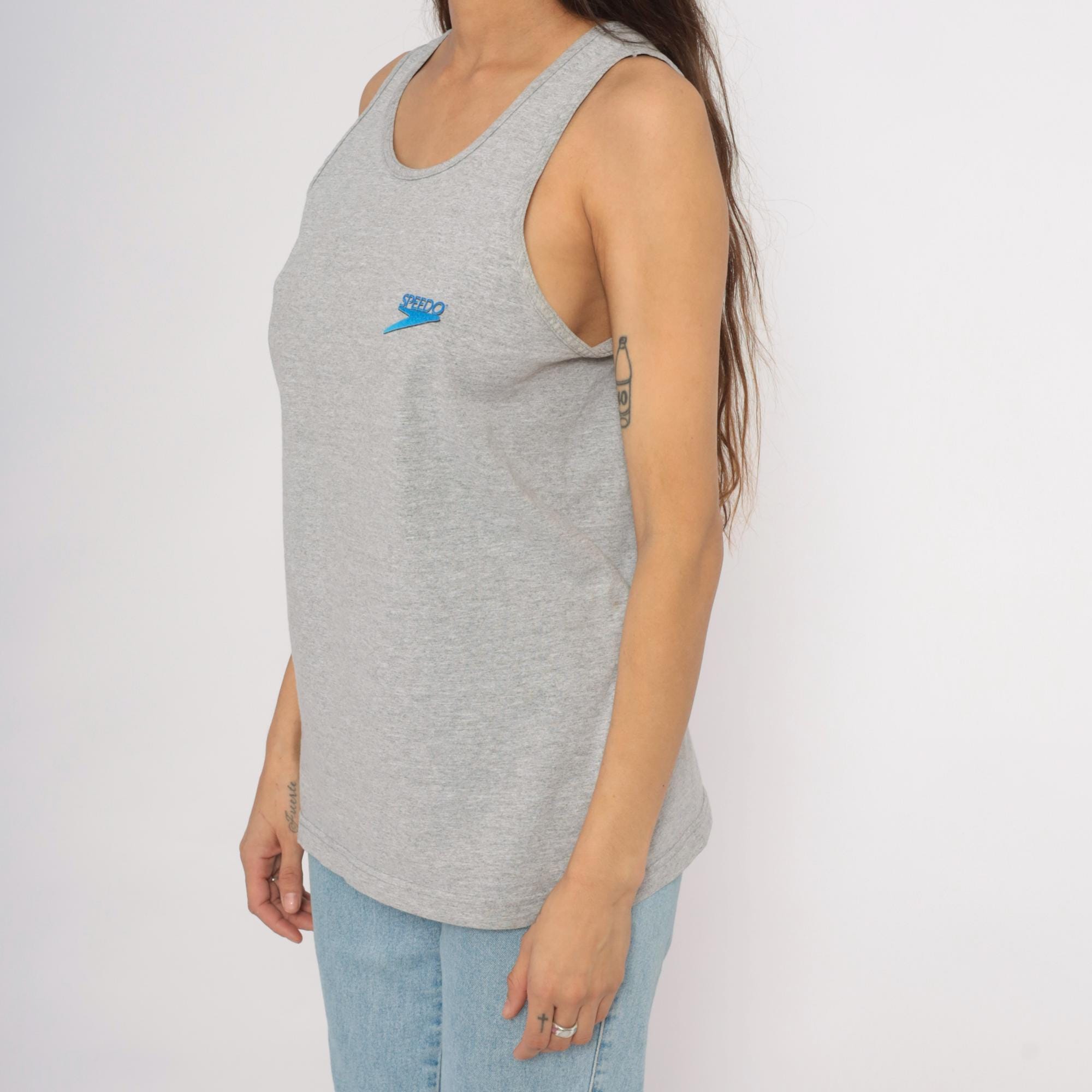 90s Speedo tank top in heather gray with a small blue logo on the left chest. Large tropical back graphic depicting a sunset ocean scene with dolphins, coral reef, palm trees, and tropical fish within a framed border.