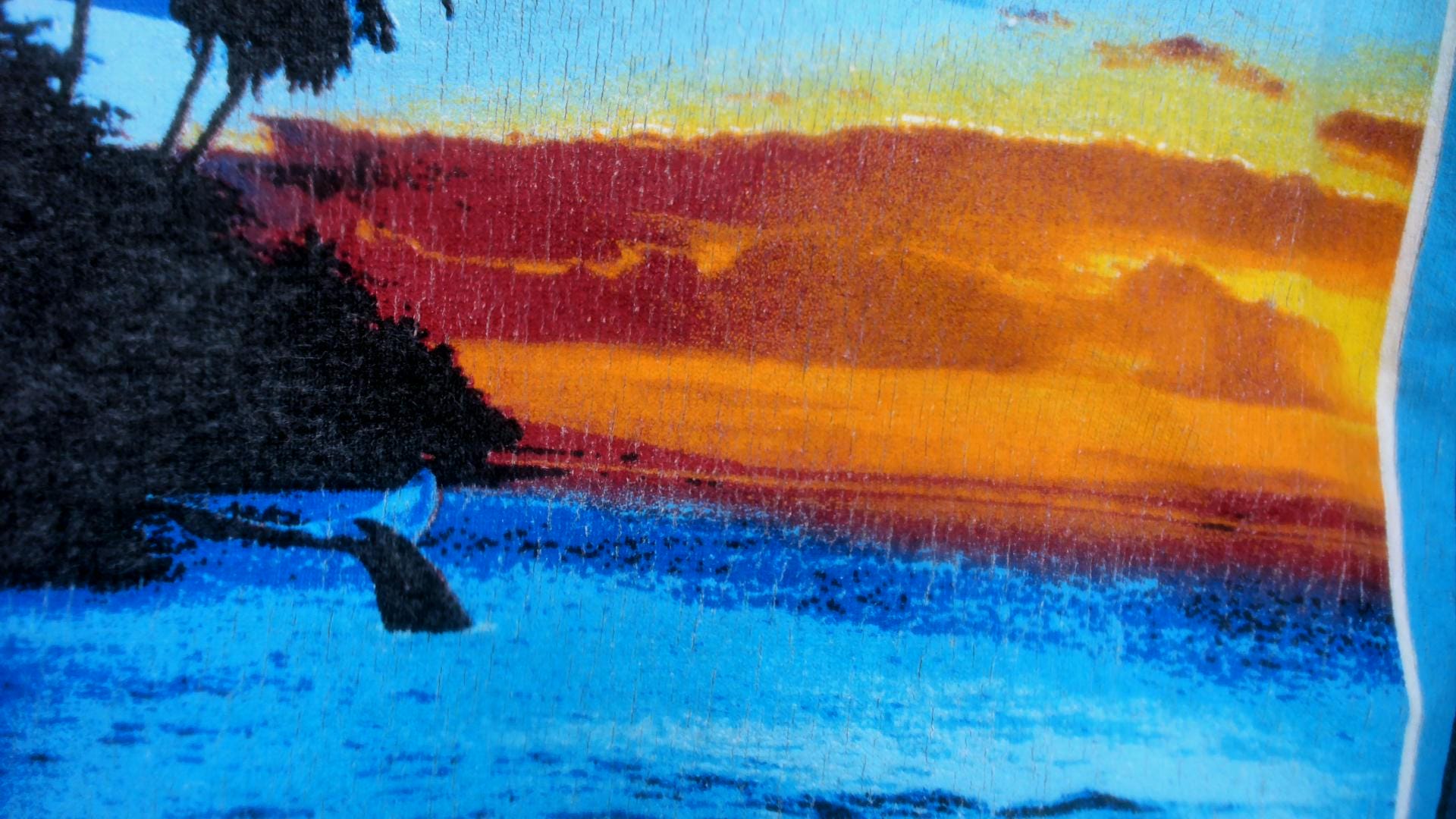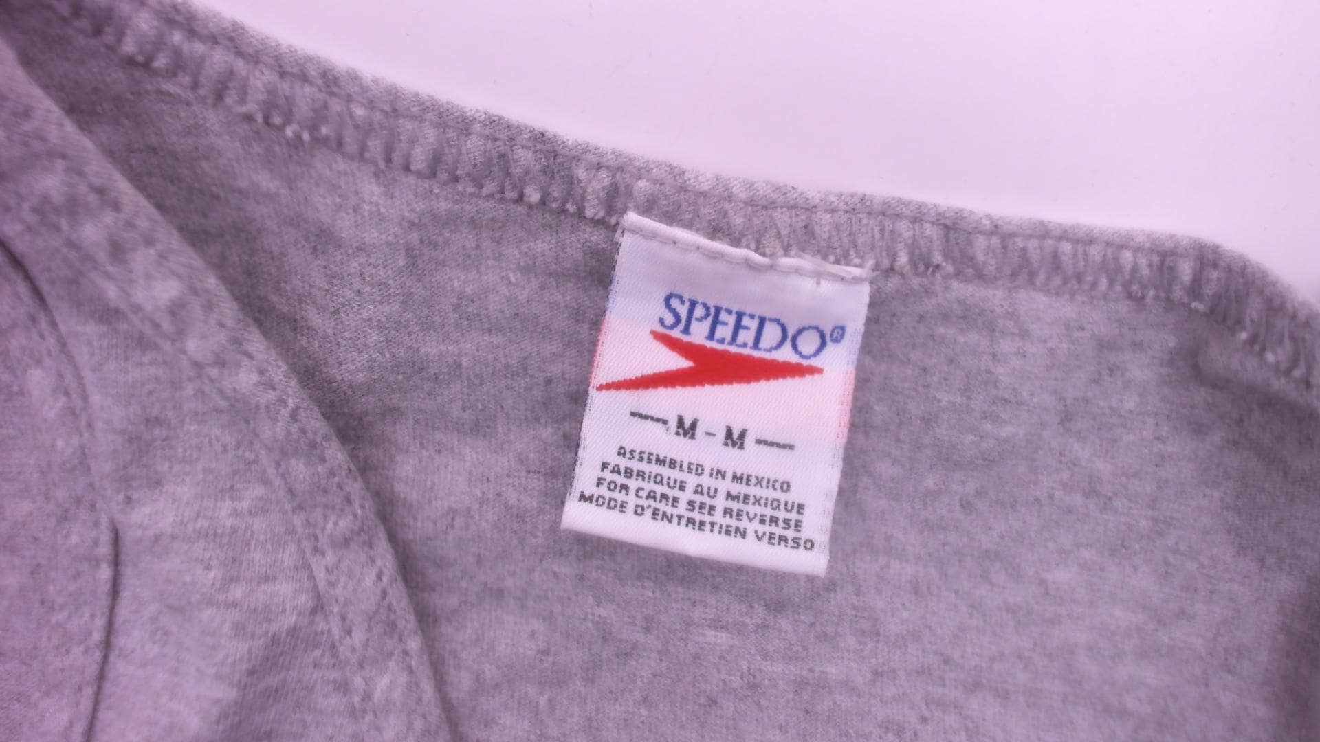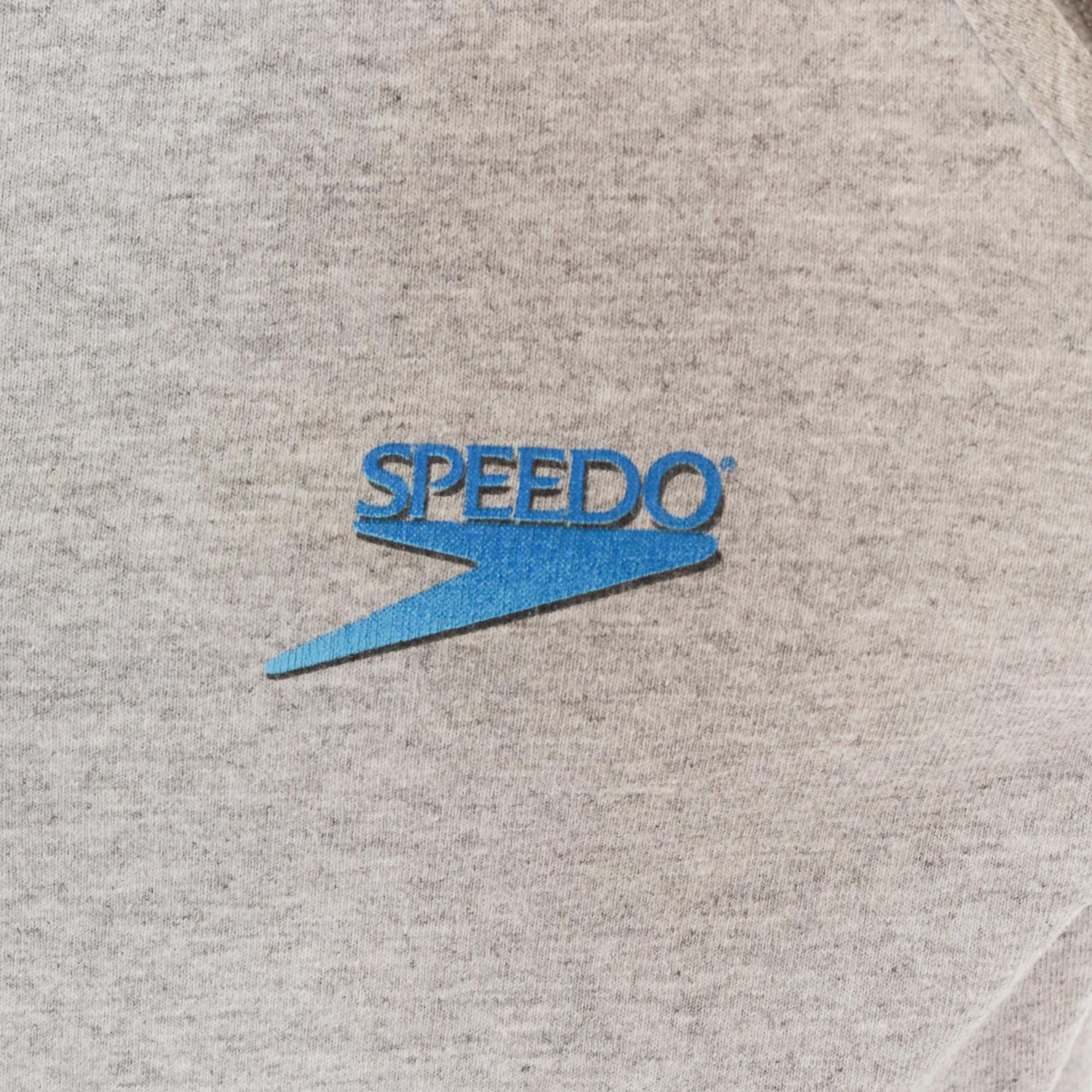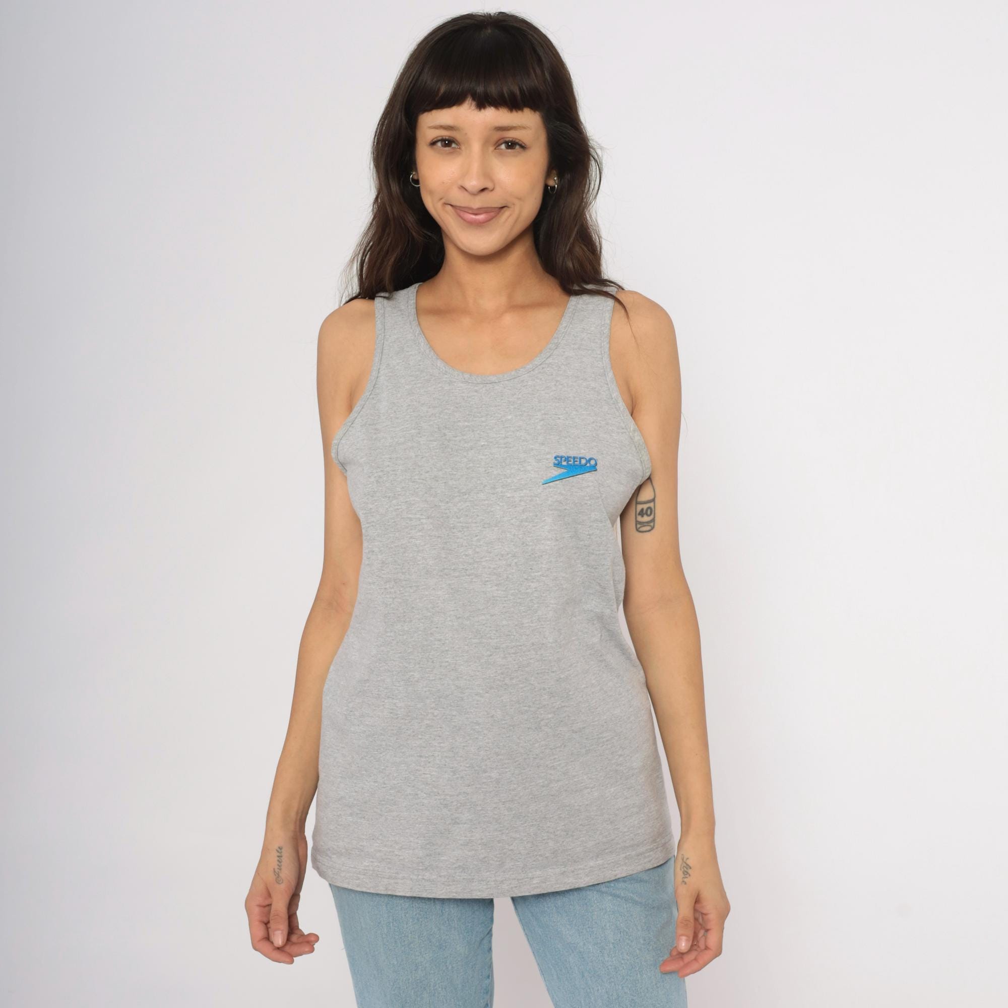 90s Speedo tank top in heather gray with a small blue logo on the left chest. Large tropical back graphic depicting a sunset ocean scene with dolphins, coral reef, palm trees, and tropical fish within a framed border.