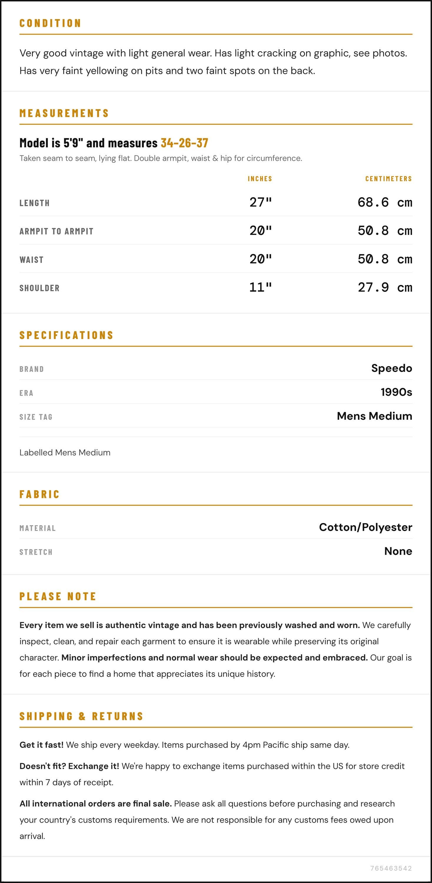 Condition: Very good vintage with light general wear. Has light cracking on graphic, see photos. Has very faint yellowing on pits and two faint spots on the back.