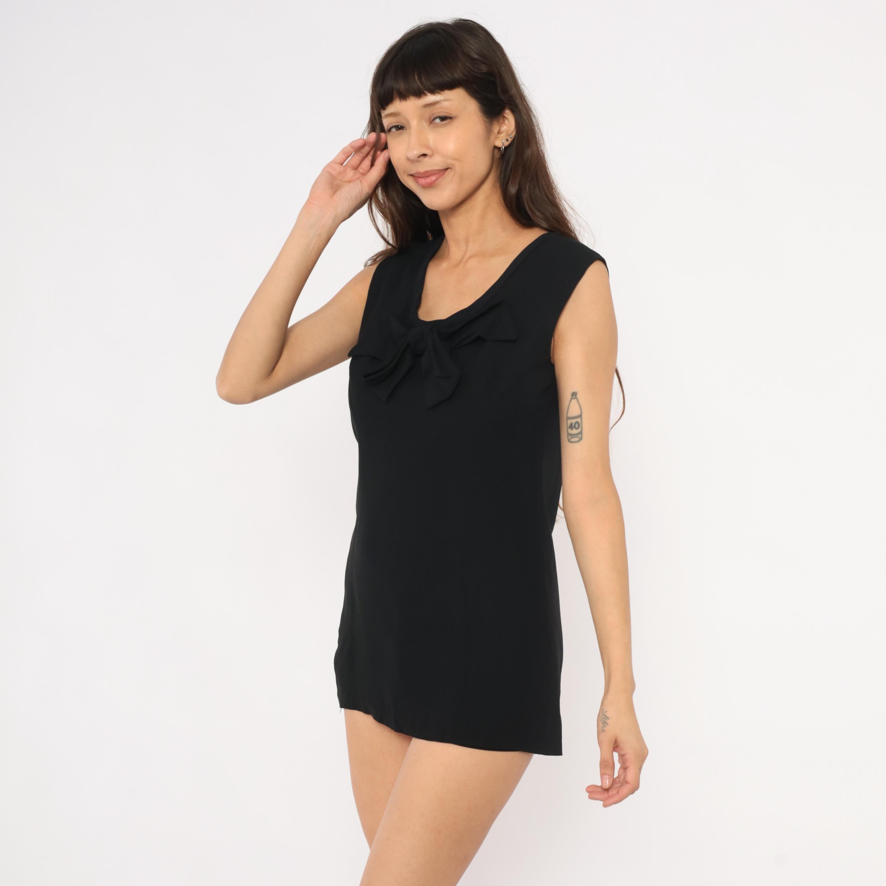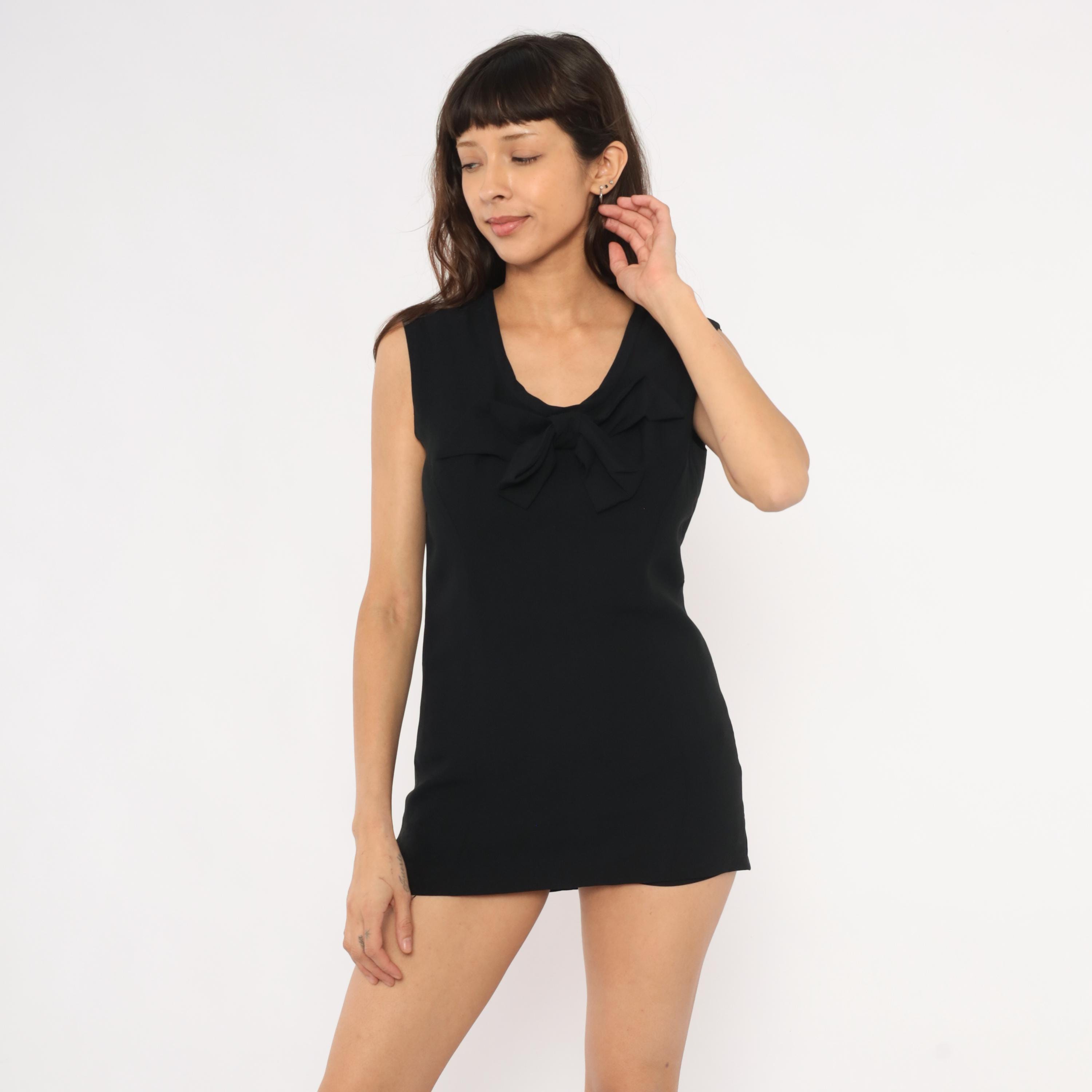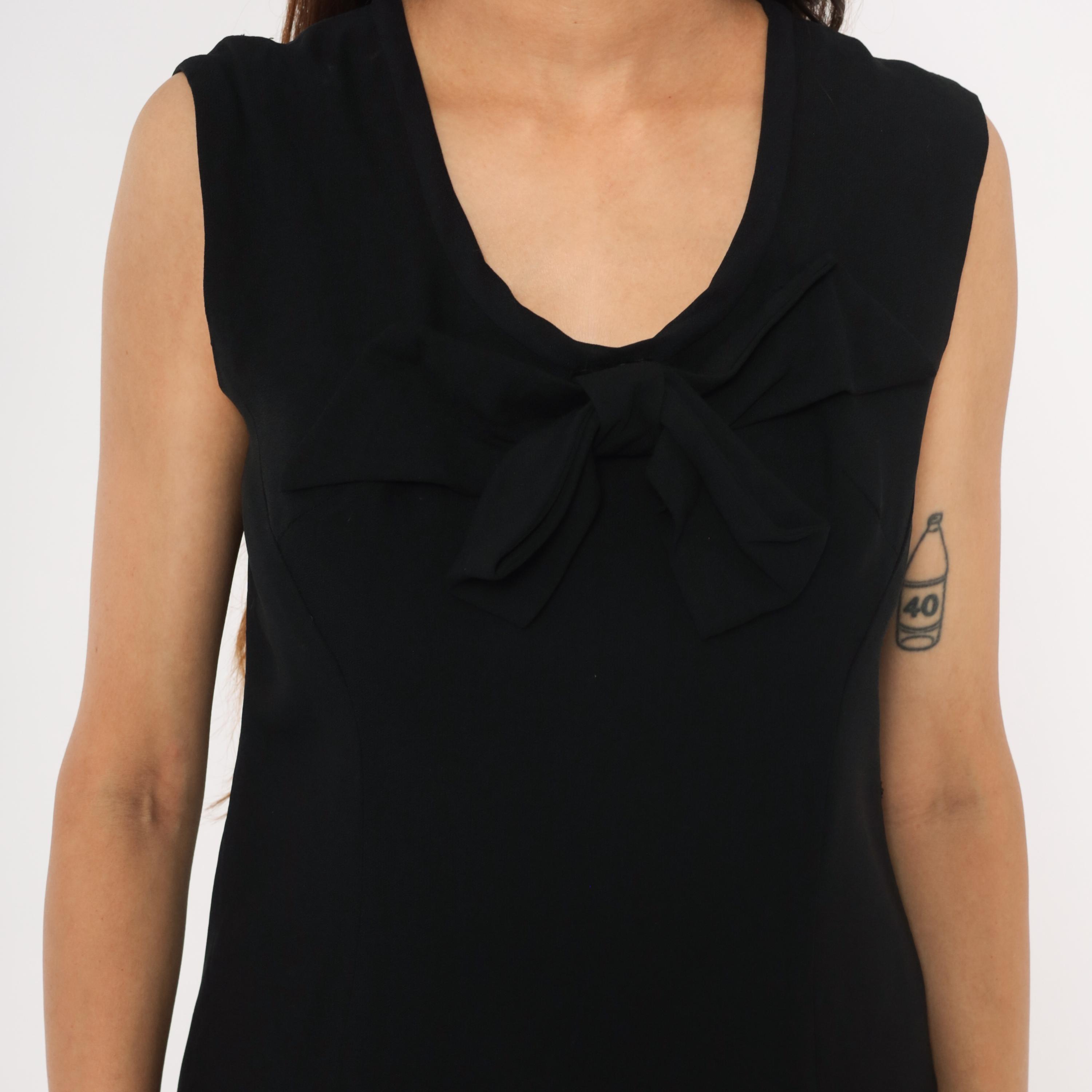 60s black mini dress with a gathered bow detail at the center front neckline and a scoop neck. Sleeveless shift silhouette with a back zipper closure and slightly padded shoulders.