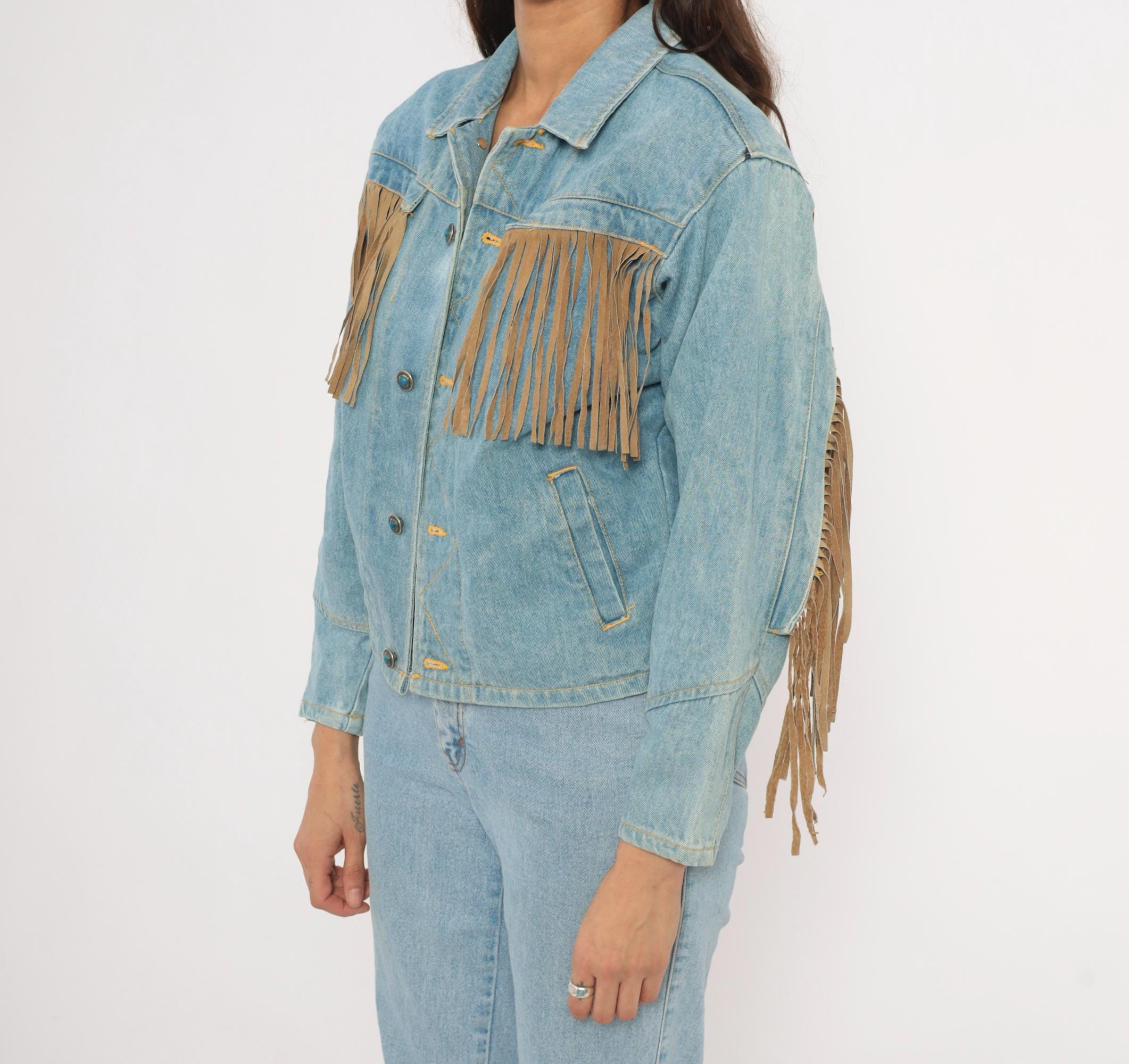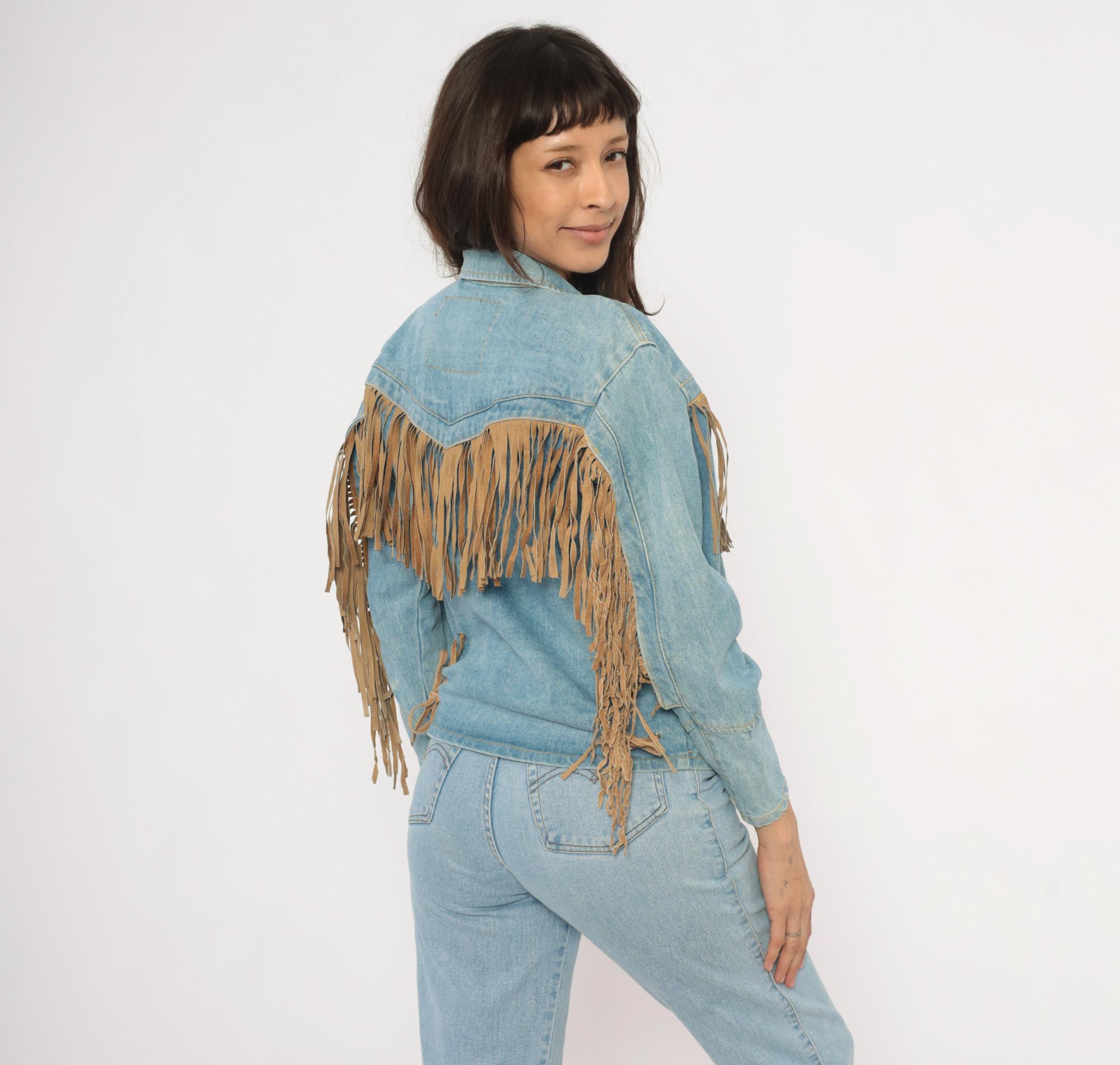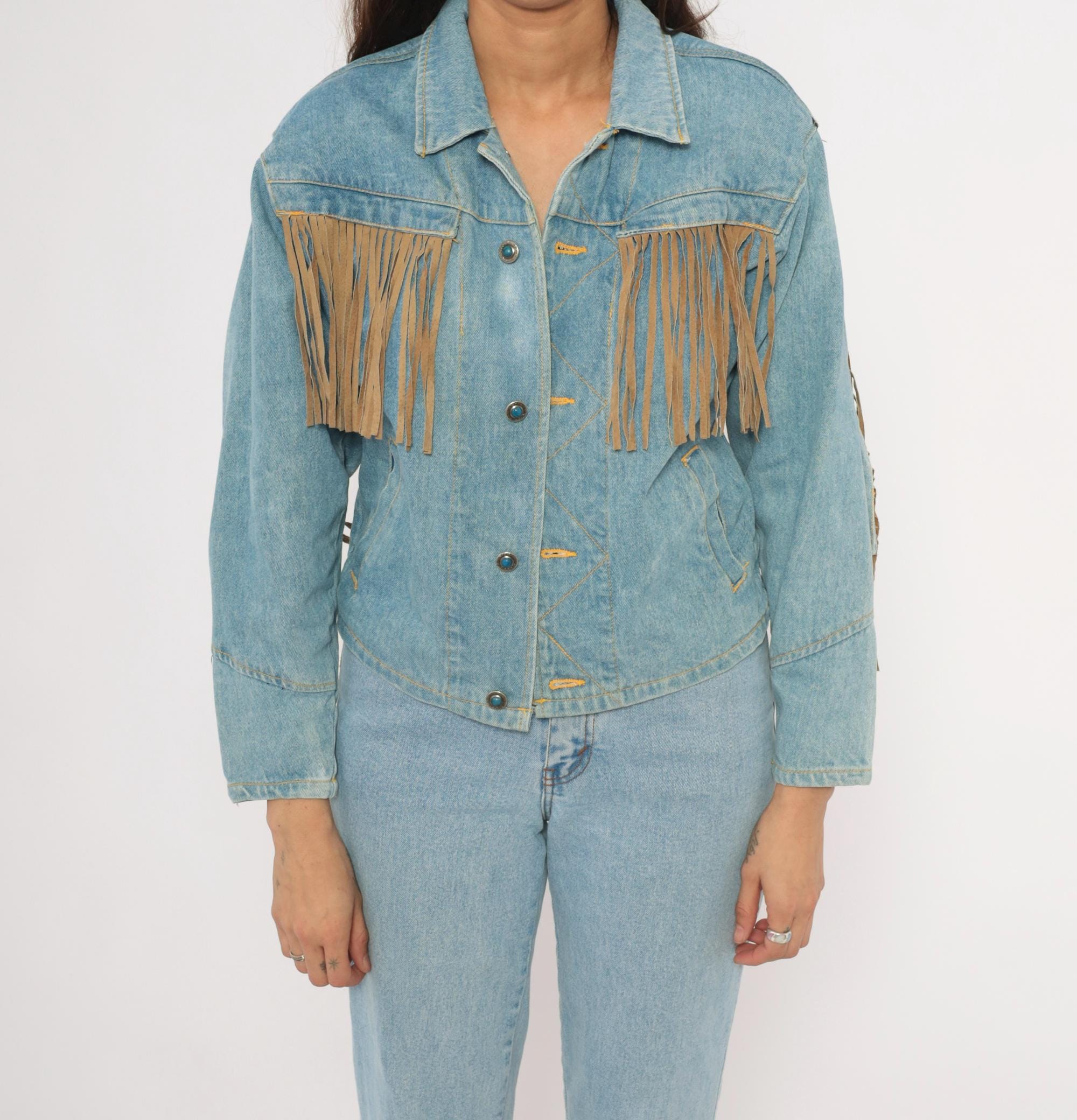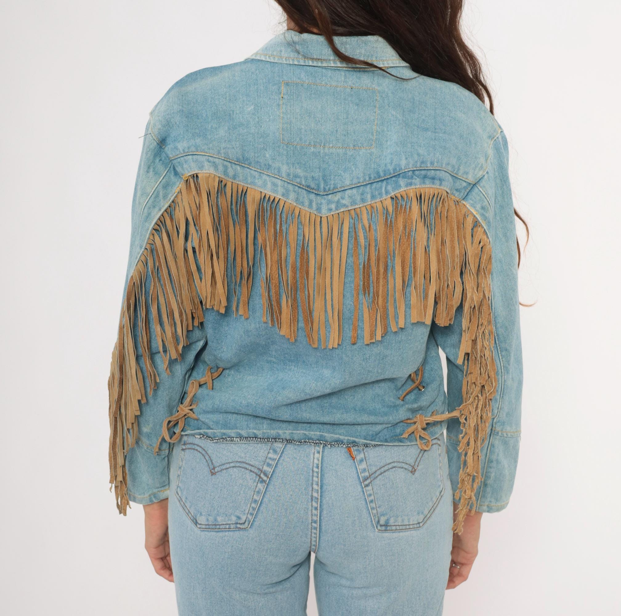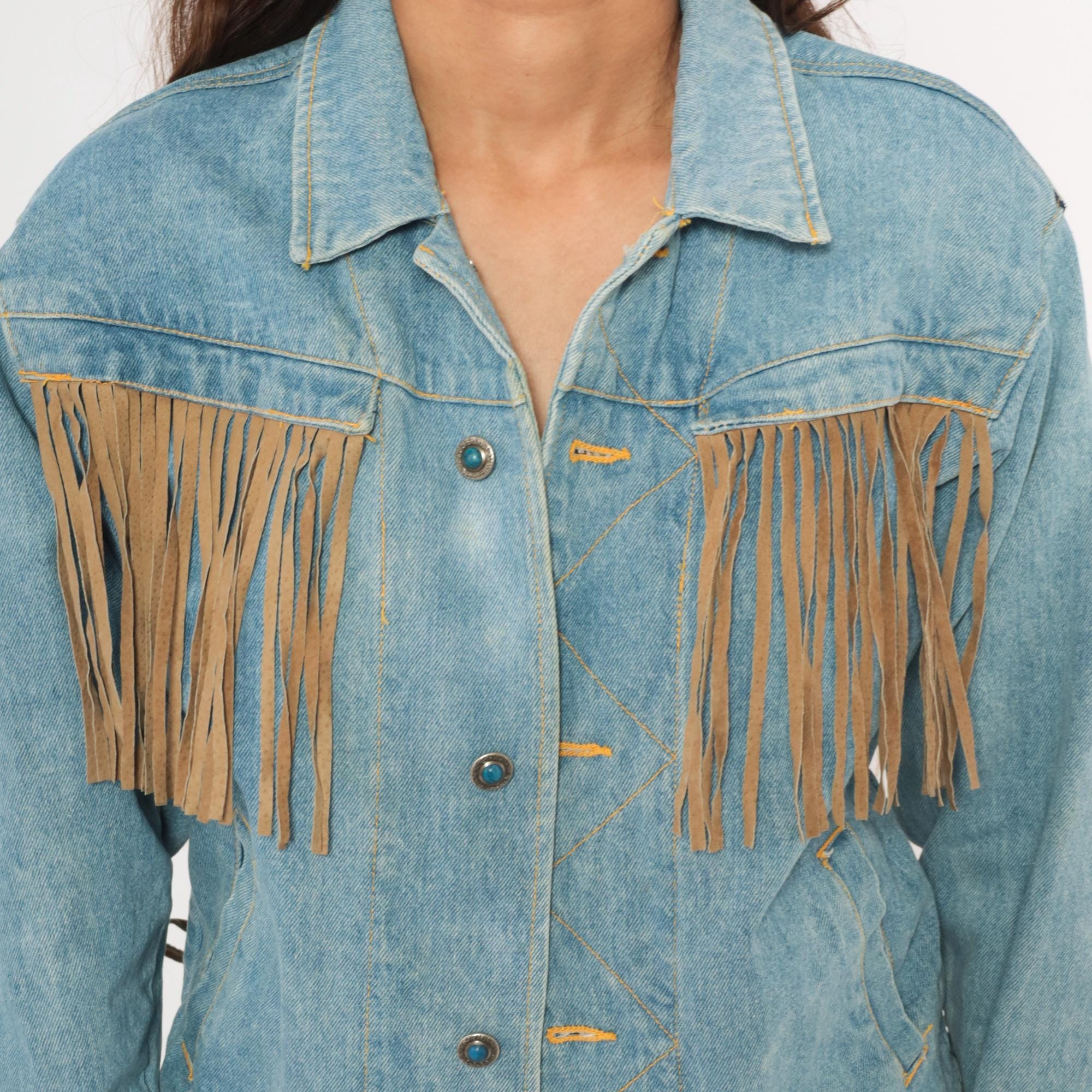 90s light wash denim jacket from Morganwear with tan suede fringe across the chest, back yoke, and full length of both sleeves. Button front closure with pointed collar, side seam pockets, and decorative leather lace-up ties at the lower back. Contrast gold-toned stitching throughout with chevron yoke seaming on the back and small leather accent tabs along the front placket.