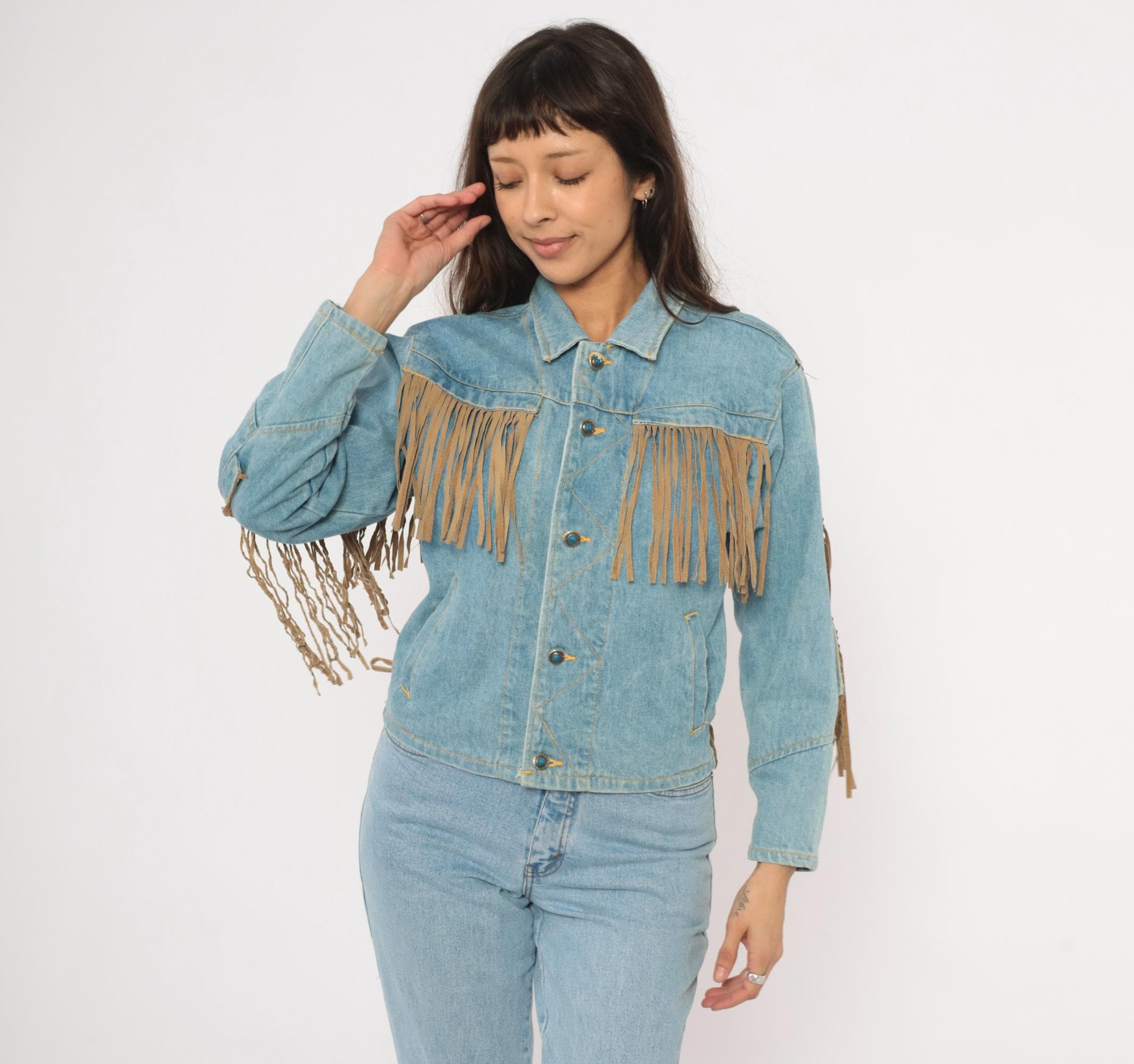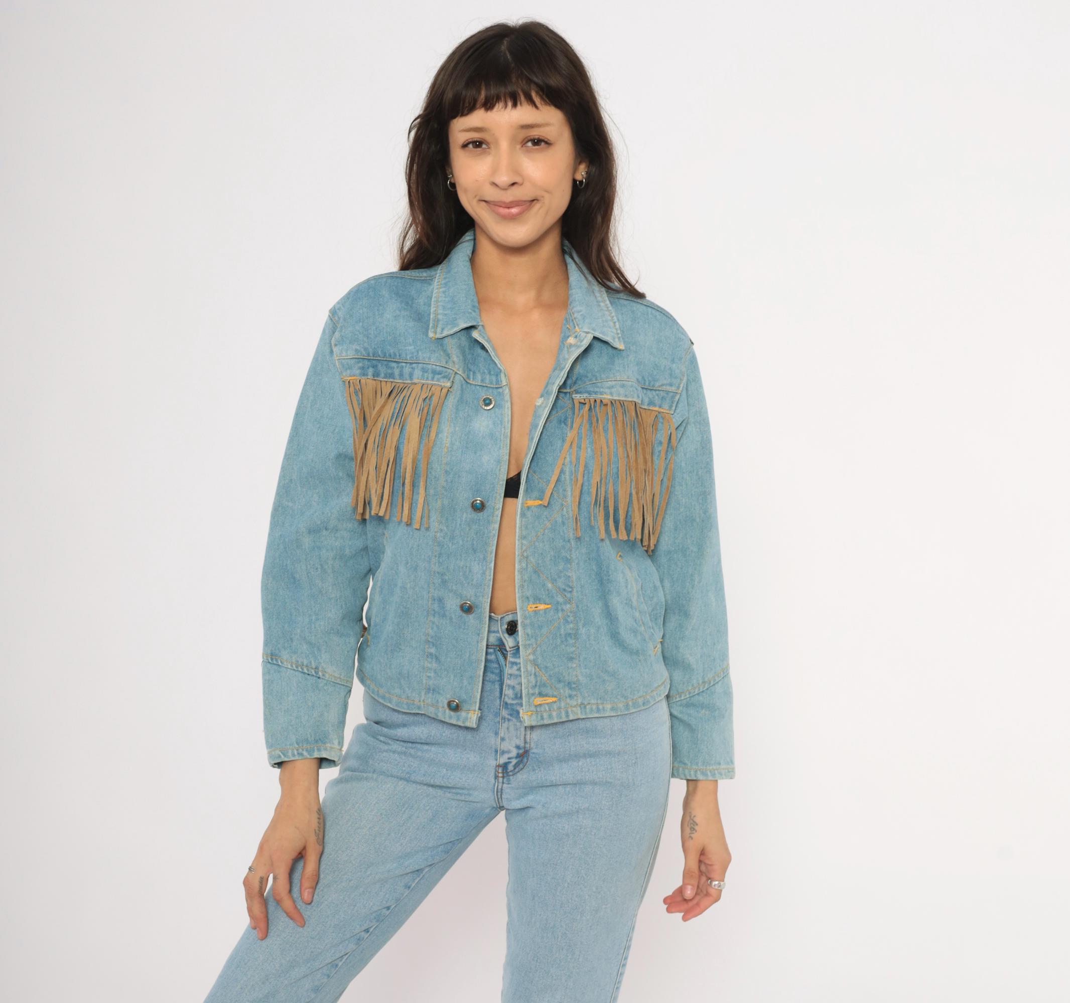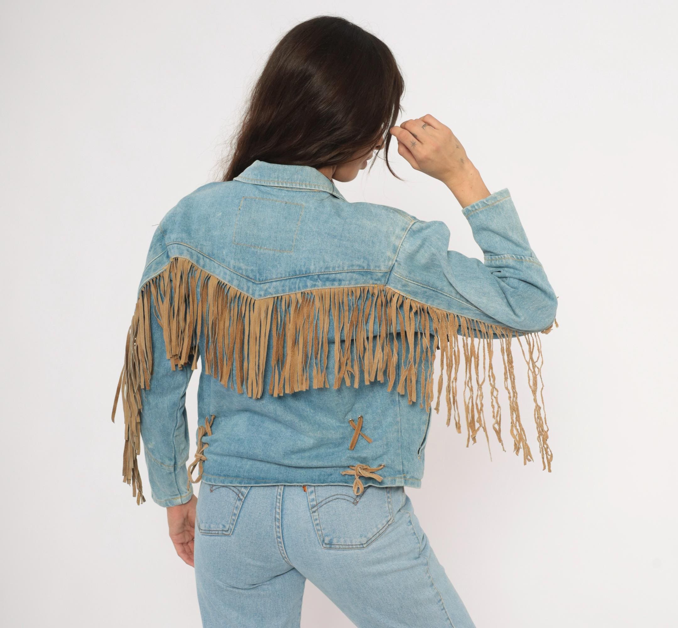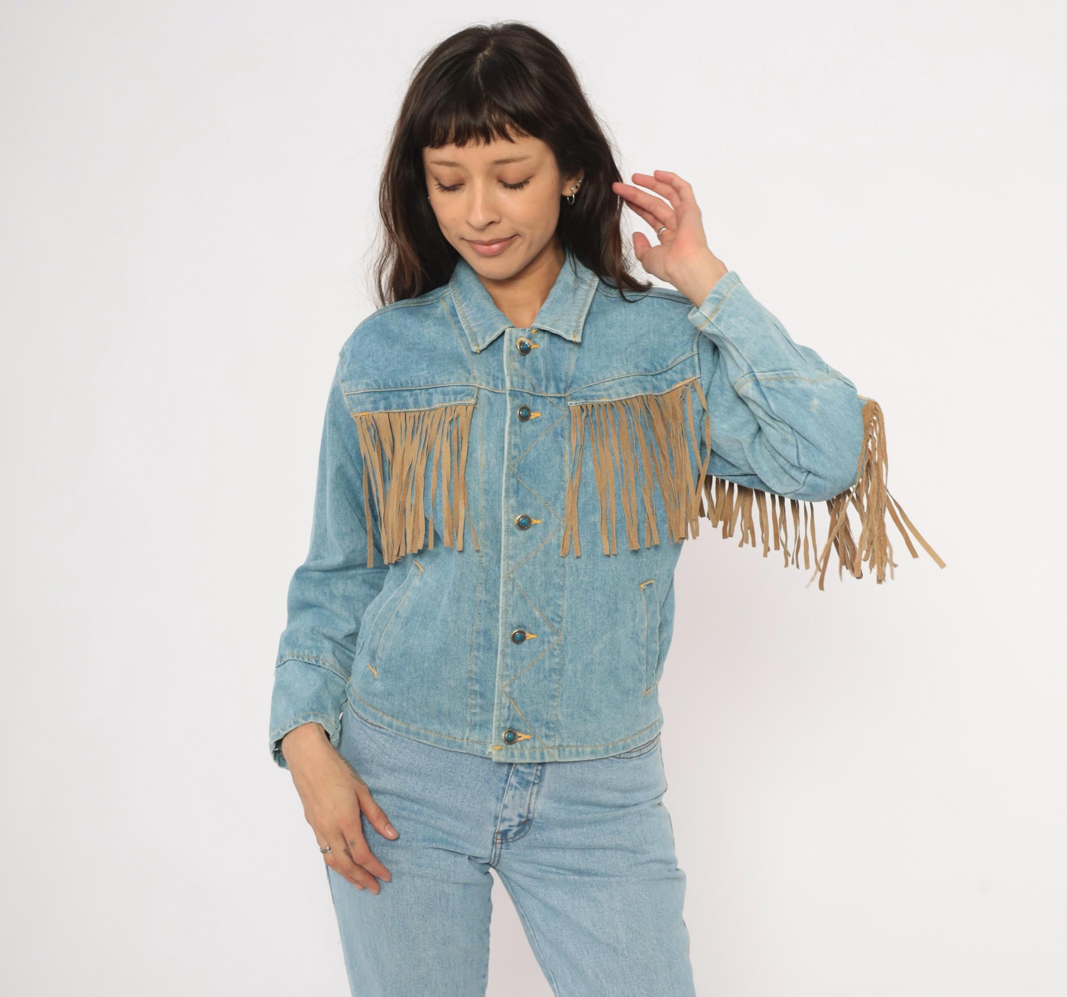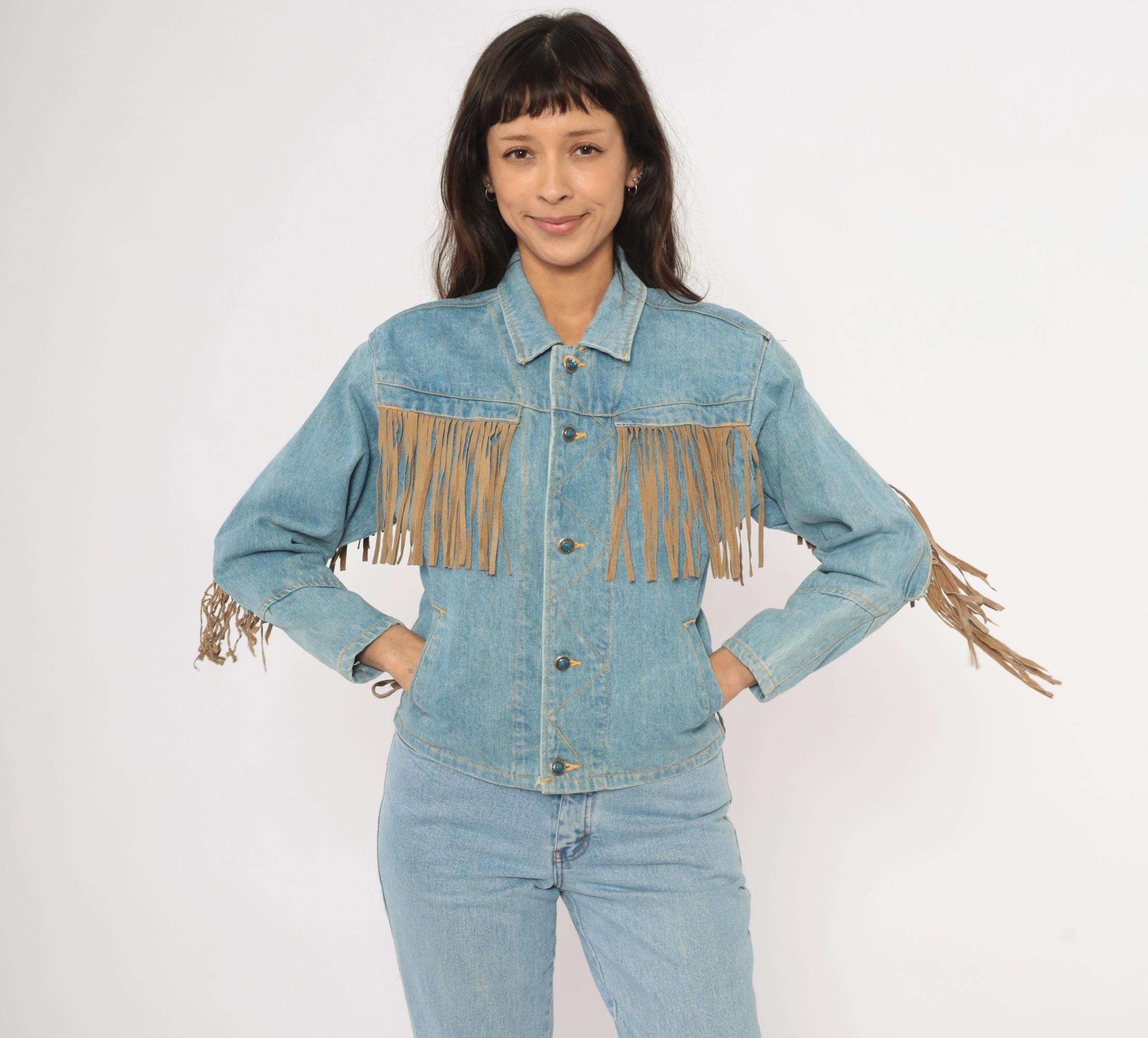 90s light wash denim jacket from Morganwear with tan suede fringe across the chest, back yoke, and full length of both sleeves. Button front closure with pointed collar, side seam pockets, and decorative leather lace-up ties at the lower back. Contrast gold-toned stitching throughout with chevron yoke seaming on the back and small leather accent tabs along the front placket.