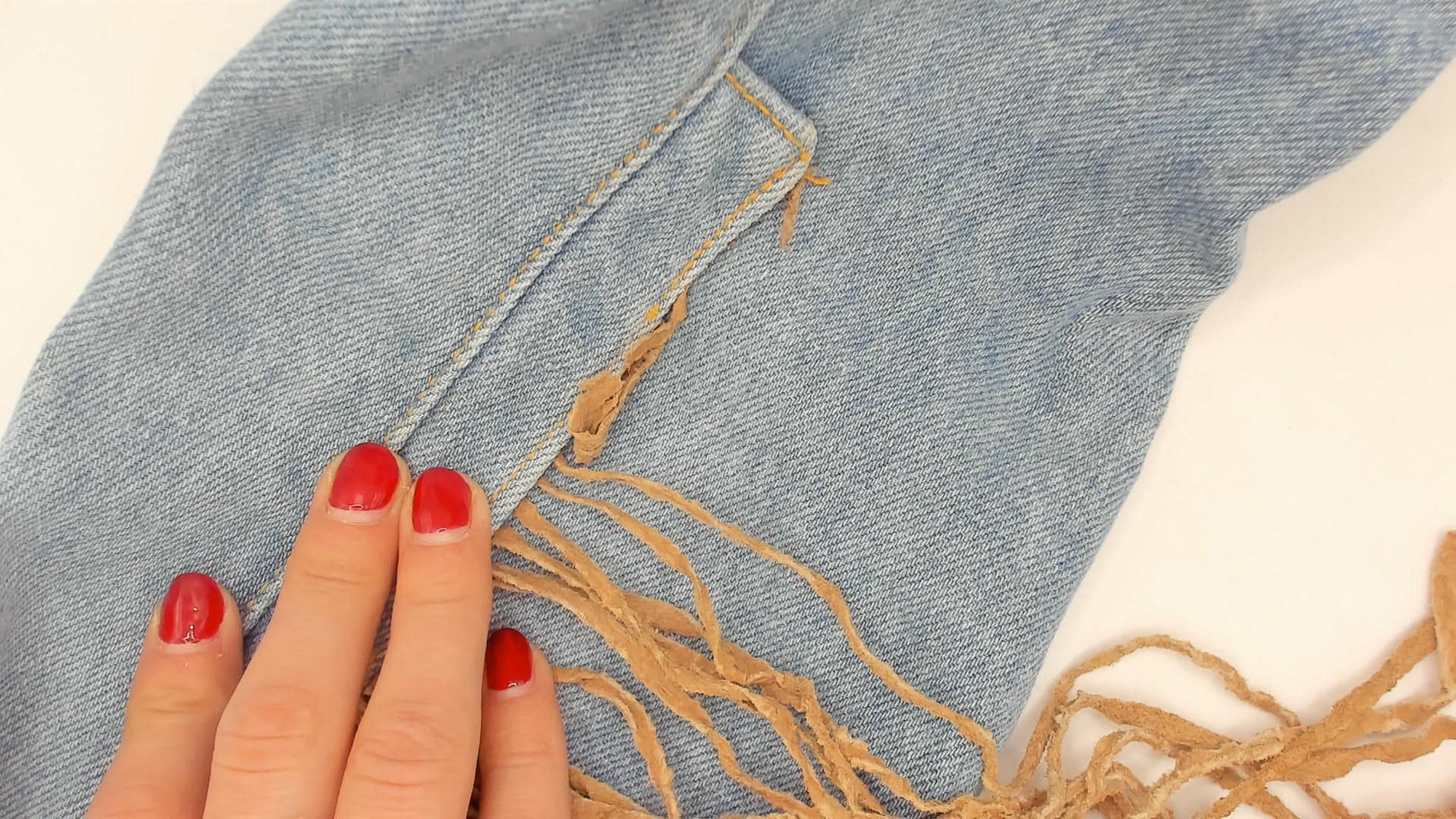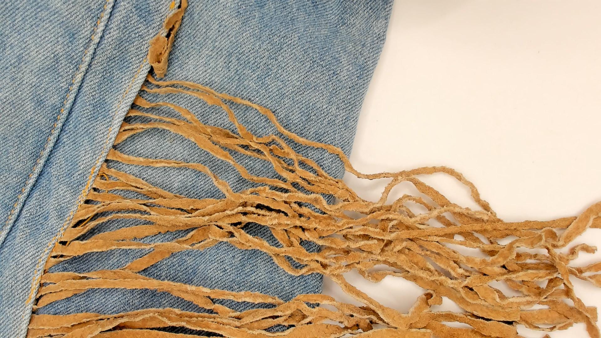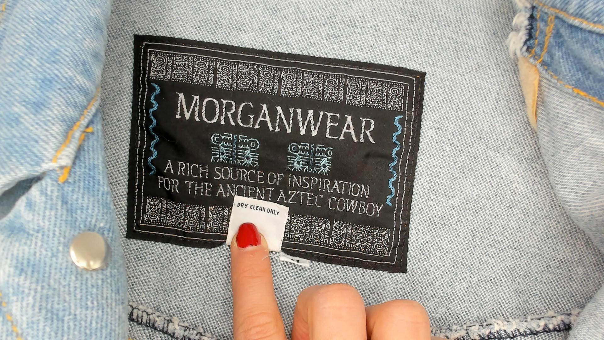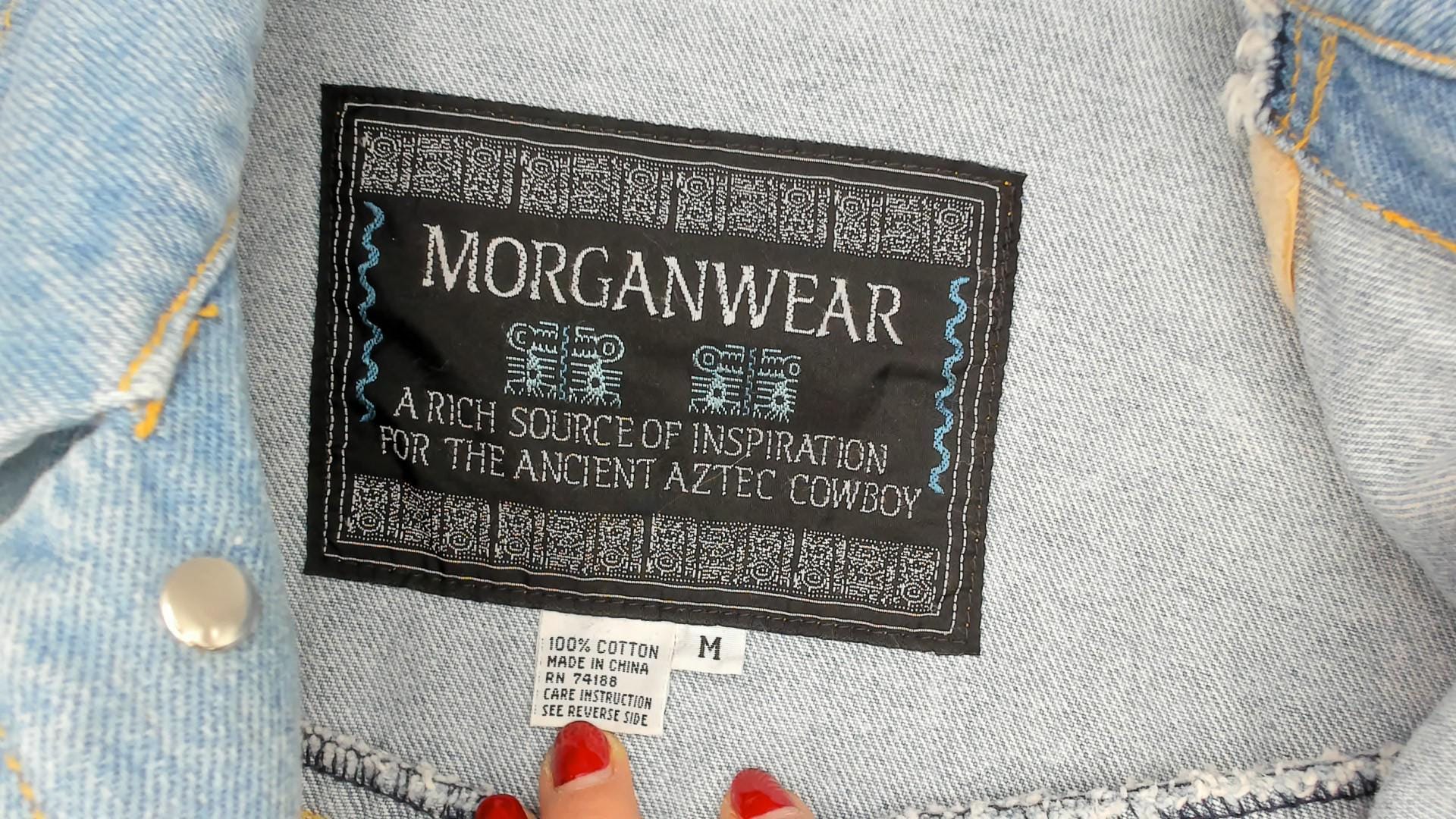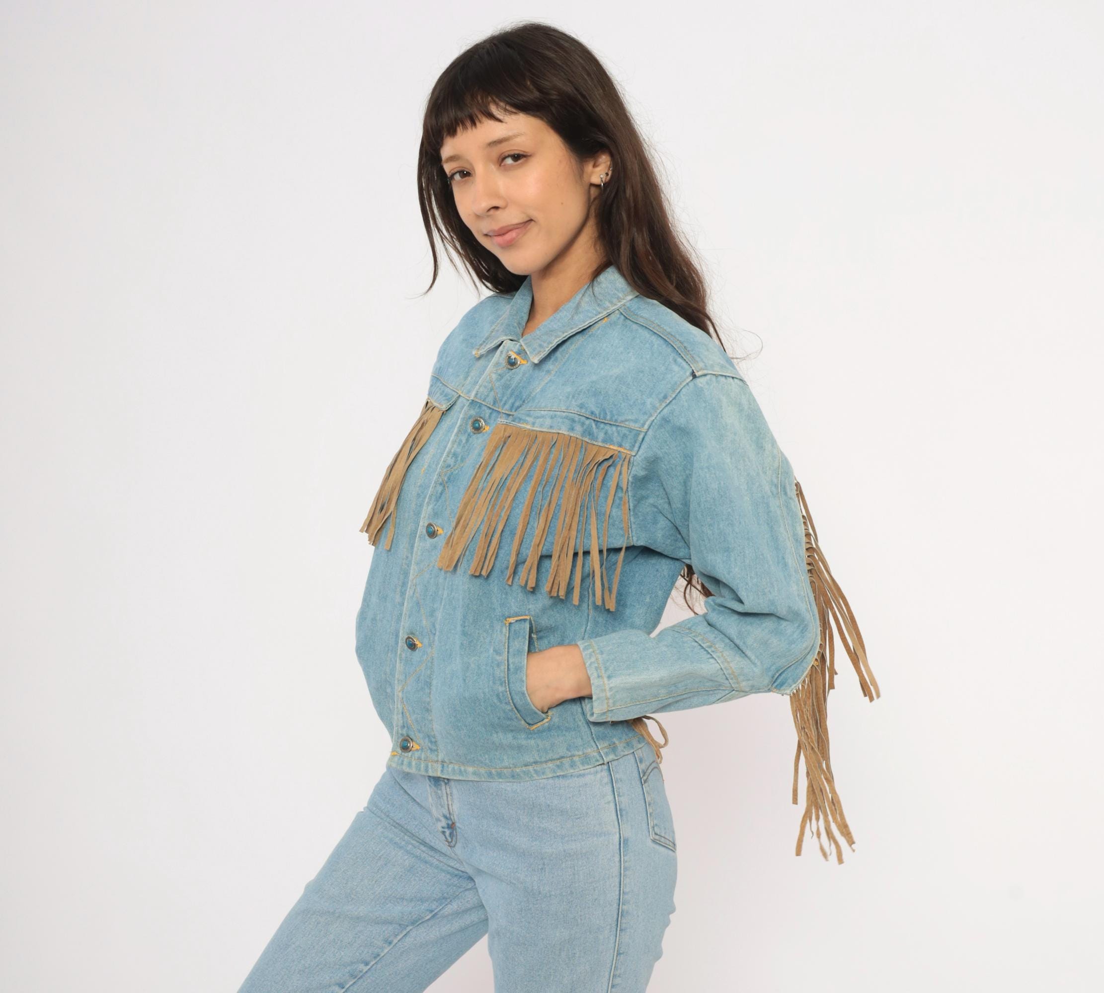 90s light wash denim jacket from Morganwear with tan suede fringe across the chest, back yoke, and full length of both sleeves. Button front closure with pointed collar, side seam pockets, and decorative leather lace-up ties at the lower back. Contrast gold-toned stitching throughout with chevron yoke seaming on the back and small leather accent tabs along the front placket.