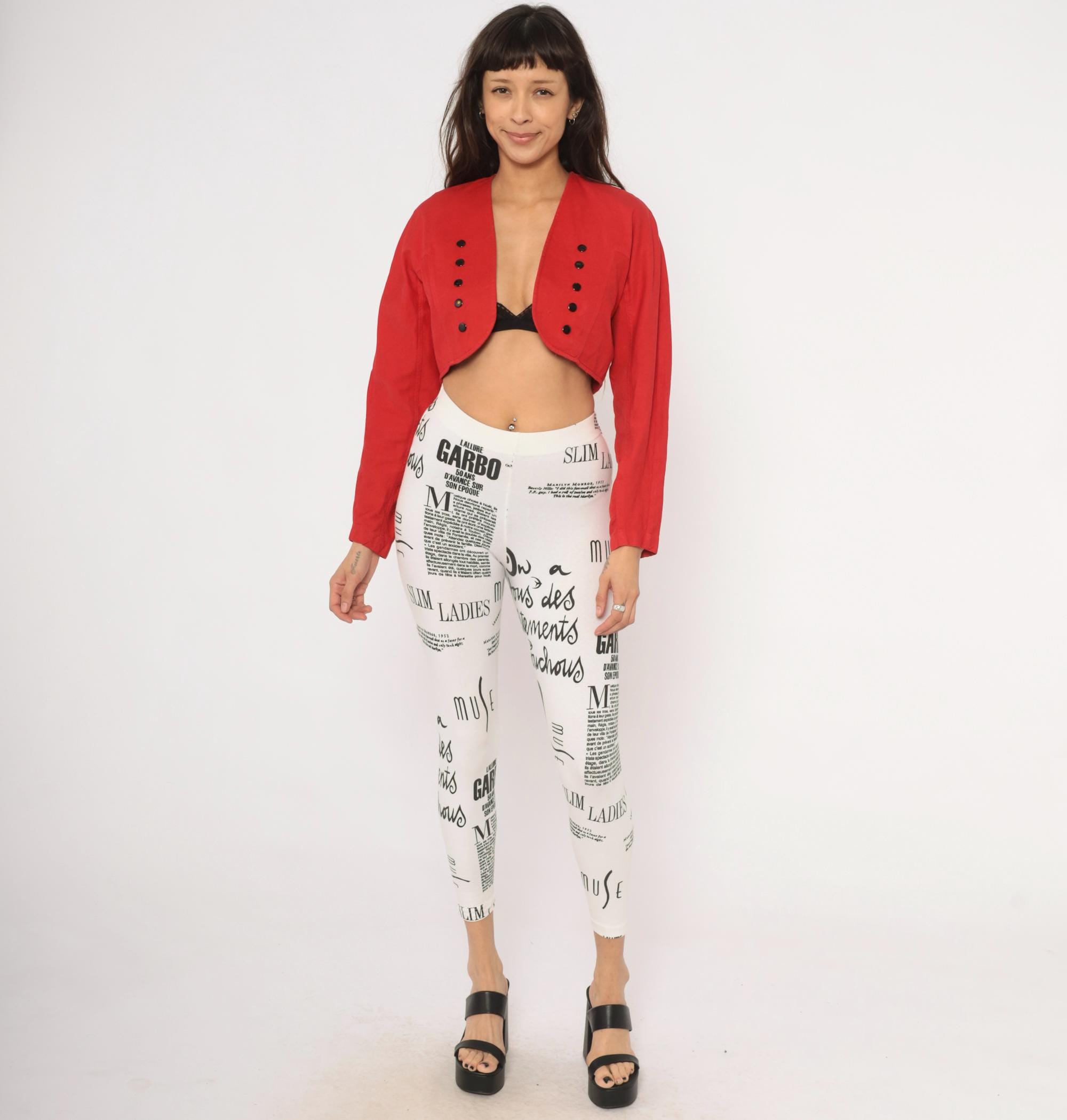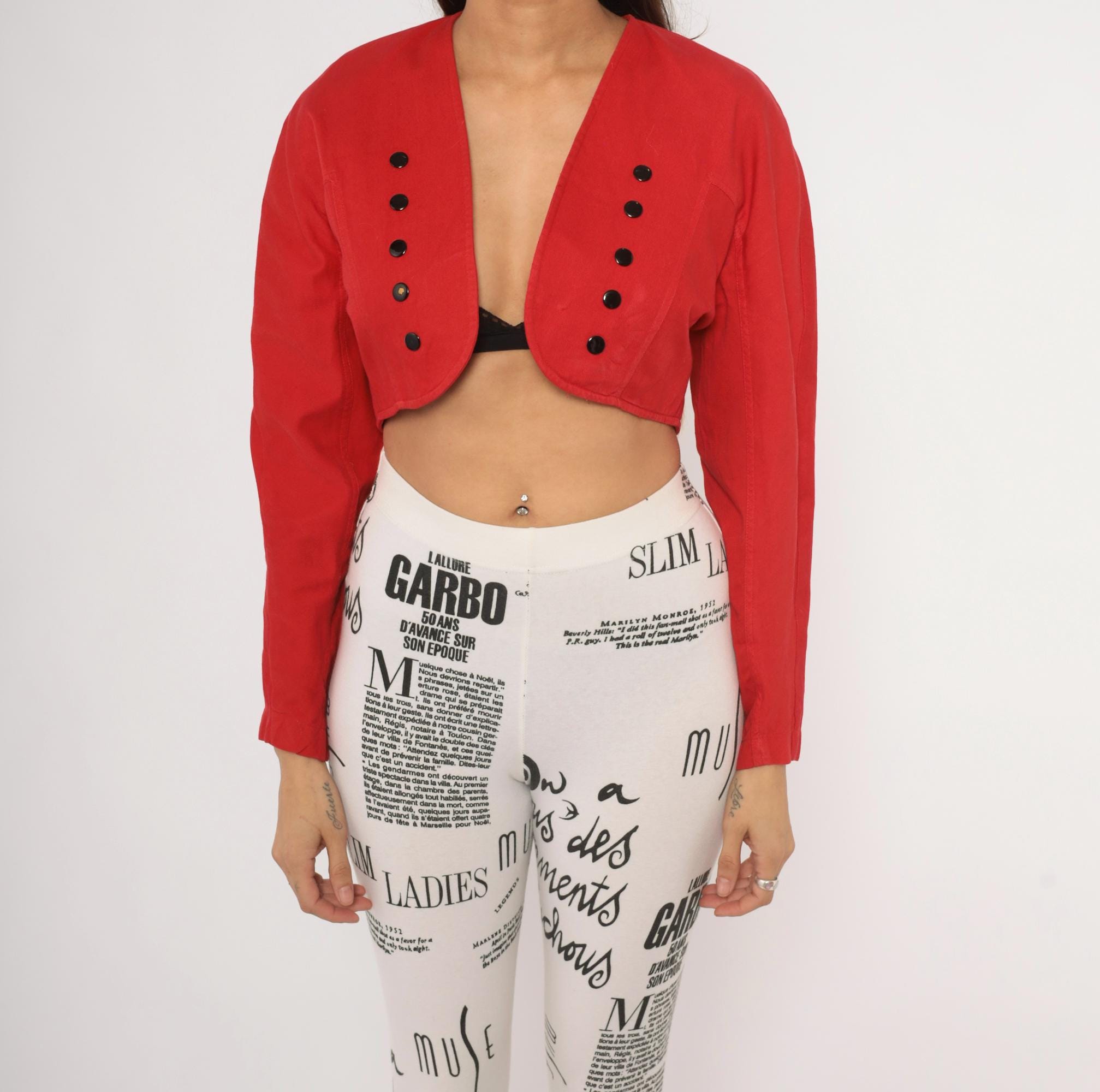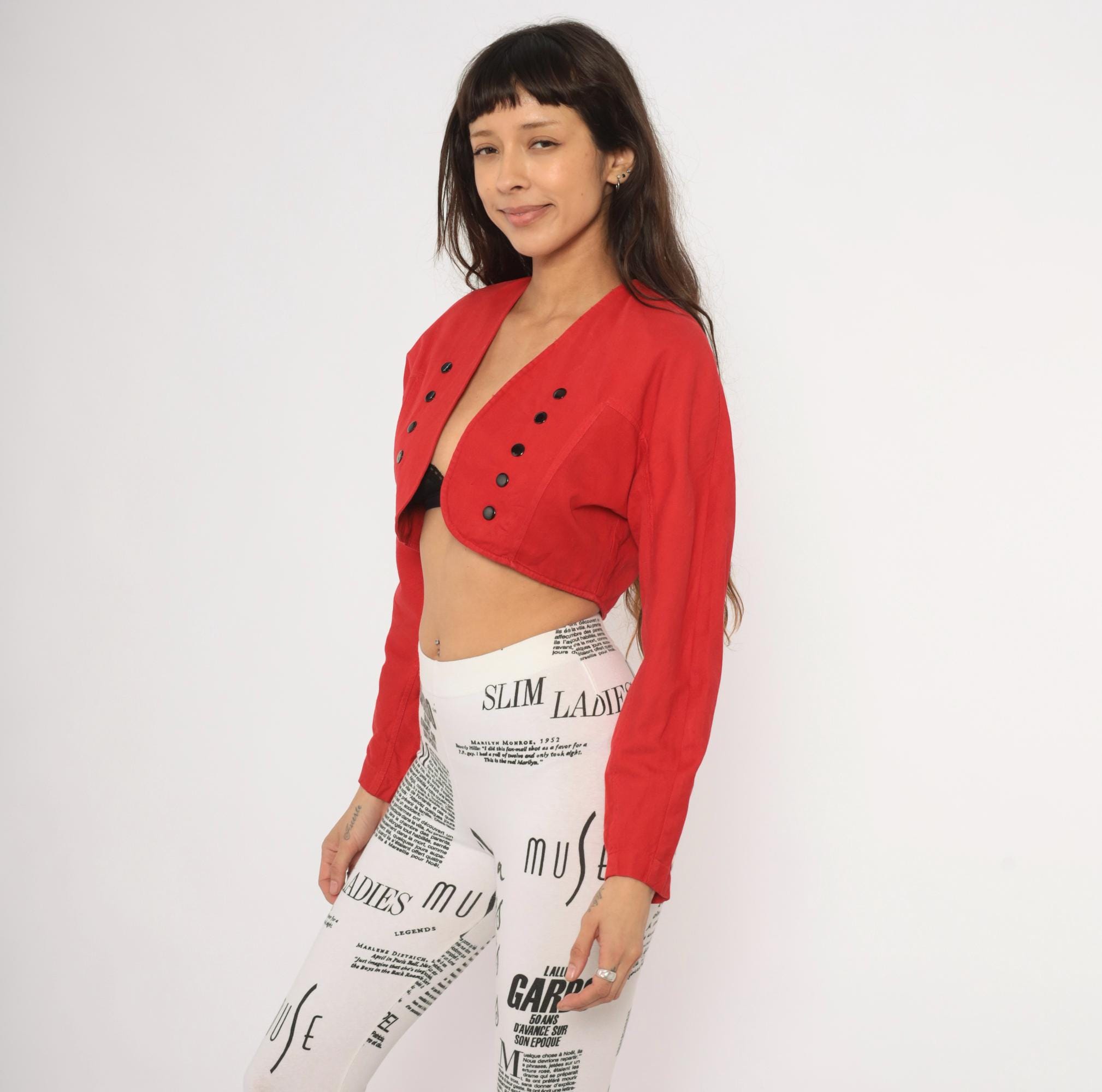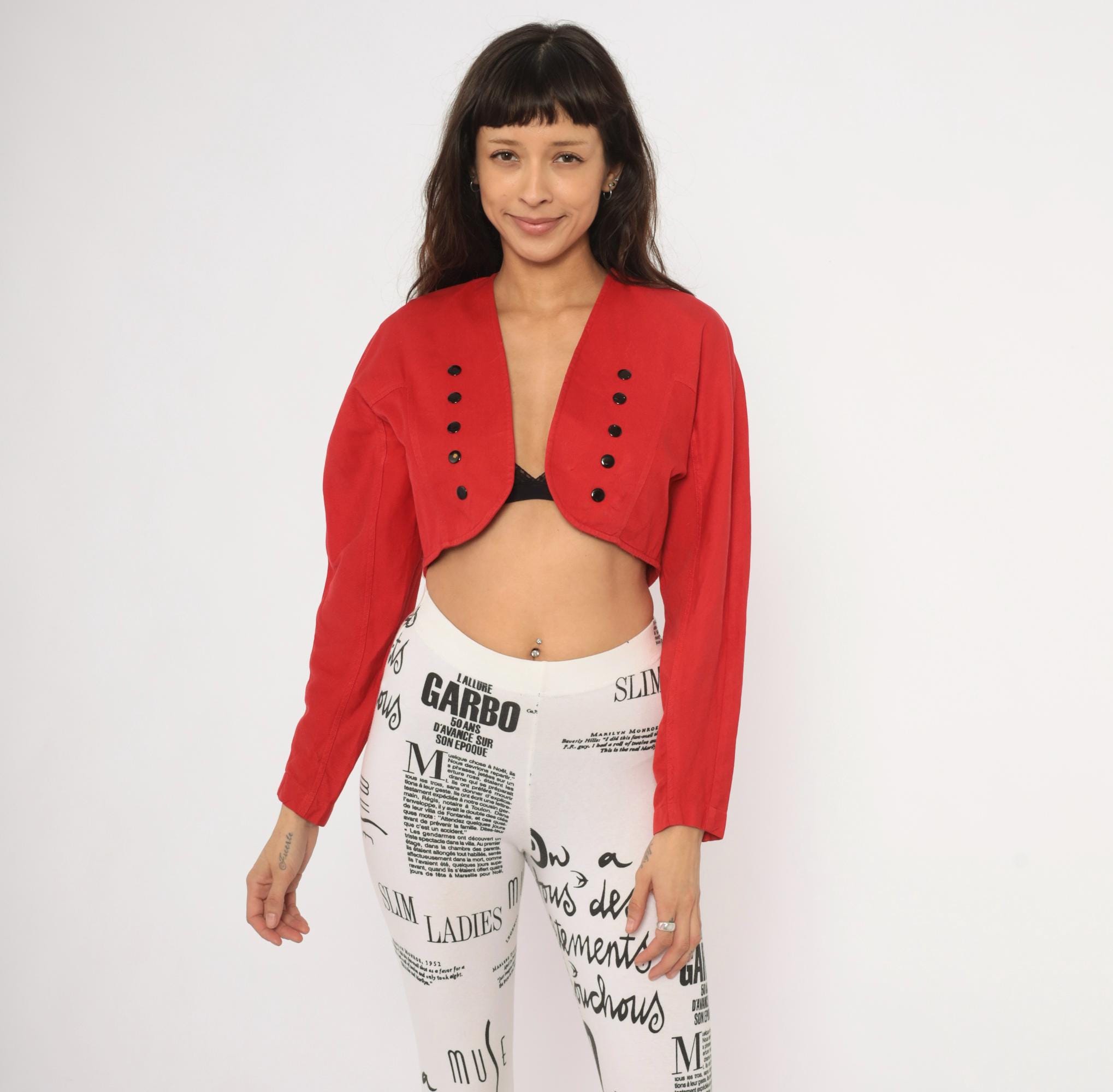 80s red cropped bolero jacket from Code Nouveau with a deep V neckline and double rows of decorative black buttons on each front panel. Structured shoulders, long sleeves, and a short hemline that hits at the natural waist. The back has a clean, fitted silhouette with a yoke seam across the upper back.