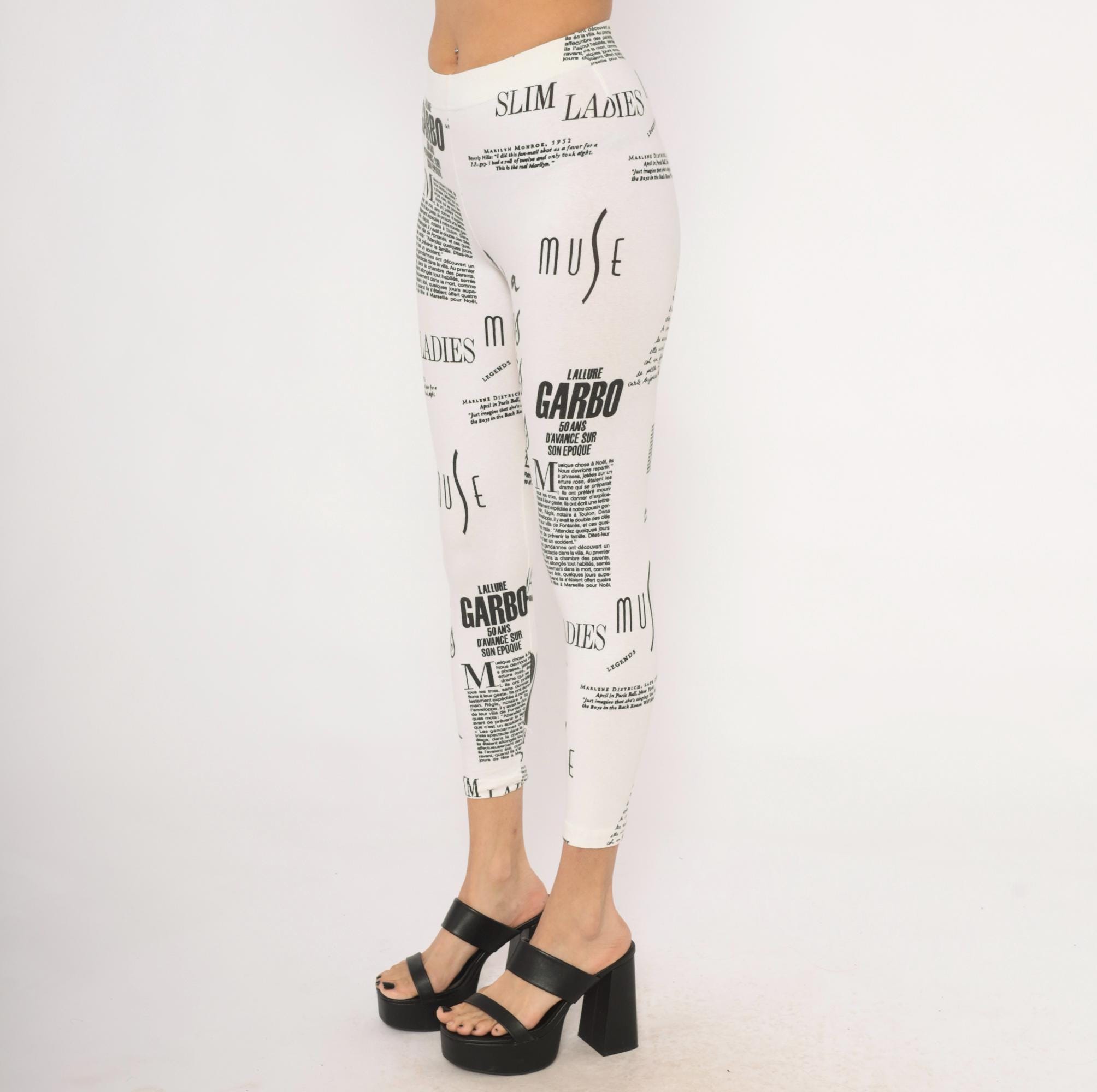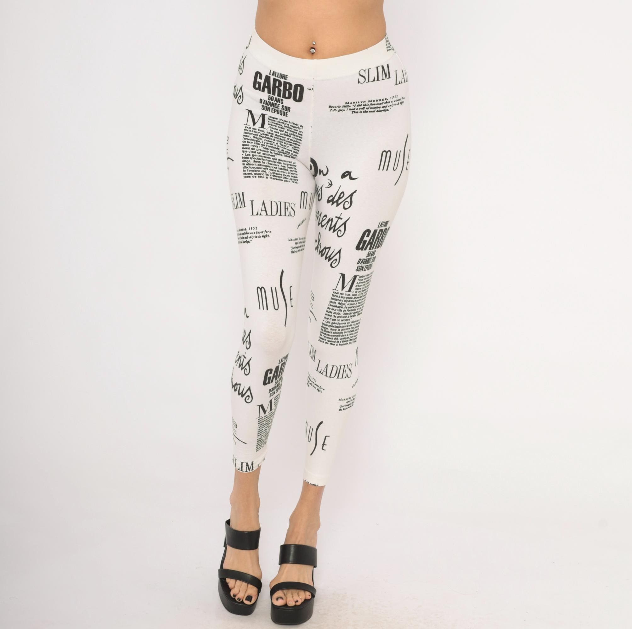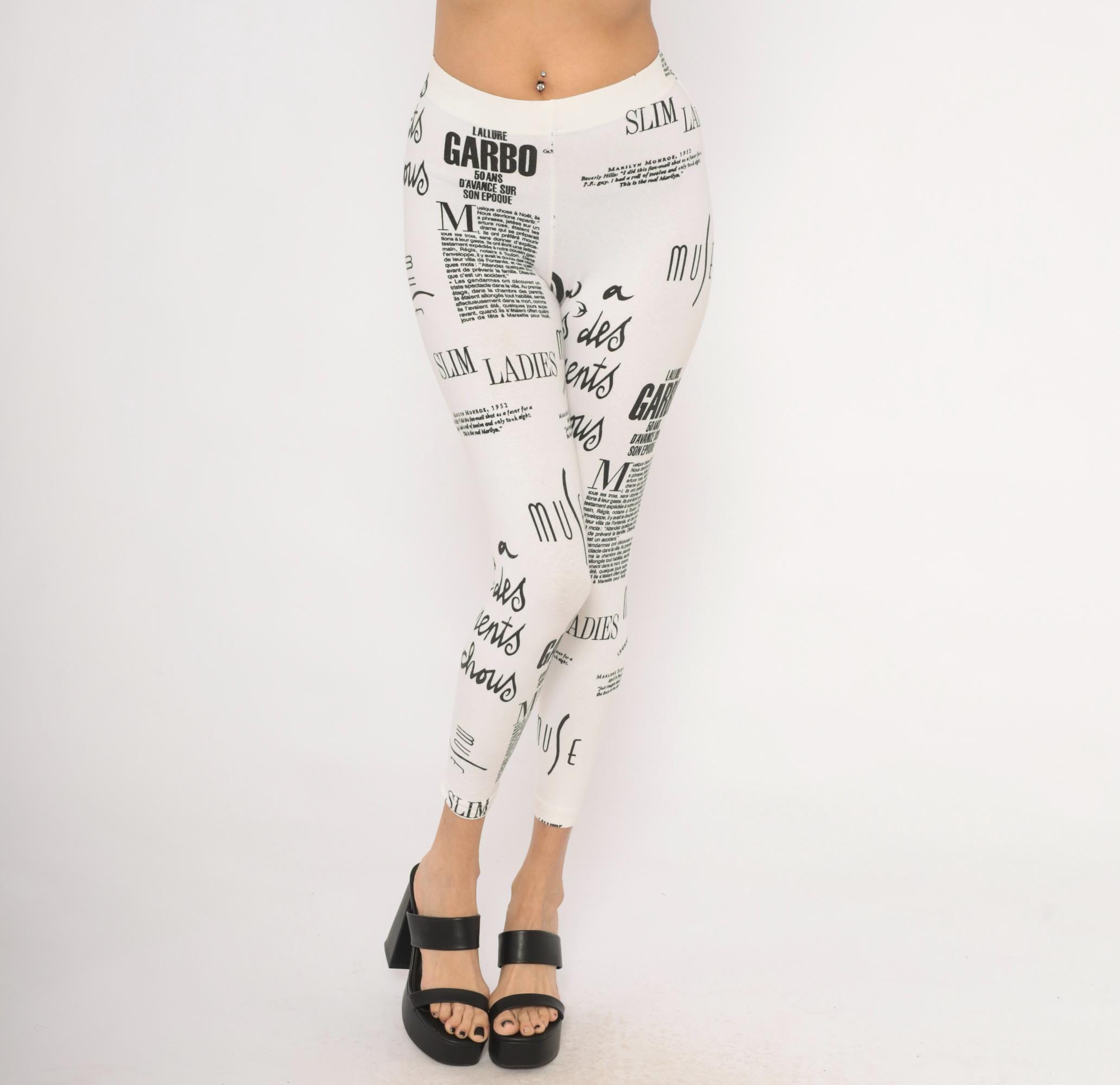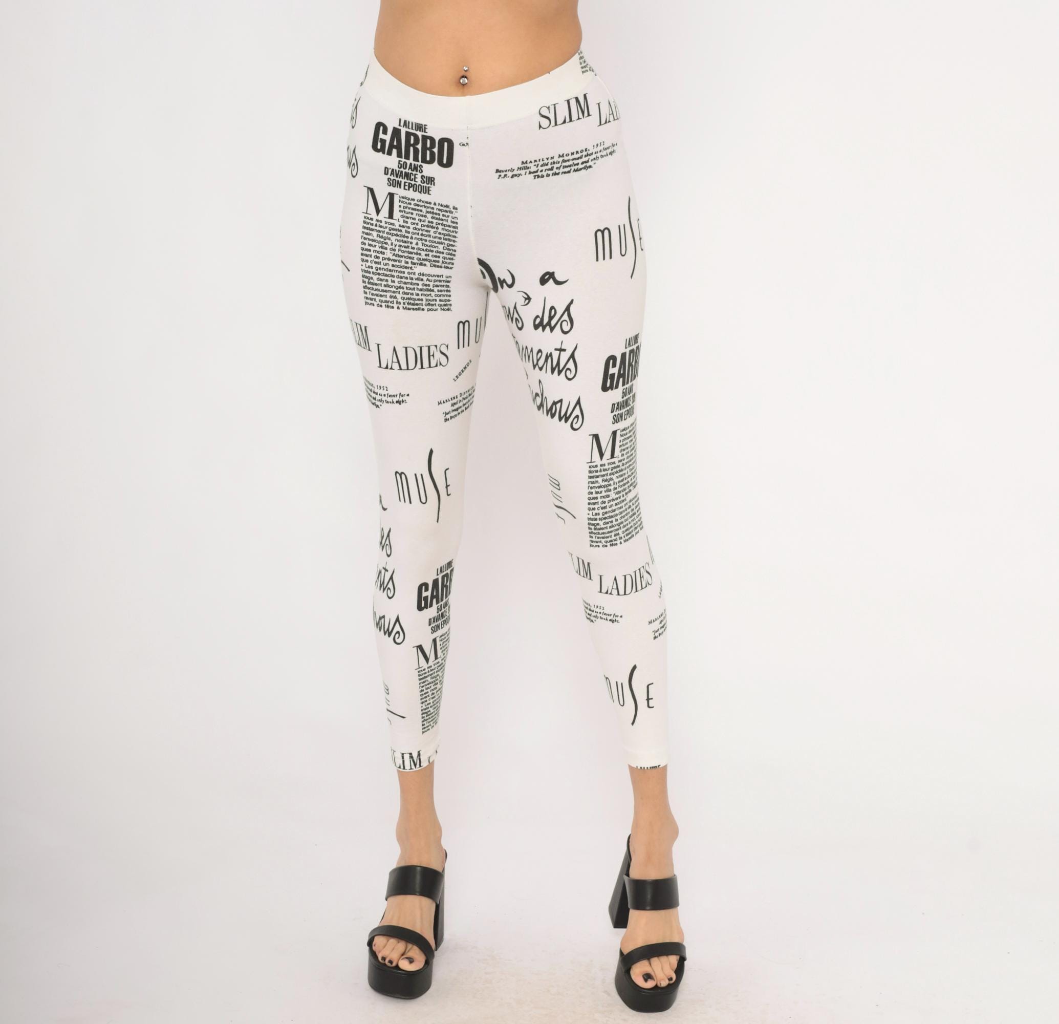 90s newspaper print leggings from The Limited with black typography scattered across a white base, including French text, headlines referencing Garbo, and words like "muse," "chouchous," and "vêtements" in mixed fonts and sizes. Elastic pull-on waistband, cropped ankle length, and fitted silhouette throughout. Allover collage-style print covers front, back, and sides with varying typefaces from script to bold block lettering.