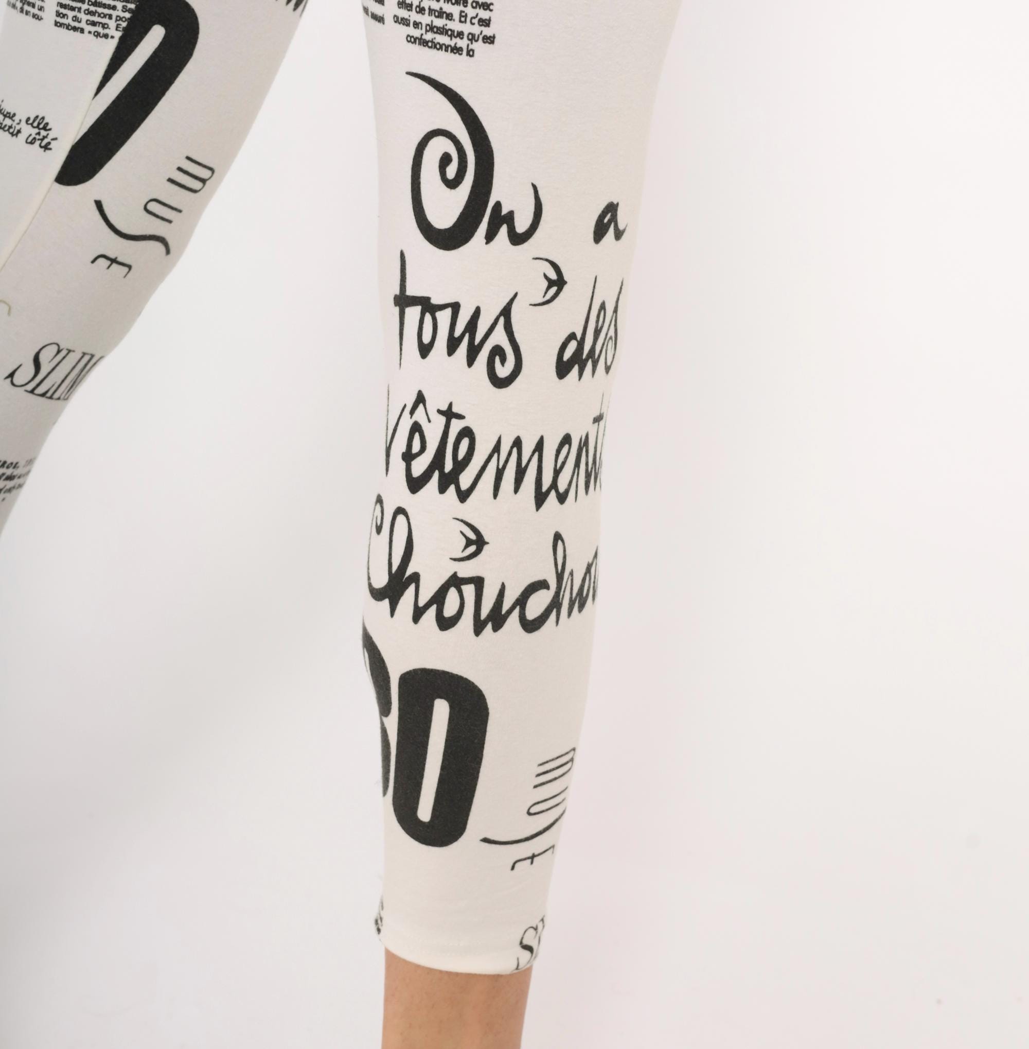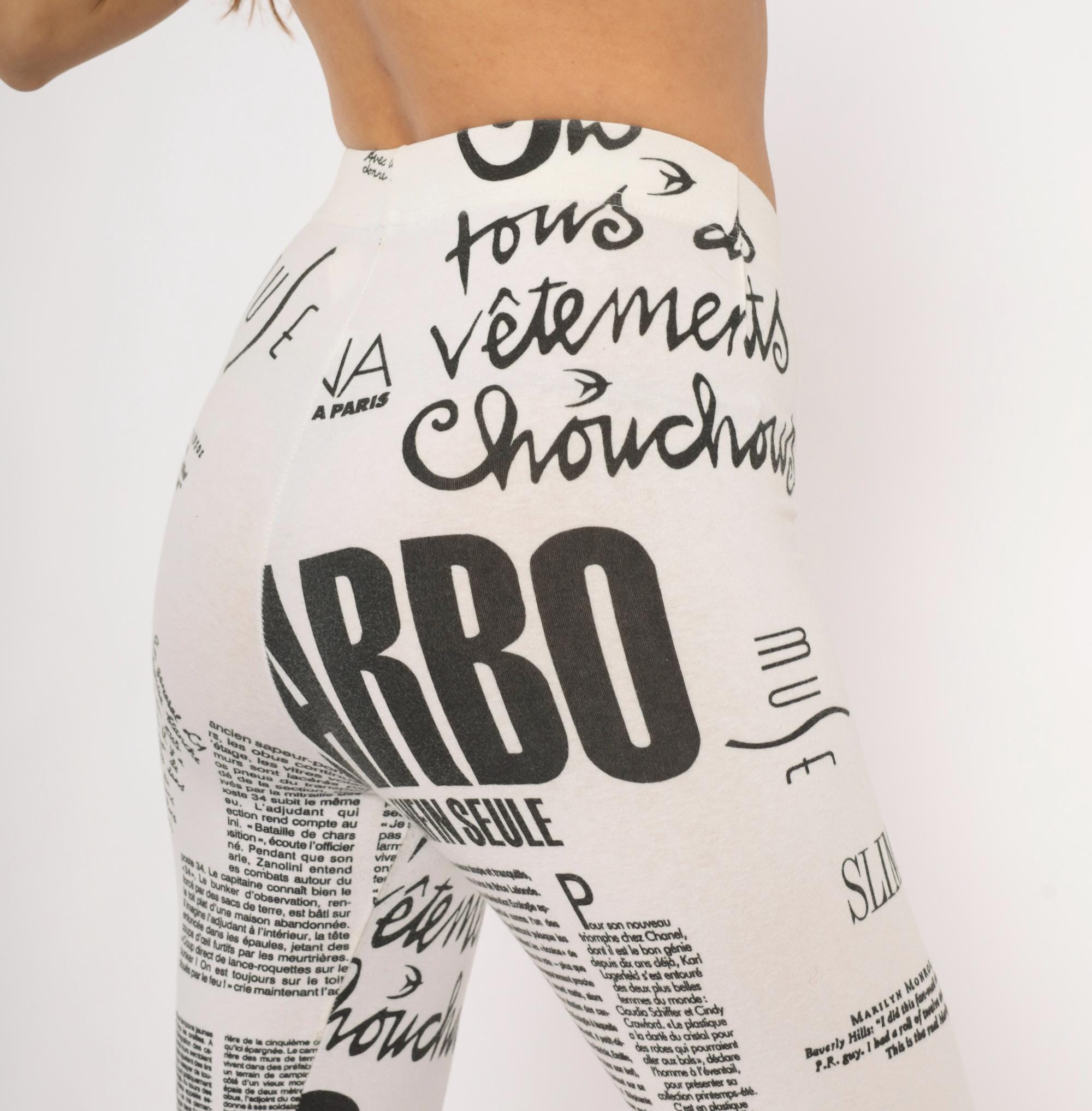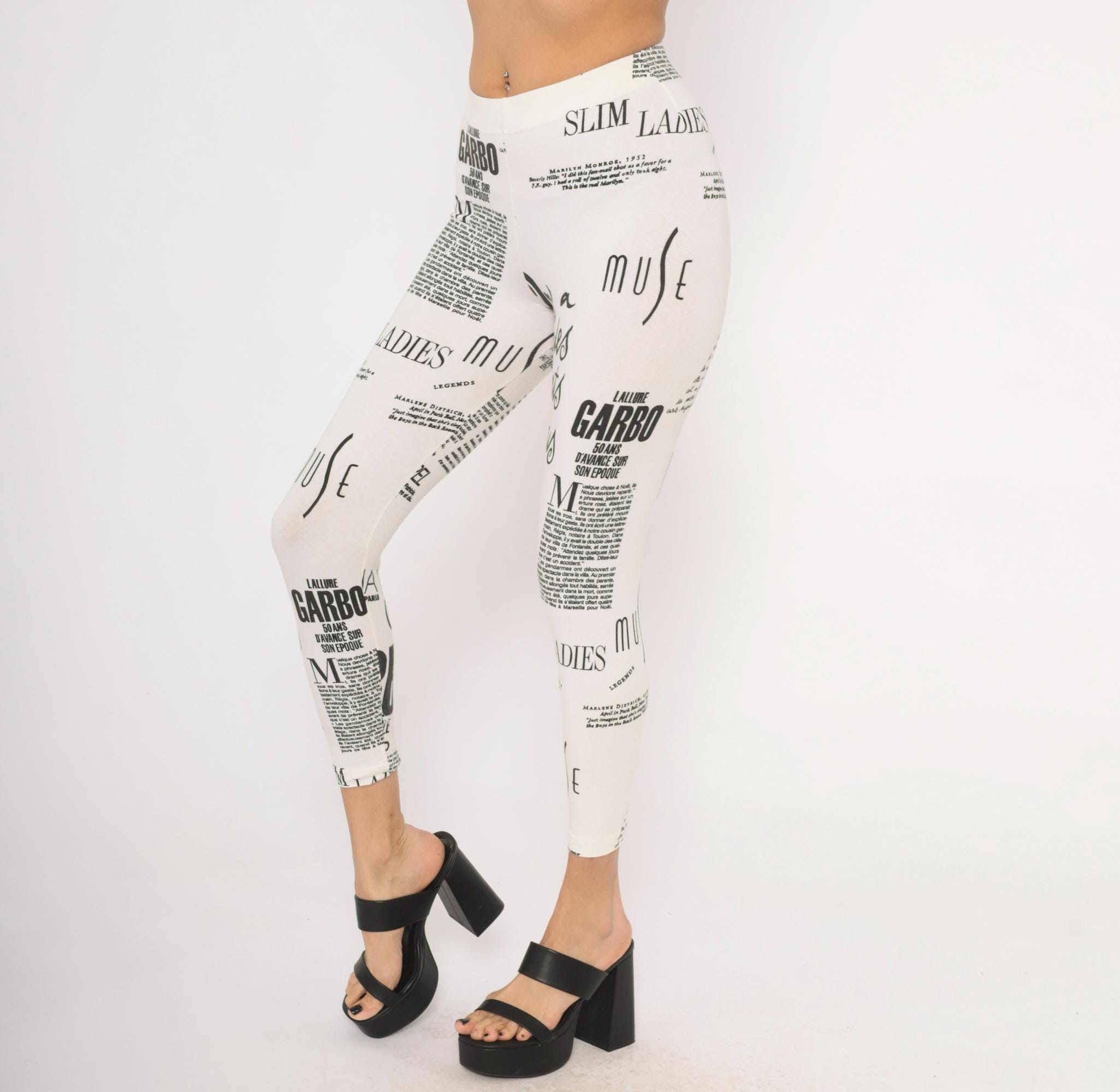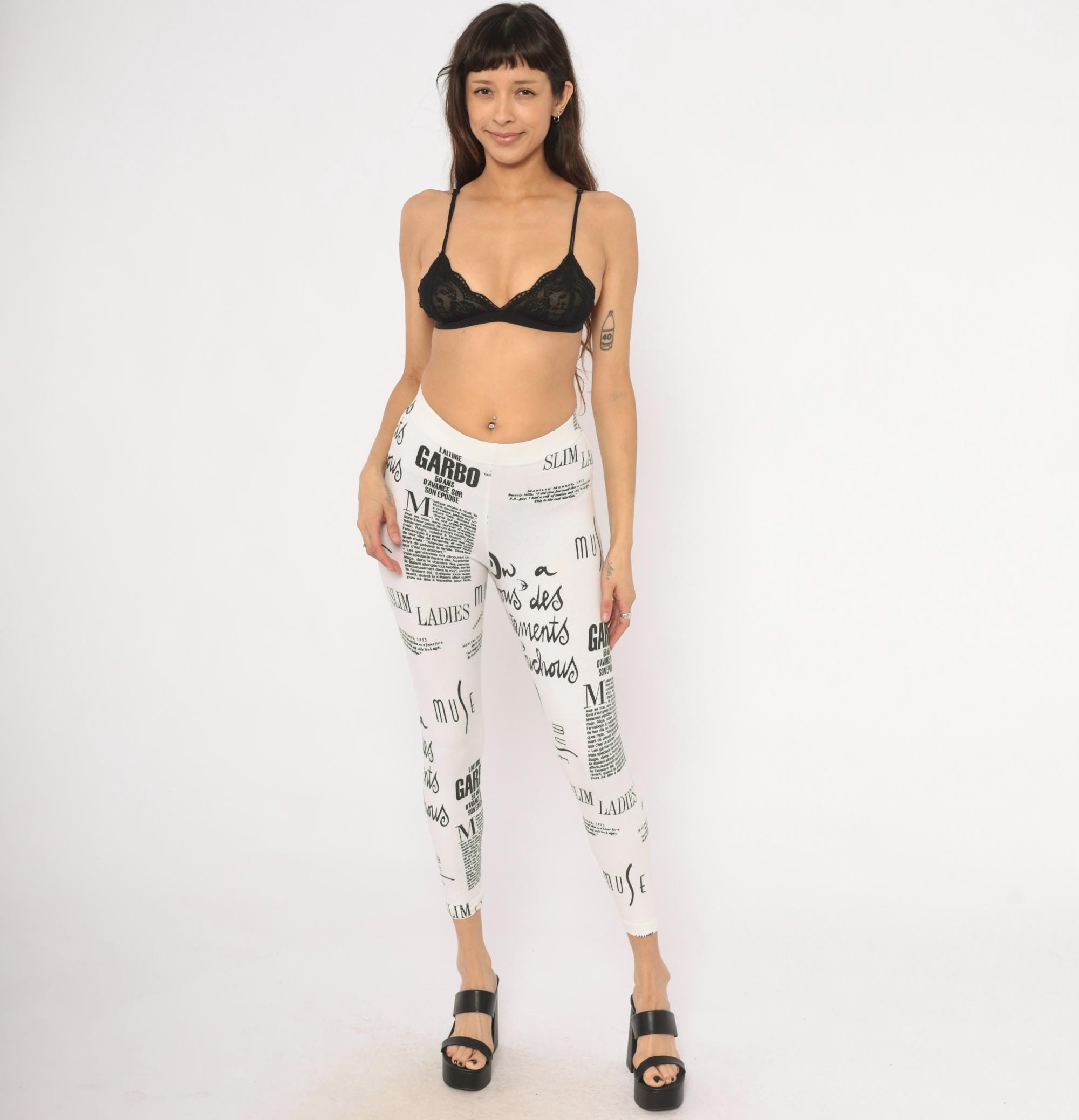 90s newspaper print leggings from The Limited with black typography scattered across a white base, including French text, headlines referencing Garbo, and words like "muse," "chouchous," and "vêtements" in mixed fonts and sizes. Elastic pull-on waistband, cropped ankle length, and fitted silhouette throughout. Allover collage-style print covers front, back, and sides with varying typefaces from script to bold block lettering.