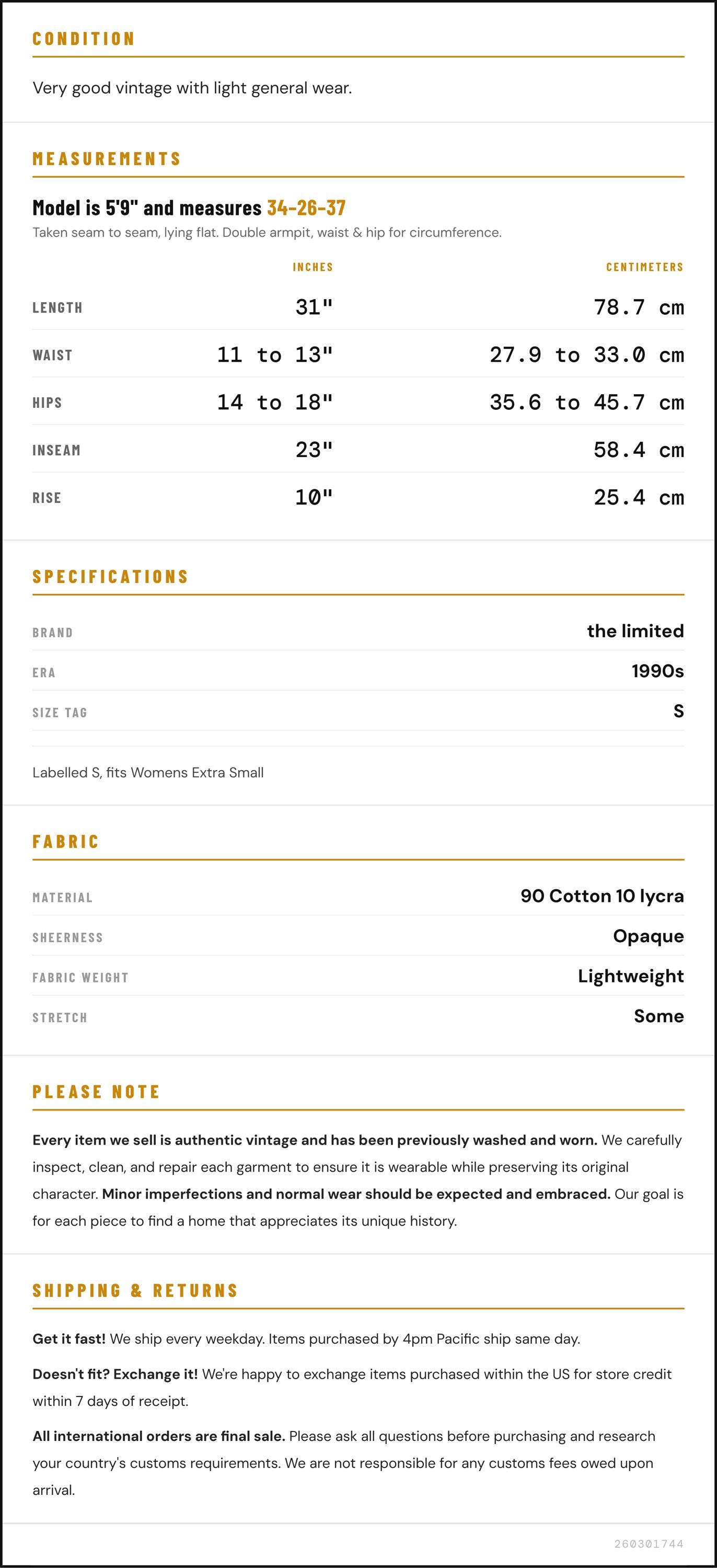 Vintage denim was usually made without any stretch, unlike modern jeans. Check the measurements to ensure proper fit, and remember to give yourself a little wiggle room in the waist and hips, depending on your preferred fit.