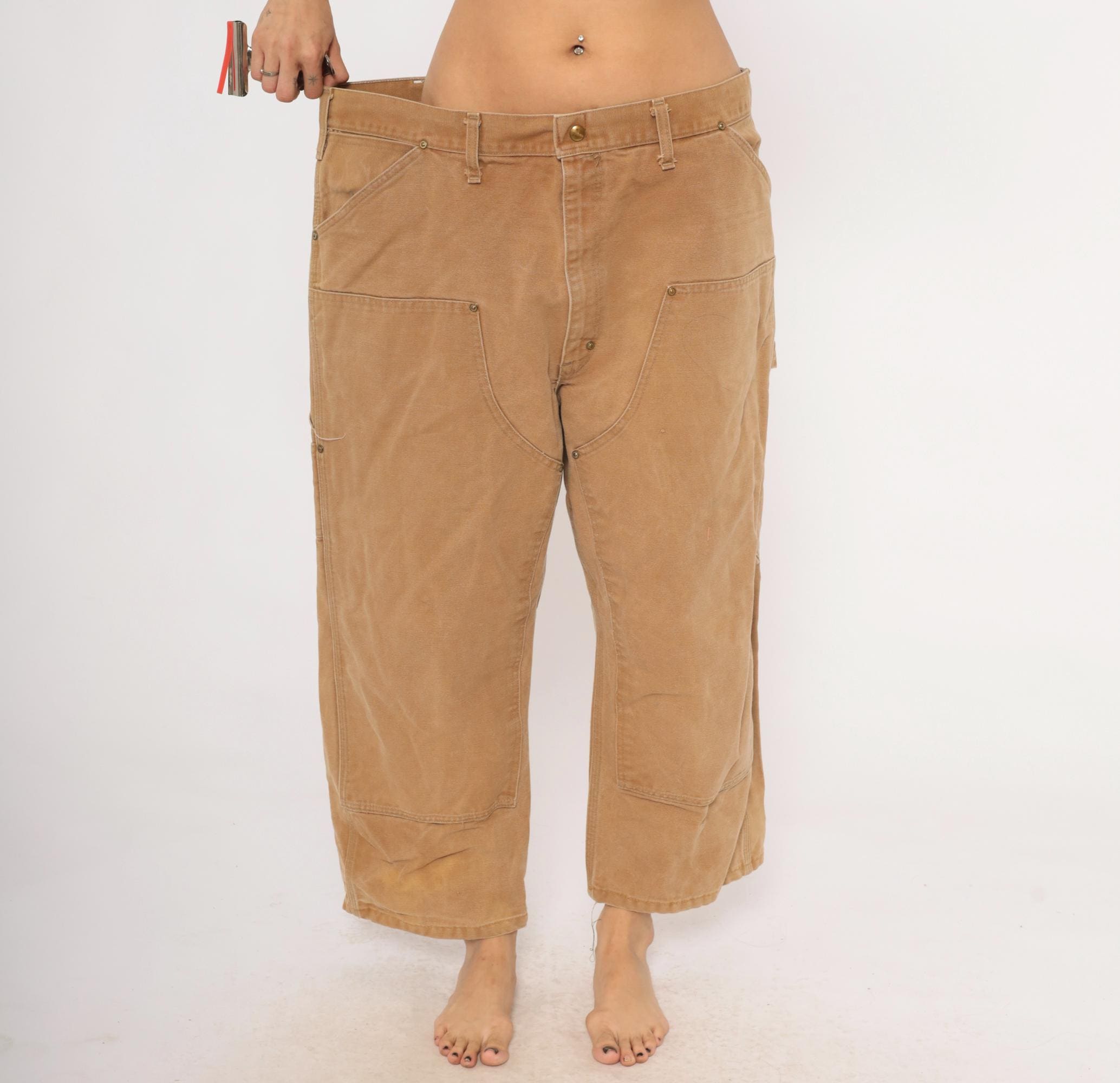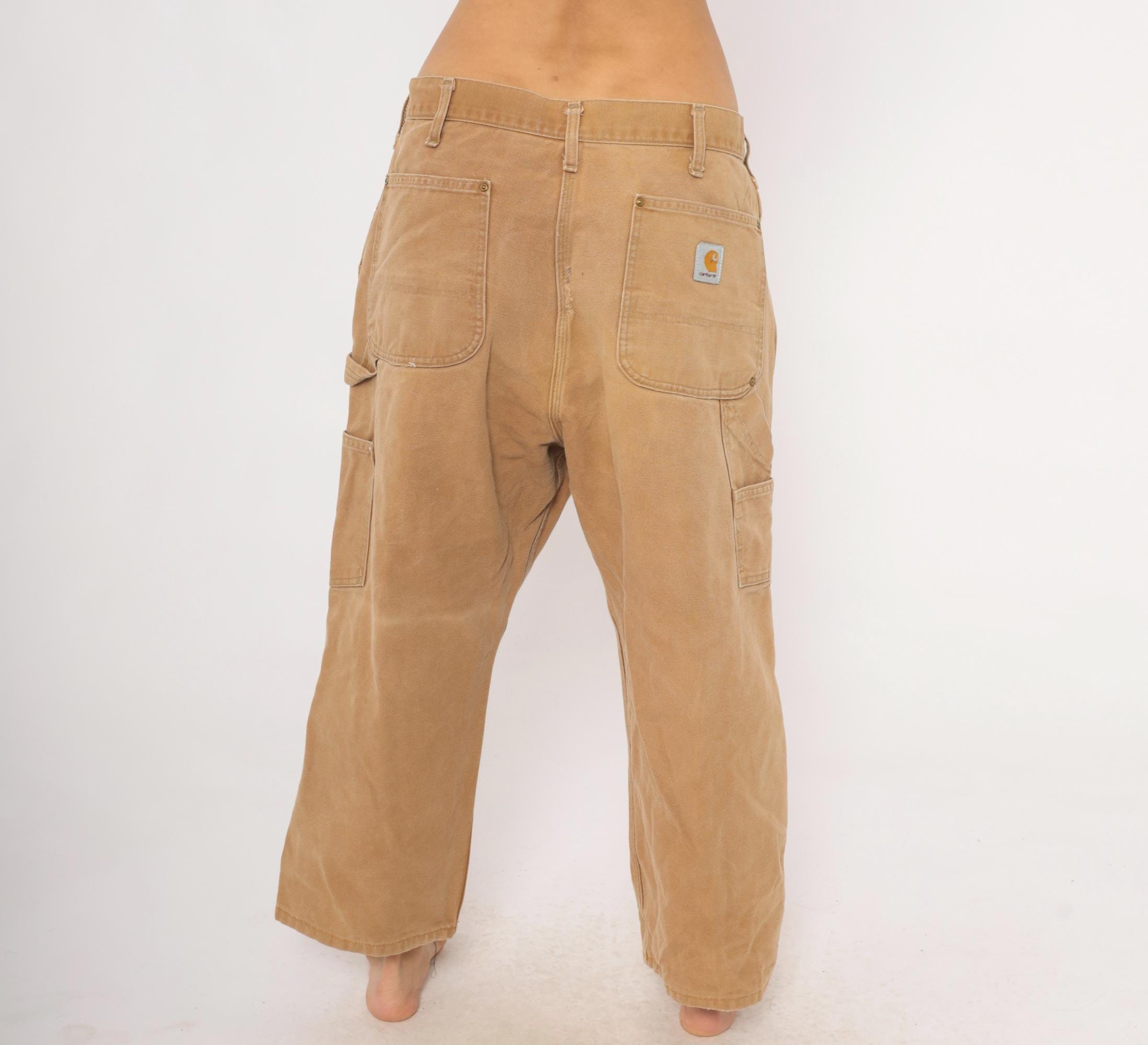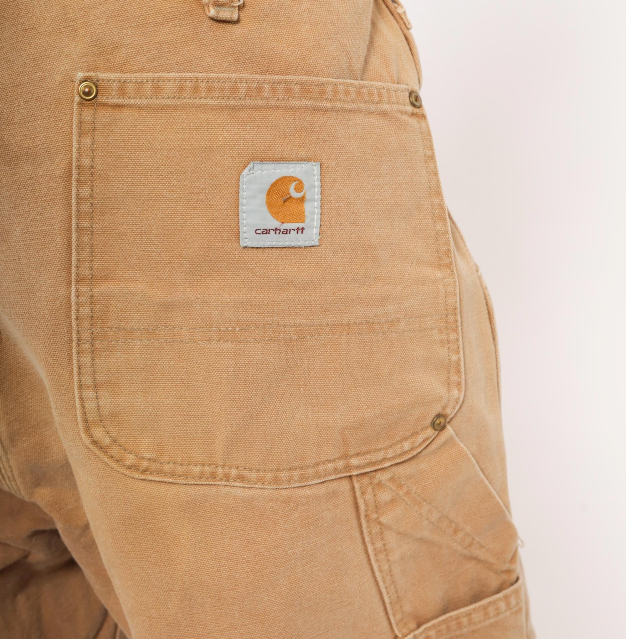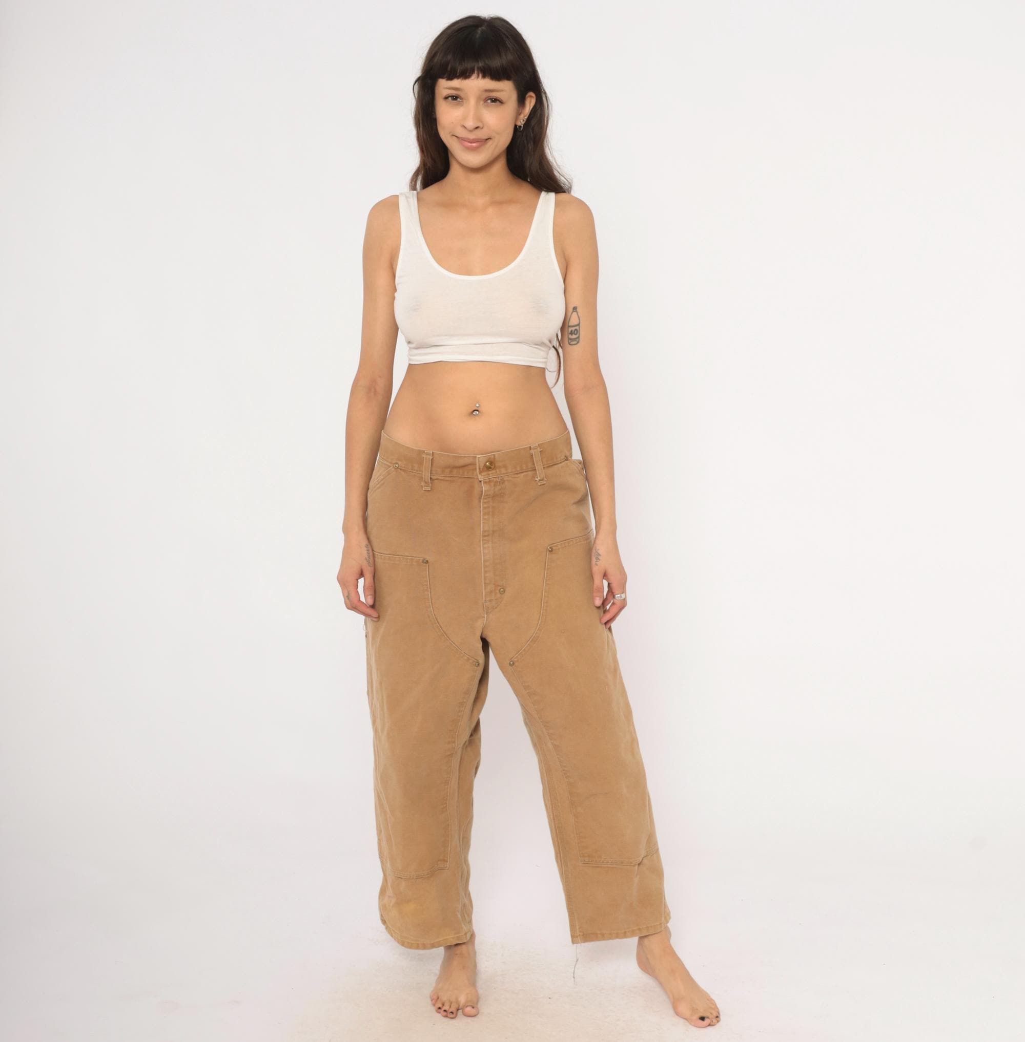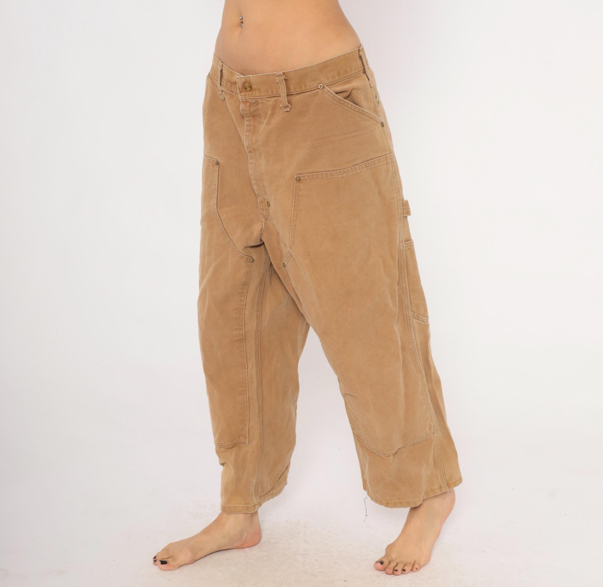 2000s Carhartt double knee carpenter pants in a faded tan canvas with rivet-reinforced front pockets, back pockets, and side utility loops. Front zipper closure with brass button, belt loops along the waistband, and reinforced double-layer knee panels. Tonal stitching throughout with a relaxed, wide straight leg silhouette and a hammer loop on the right side.