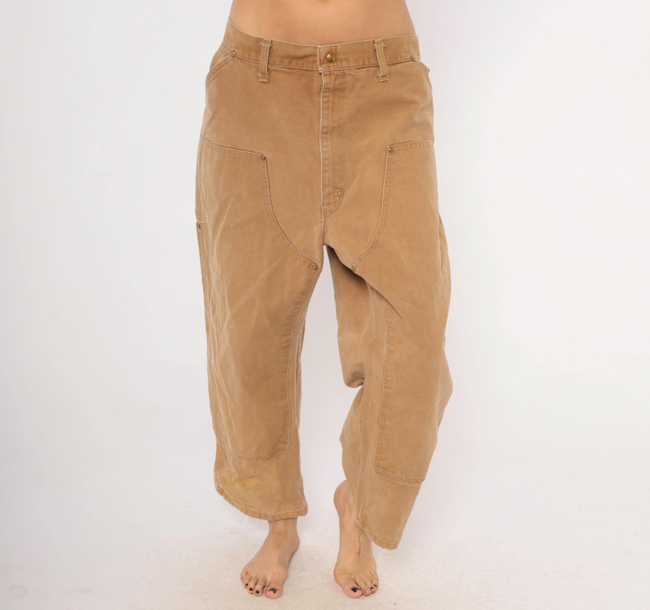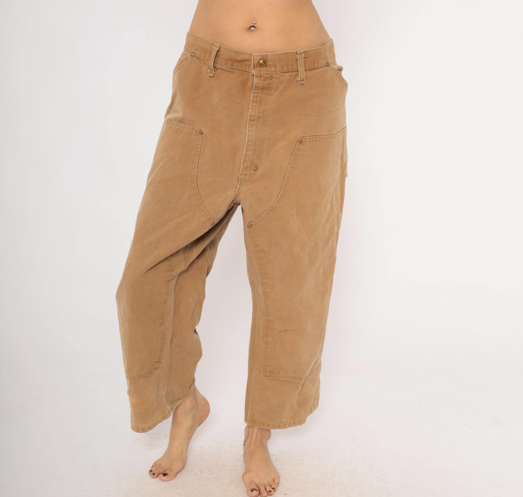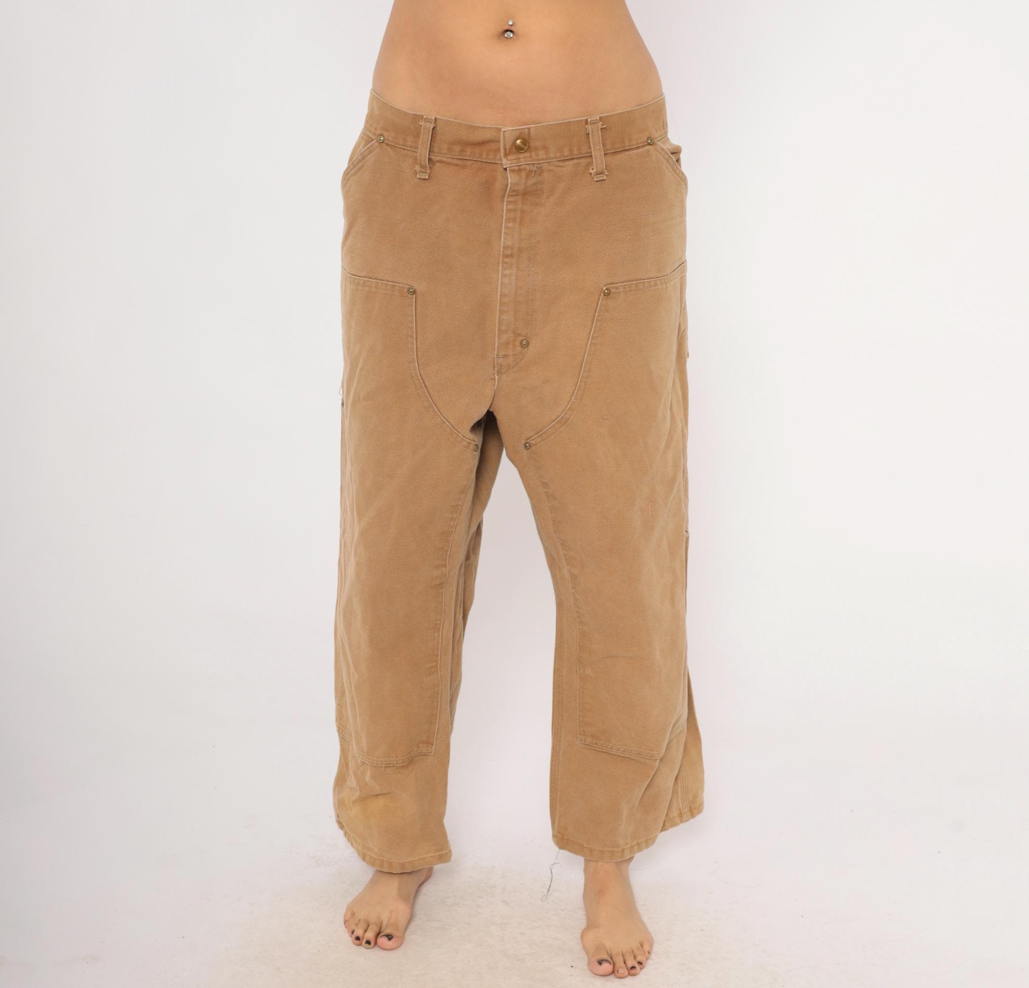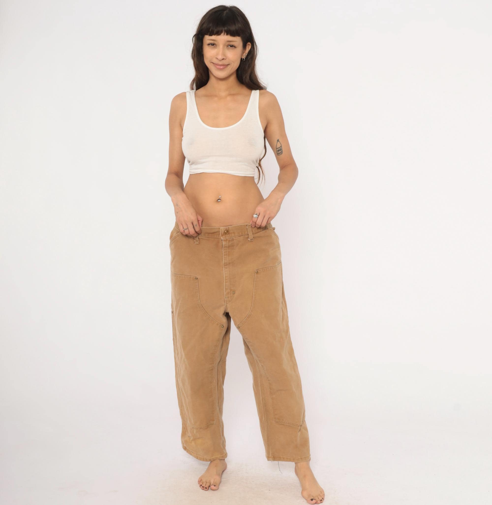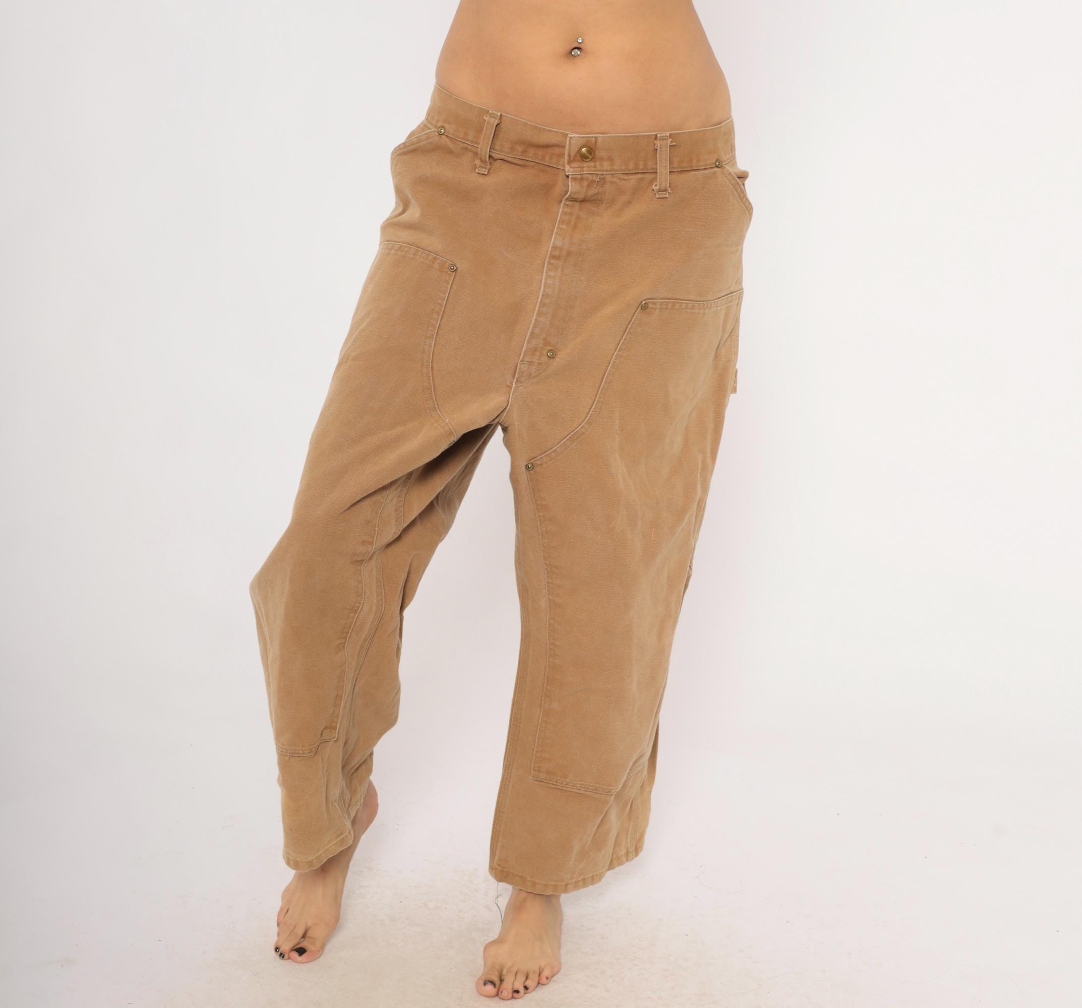 2000s Carhartt double knee carpenter pants in a faded tan canvas with rivet-reinforced front pockets, back pockets, and side utility loops. Front zipper closure with brass button, belt loops along the waistband, and reinforced double-layer knee panels. Tonal stitching throughout with a relaxed, wide straight leg silhouette and a hammer loop on the right side.