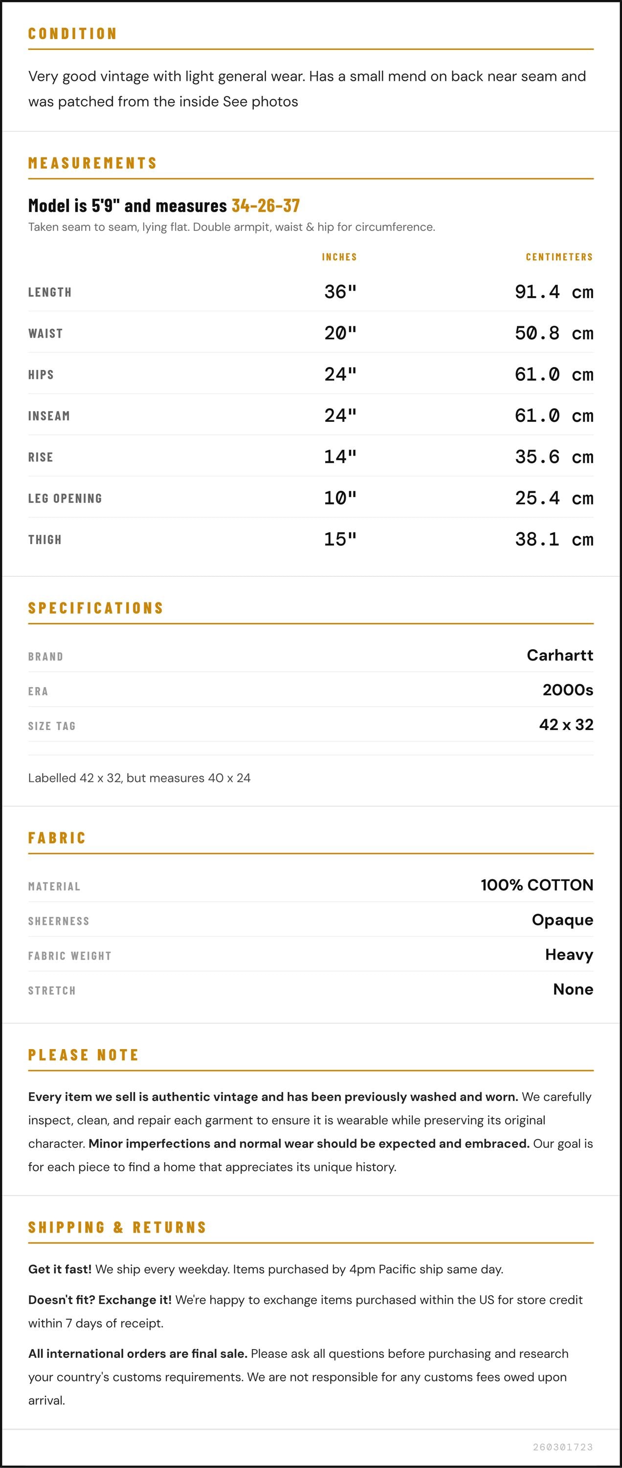 Vintage denim was usually made without any stretch, unlike modern jeans. Check the measurements to ensure proper fit, and remember to give yourself a little wiggle room in the waist and hips, depending on your preferred fit.