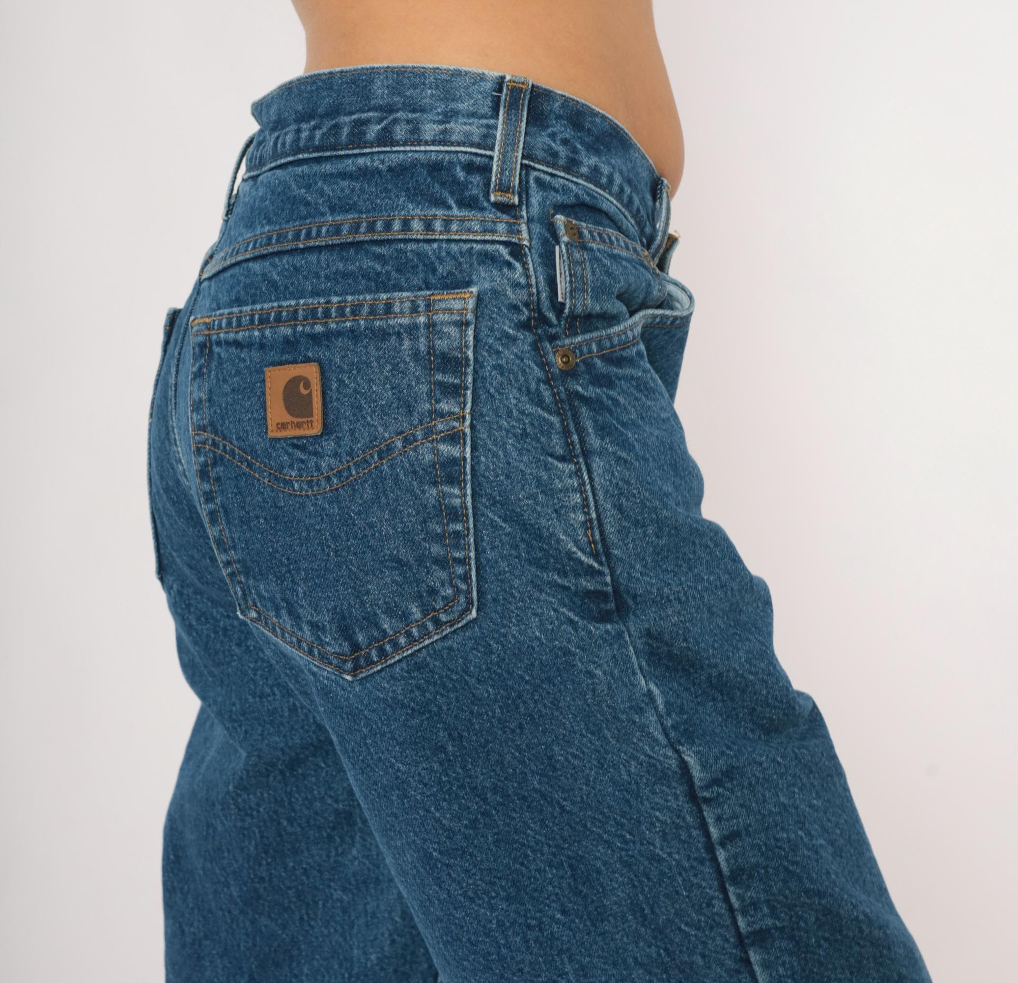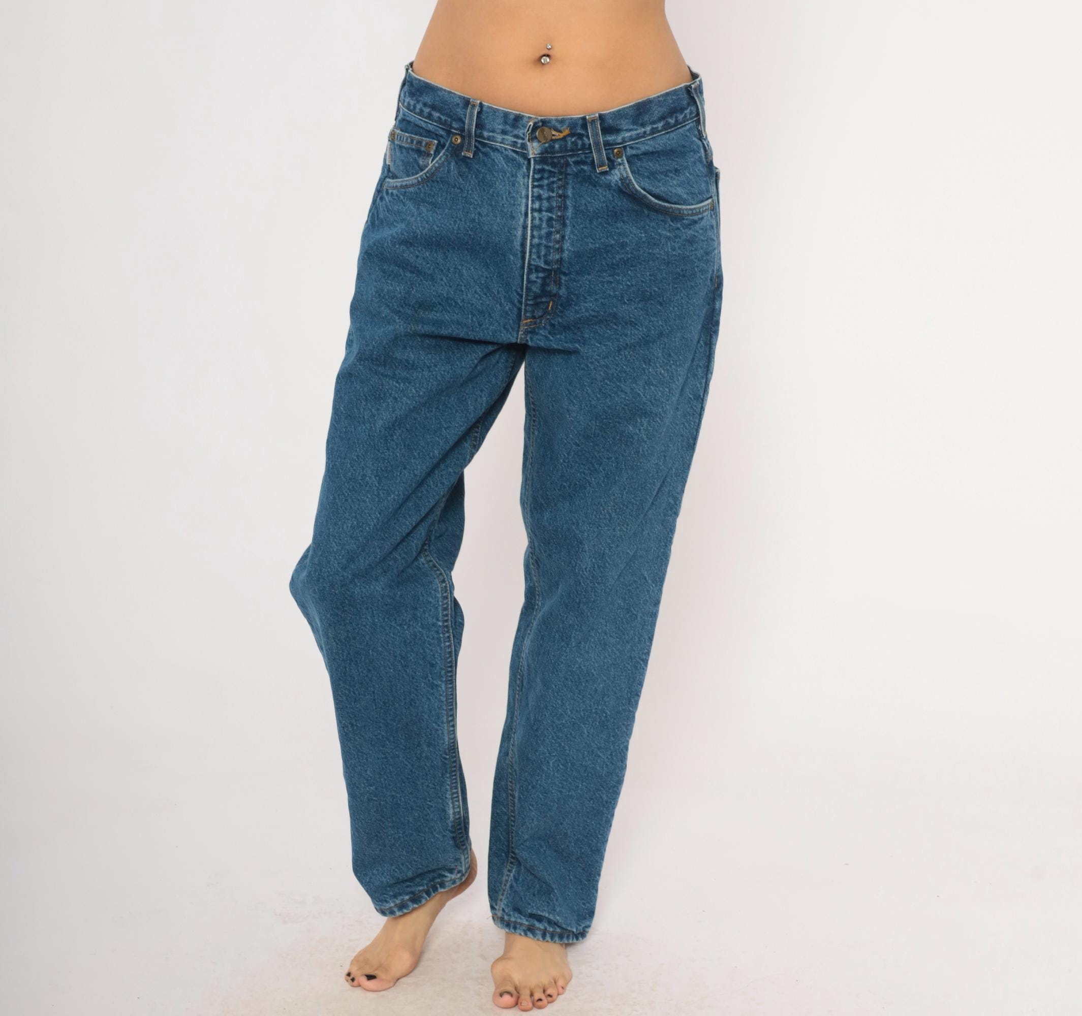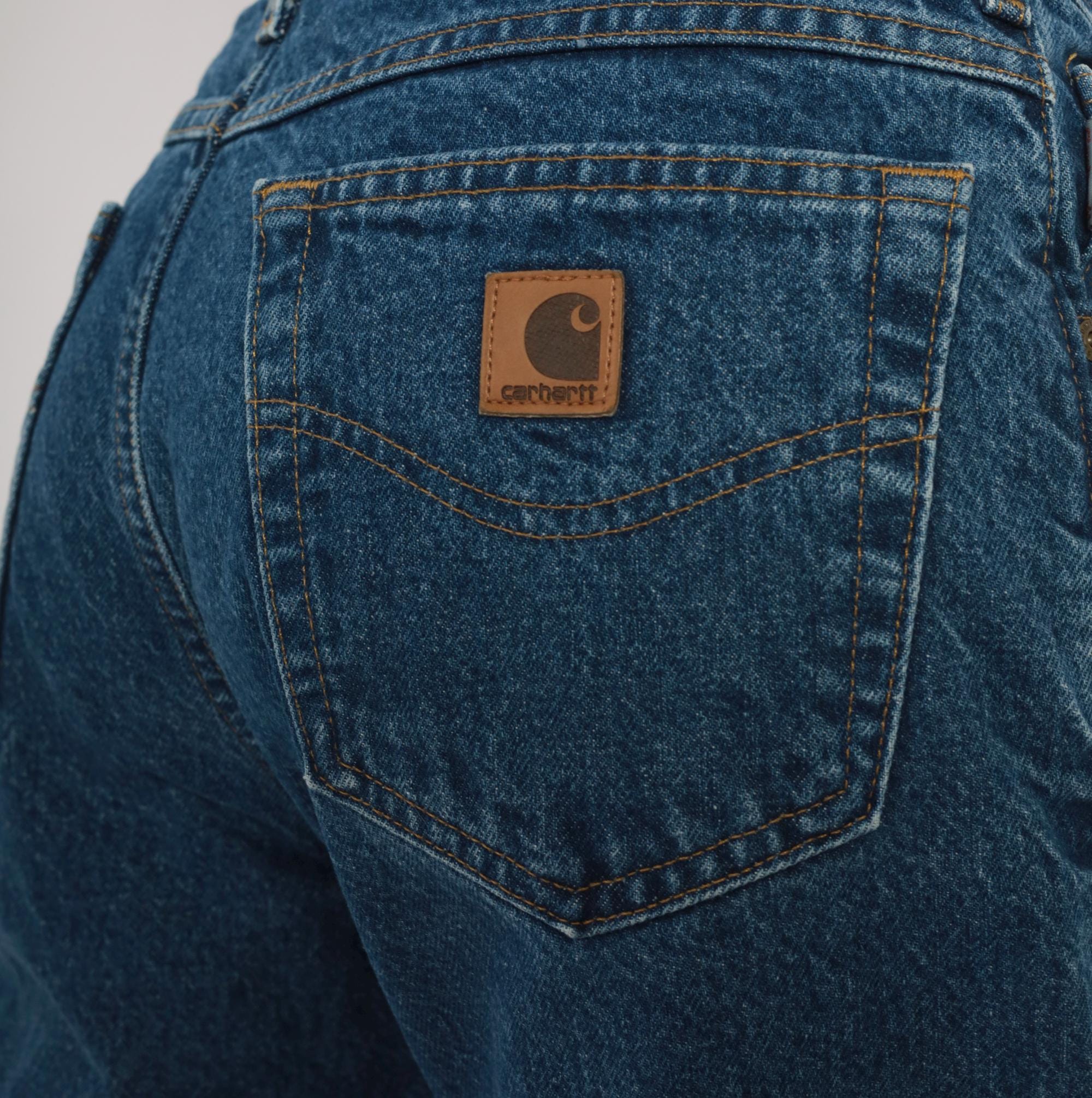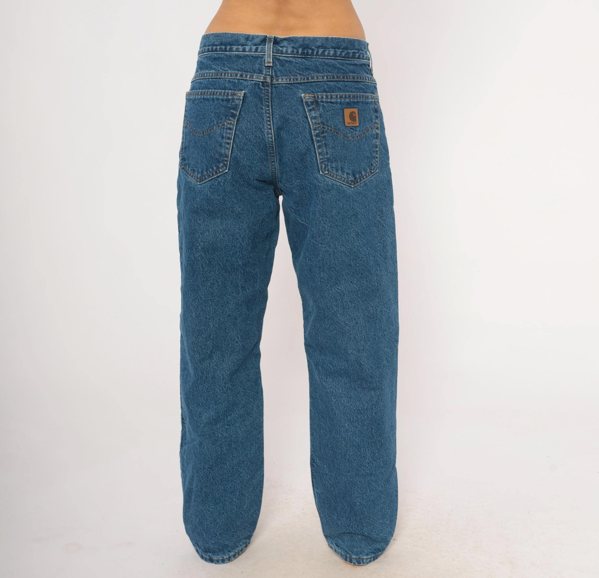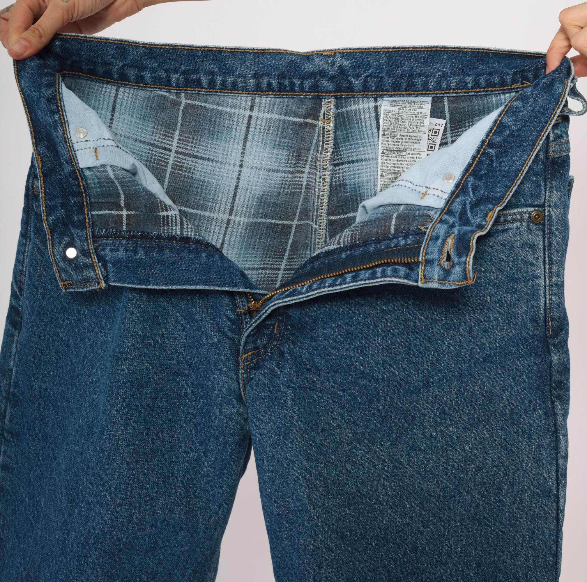 2000s Carhartt straight leg jeans in medium blue wash with plaid flannel lining throughout. Five-pocket construction with copper-tone rivets, zip fly closure, and belt loops. Contrast gold topstitching along seams, branded leather patch on the back right pocket.