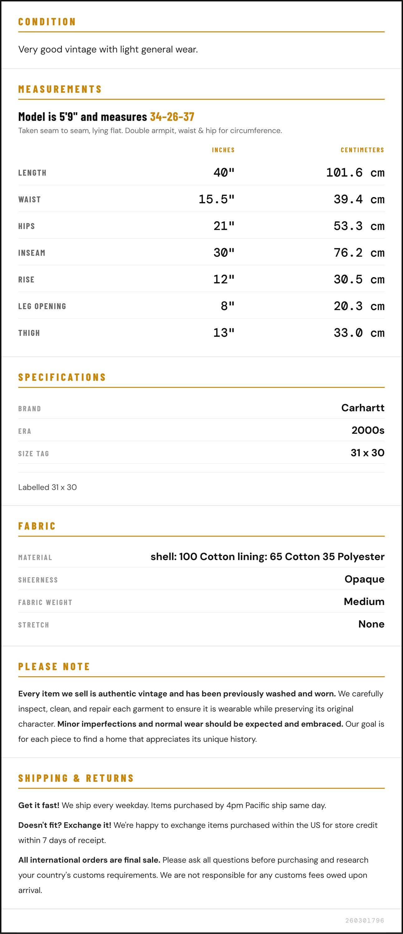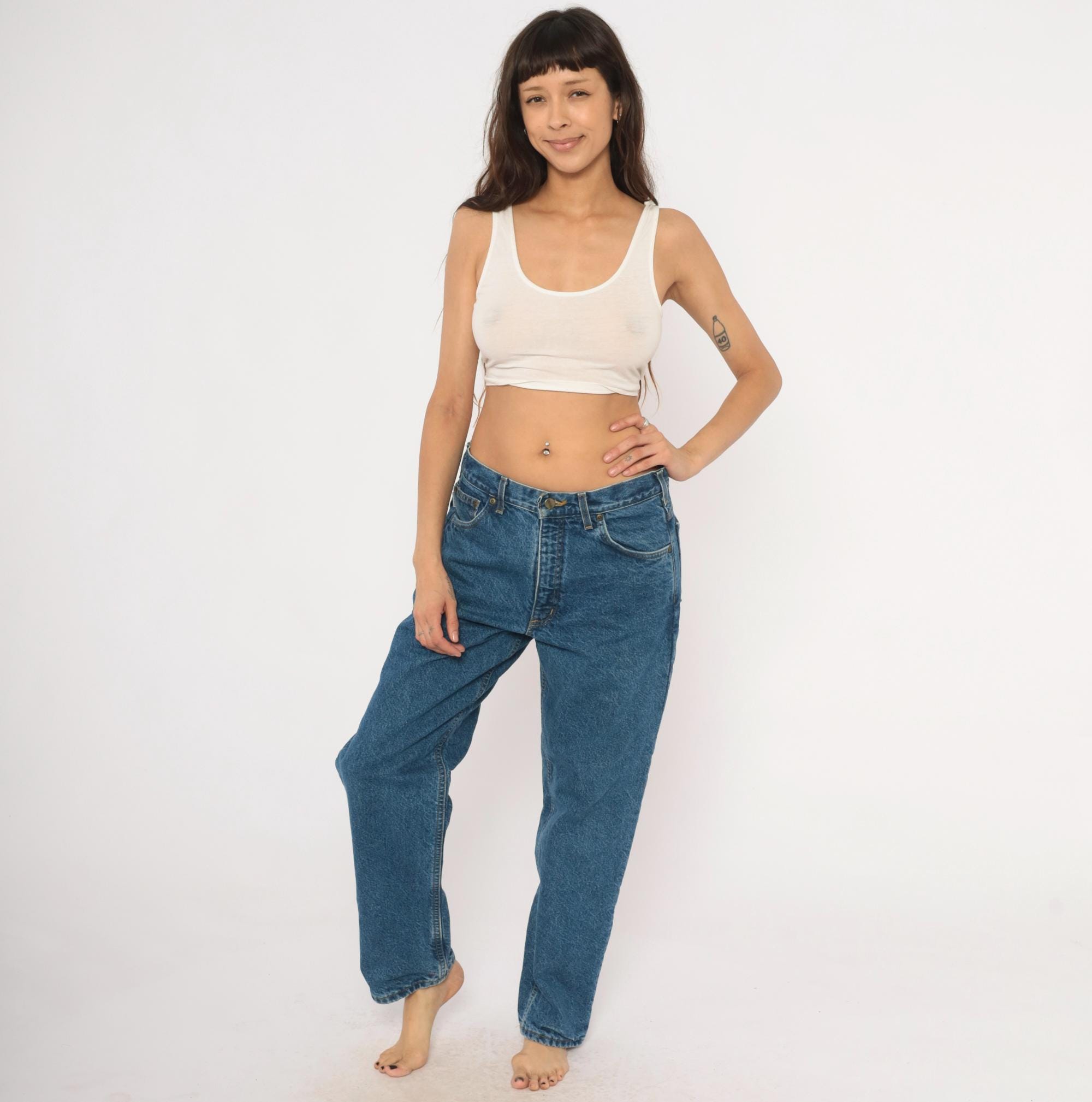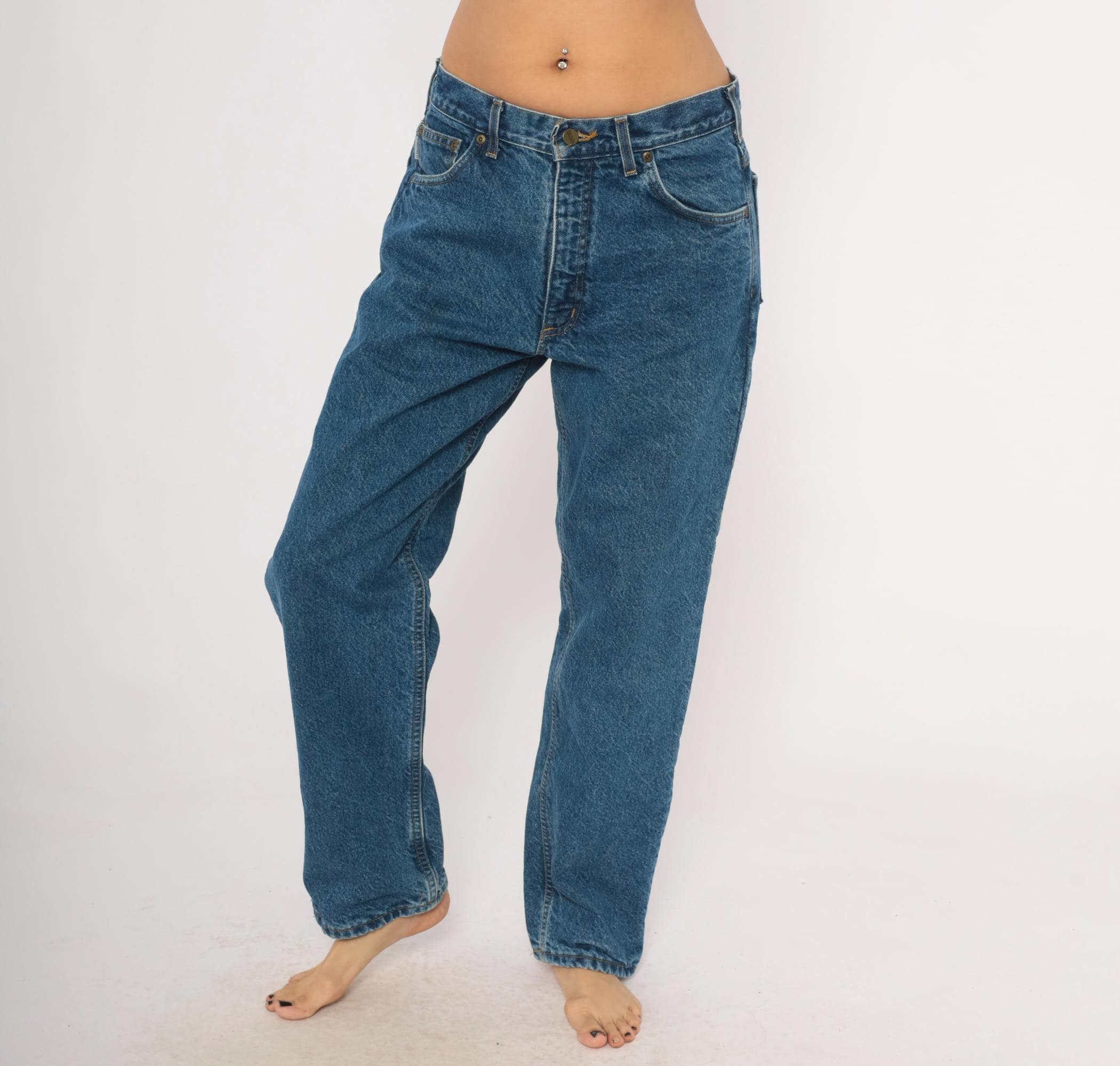 Vintage denim was usually made without any stretch, unlike modern jeans. Check the measurements to ensure proper fit, and remember to give yourself a little wiggle room in the waist and hips, depending on your preferred fit.