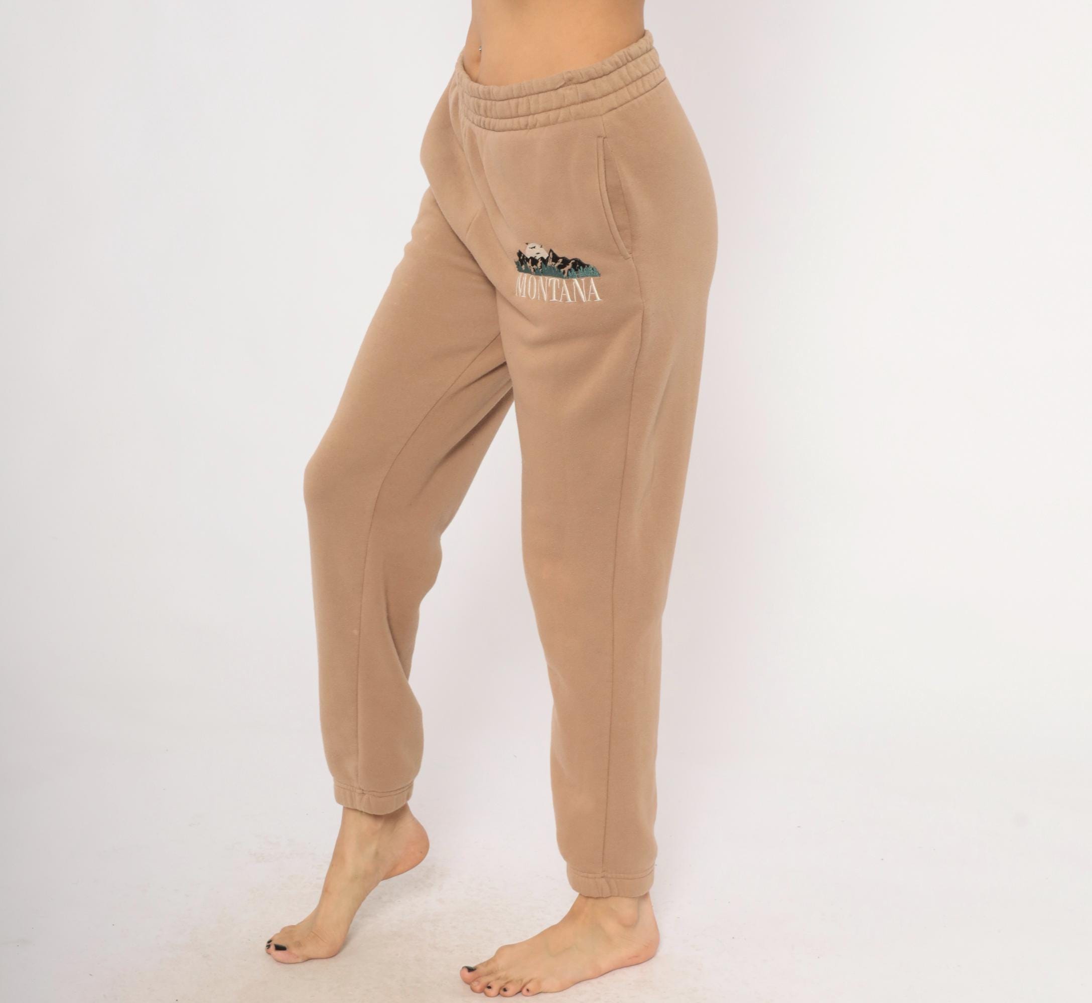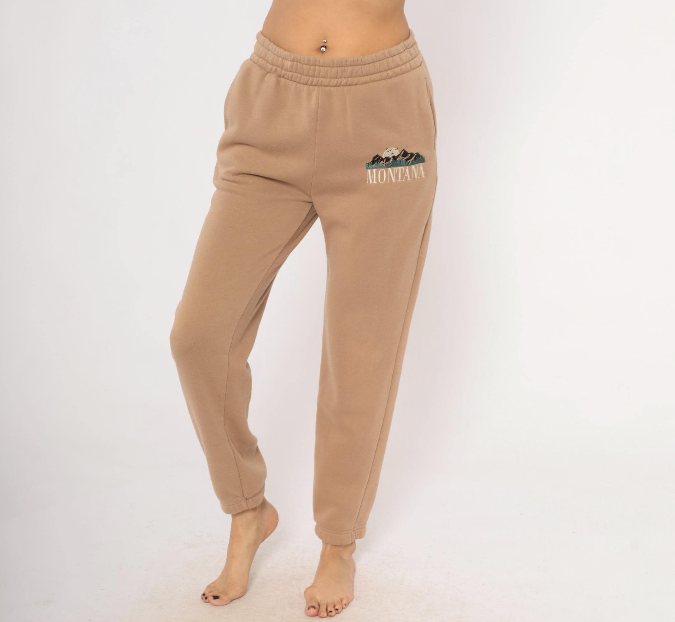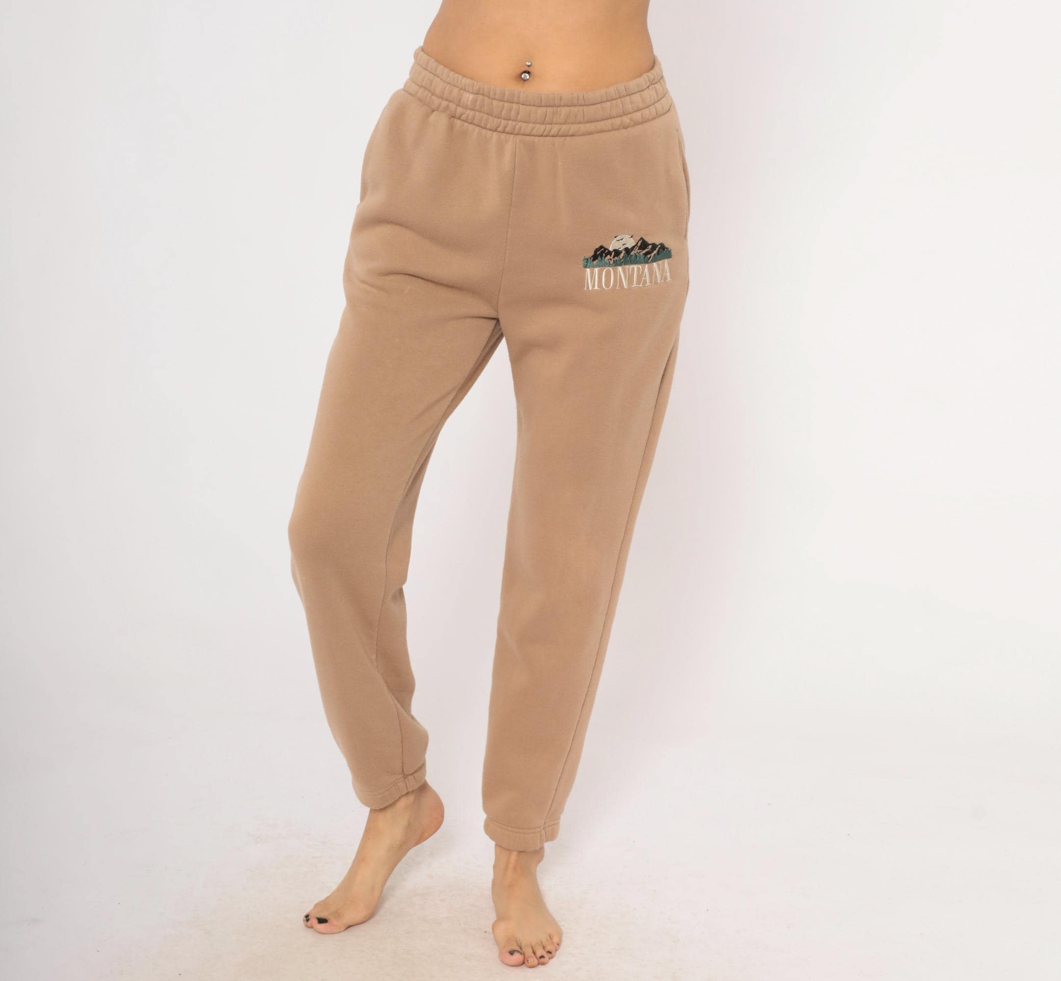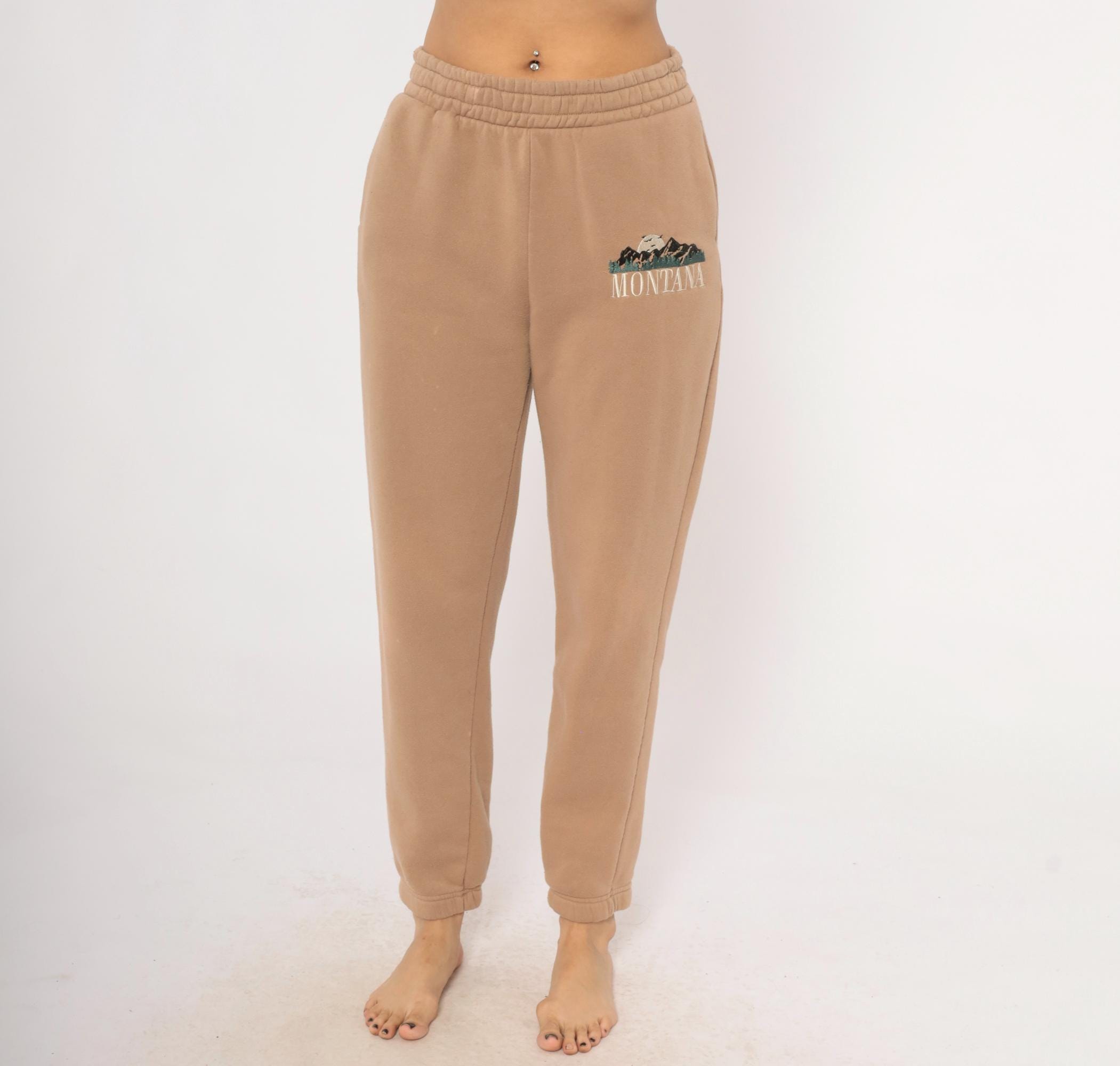2000s tan joggers with embroidered Montana mountain scene on the left thigh in dark green, black, and cream thread. Elastic waistband, side seam pockets, tapered leg with cuffed ankles. Fleece-lined interior with a relaxed fit through the hip and thigh.