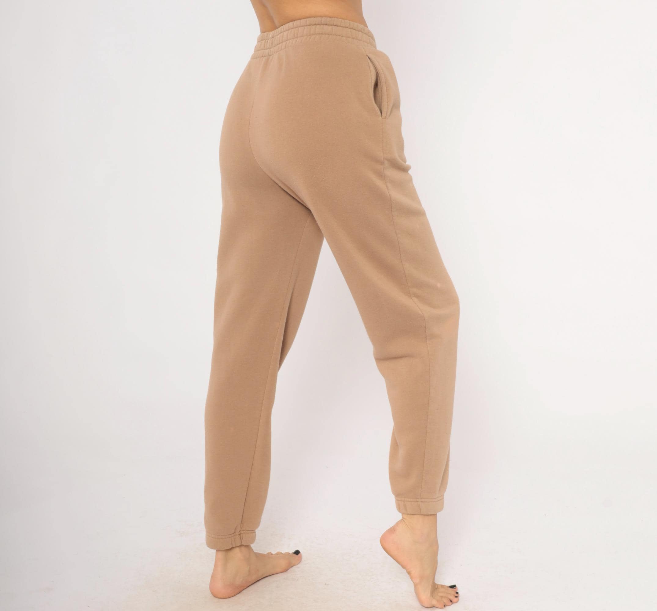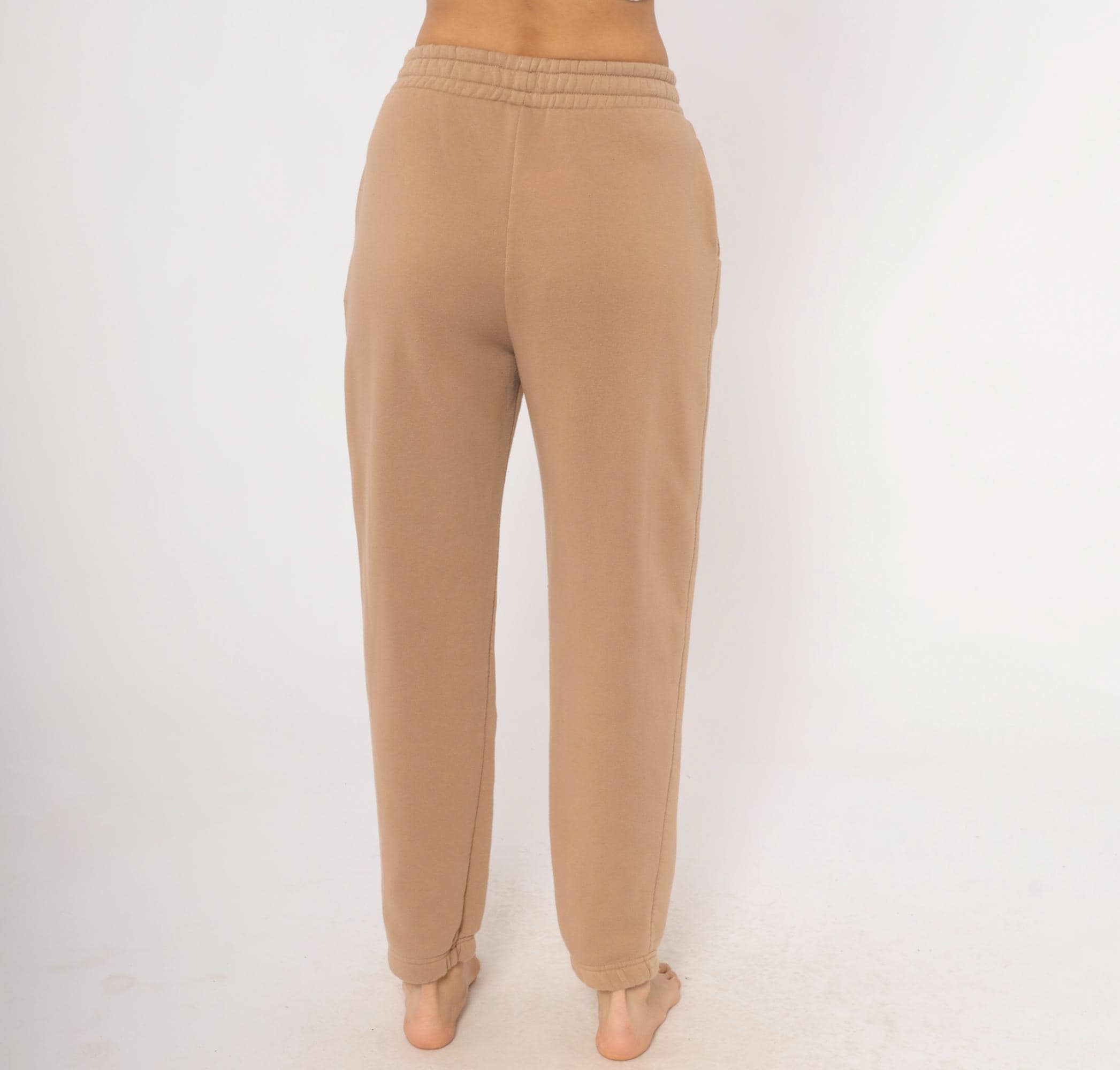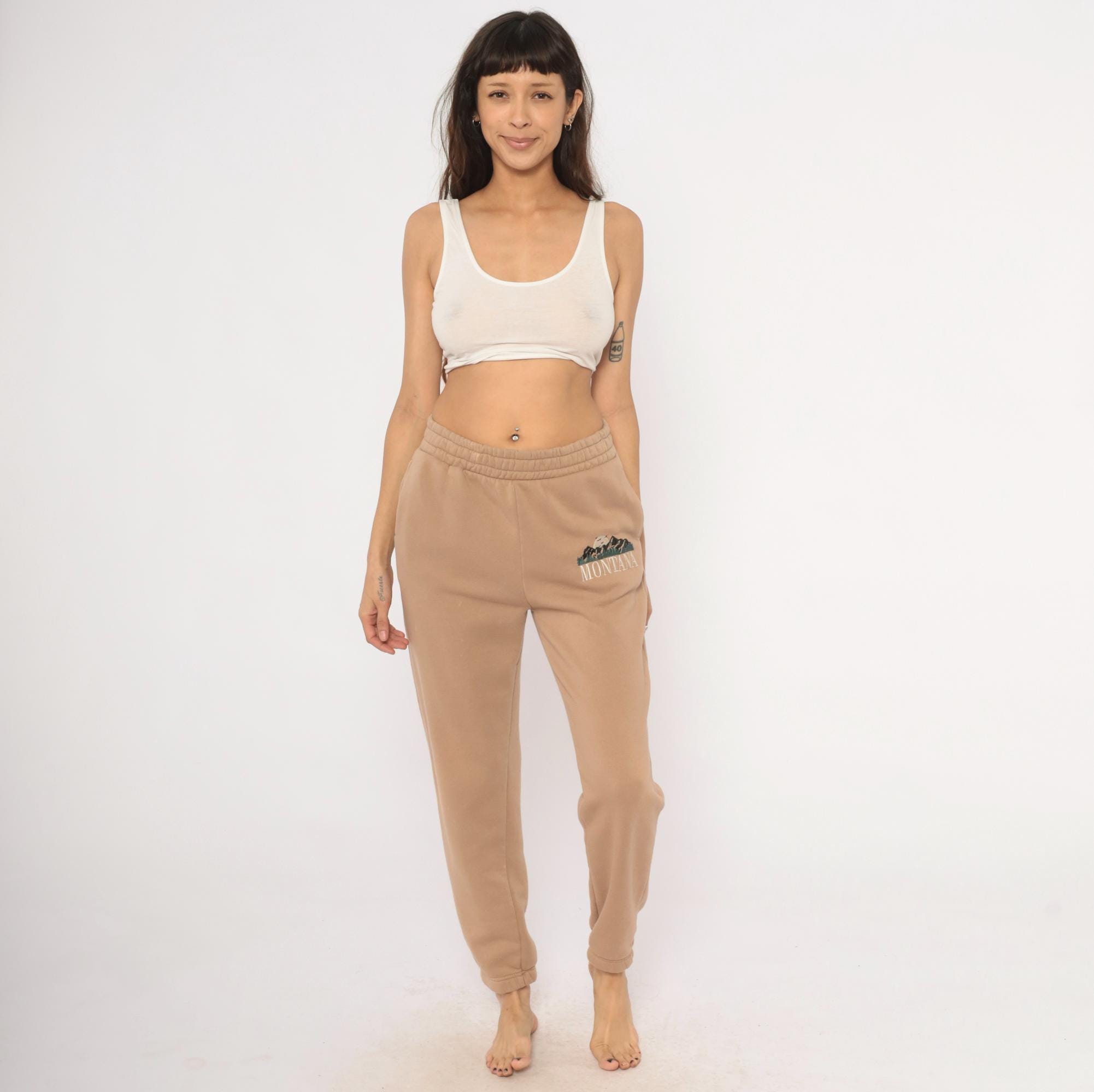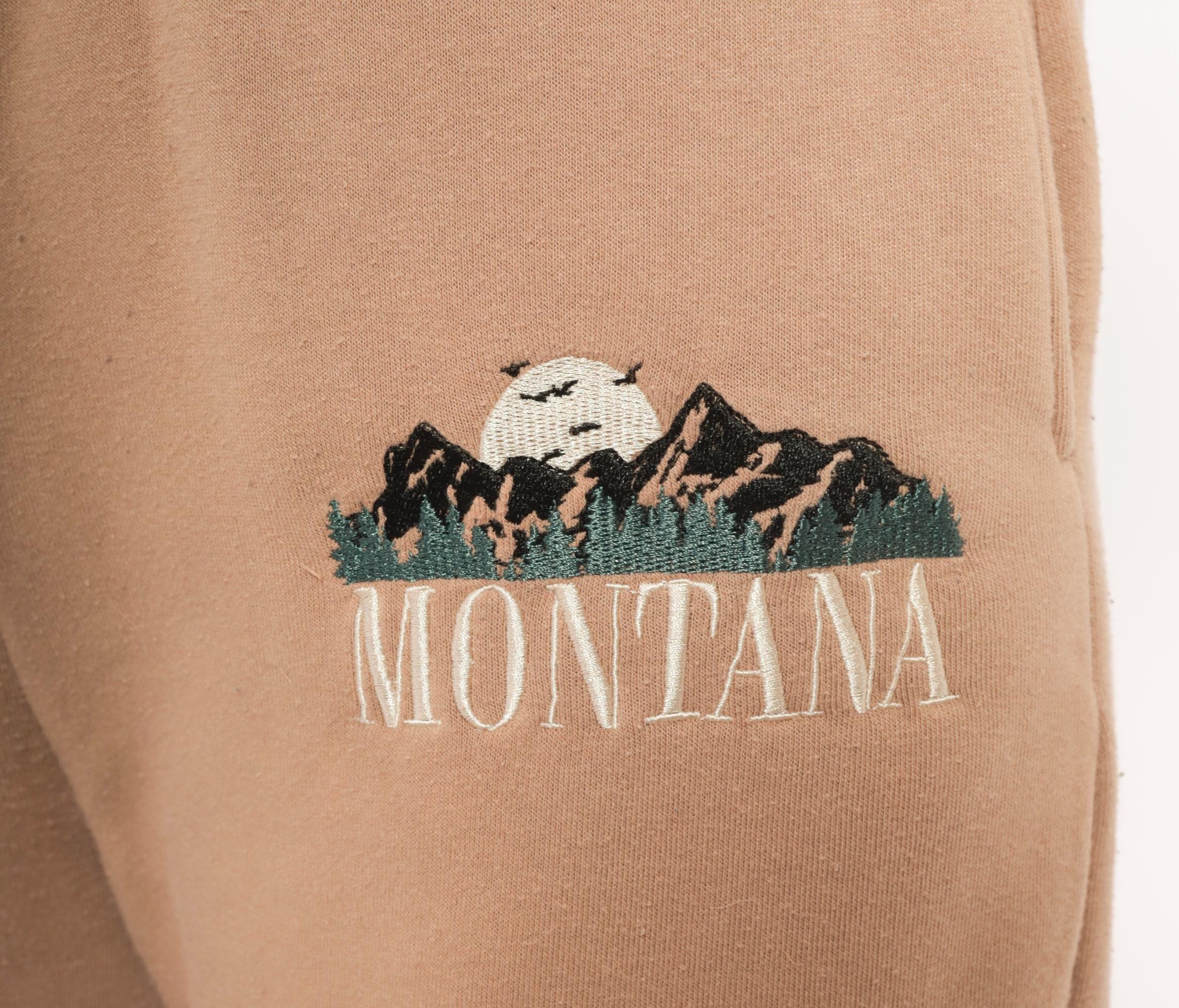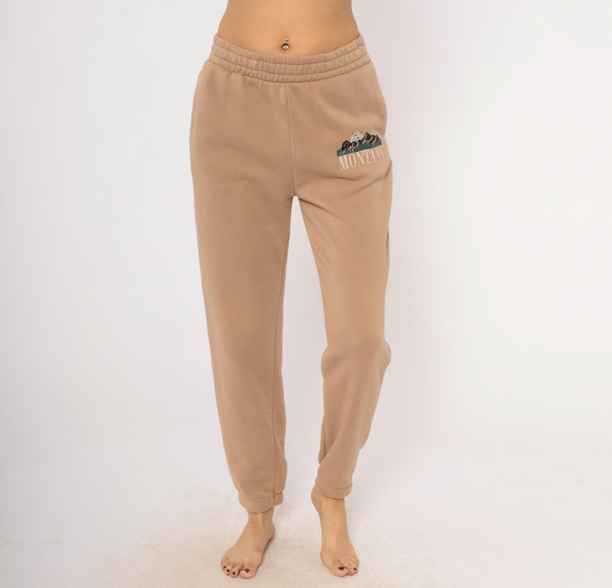 2000s tan joggers with embroidered Montana mountain scene on the left thigh in dark green, black, and cream thread. Elastic waistband, side seam pockets, tapered leg with cuffed ankles. Fleece-lined interior with a relaxed fit through the hip and thigh.