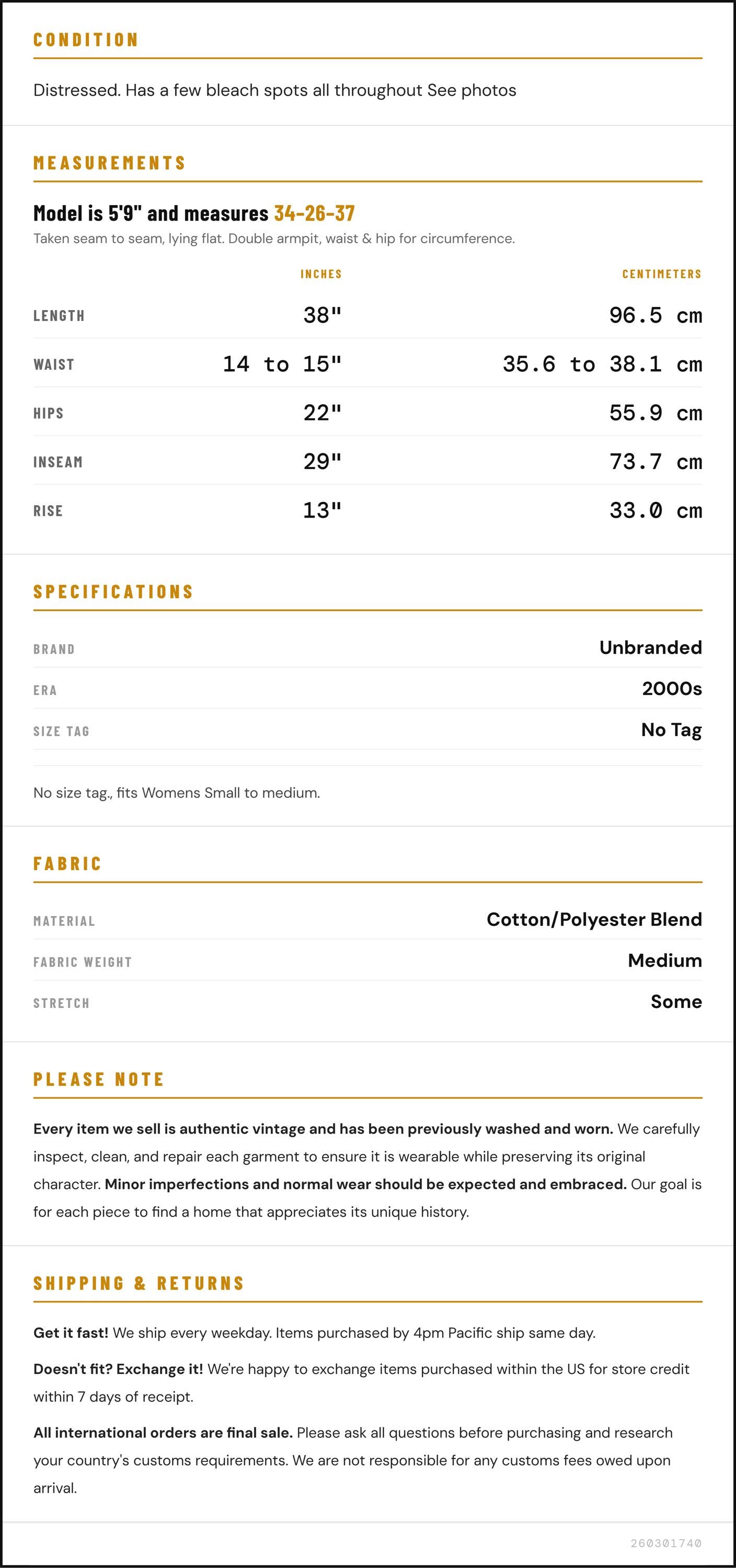 Vintage denim was usually made without any stretch, unlike modern jeans. Check the measurements to ensure proper fit, and remember to give yourself a little wiggle room in the waist and hips, depending on your preferred fit.