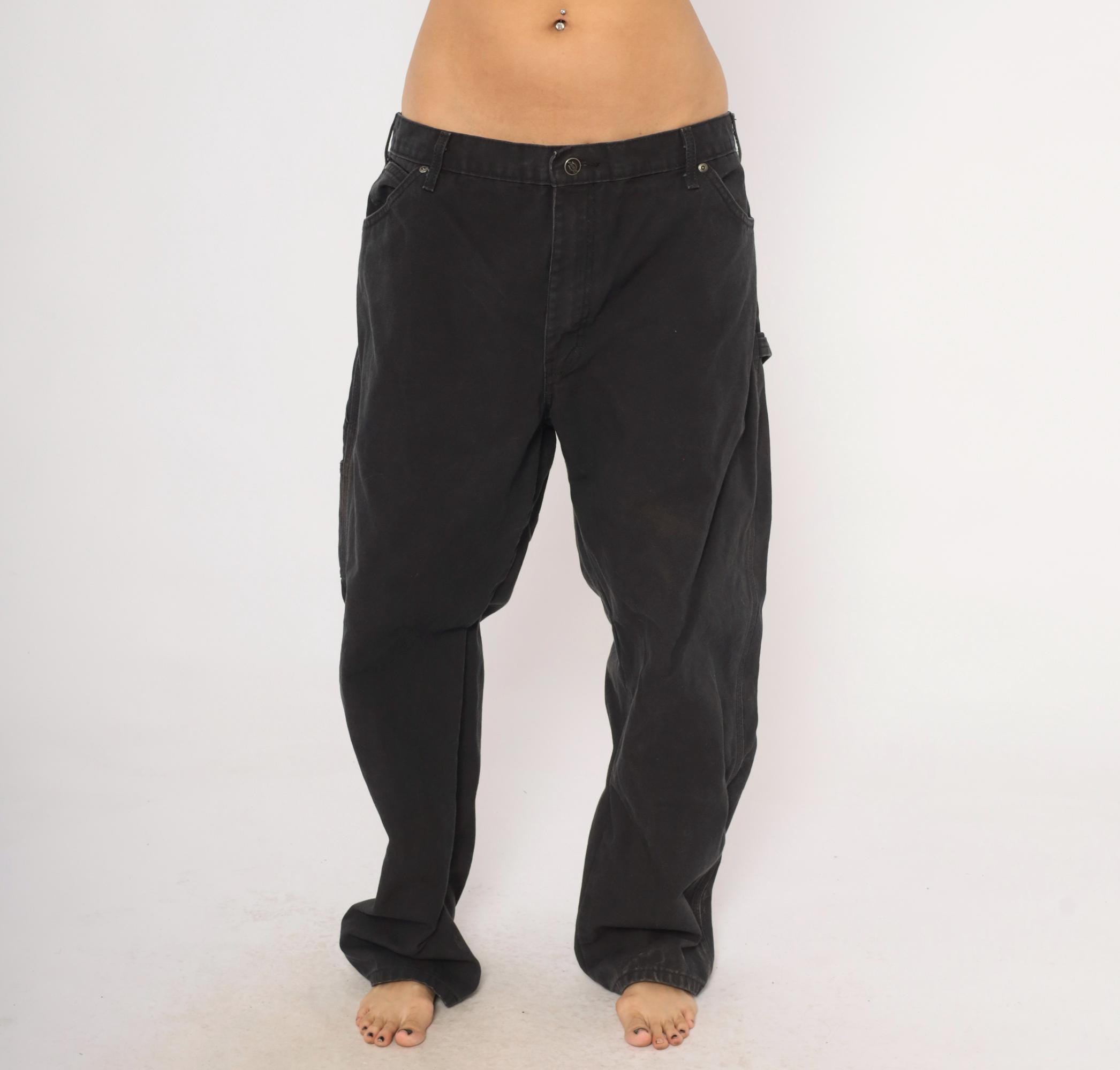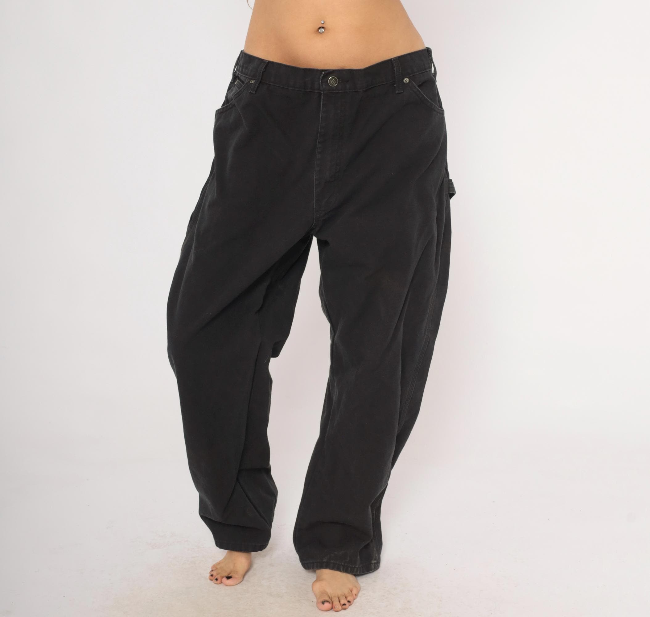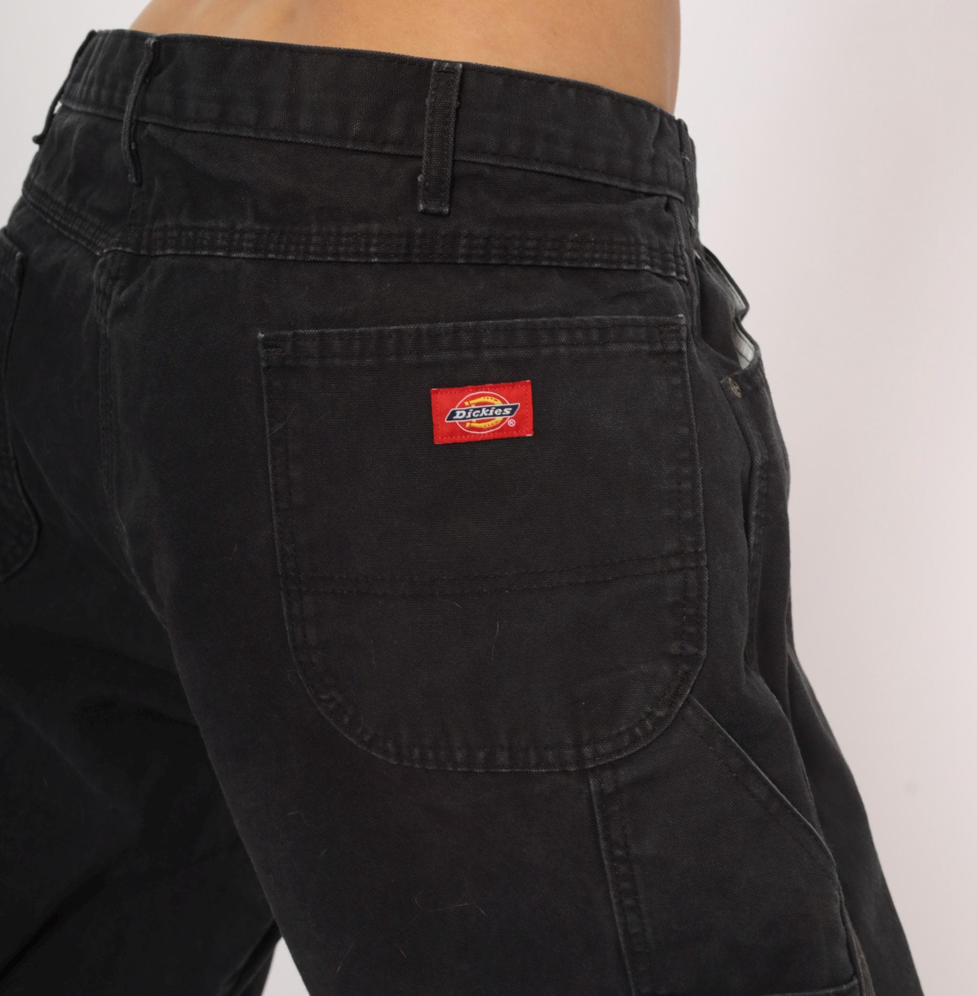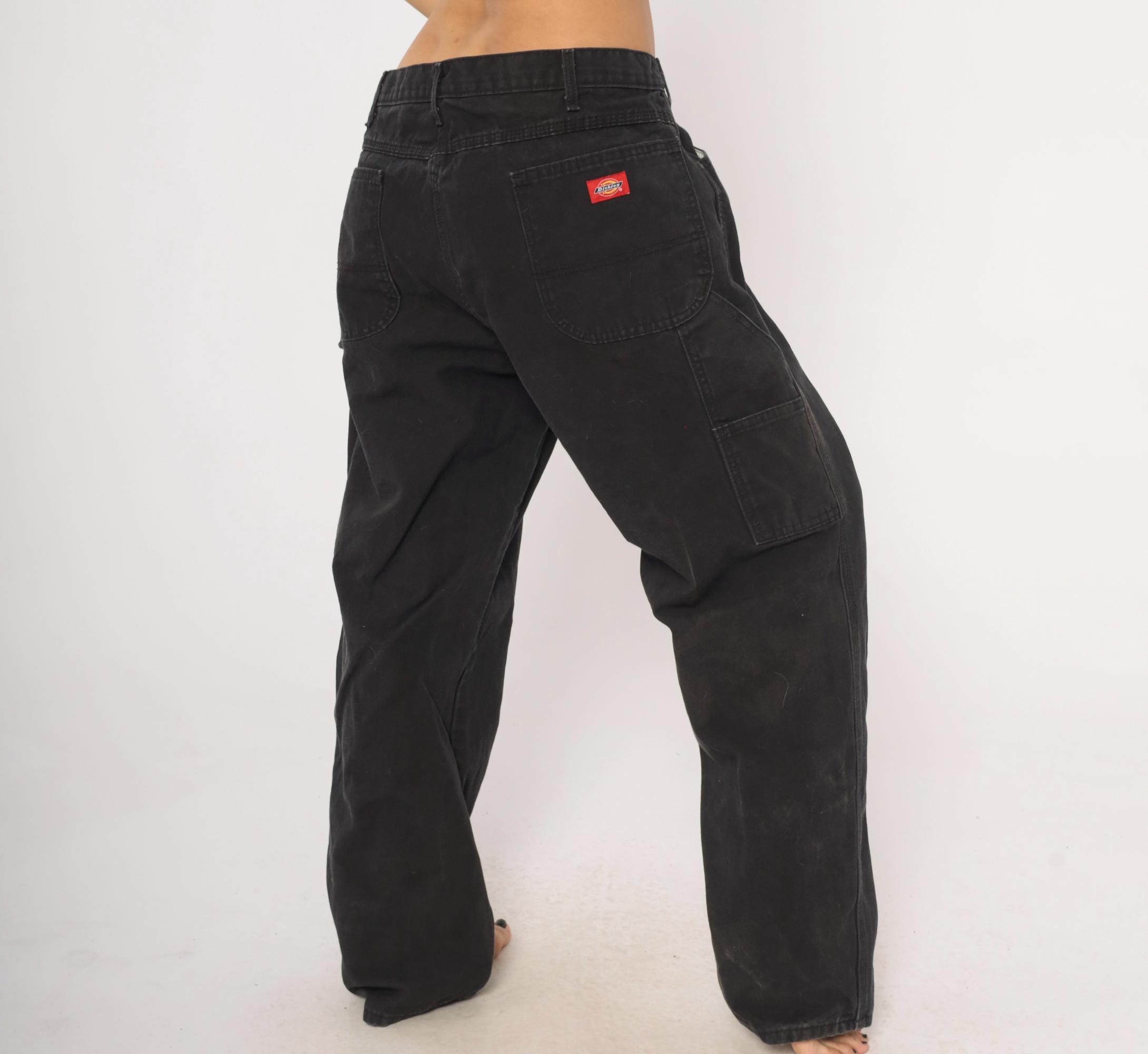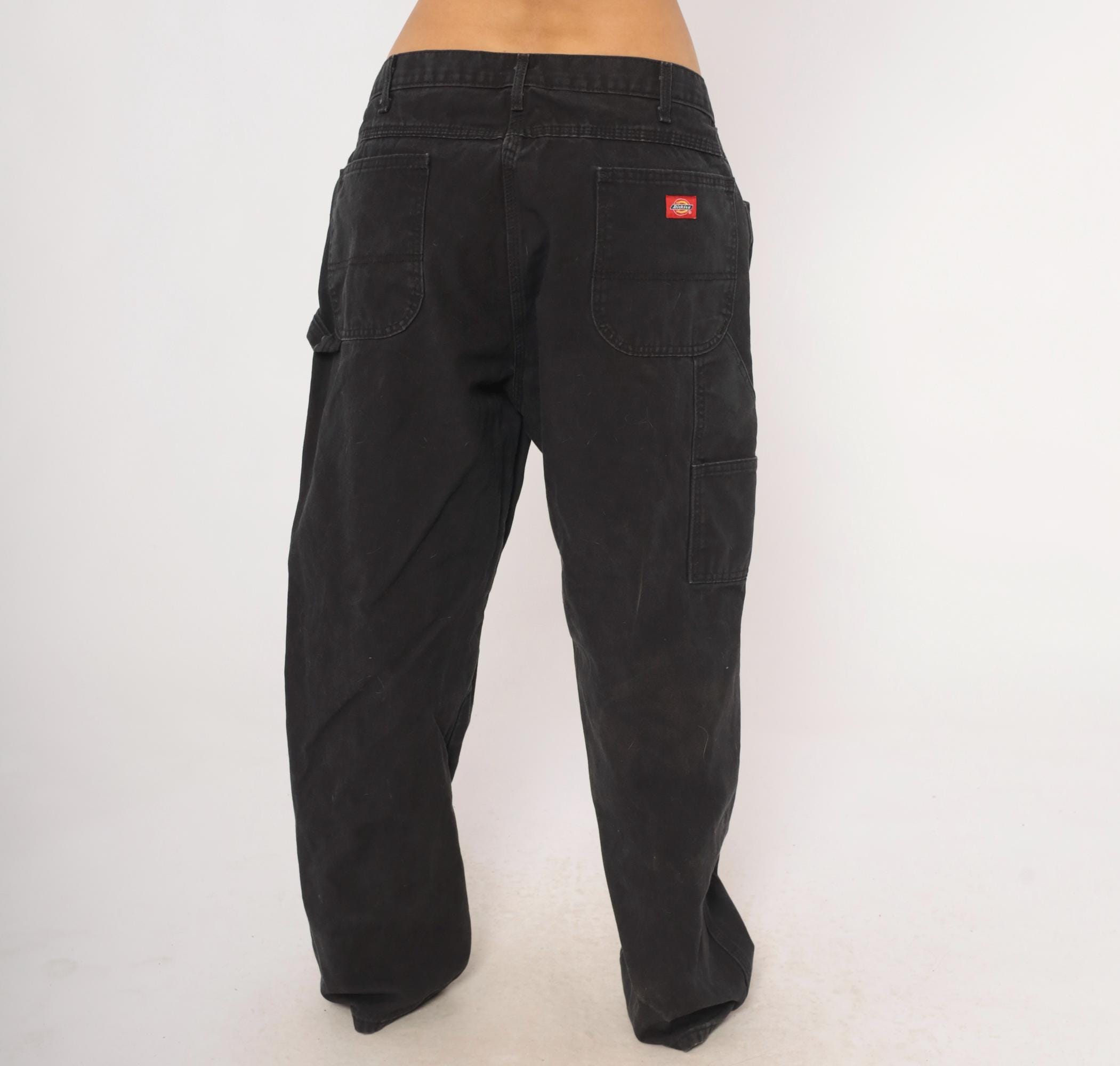 2000s black Dickies carpenter pants in heavy cotton canvas with a relaxed straight leg silhouette. Front zipper closure, belt loops, front waist pockets, back pockets, and side cargo pockets on both legs. Hammer loop on the right hip, triple-stitched seams, and the signature red Dickies logo tab on the back right pocket.