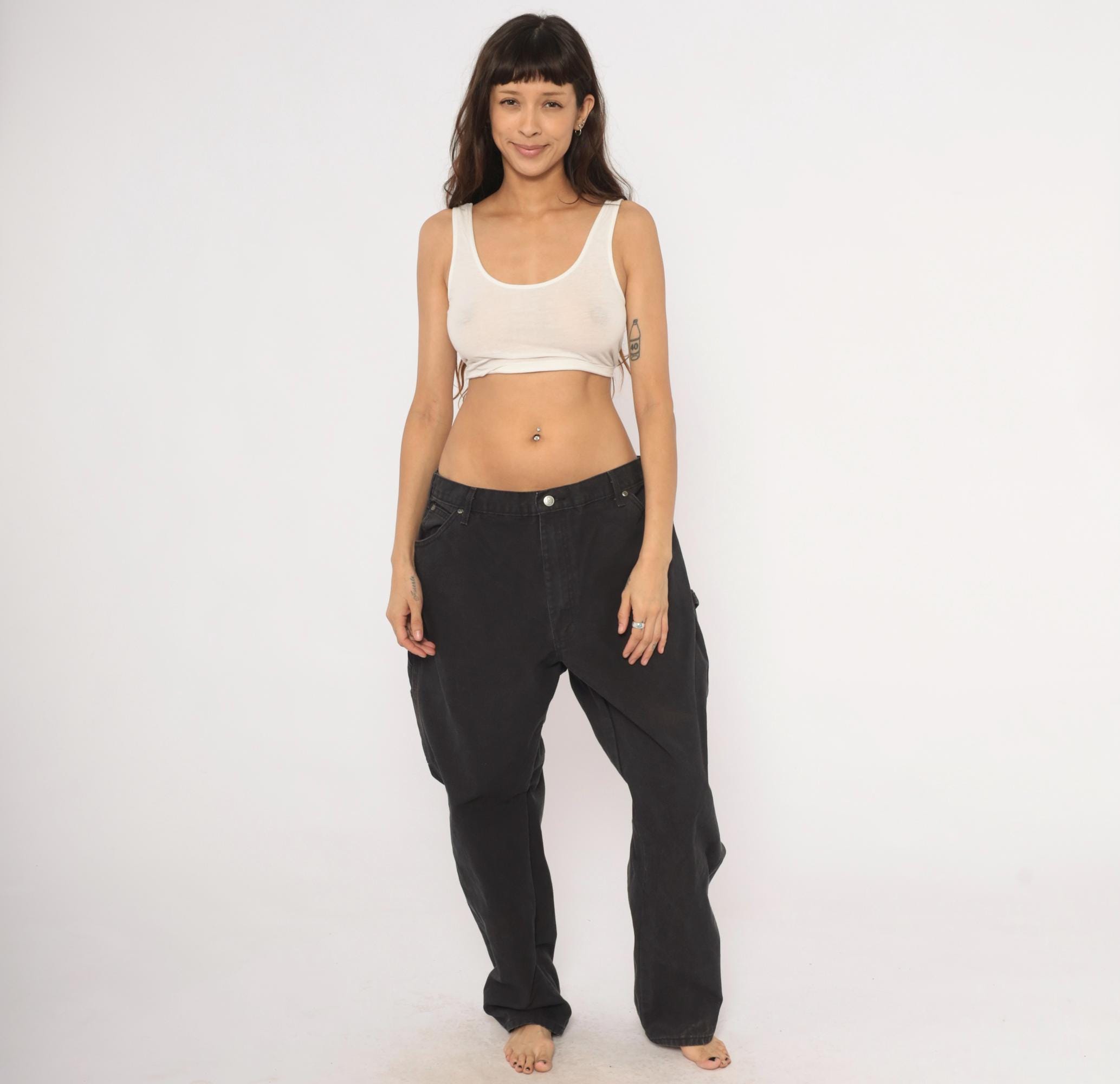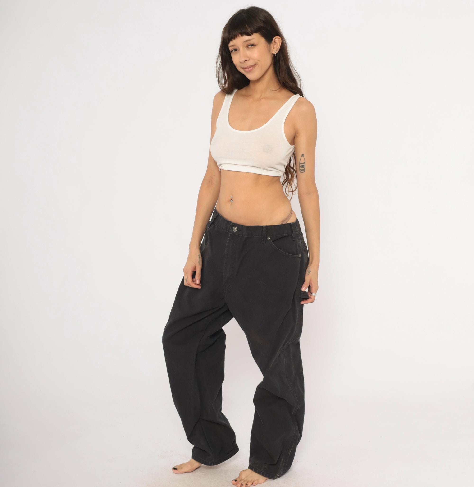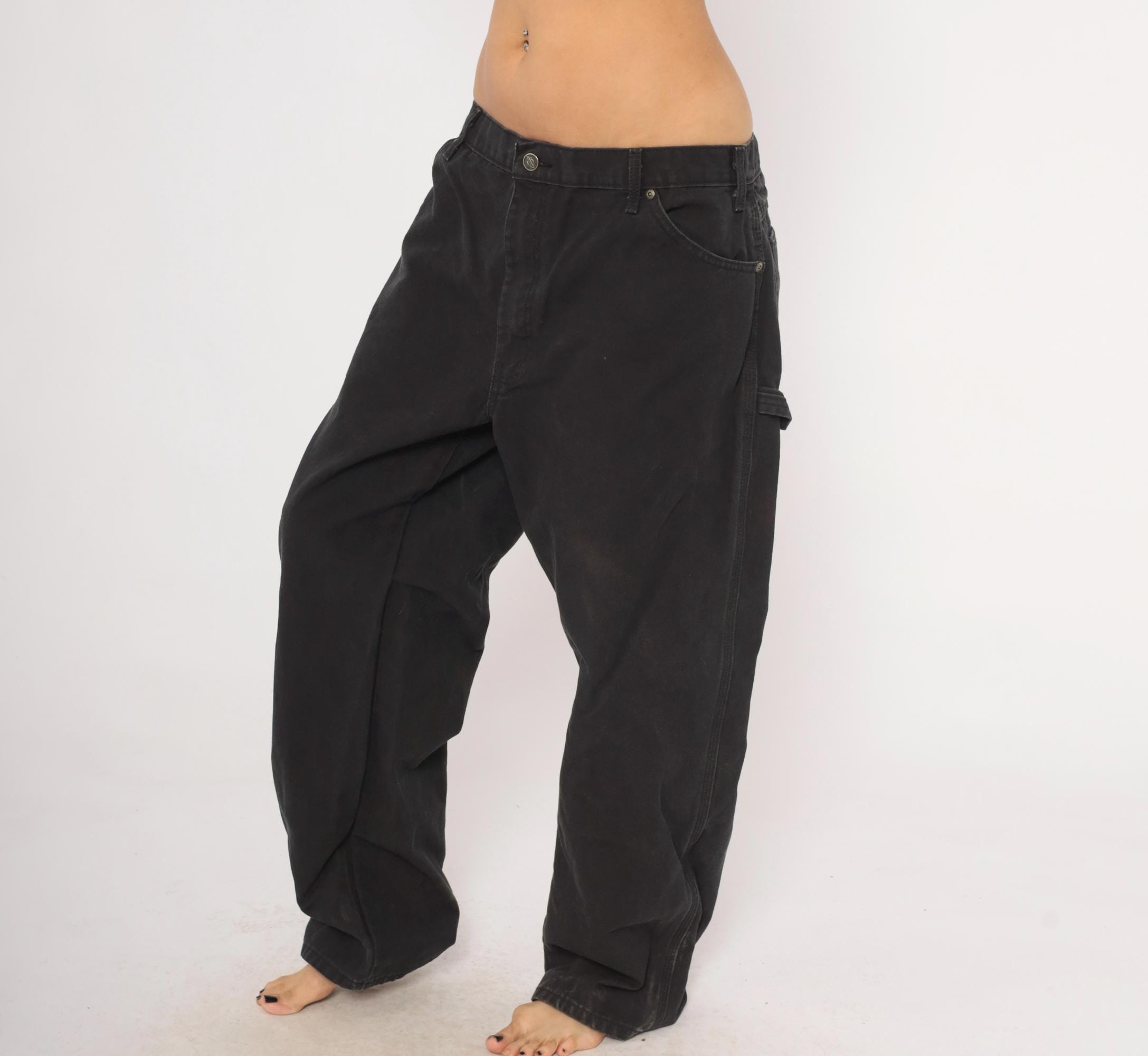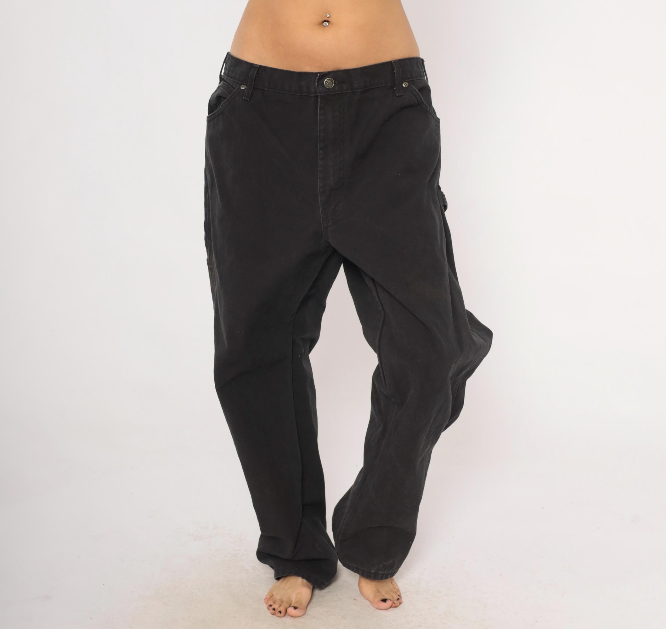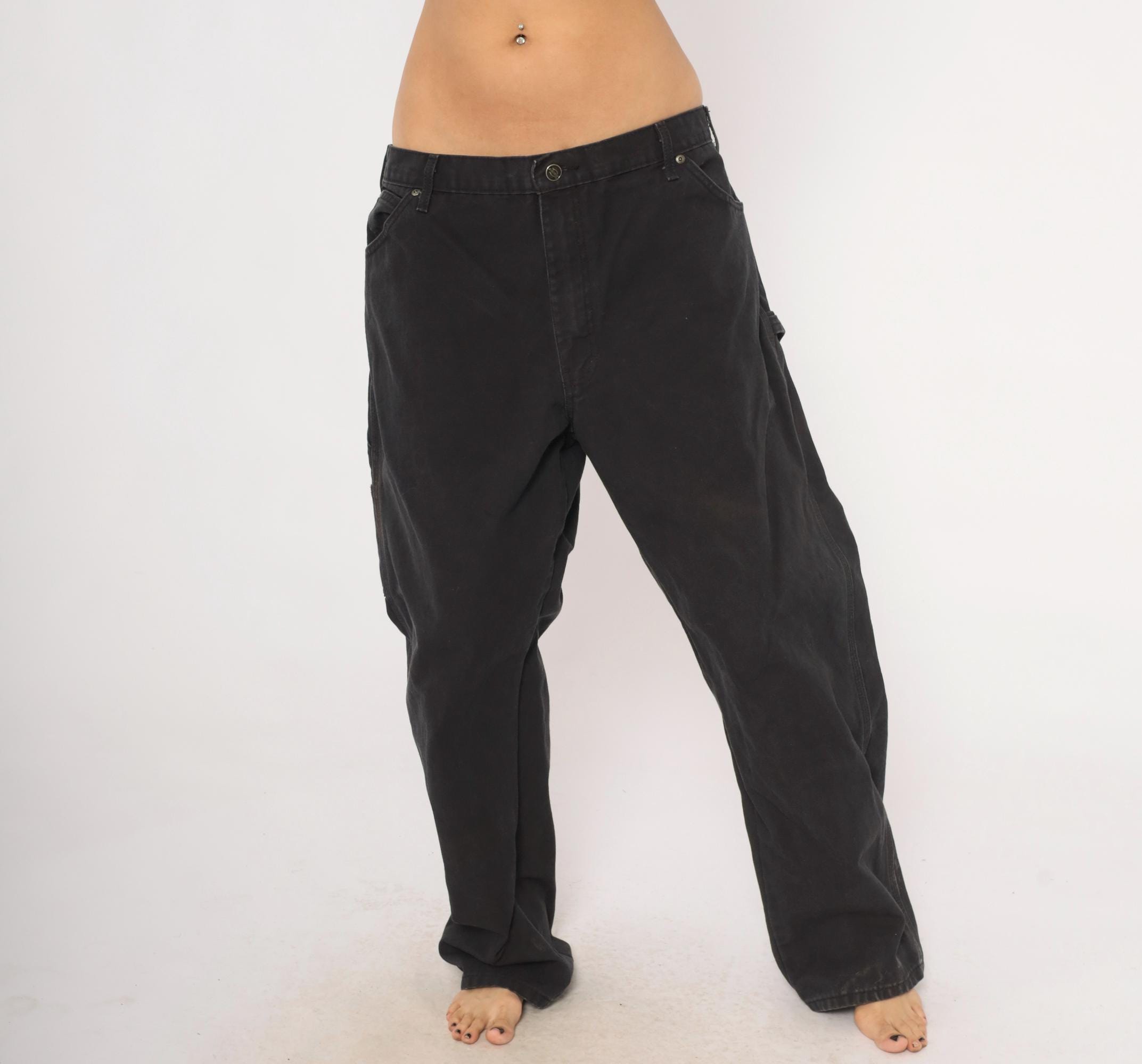 2000s black Dickies carpenter pants in heavy cotton canvas with a relaxed straight leg silhouette. Front zipper closure, belt loops, front waist pockets, back pockets, and side cargo pockets on both legs. Hammer loop on the right hip, triple-stitched seams, and the signature red Dickies logo tab on the back right pocket.