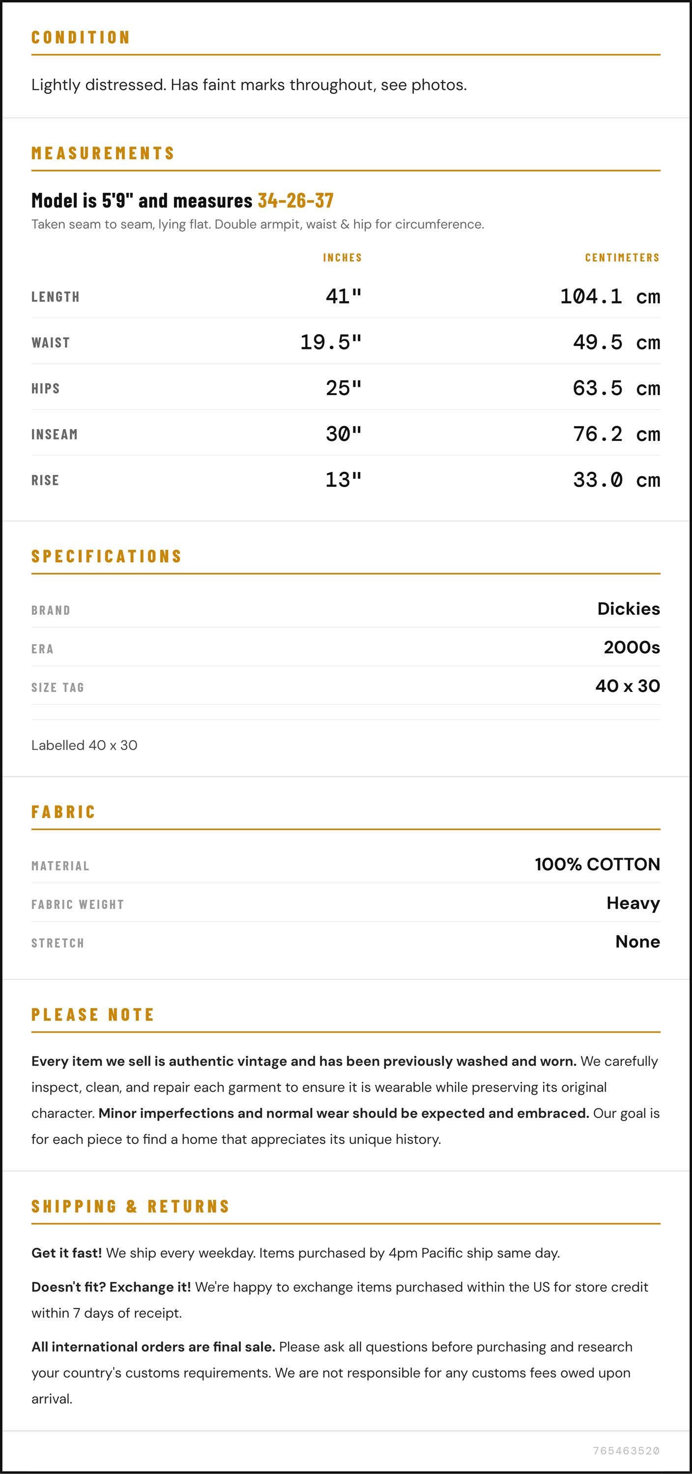 Vintage denim was usually made without any stretch, unlike modern jeans. Check the measurements to ensure proper fit, and remember to give yourself a little wiggle room in the waist and hips, depending on your preferred fit.
