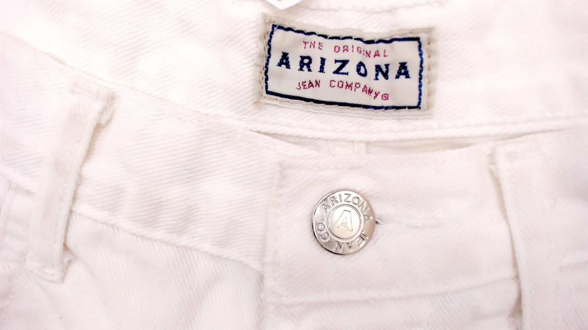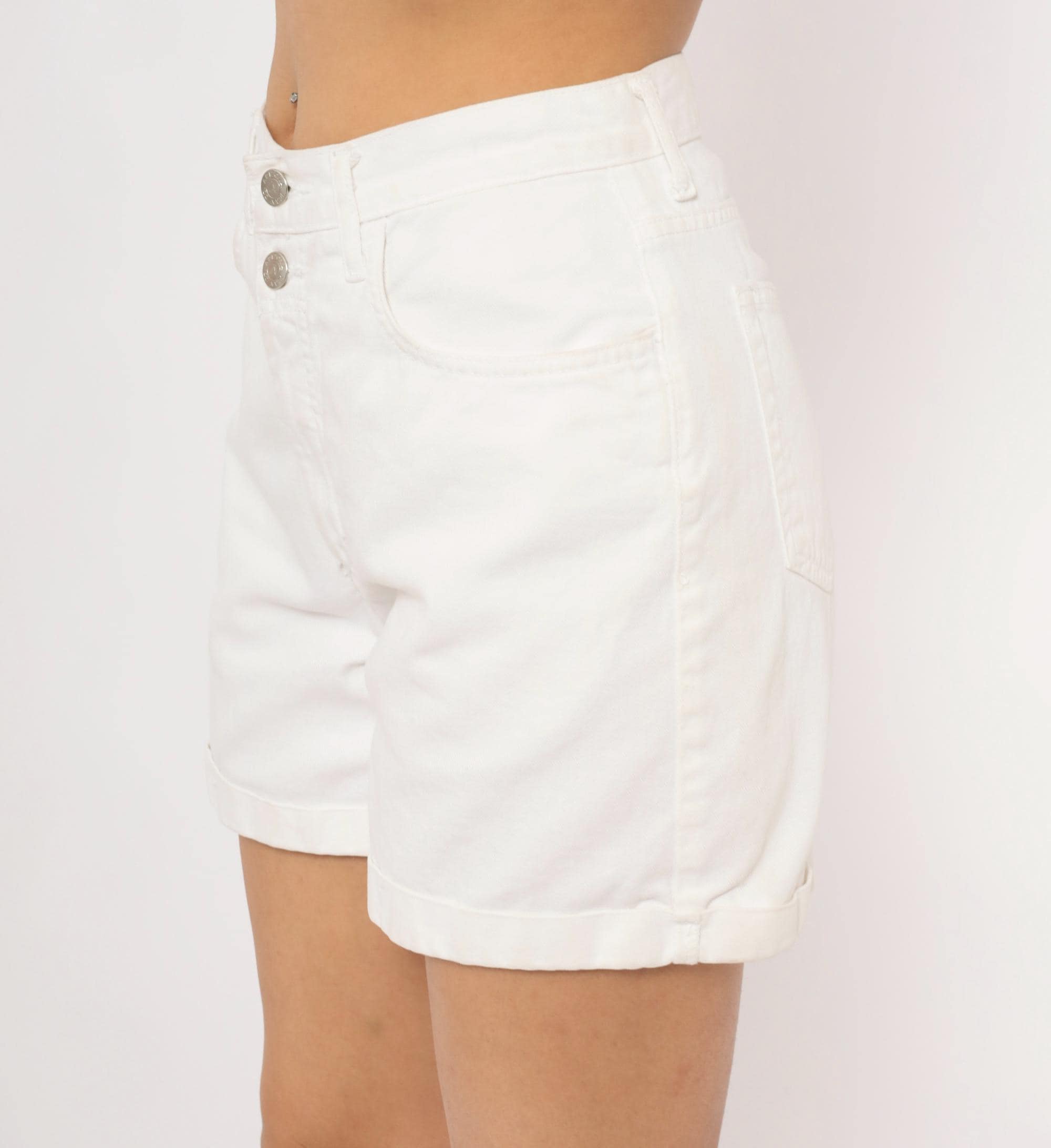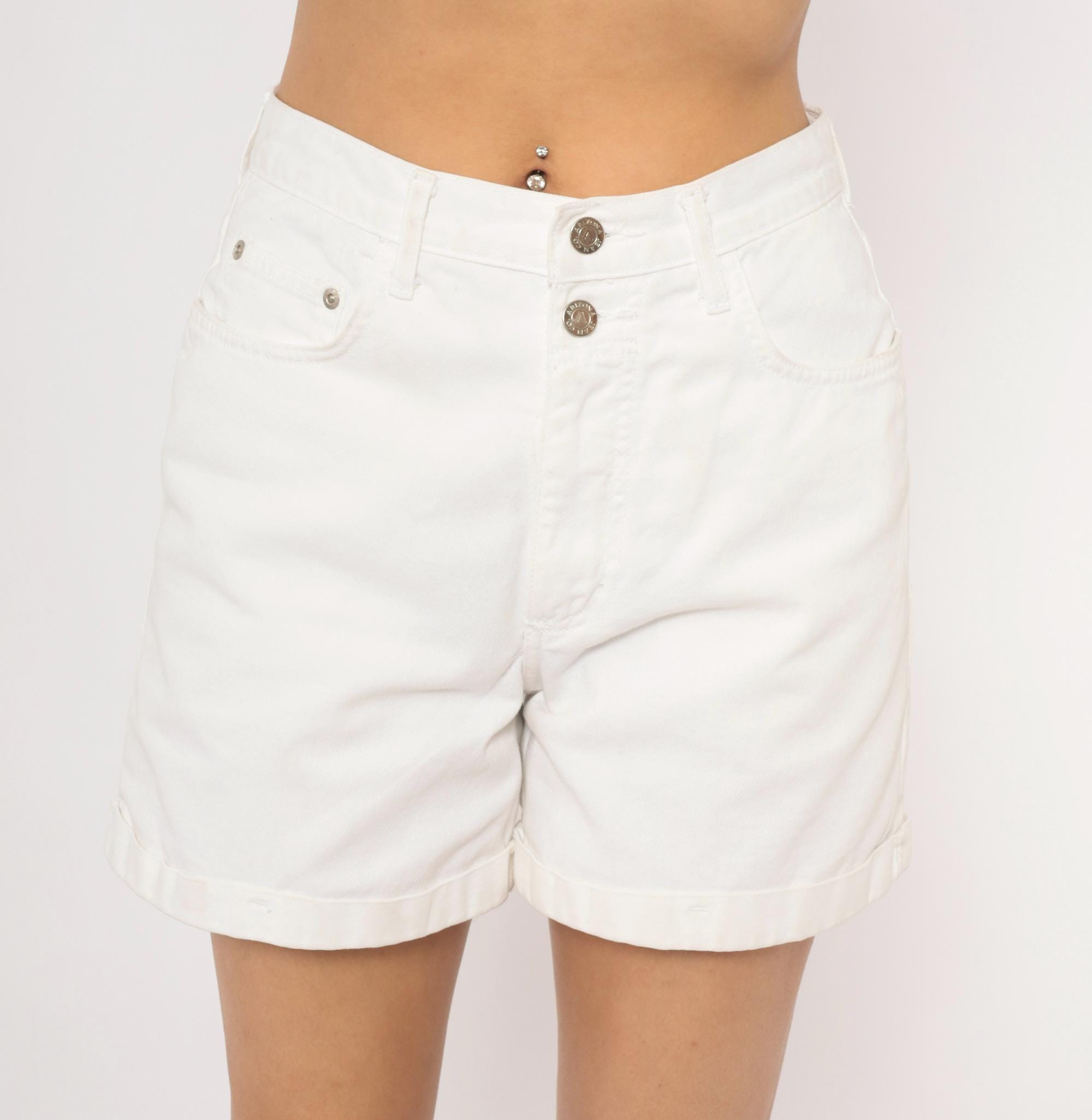 90s white denim shorts from Arizona Jeans with a high waist, double button closure, and front zipper. Five-pocket construction with cuffed rolled hems and belt loops. Silver-tone metal buttons and rivets throughout.