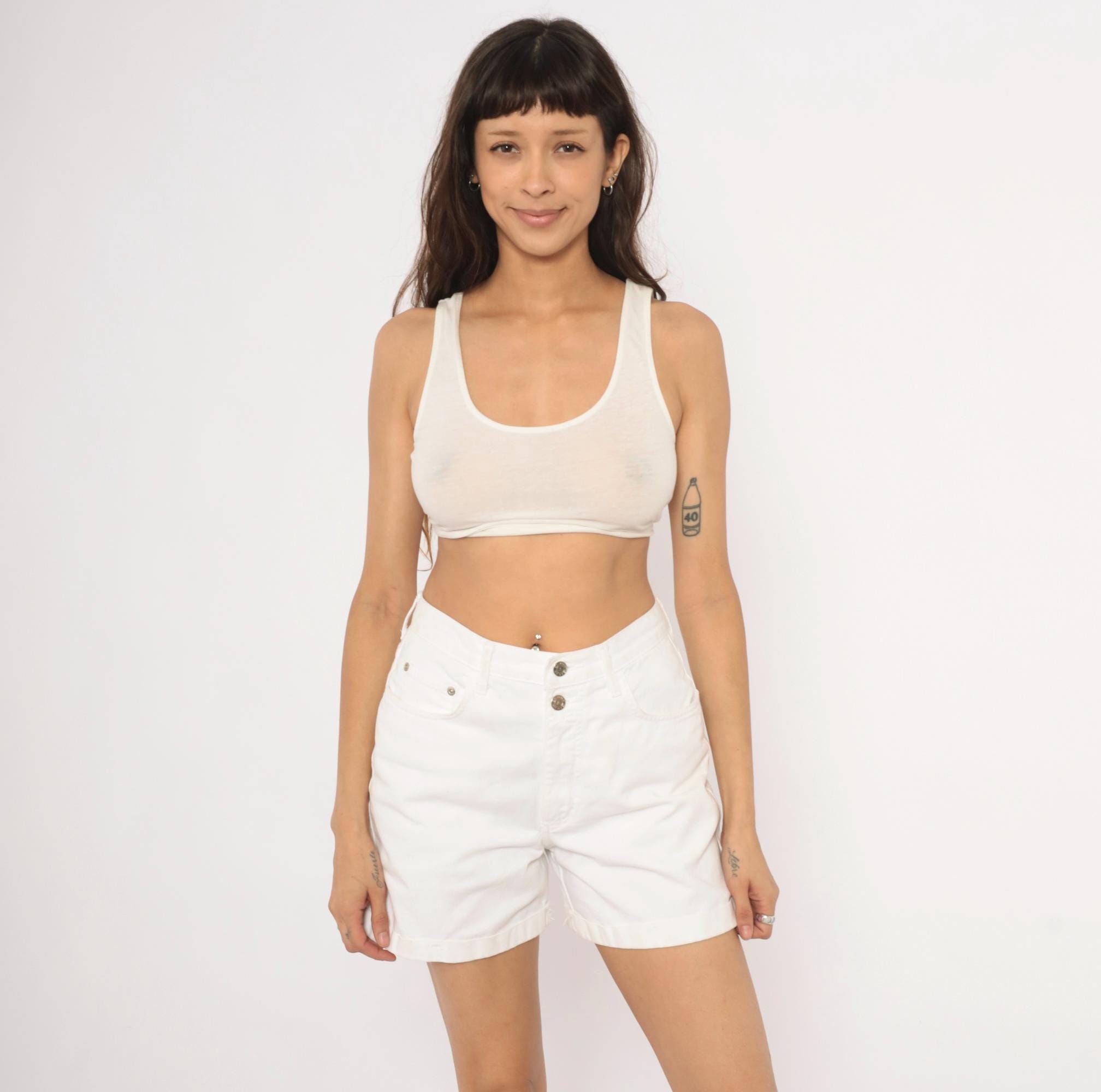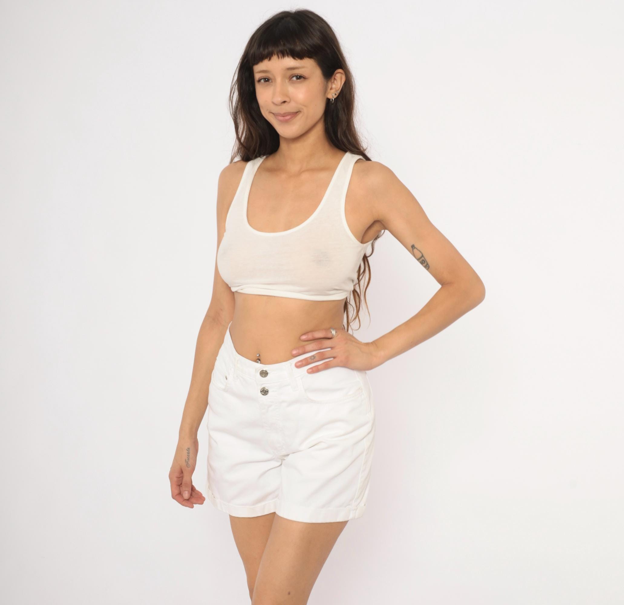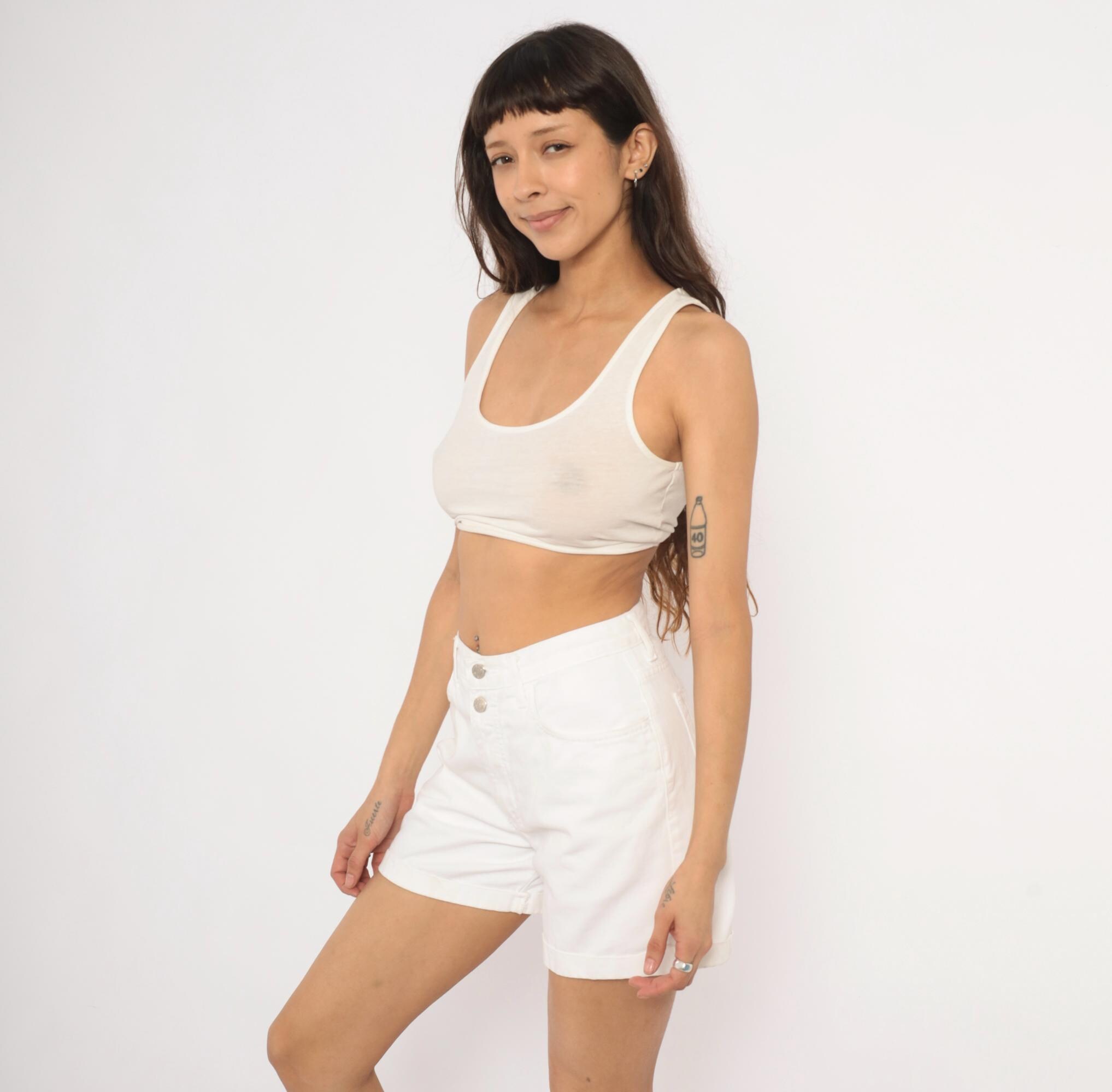 90s white denim shorts from Arizona Jeans with a high waist, double button closure, and front zipper. Five-pocket construction with cuffed rolled hems and belt loops. Silver-tone metal buttons and rivets throughout.