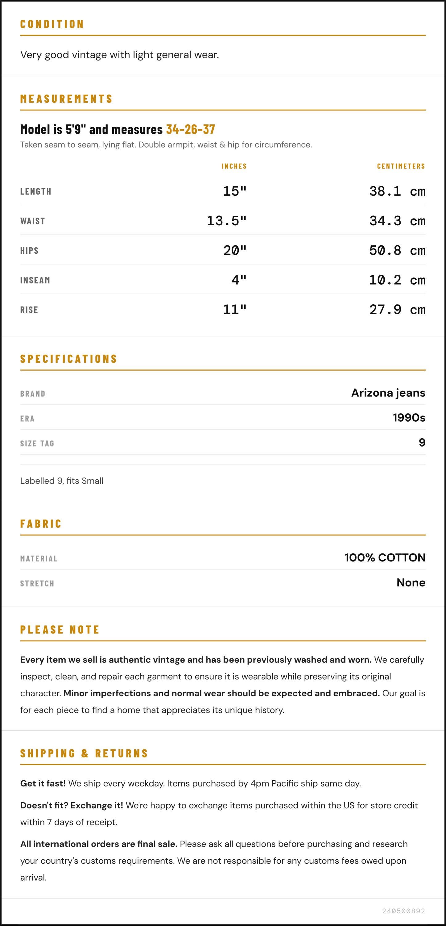 Vintage denim was usually made without any stretch, unlike modern jeans. Check the measurements to ensure proper fit, and remember to give yourself a little wiggle room in the waist and hips, depending on your preferred fit.