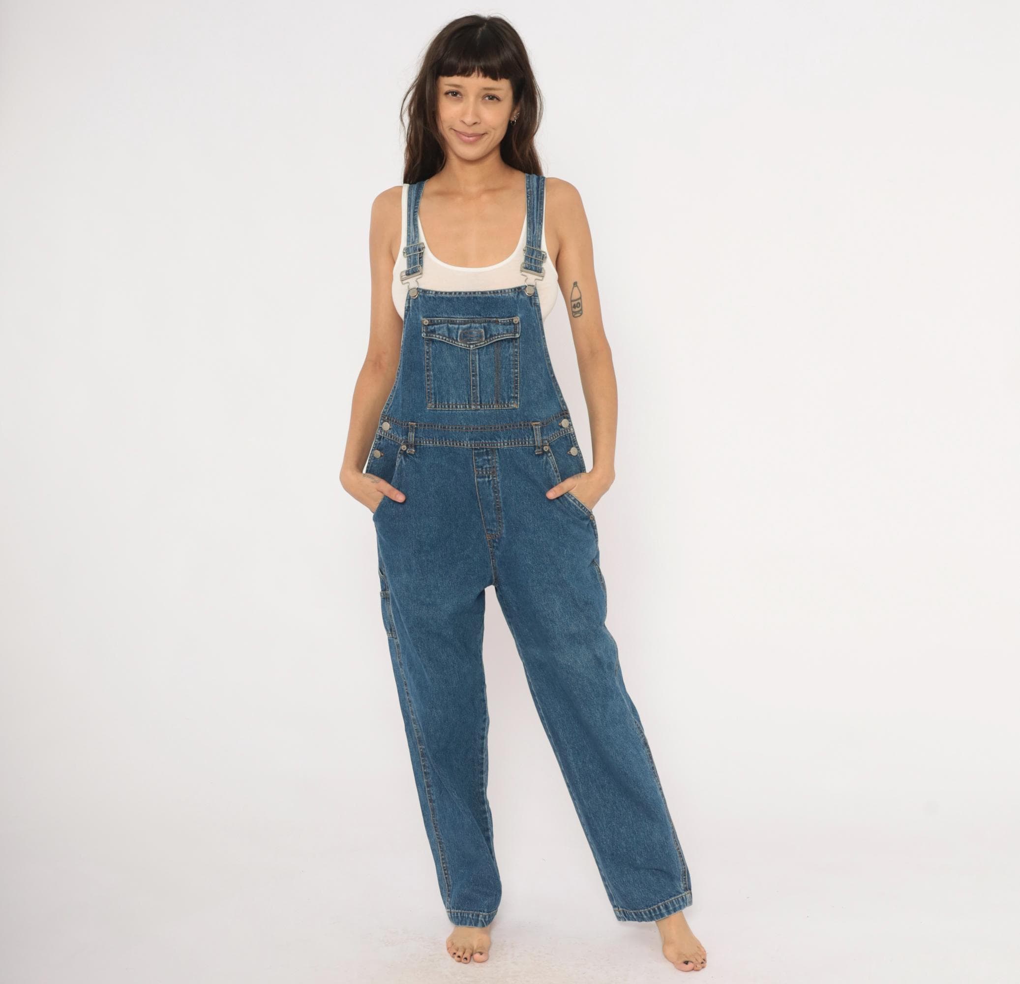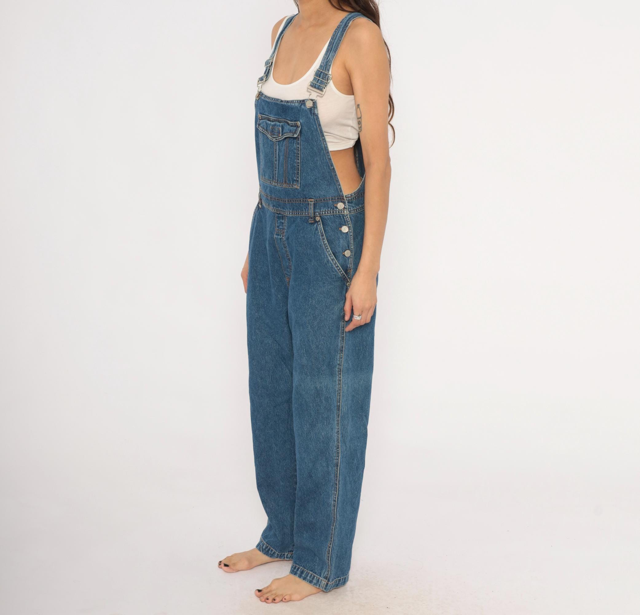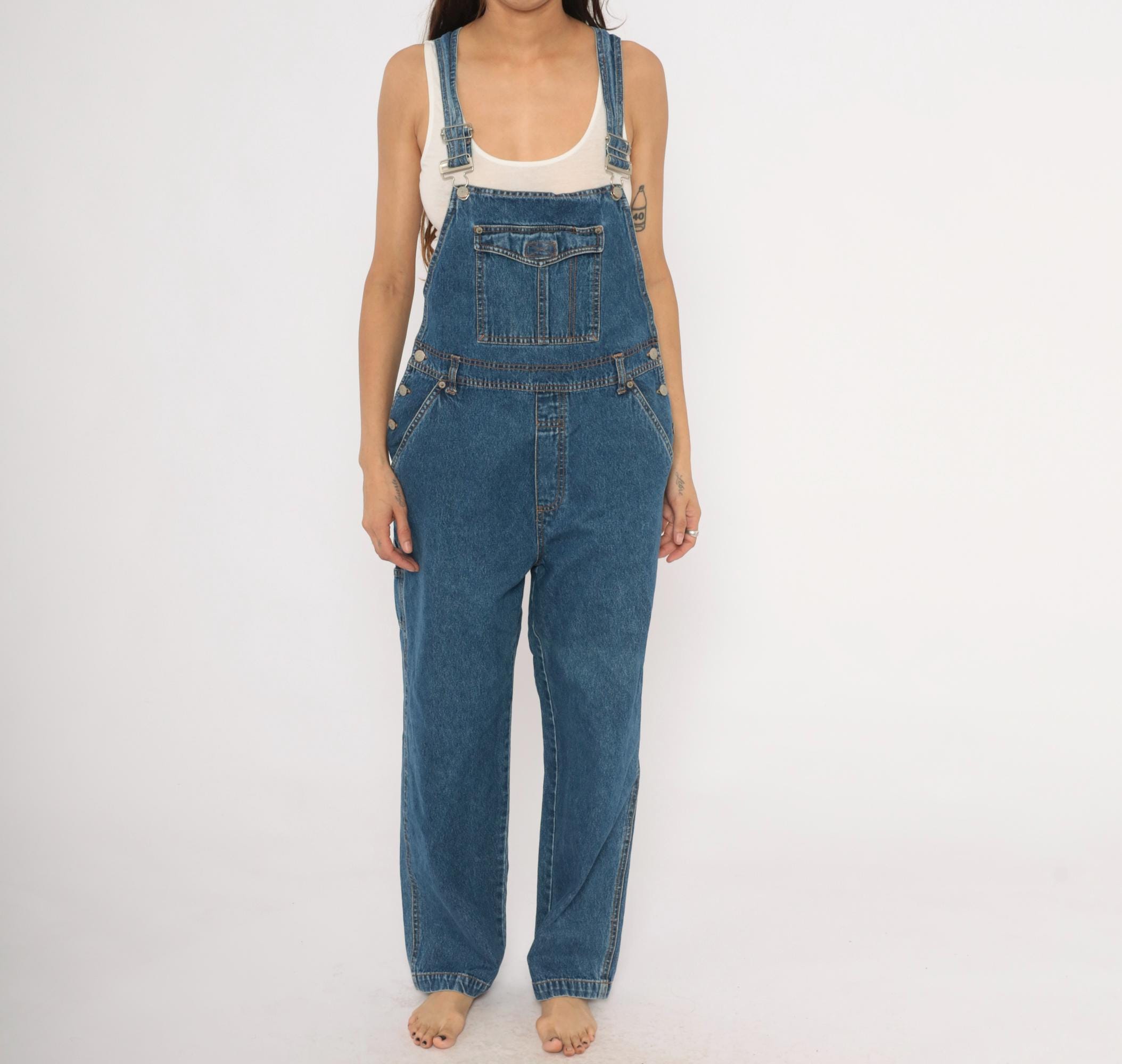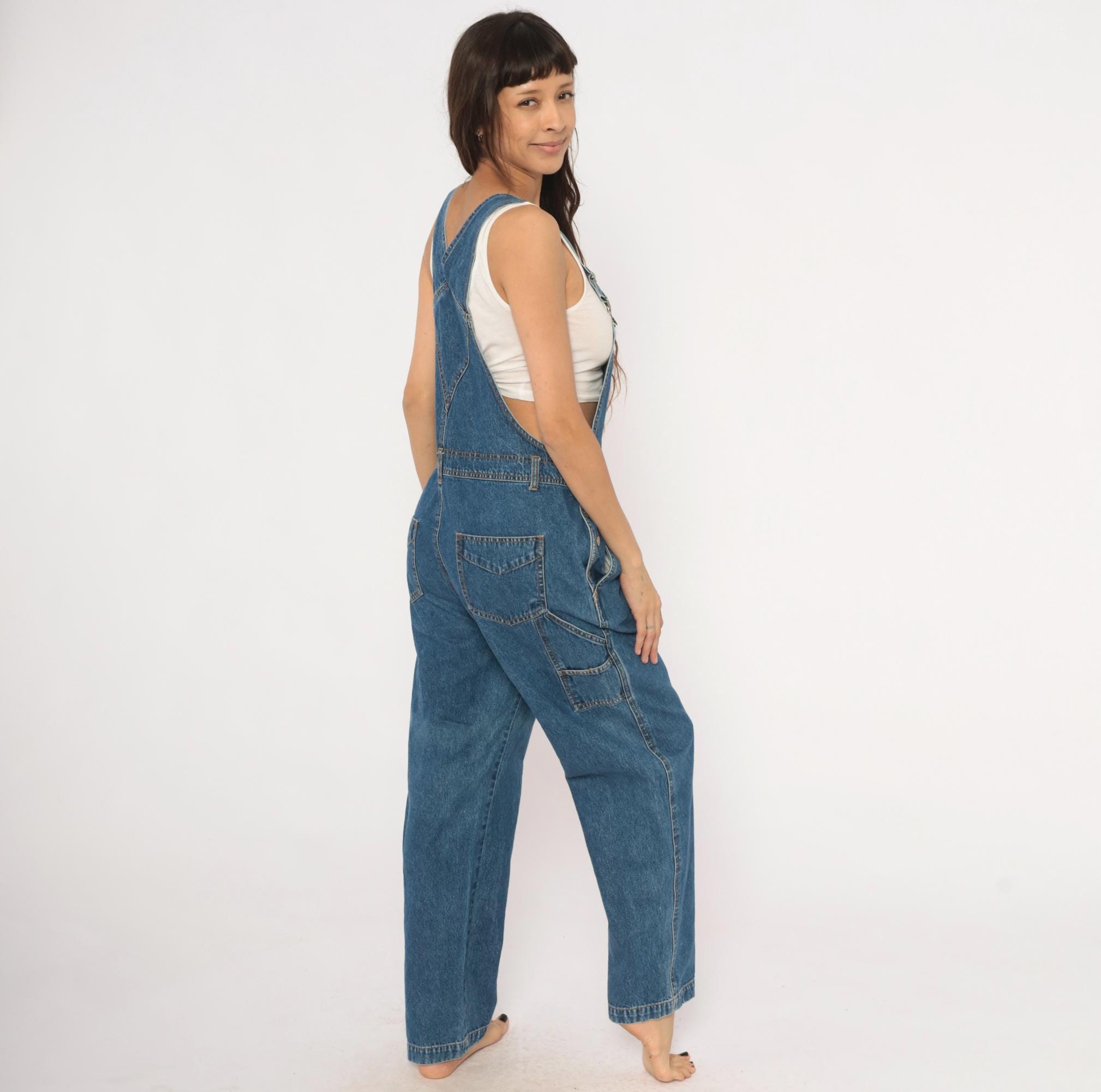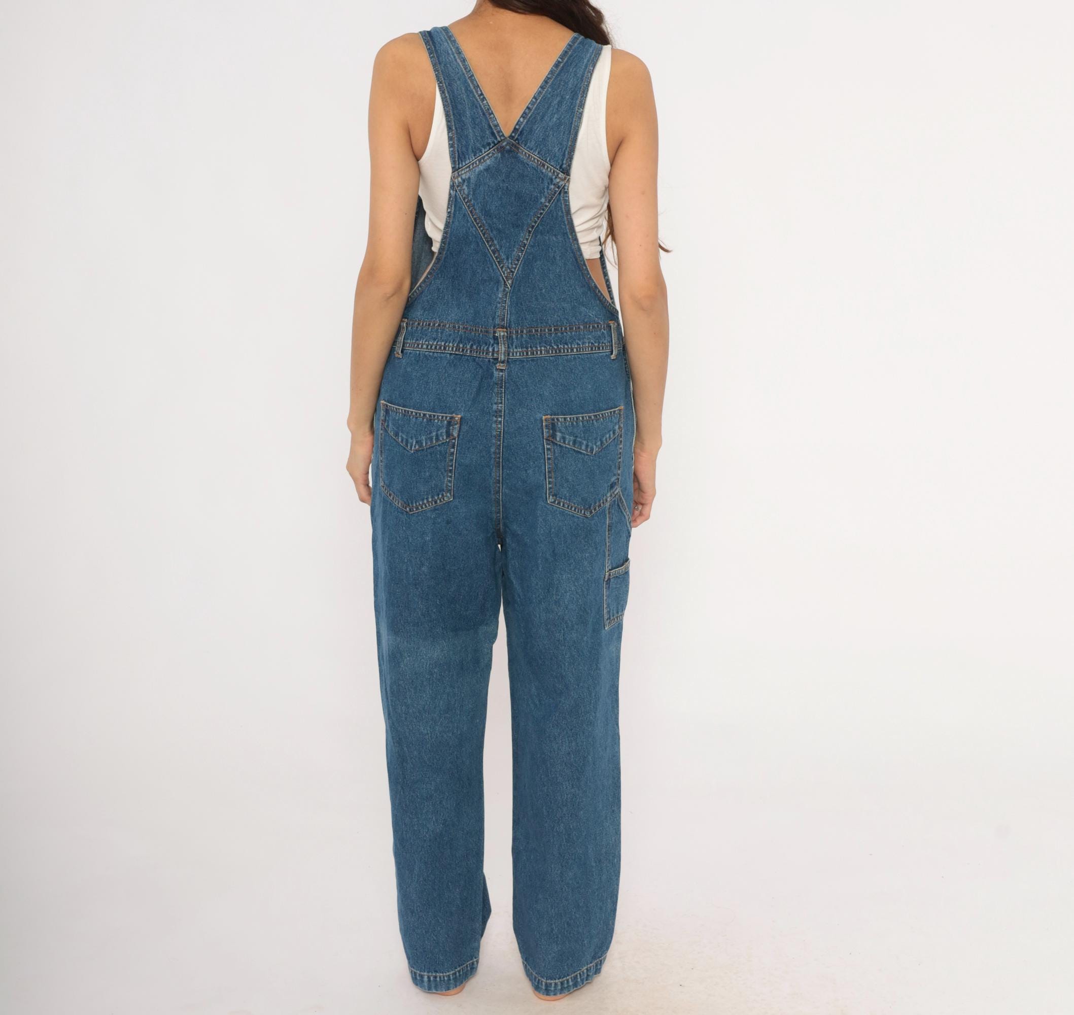 90s blue denim overalls from Bill Blass Jeans with adjustable metal buckle straps and a front bib pocket with snap flap closure. Side button closures at the waist, front slash pockets, two rear patch pockets, and a carpenter-style tool pocket on the left leg. Straight leg silhouette with contrast orange topstitching throughout and a V-back yoke construction.