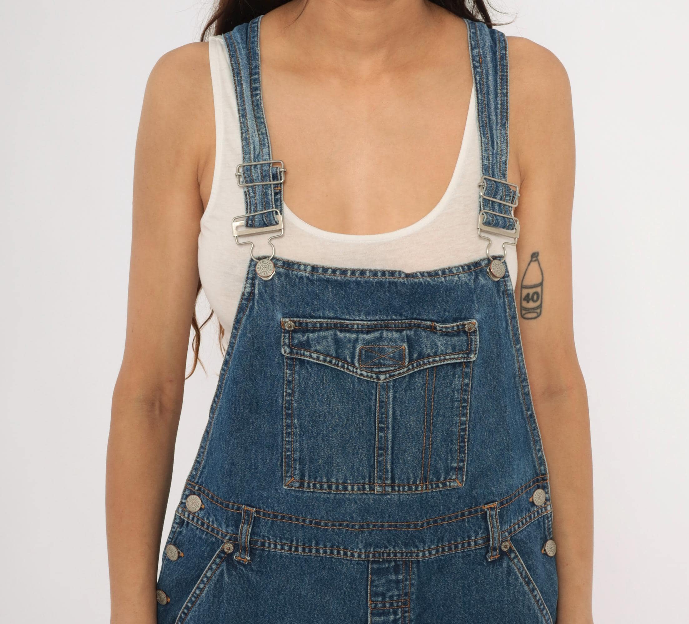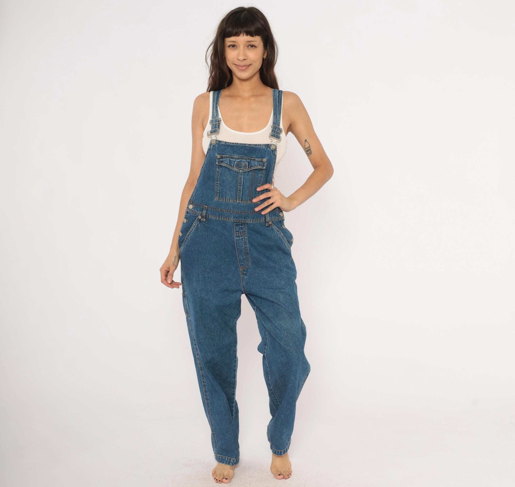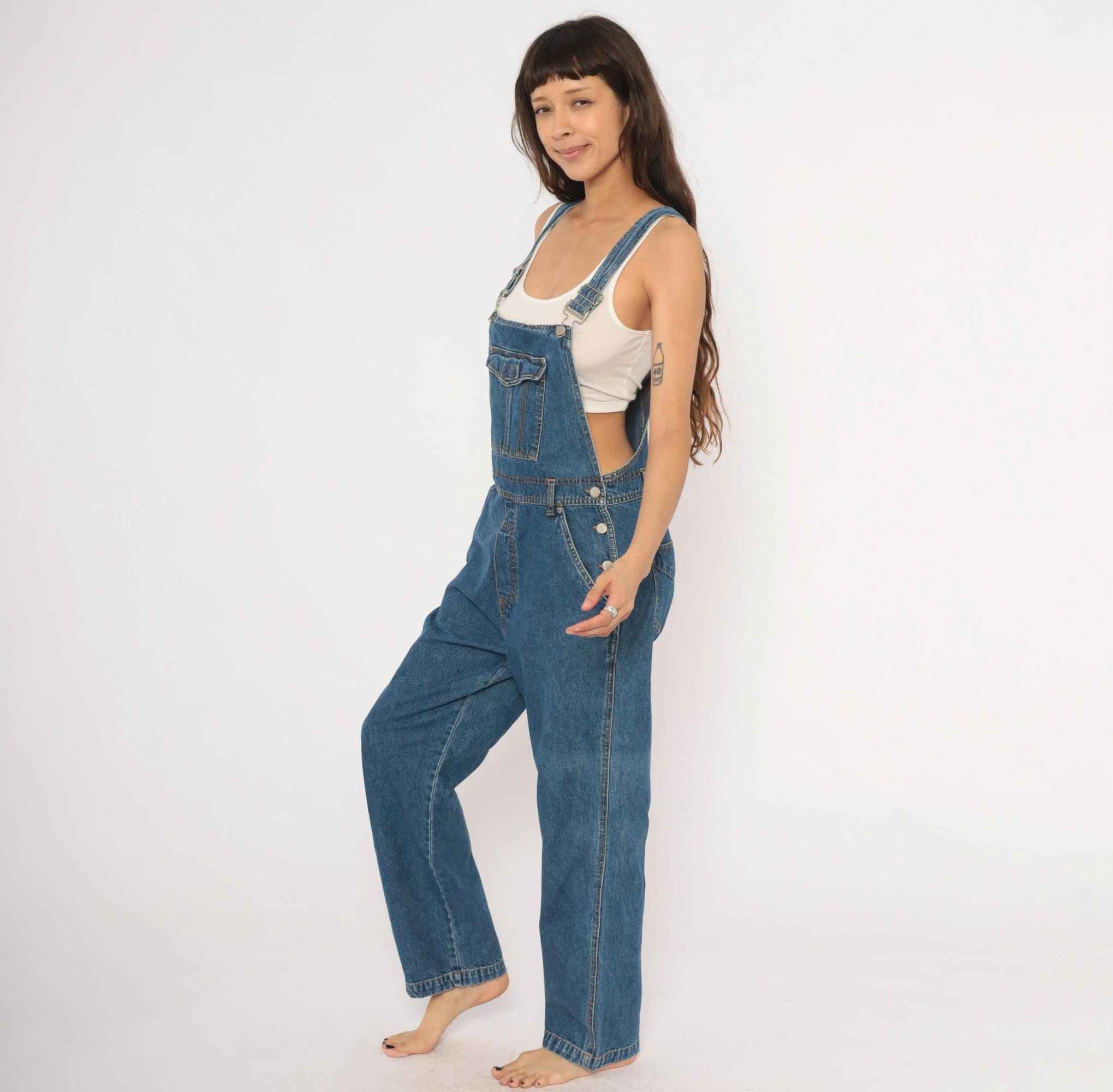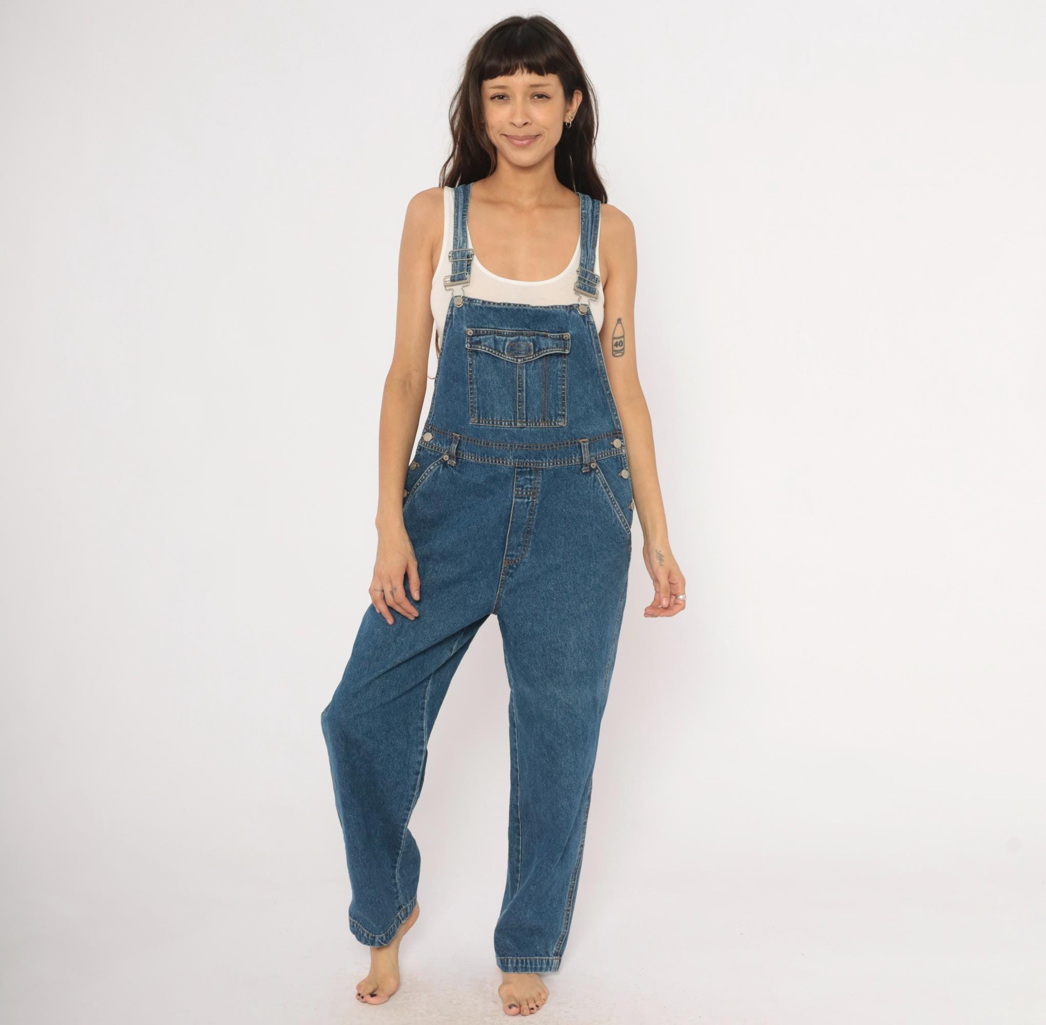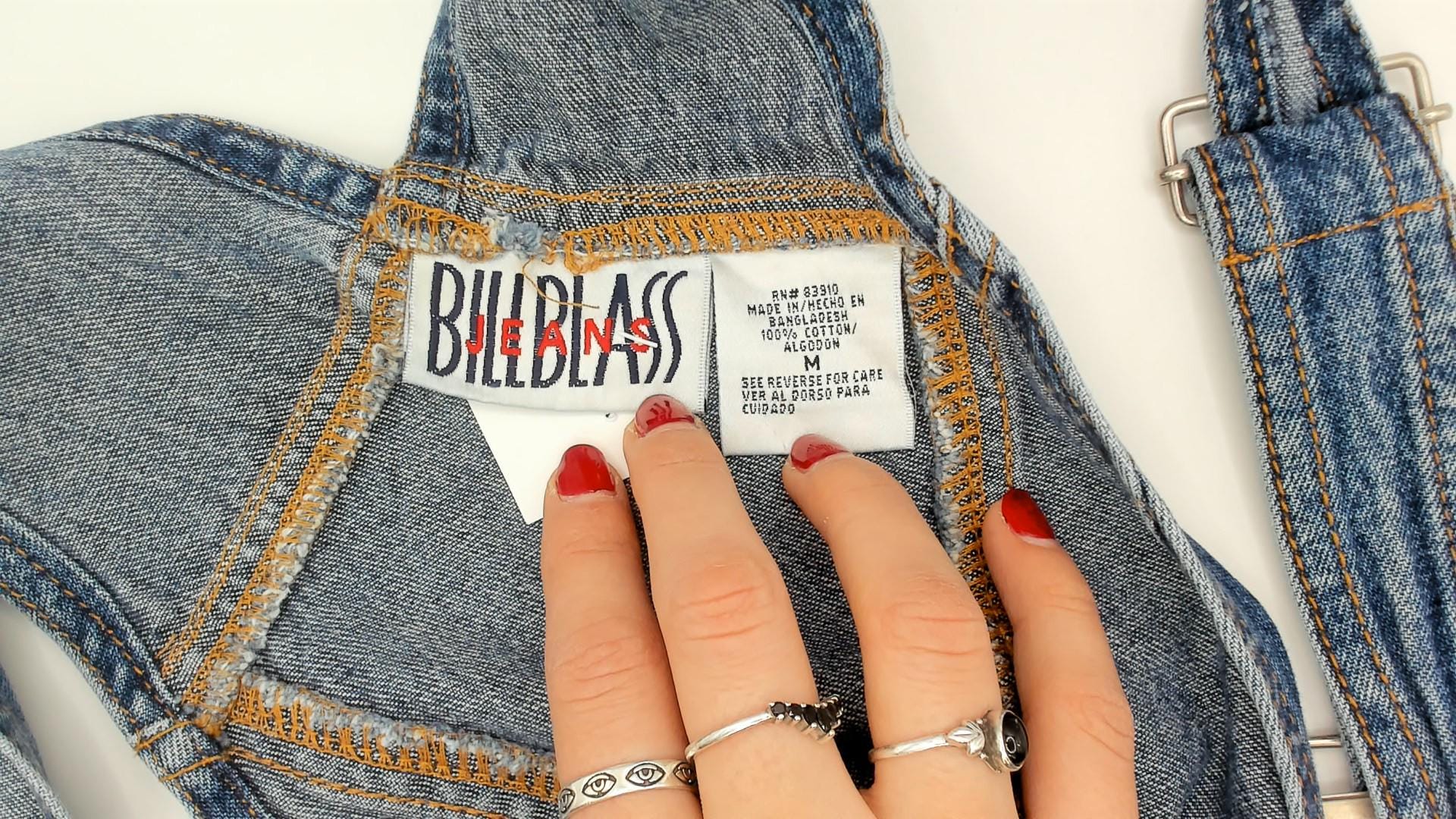 90s blue denim overalls from Bill Blass Jeans with adjustable metal buckle straps and a front bib pocket with snap flap closure. Side button closures at the waist, front slash pockets, two rear patch pockets, and a carpenter-style tool pocket on the left leg. Straight leg silhouette with contrast orange topstitching throughout and a V-back yoke construction.