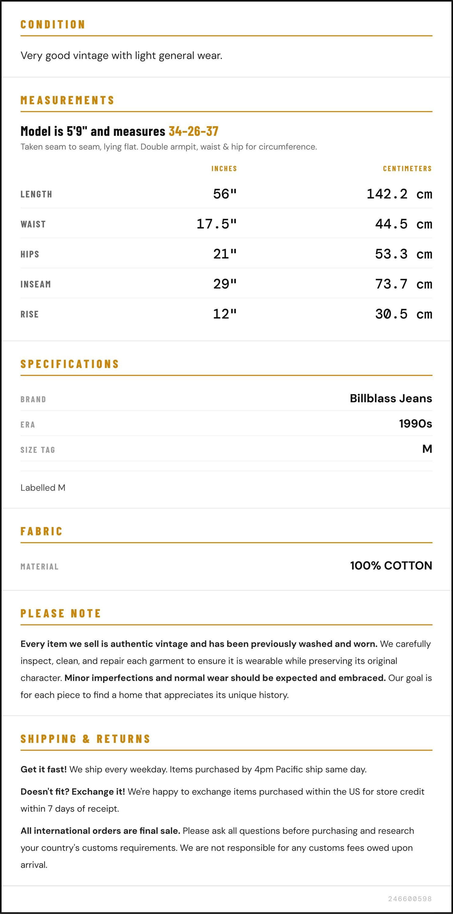 Vintage denim was usually made without any stretch, unlike modern jeans. Check the measurements to ensure proper fit, and remember to give yourself a little wiggle room in the waist and hips, depending on your preferred fit.