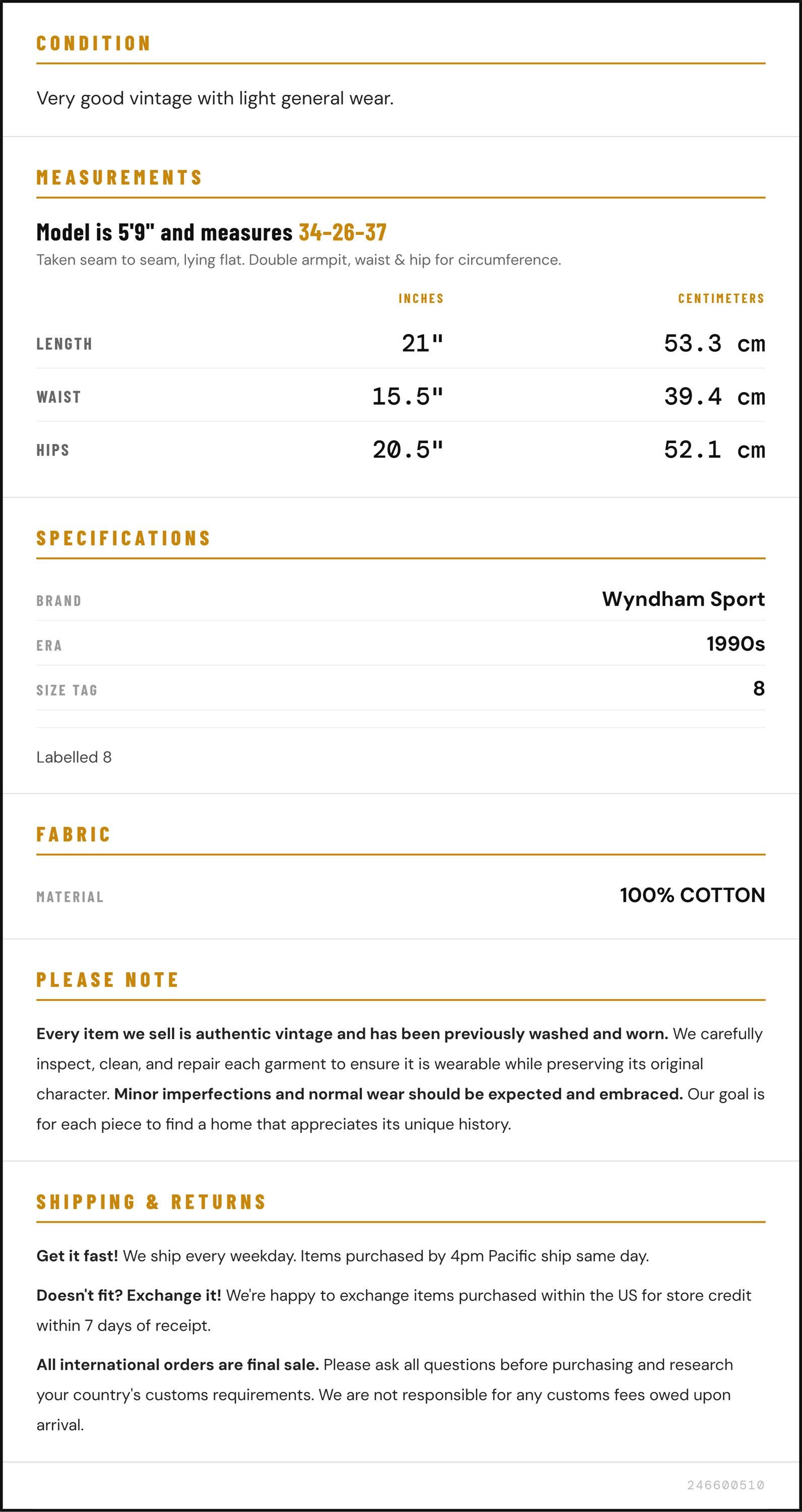 Measurements are taken laying flat and should be doubled where applicable. The "best fits" size is just an estimate, and vintage sizing can vary from modern sizing. Please use measurements to ensure proper fit. The best thing to do is measure a similar item of your own, and compare. When an item has stretch, we will list the unstretched dimensions with the stretched measurement afterwards.