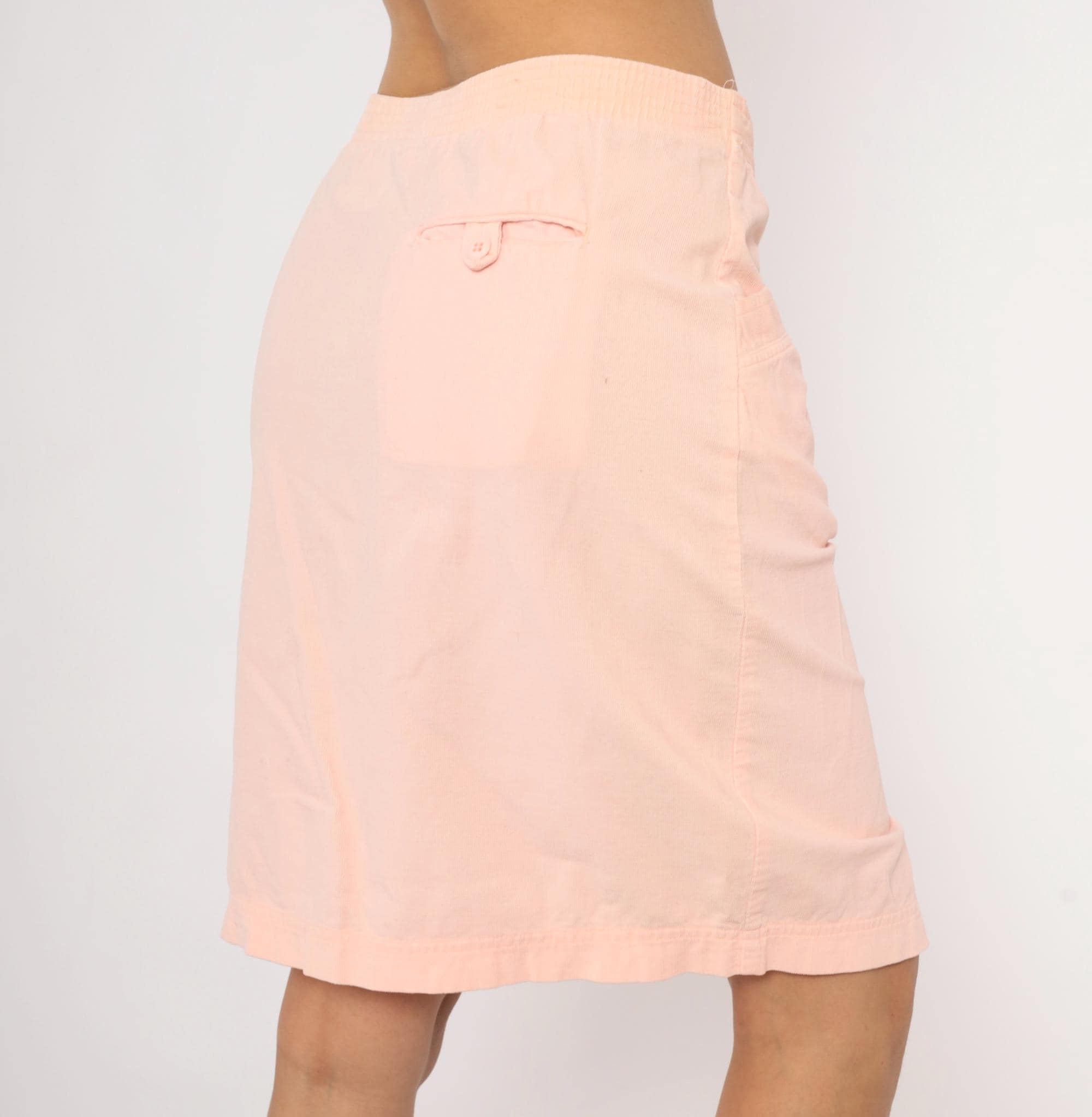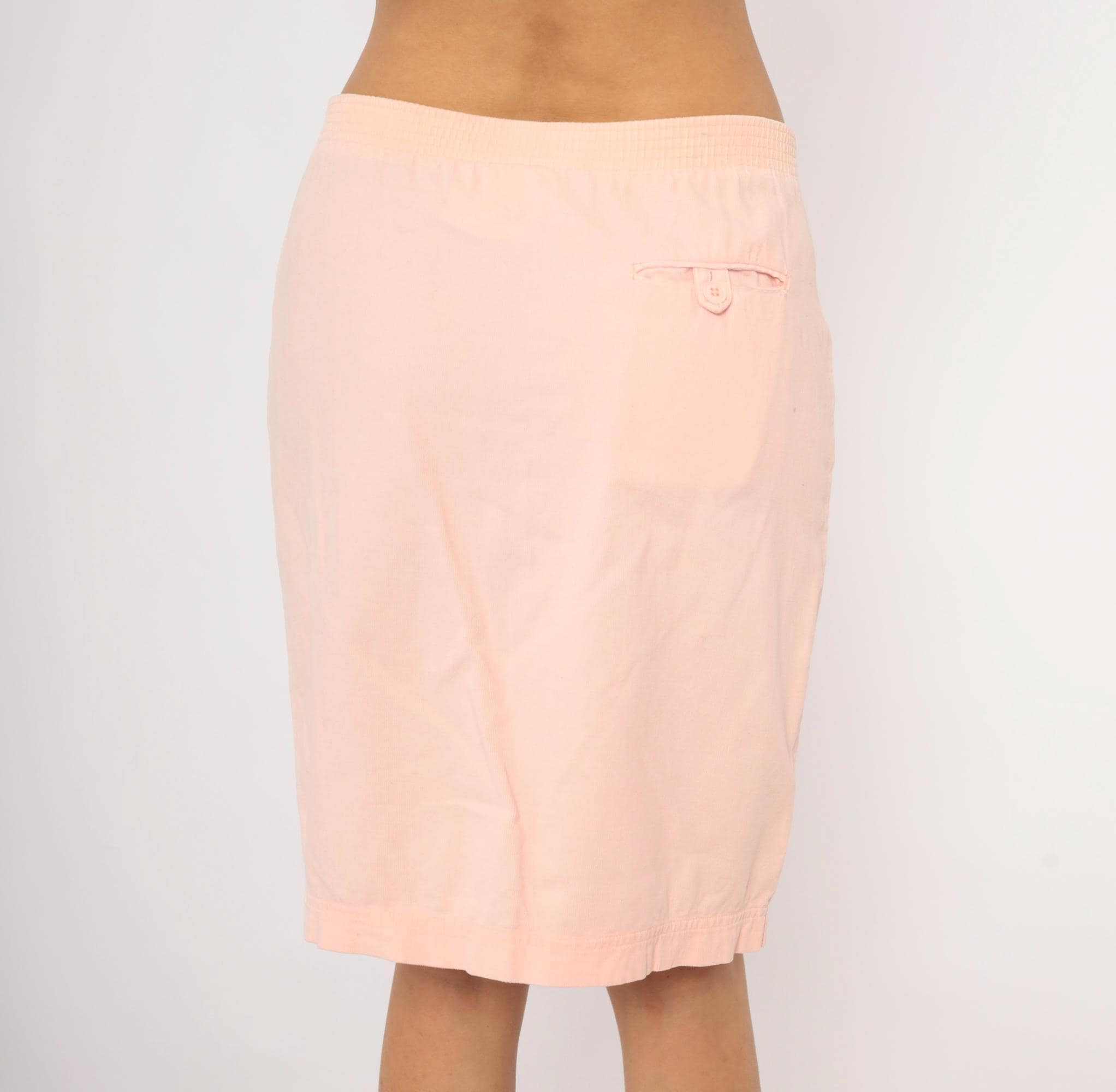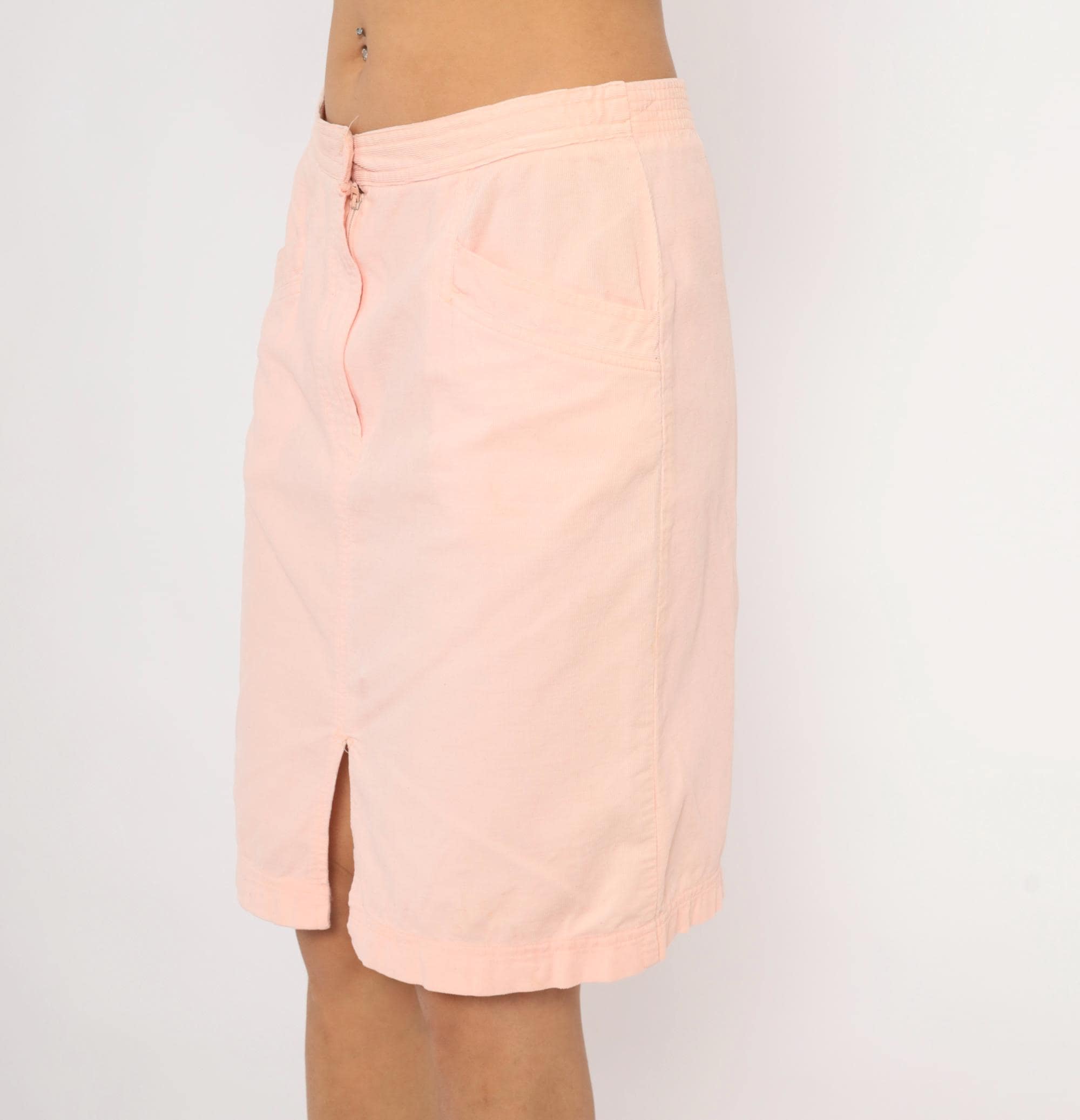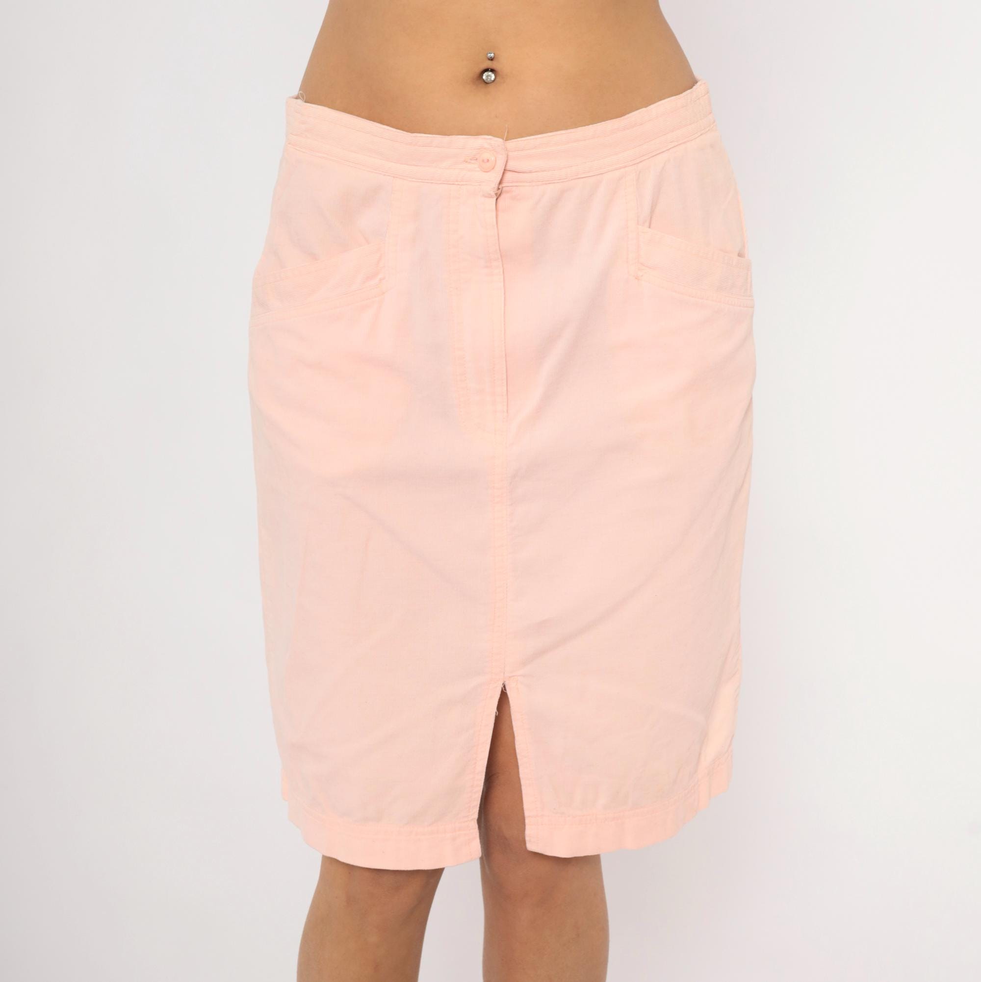 90s blush pink pencil skirt from Wyndham Sport with a front button and zipper closure, elasticized back waistband, and two front side seam pockets. Straight silhouette with a center front slit at the hem. Knee-length cut in a soft salmon tone.