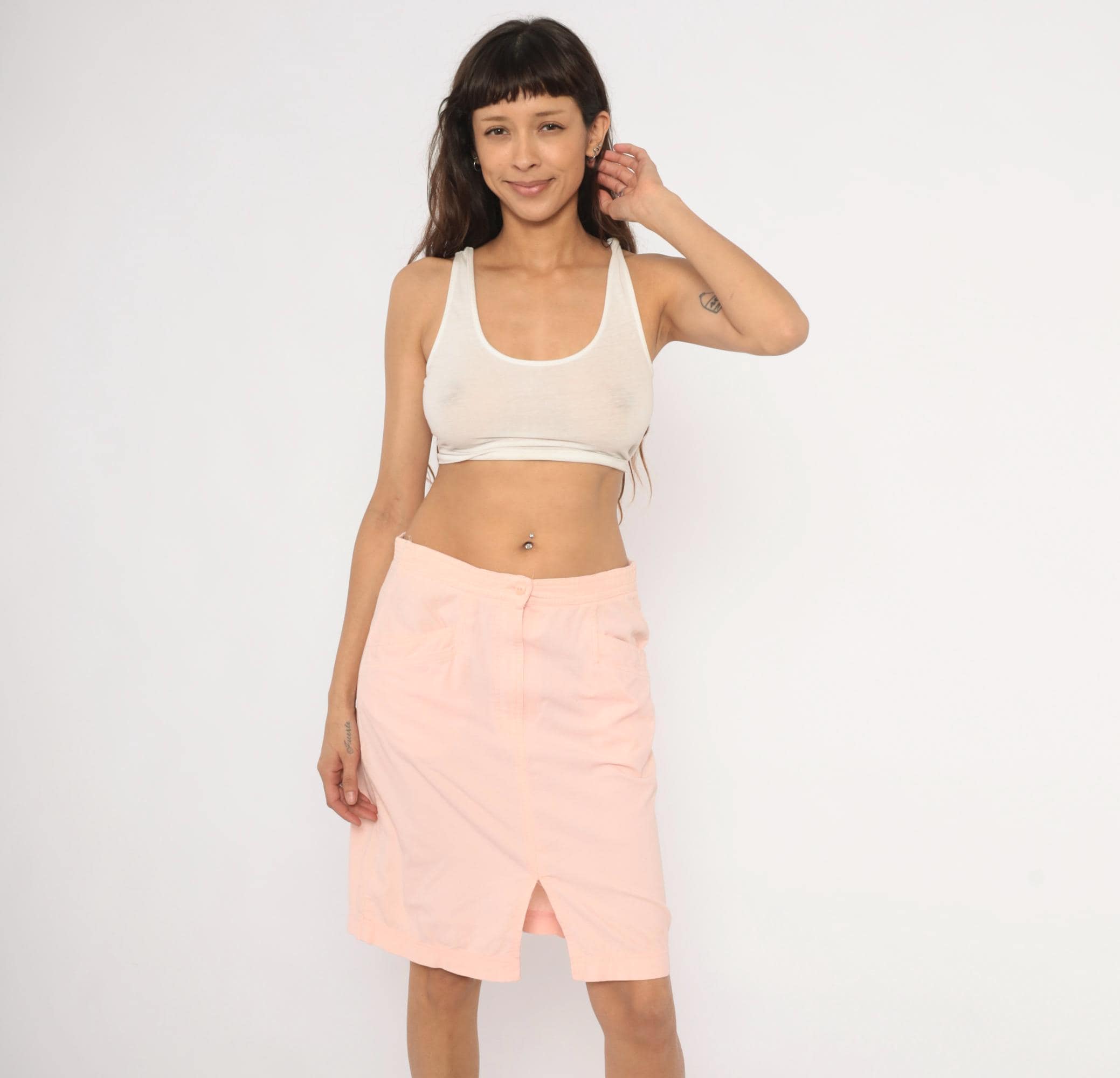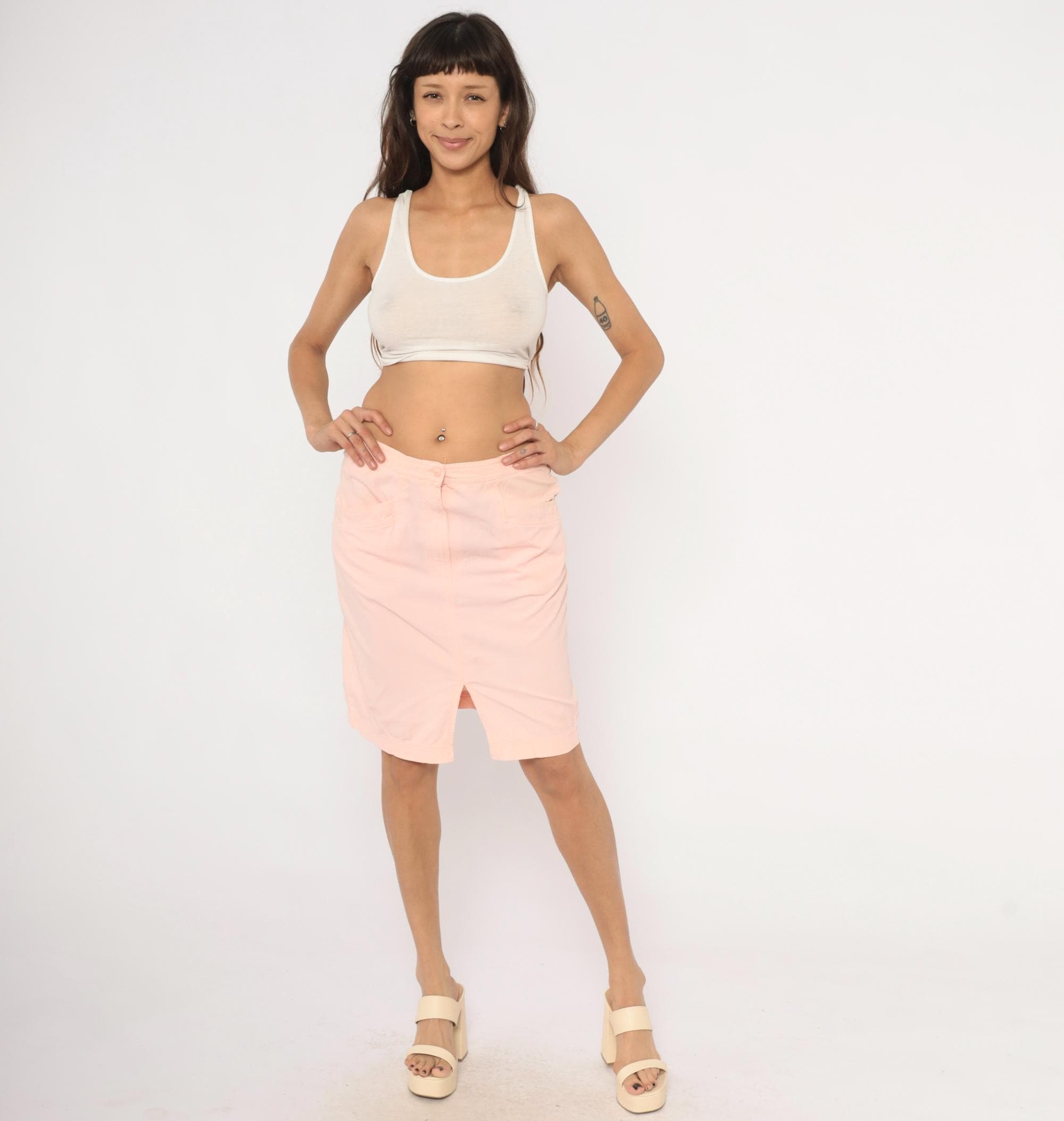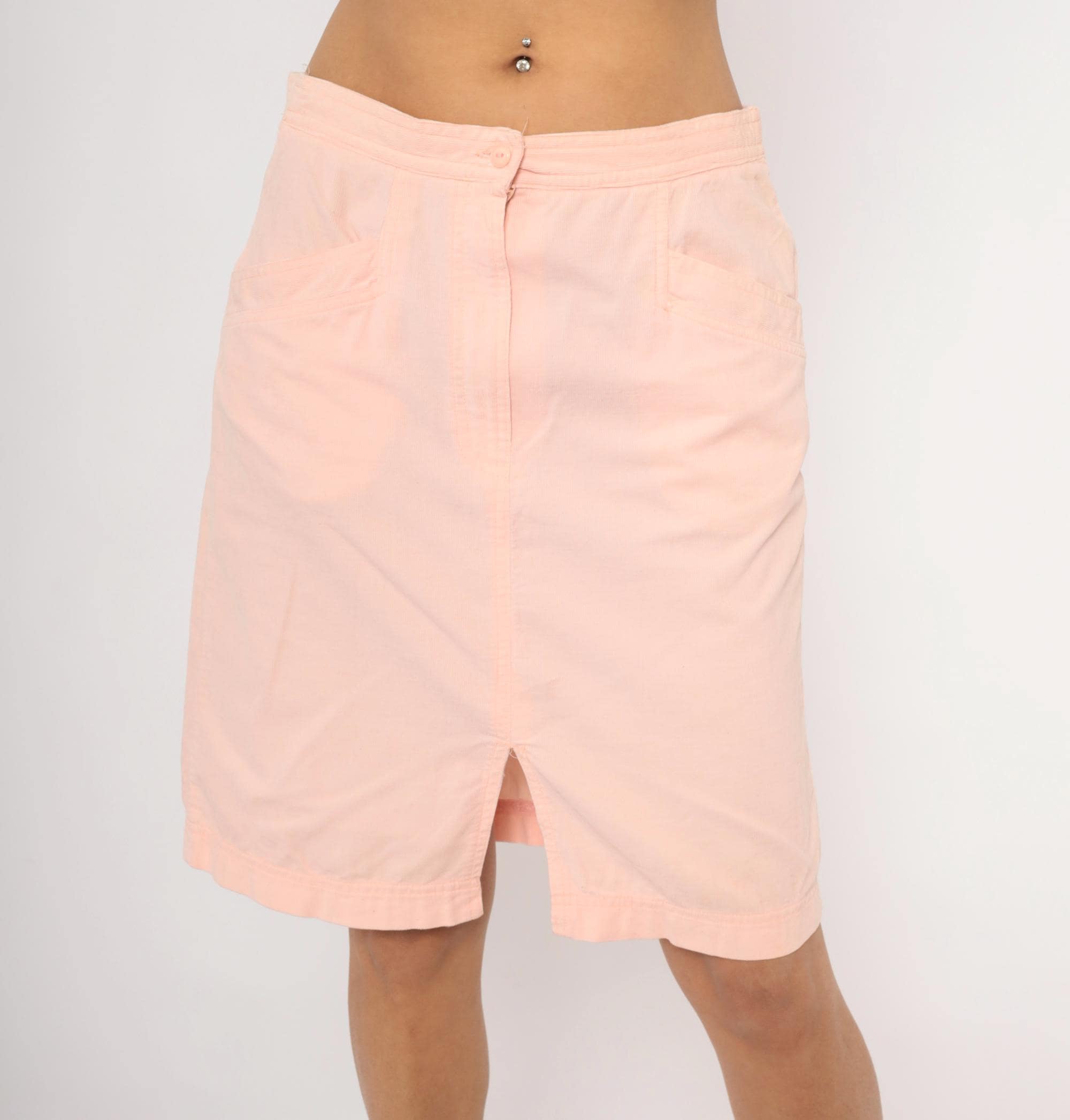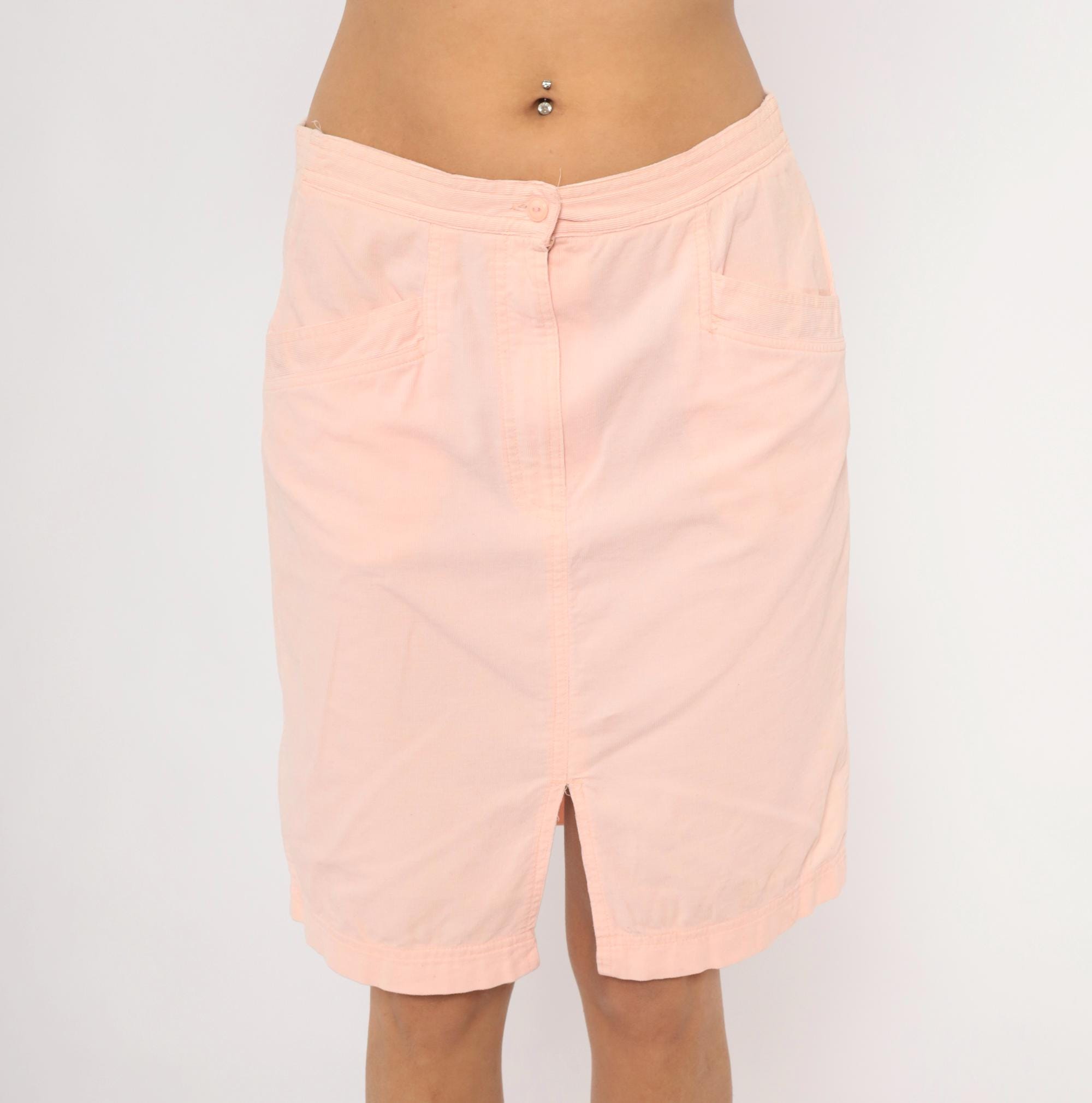 90s blush pink pencil skirt from Wyndham Sport with a front button and zipper closure, elasticized back waistband, and two front side seam pockets. Straight silhouette with a center front slit at the hem. Knee-length cut in a soft salmon tone.