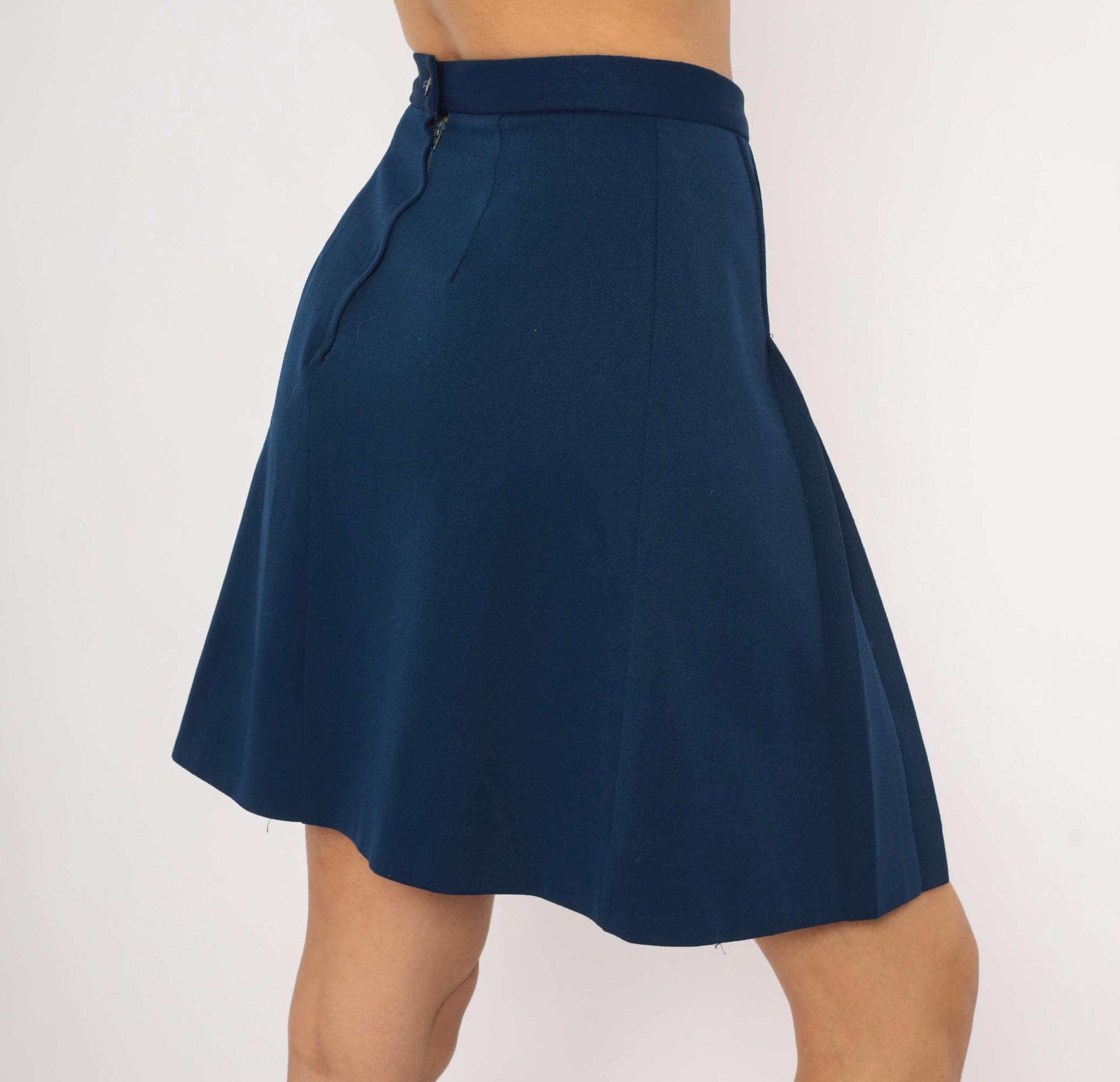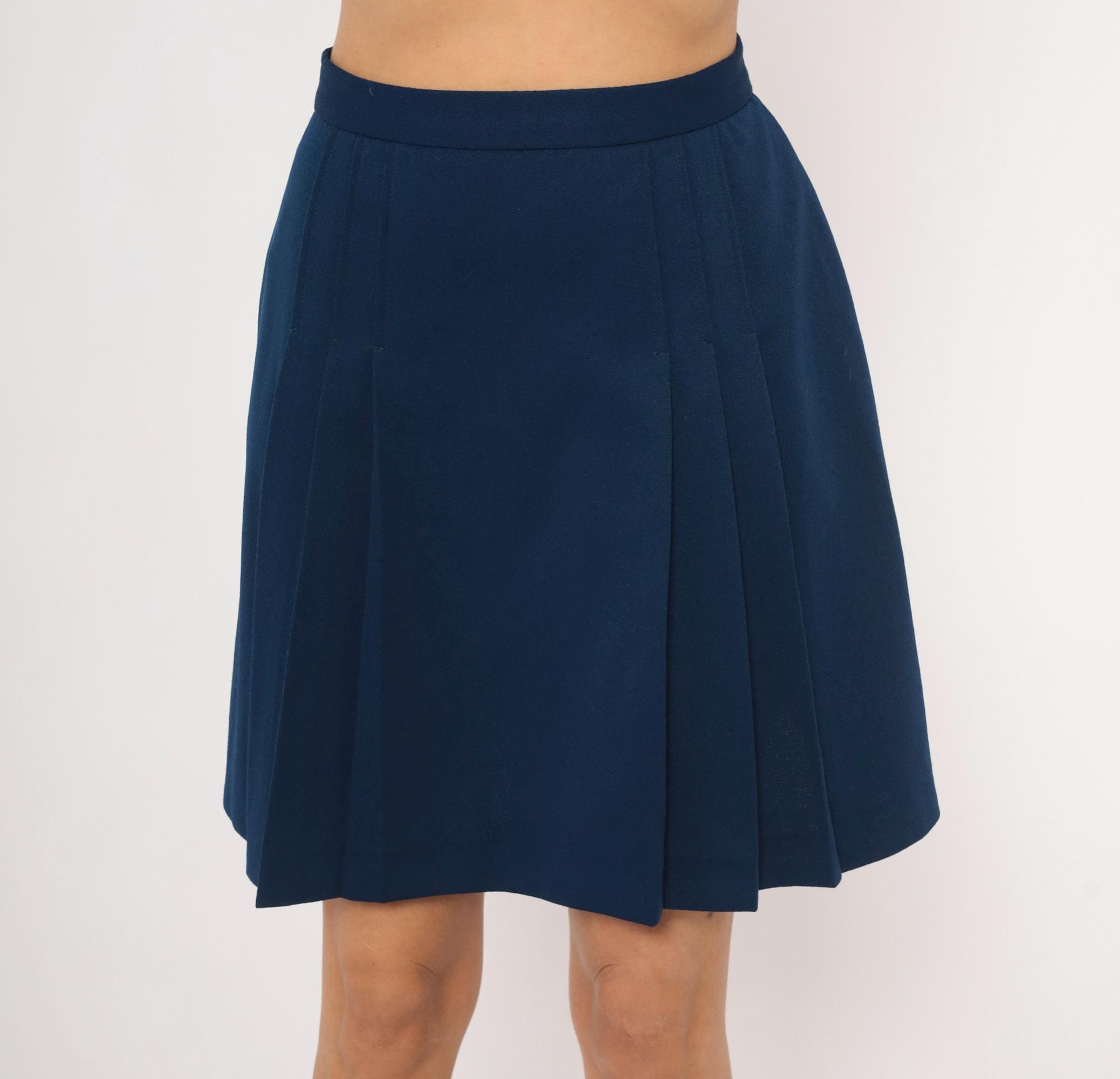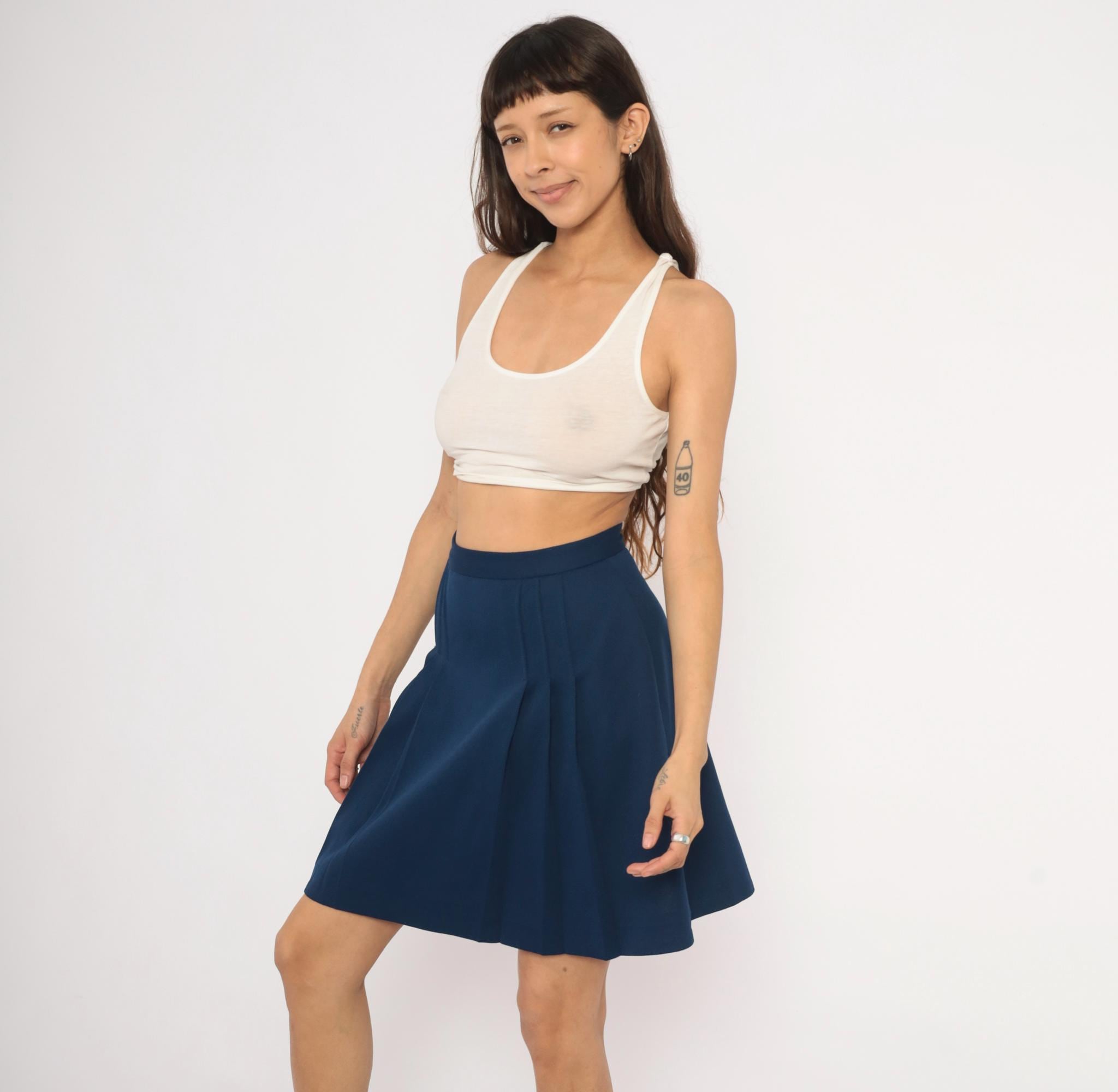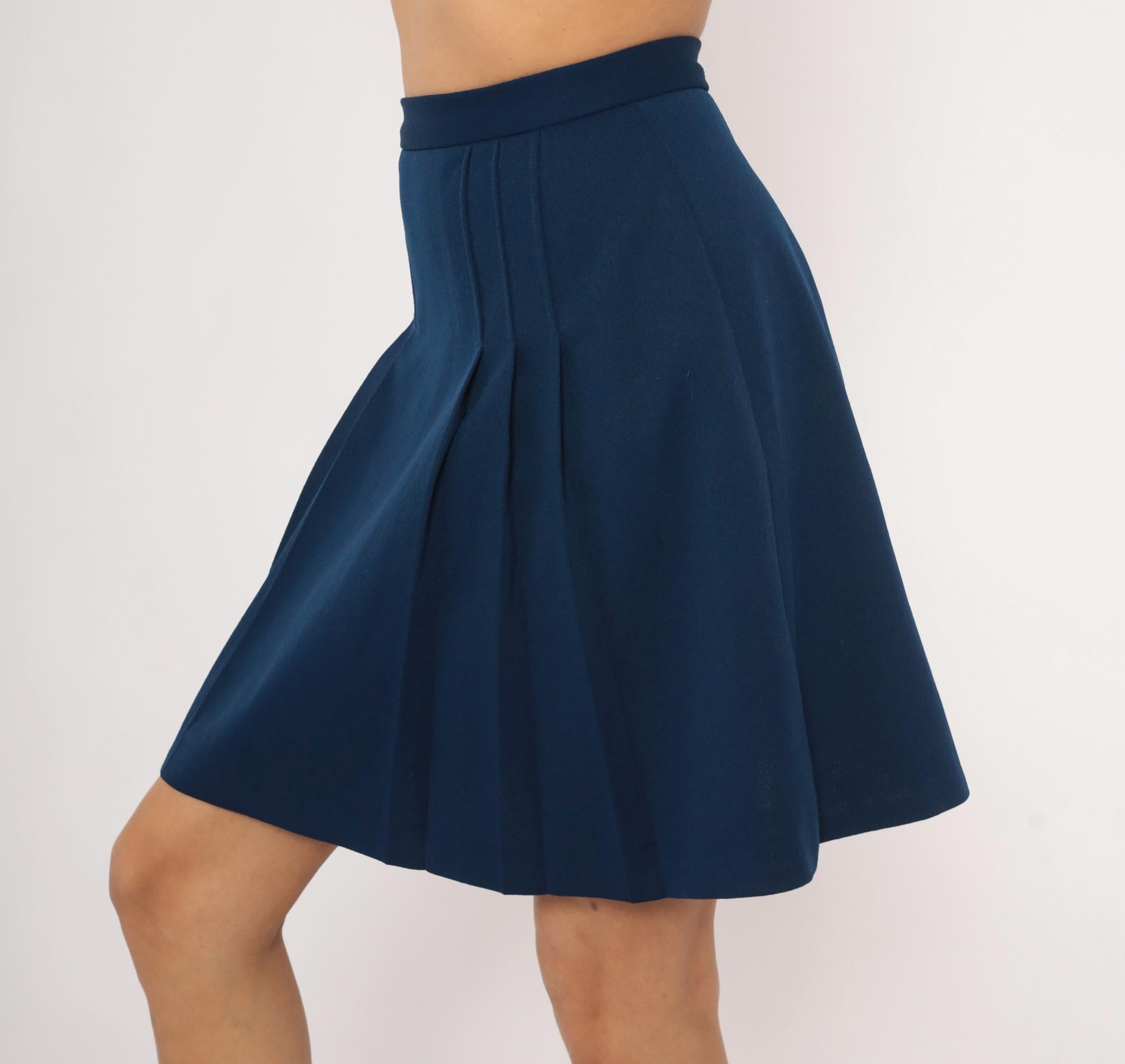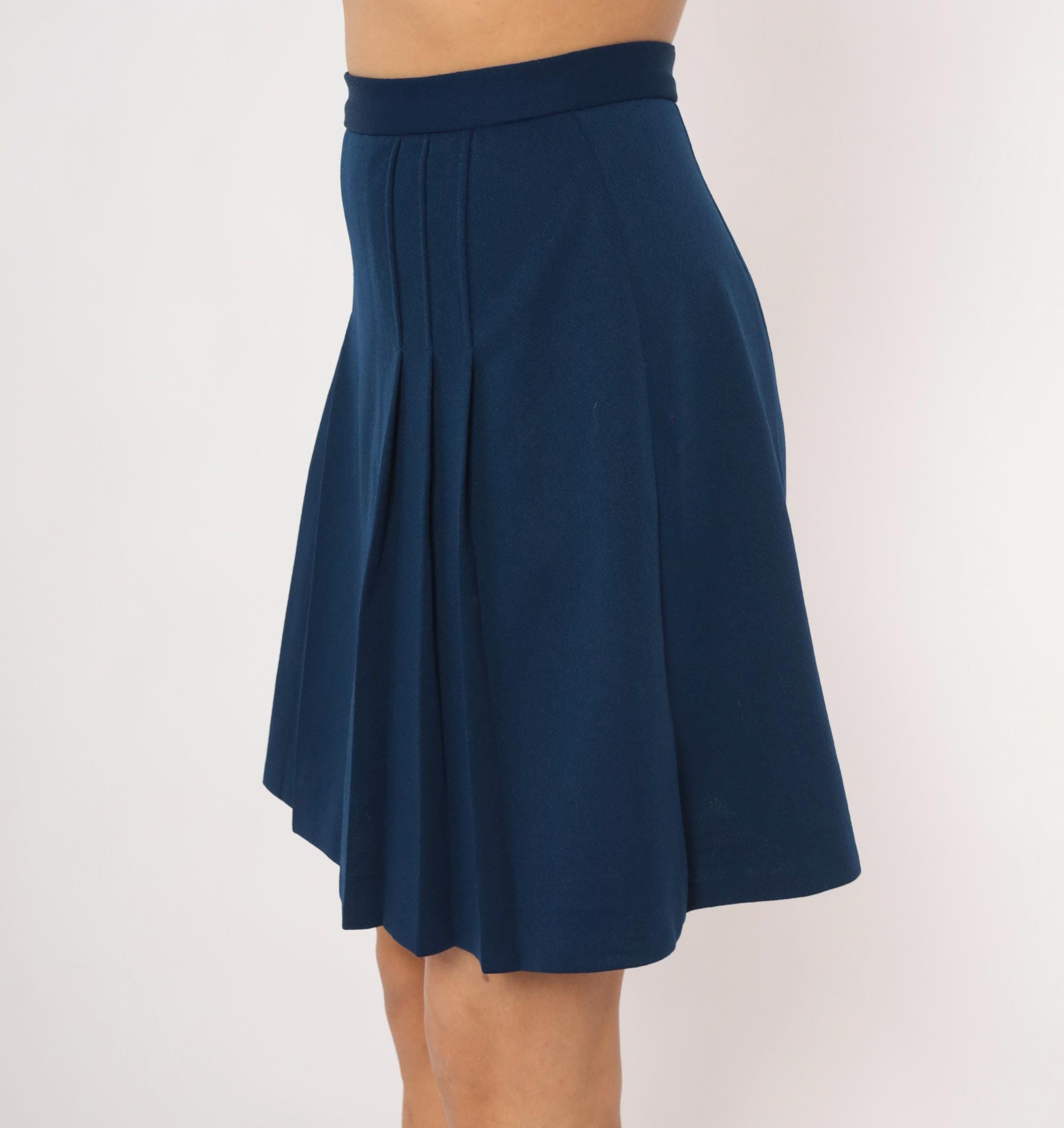 70s navy blue A-line skirt with pleats at the front waistband and a smooth back panel. High fitted waistband with back zipper closure and single button at center back. The pleats release from the waistband into a flared, knee-length silhouette.