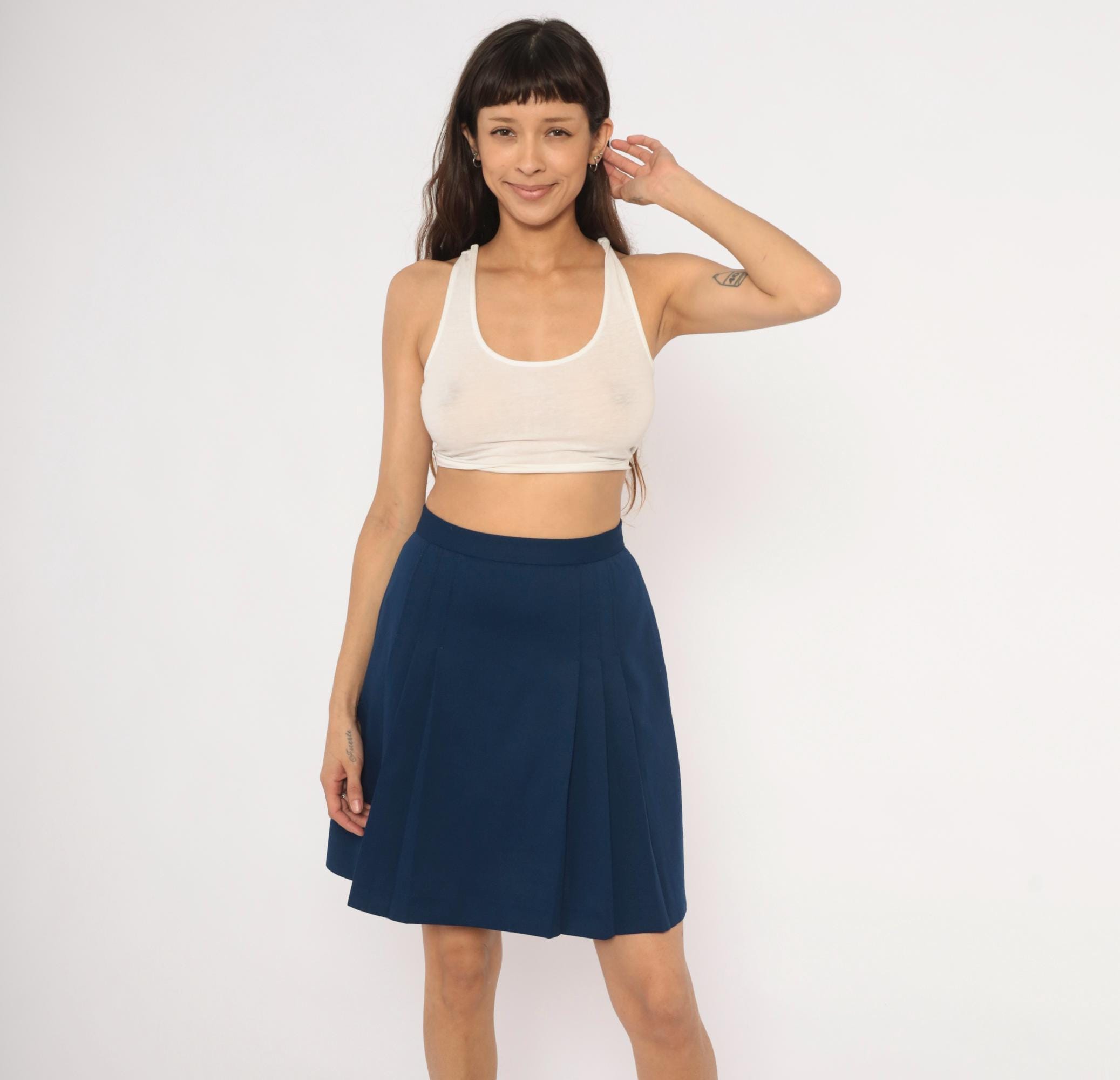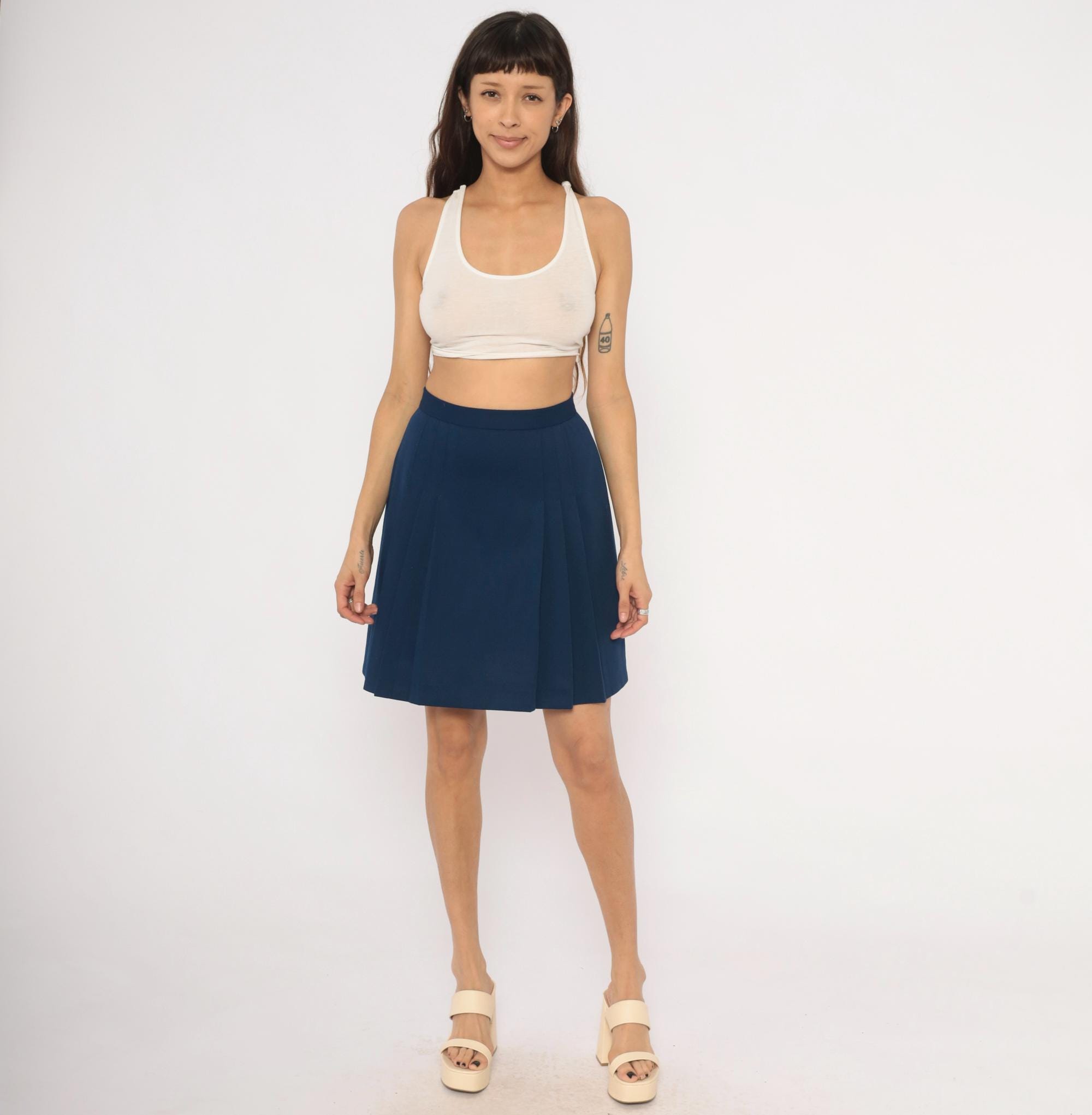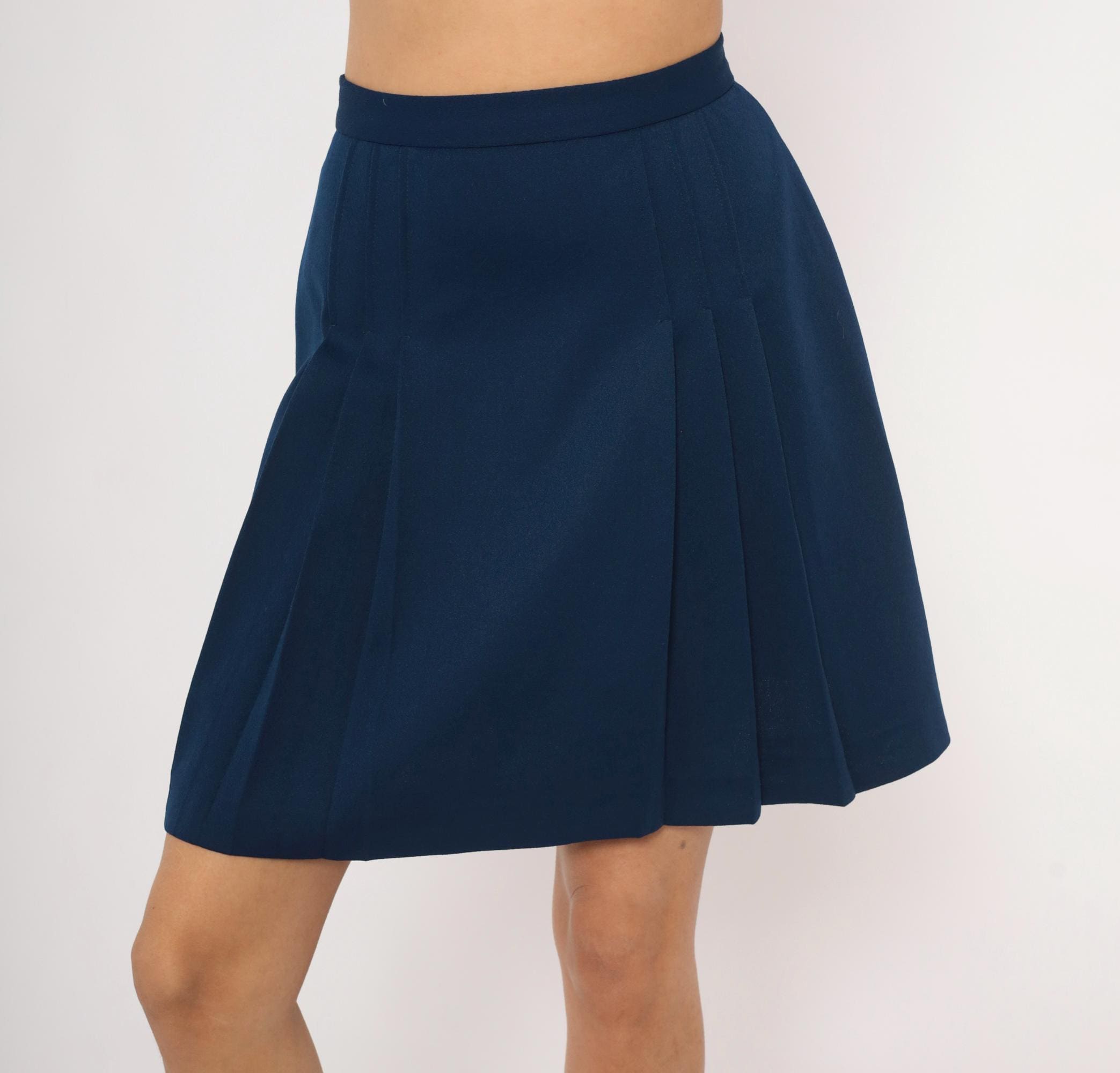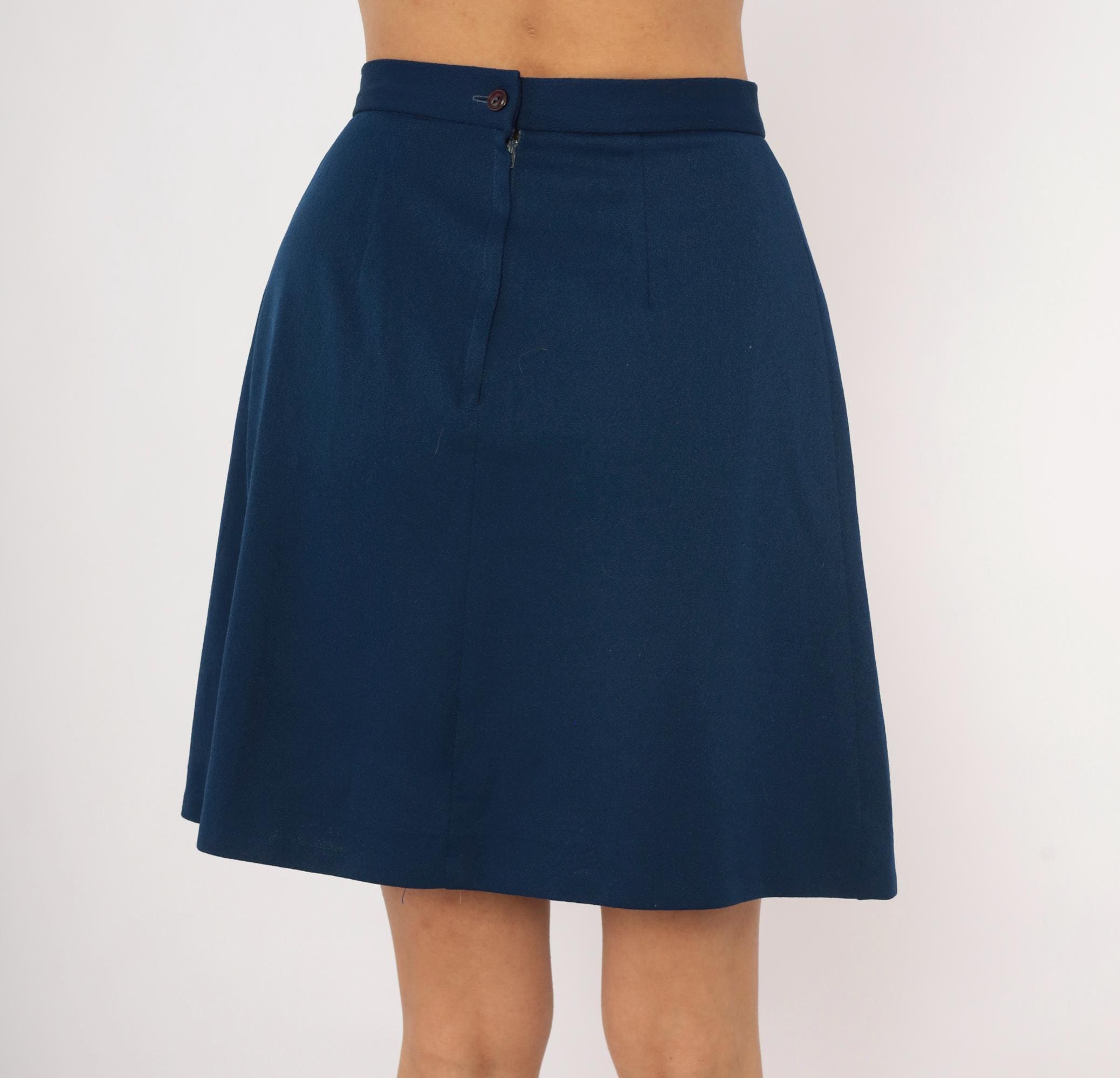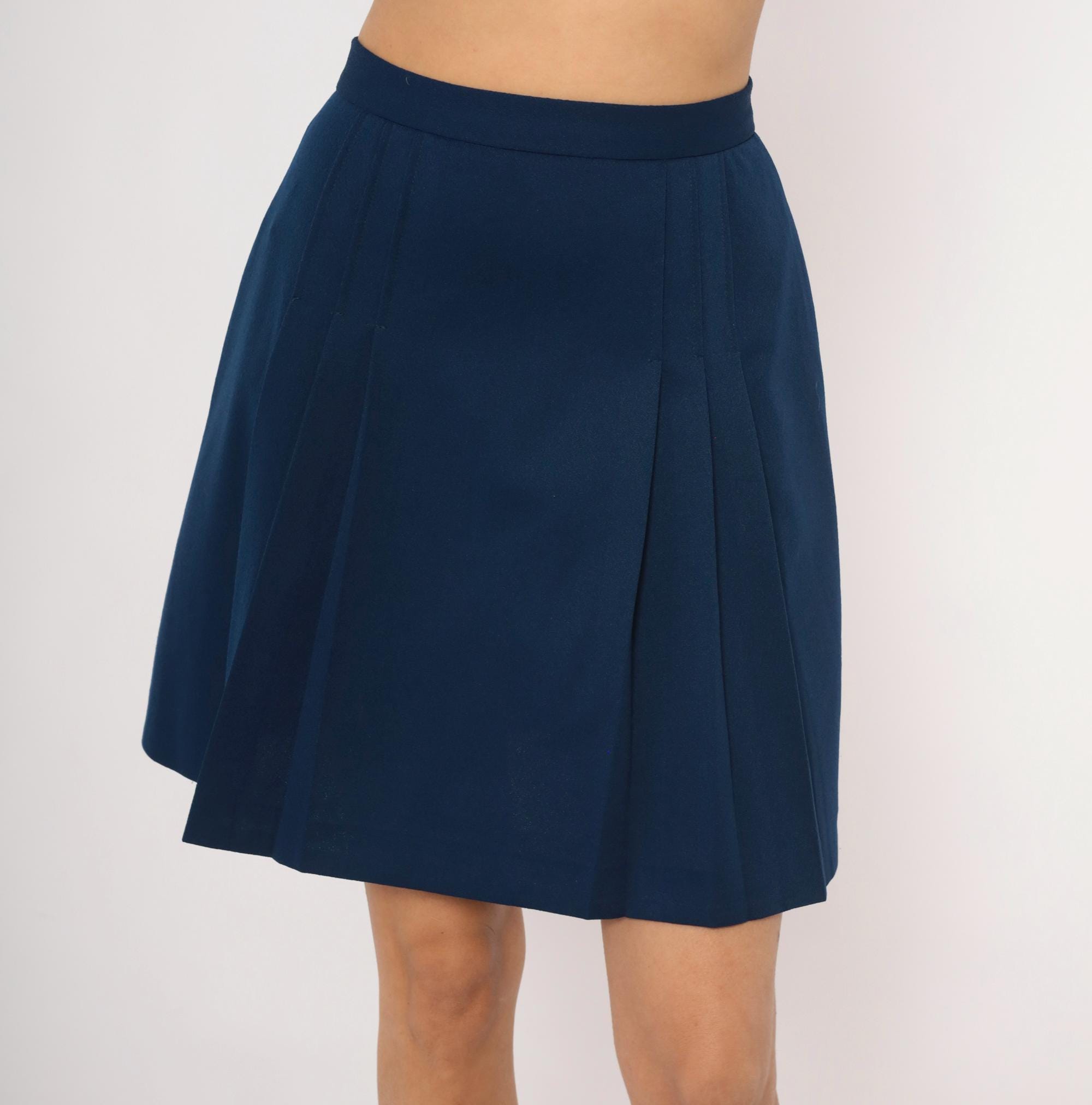 70s navy blue A-line skirt with pleats at the front waistband and a smooth back panel. High fitted waistband with back zipper closure and single button at center back. The pleats release from the waistband into a flared, knee-length silhouette.