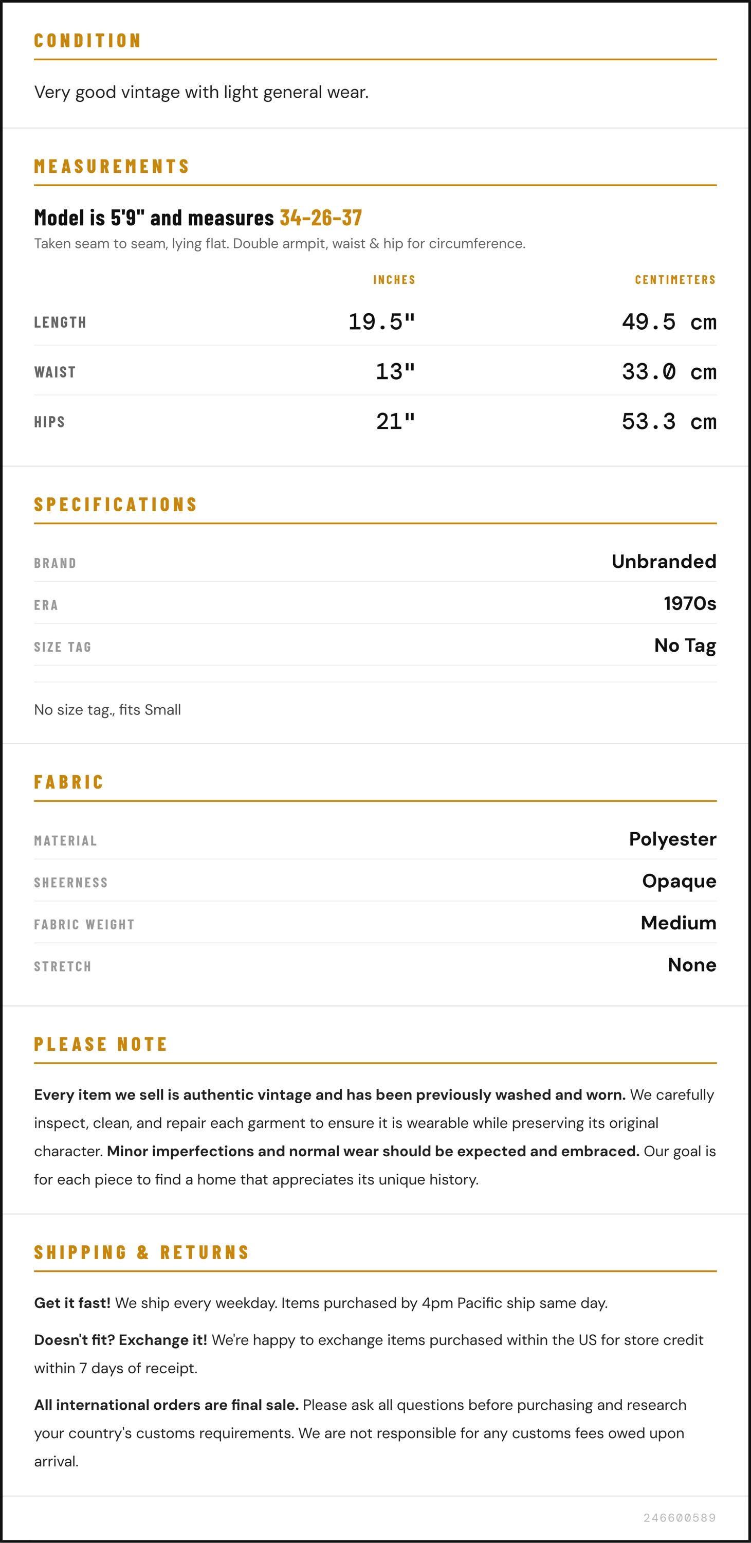 Measurements are taken laying flat and should be doubled where applicable. The "best fits" size is just an estimate, and vintage sizing can vary from modern sizing. Please use measurements to ensure proper fit. The best thing to do is measure a similar item of your own, and compare. When an item has stretch, we will list the unstretched dimensions with the stretched measurement afterwards.