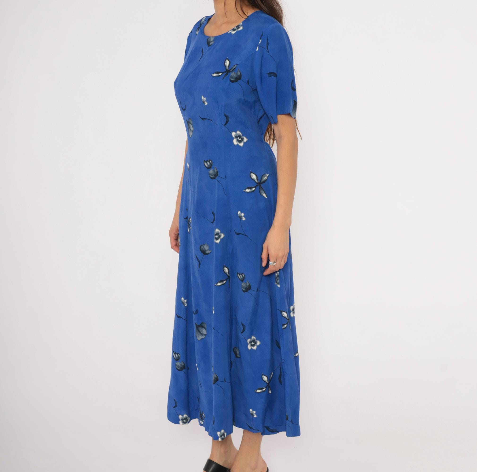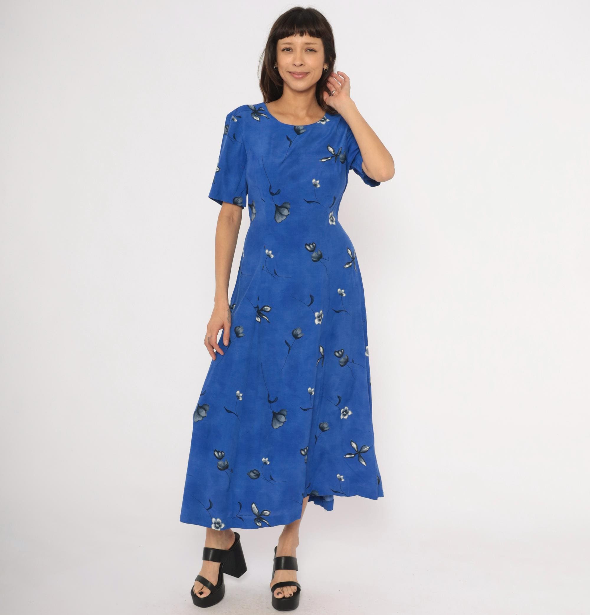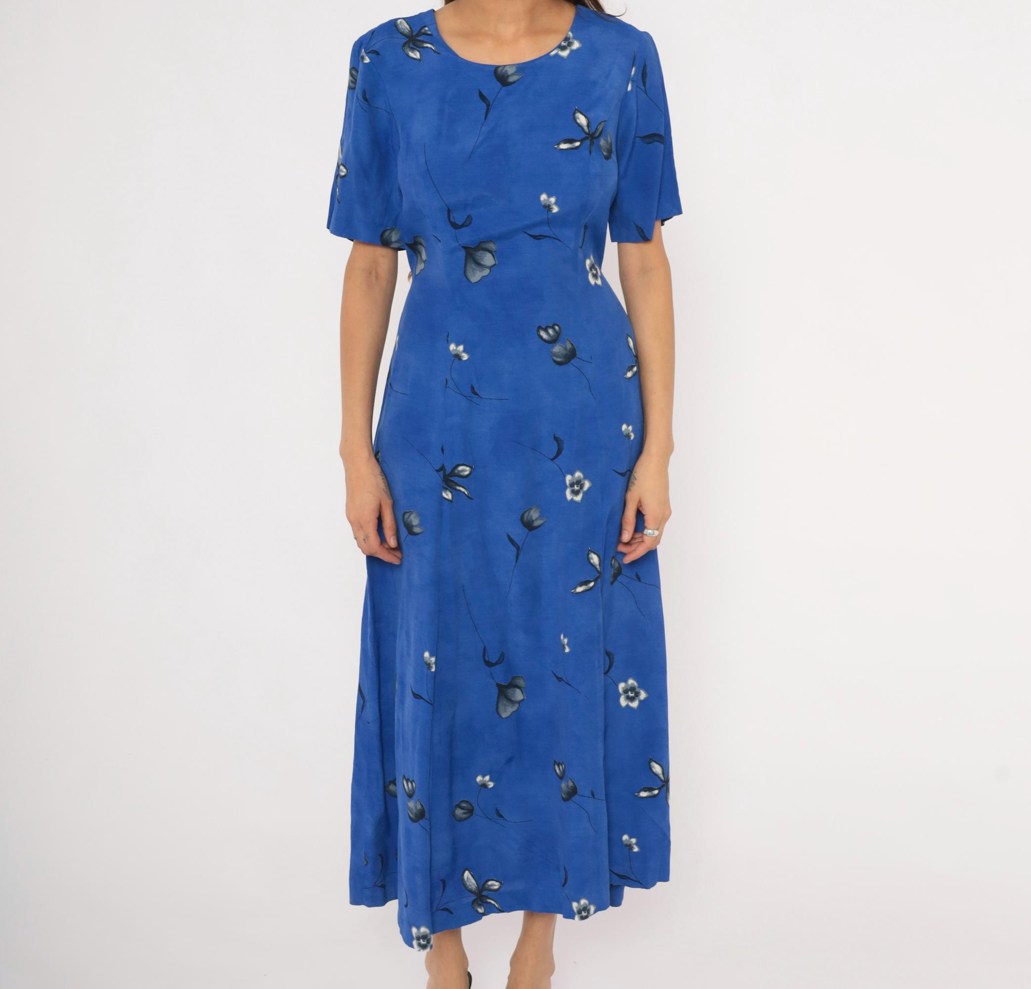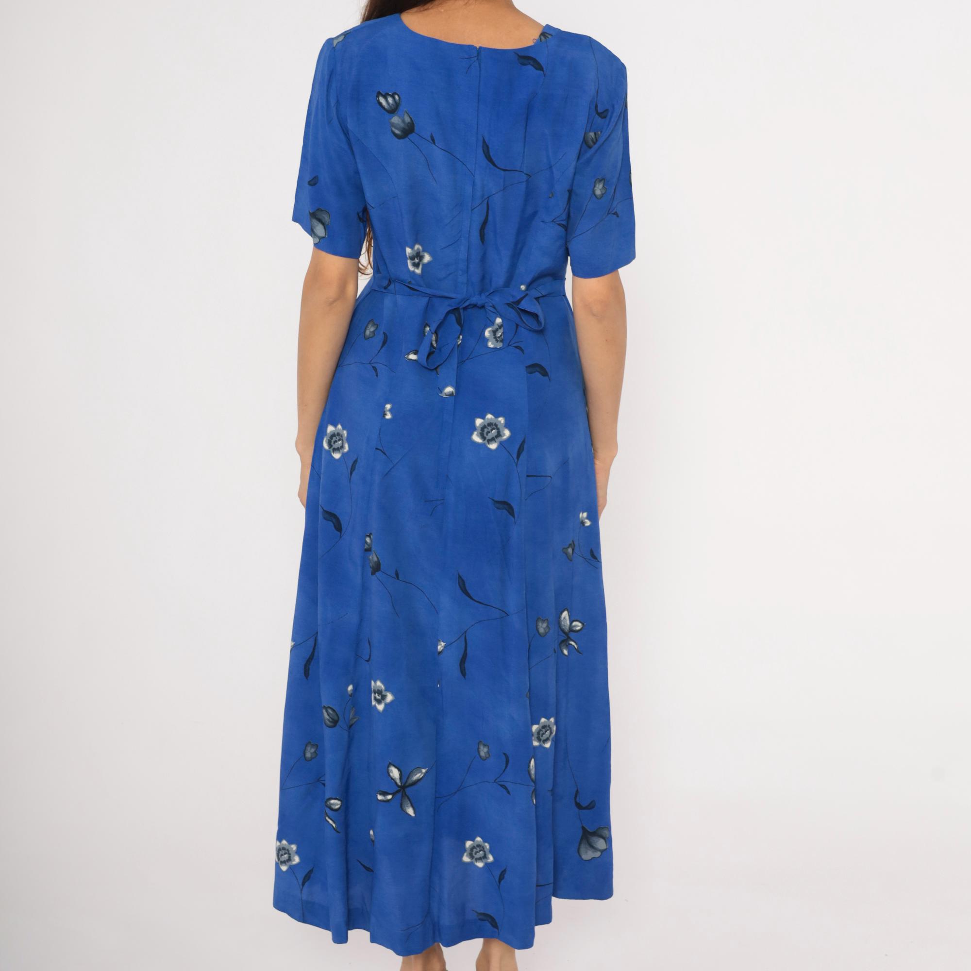90s cobalt blue maxi dress from Coldwater Creek with scattered dark floral and botanical print in navy, black, and white tones. Scoop neckline, short sleeves, back zipper closure, and tie sash at the back waist. A-line silhouette with a fitted bodice through the waist and a wider, flared skirt to the ankle.