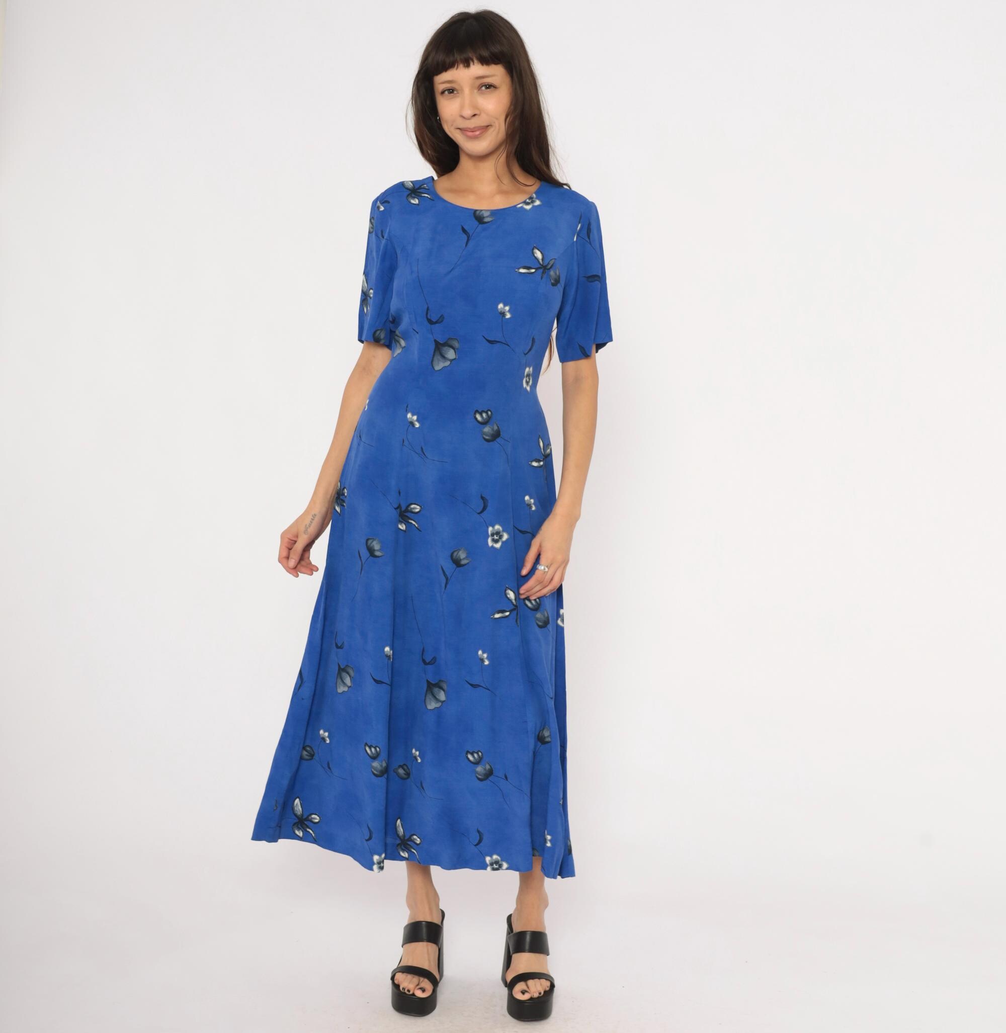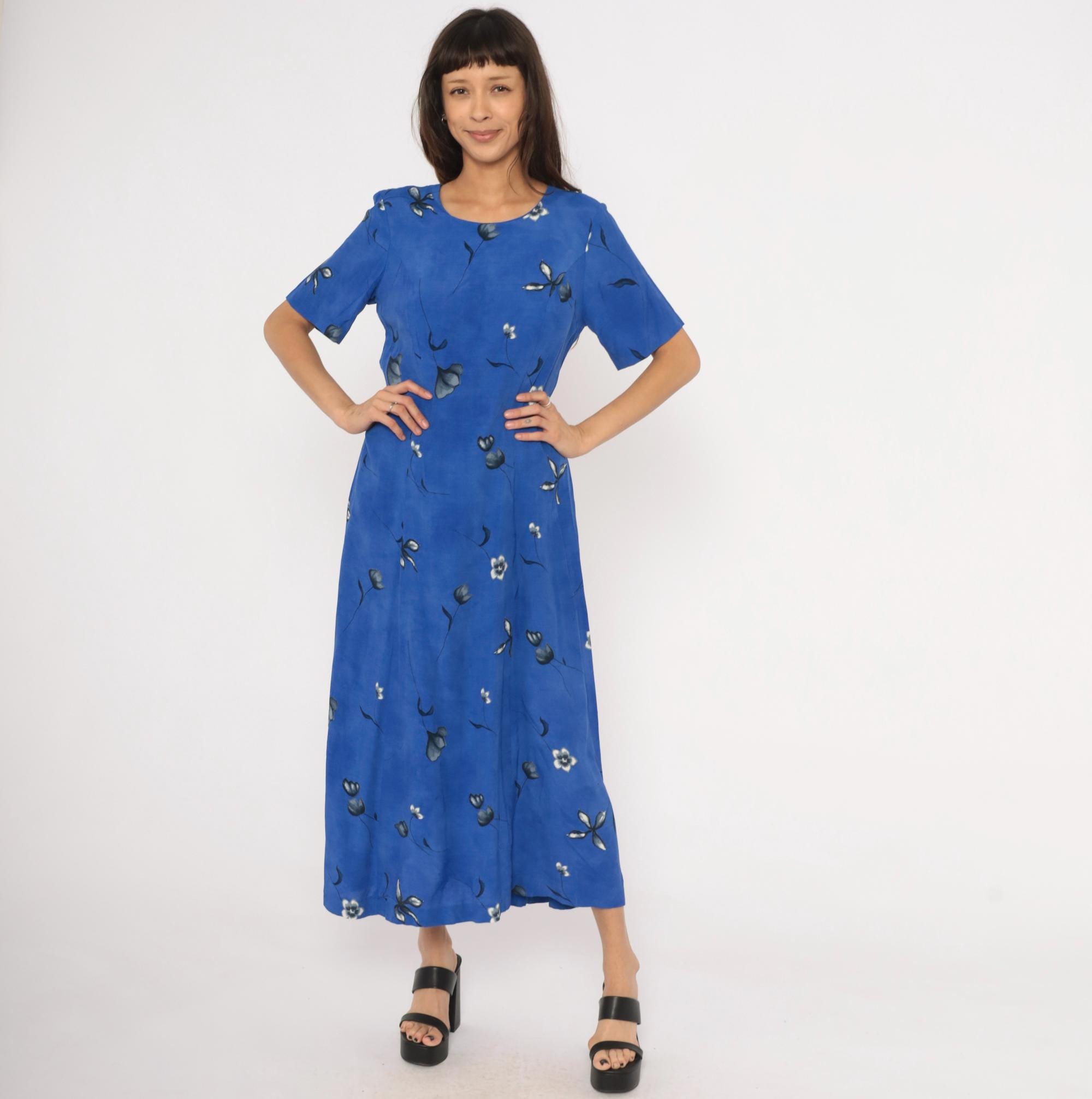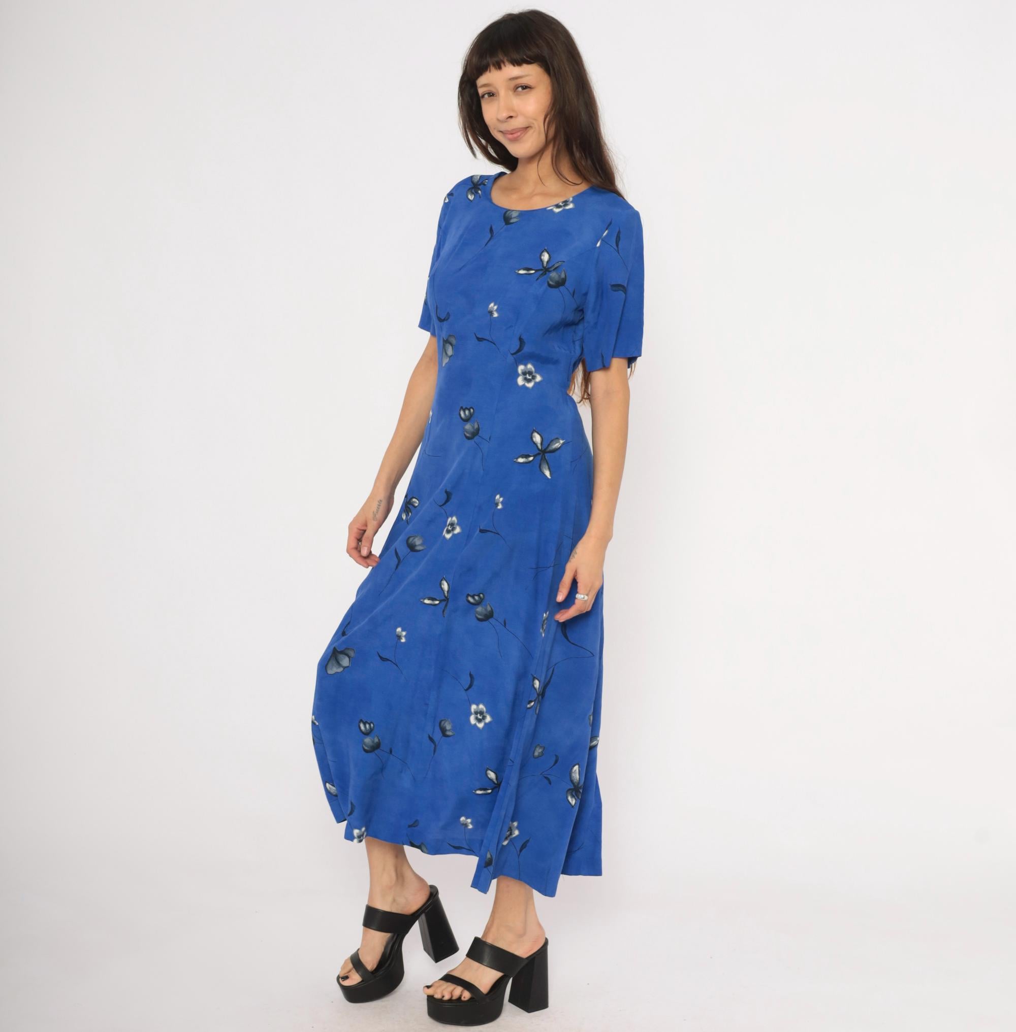 90s cobalt blue maxi dress from Coldwater Creek with scattered dark floral and botanical print in navy, black, and white tones. Scoop neckline, short sleeves, back zipper closure, and tie sash at the back waist. A-line silhouette with a fitted bodice through the waist and a wider, flared skirt to the ankle.