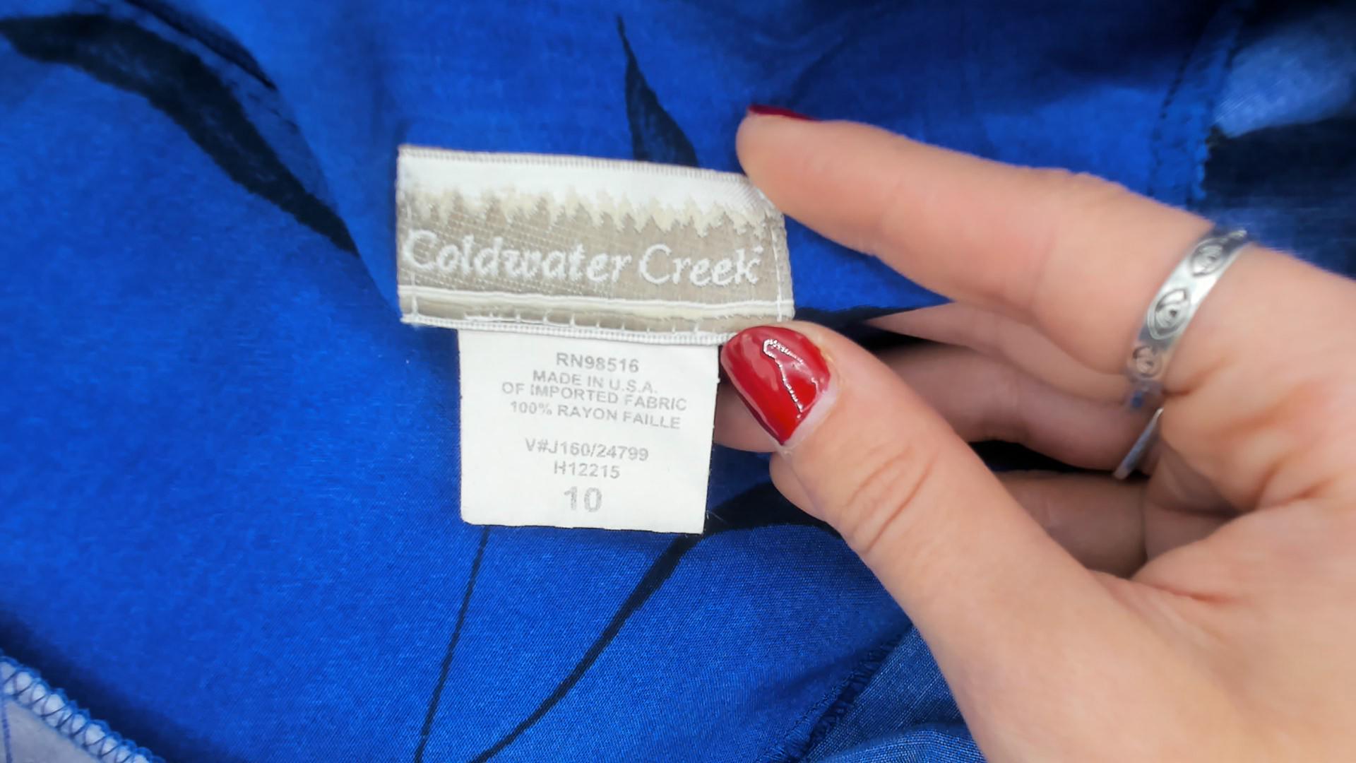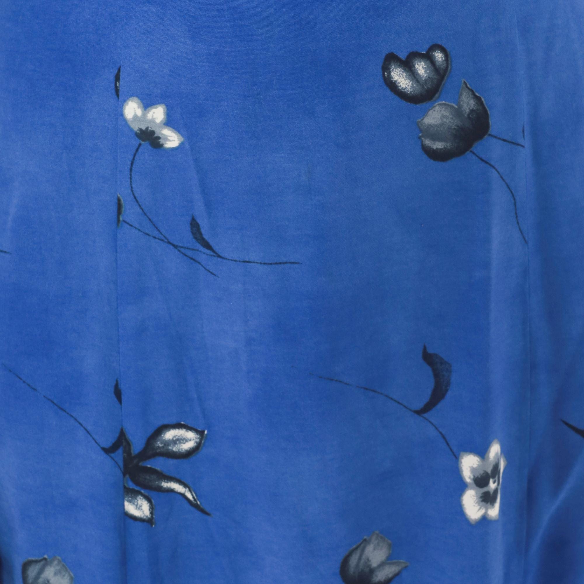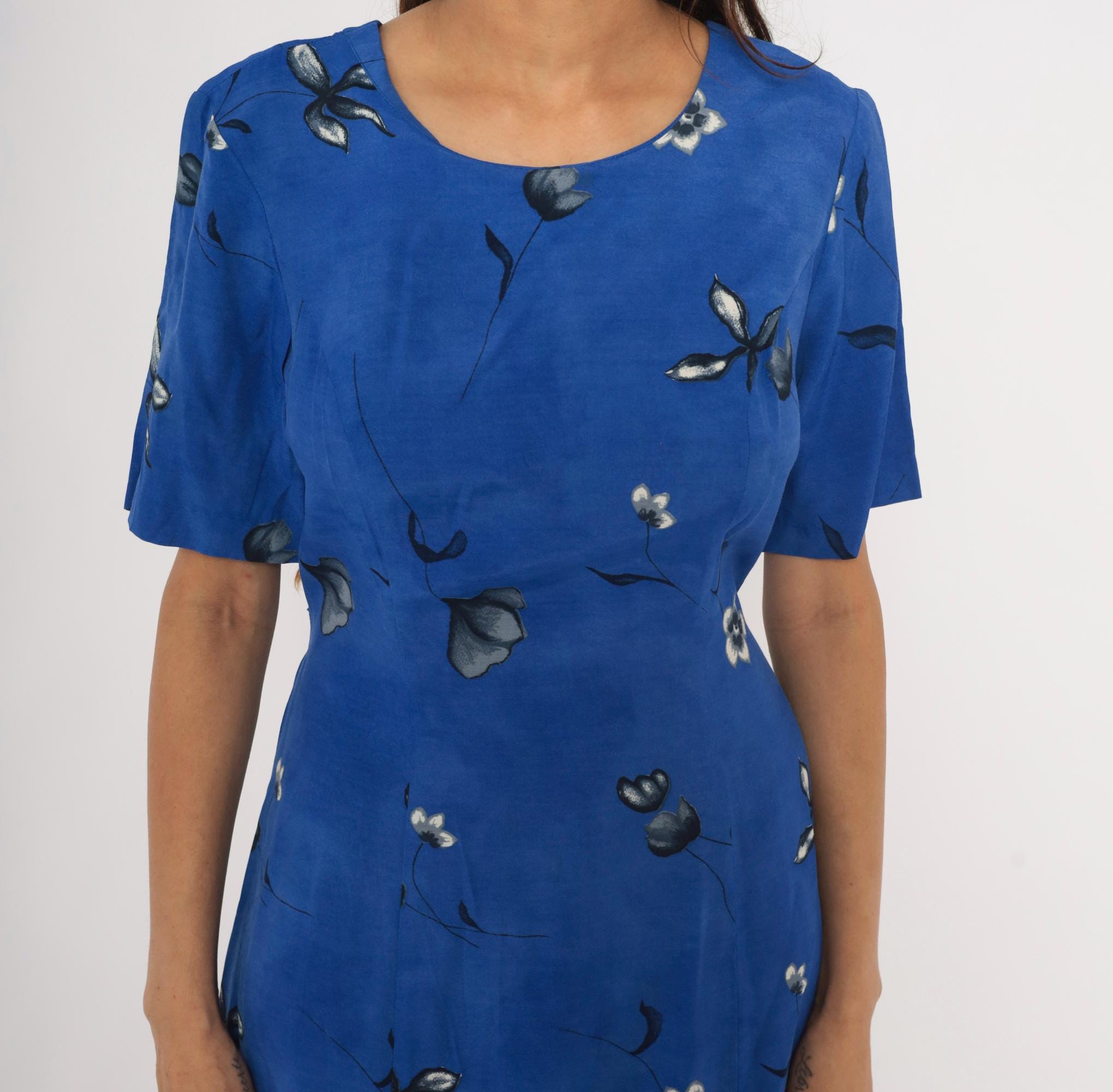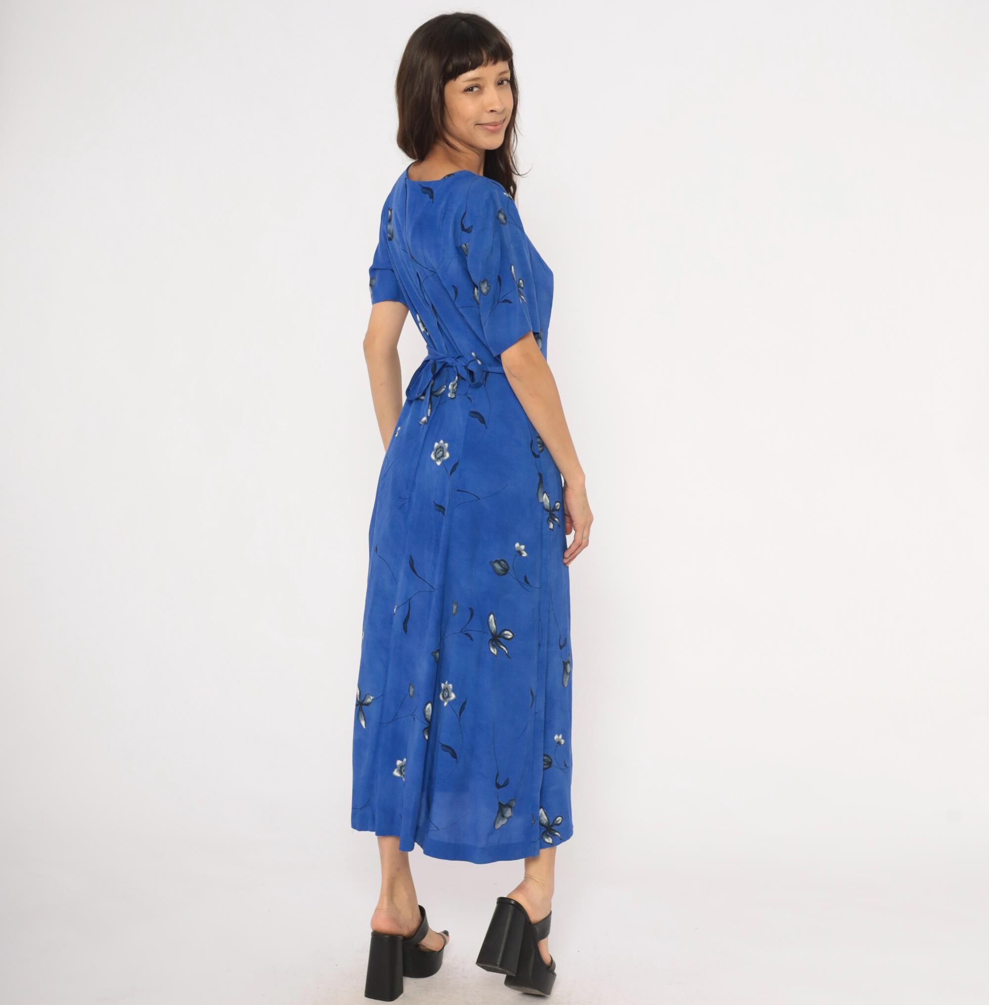 90s cobalt blue maxi dress from Coldwater Creek with scattered dark floral and botanical print in navy, black, and white tones. Scoop neckline, short sleeves, back zipper closure, and tie sash at the back waist. A-line silhouette with a fitted bodice through the waist and a wider, flared skirt to the ankle.