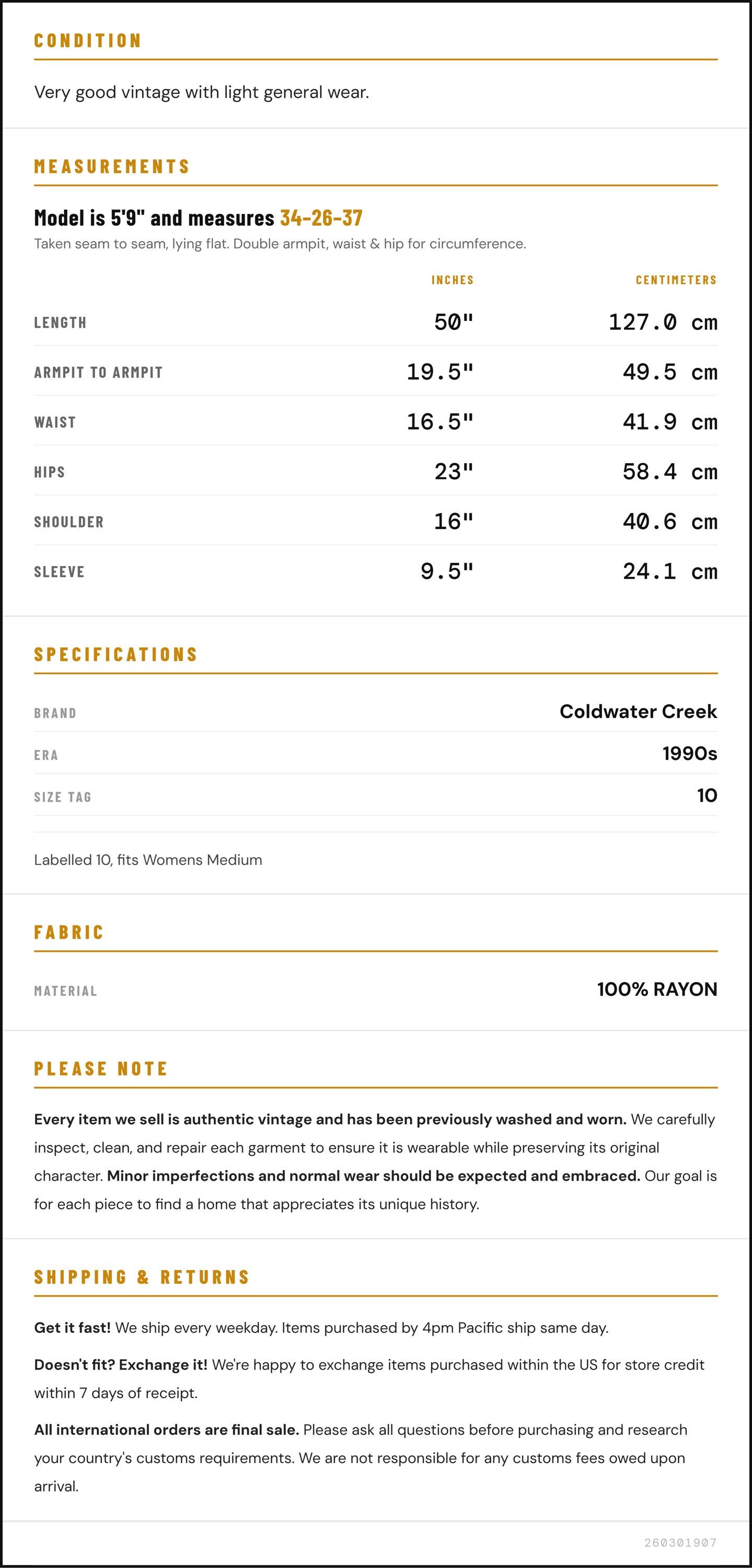 Vintage denim was usually made without any stretch, unlike modern jeans. Check the measurements to ensure proper fit, and remember to give yourself a little wiggle room in the waist and hips, depending on your preferred fit.