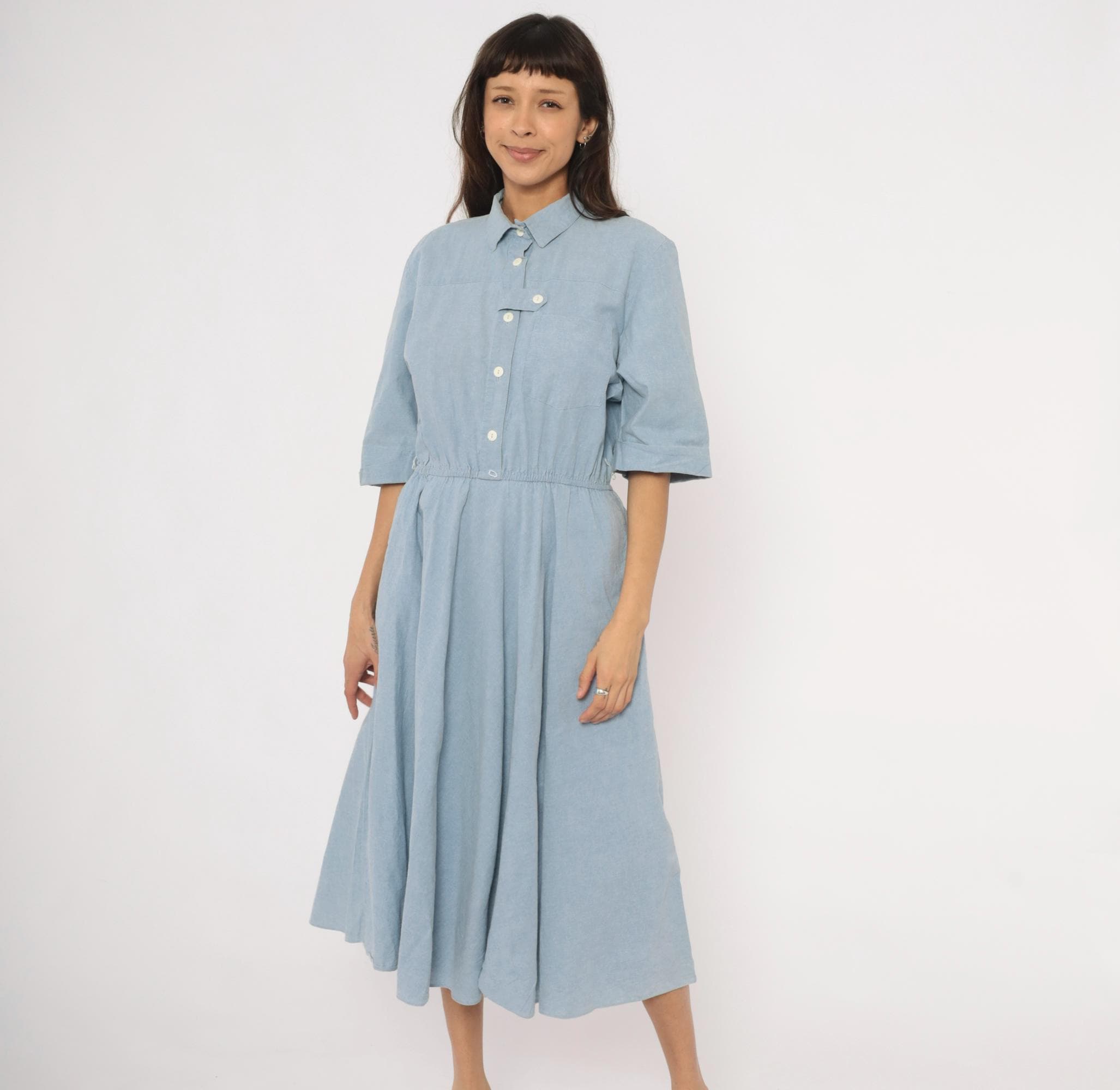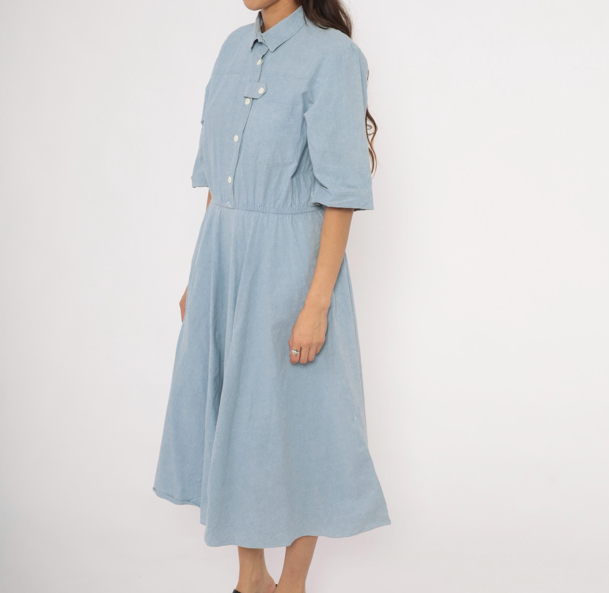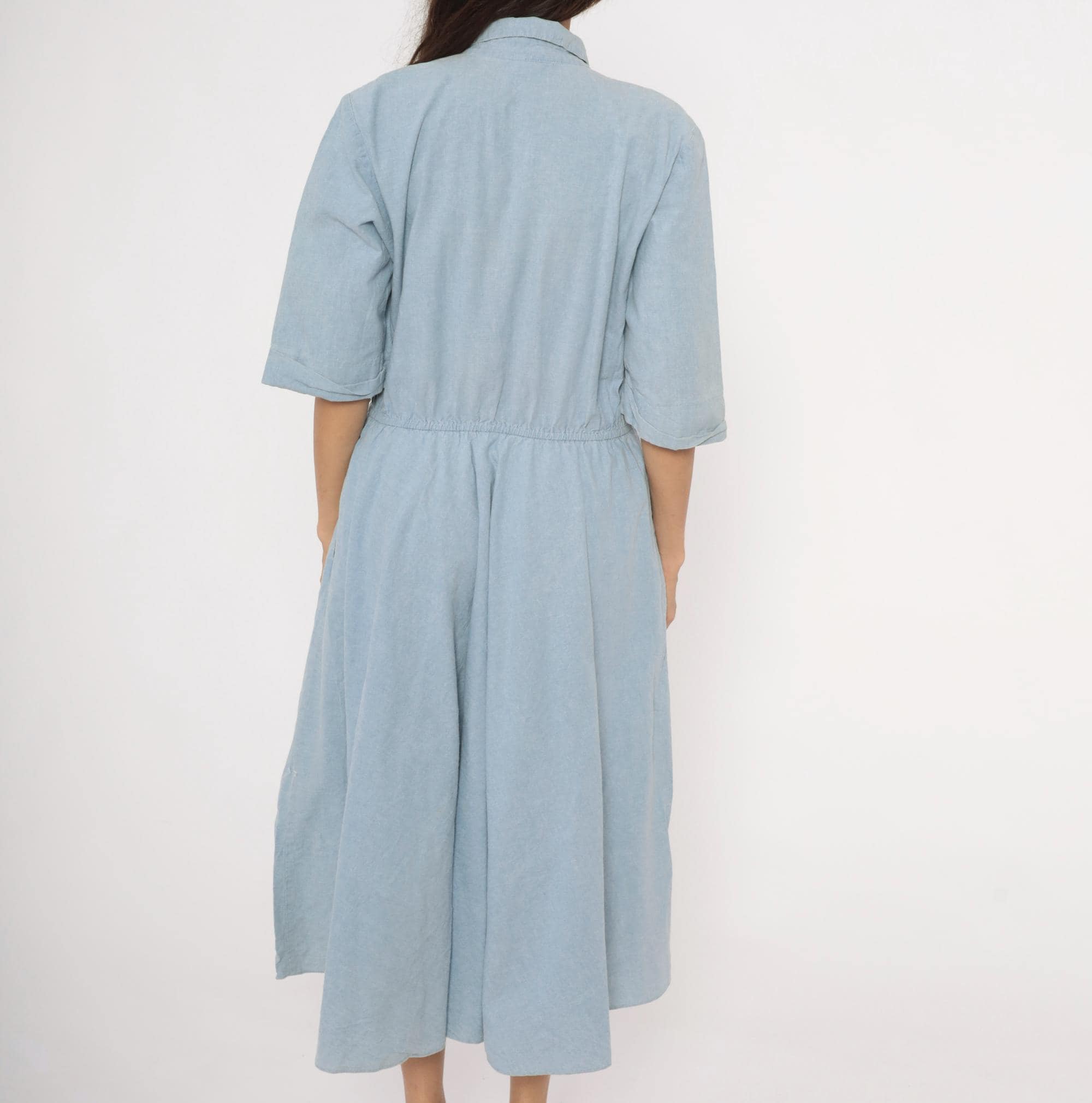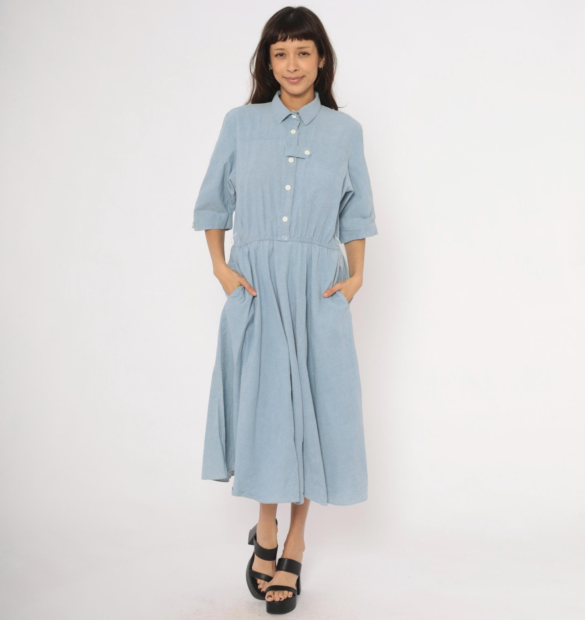 80s powder blue shirt dress from The American Shirt Dress with a pointed collar, front button placket, and chest pocket. Half-length cuffed sleeves, elastic gathered waist, and a full flared skirt falling to mid-calf length. Side seam pockets on both sides of the skirt.