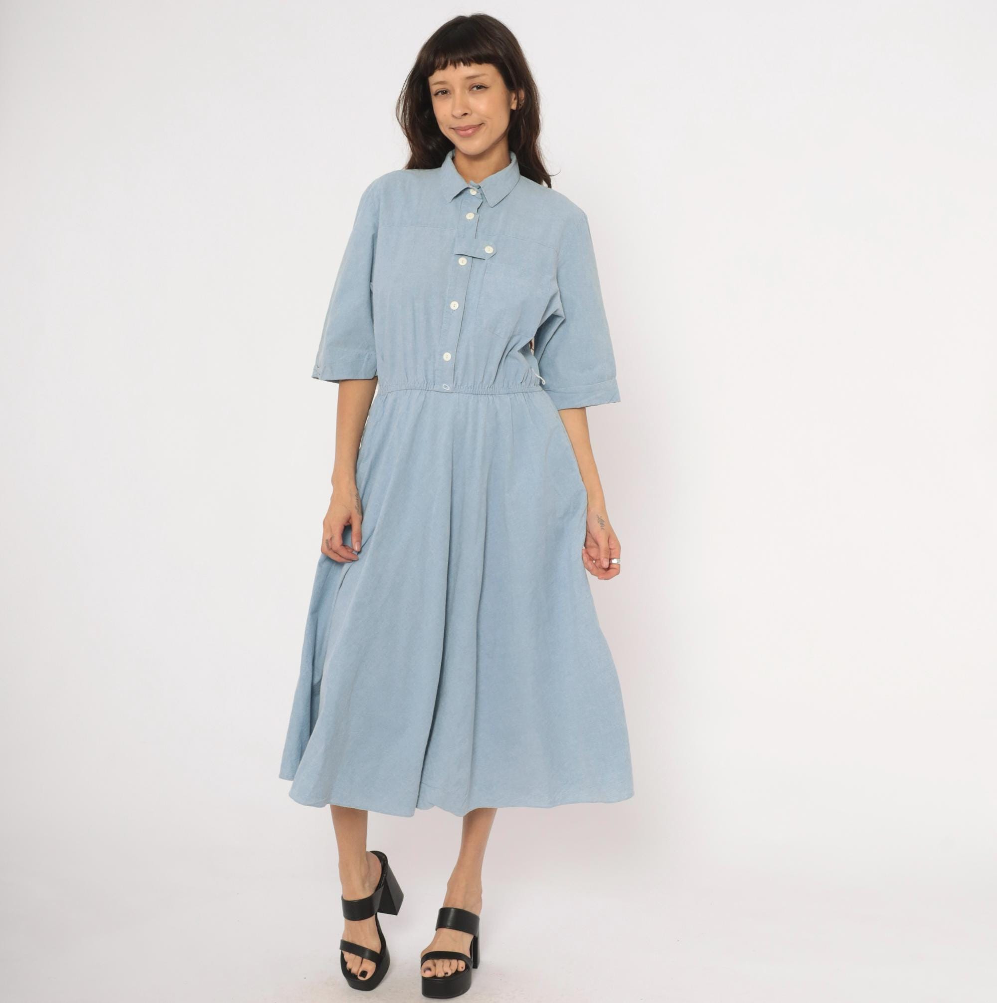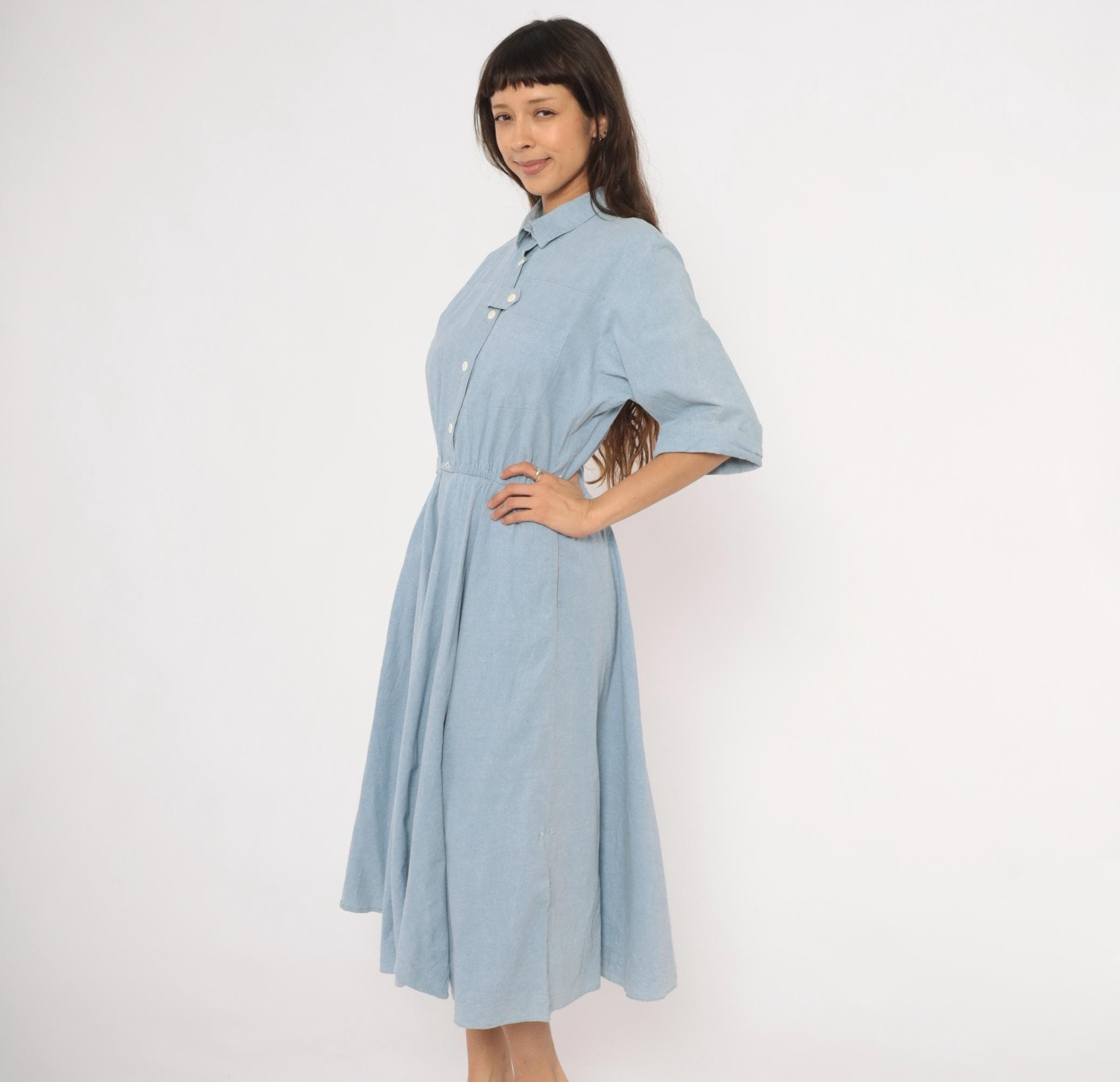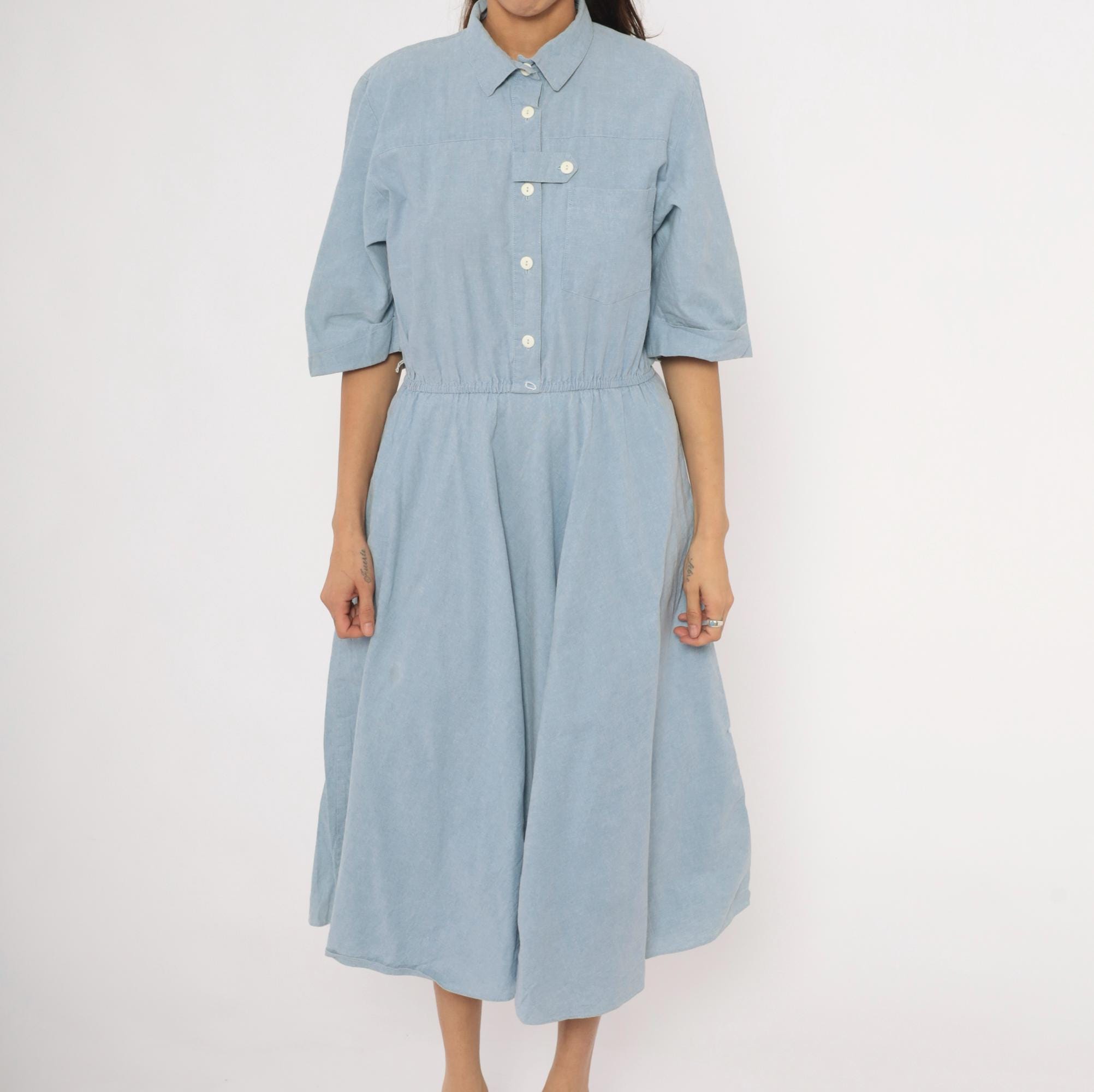 80s powder blue shirt dress from The American Shirt Dress with a pointed collar, front button placket, and chest pocket. Half-length cuffed sleeves, elastic gathered waist, and a full flared skirt falling to mid-calf length. Side seam pockets on both sides of the skirt.
