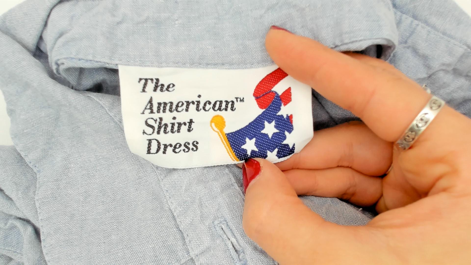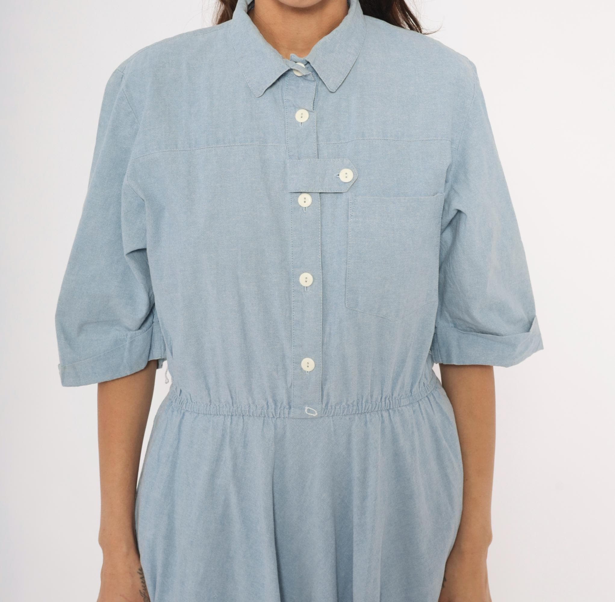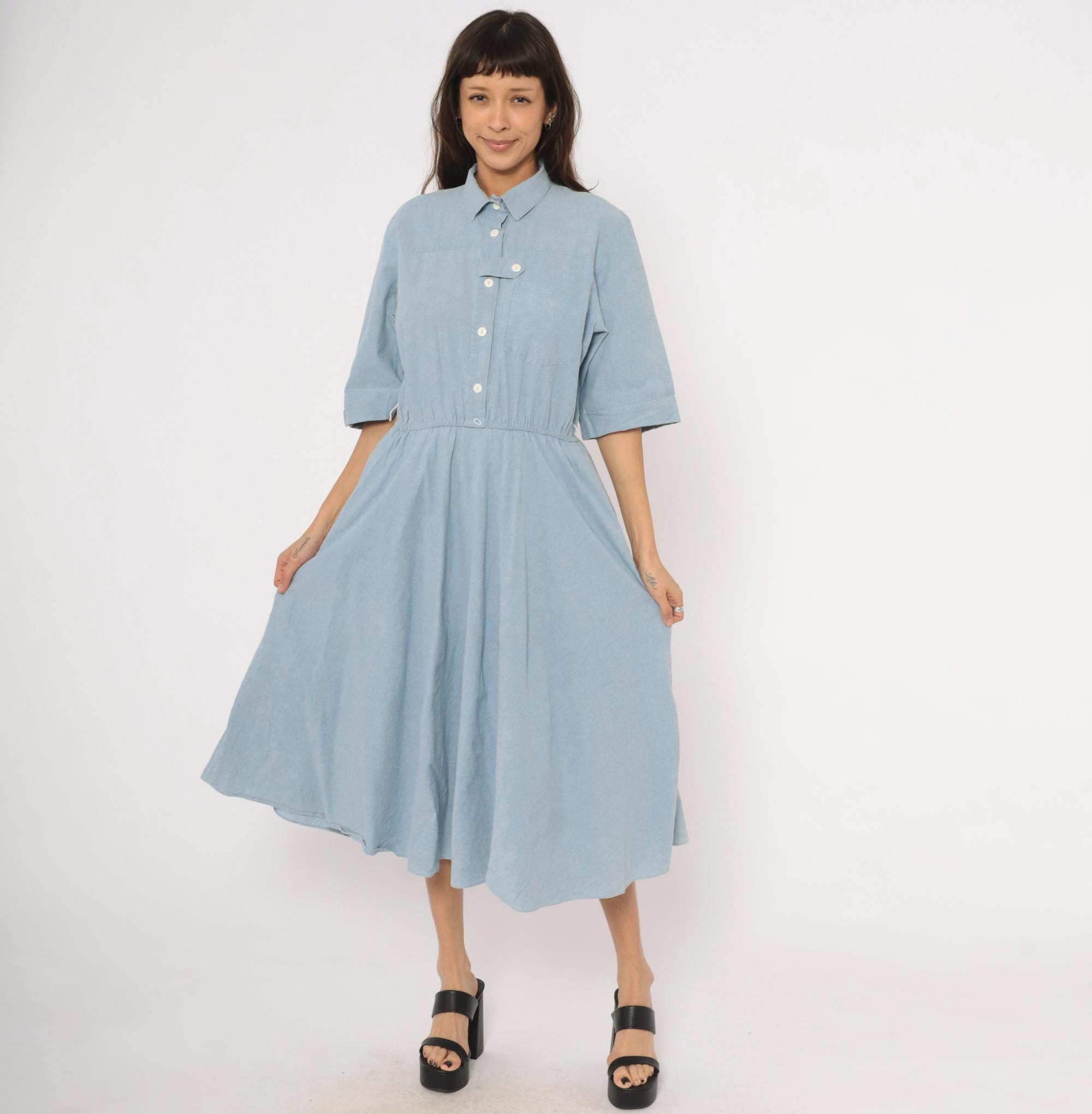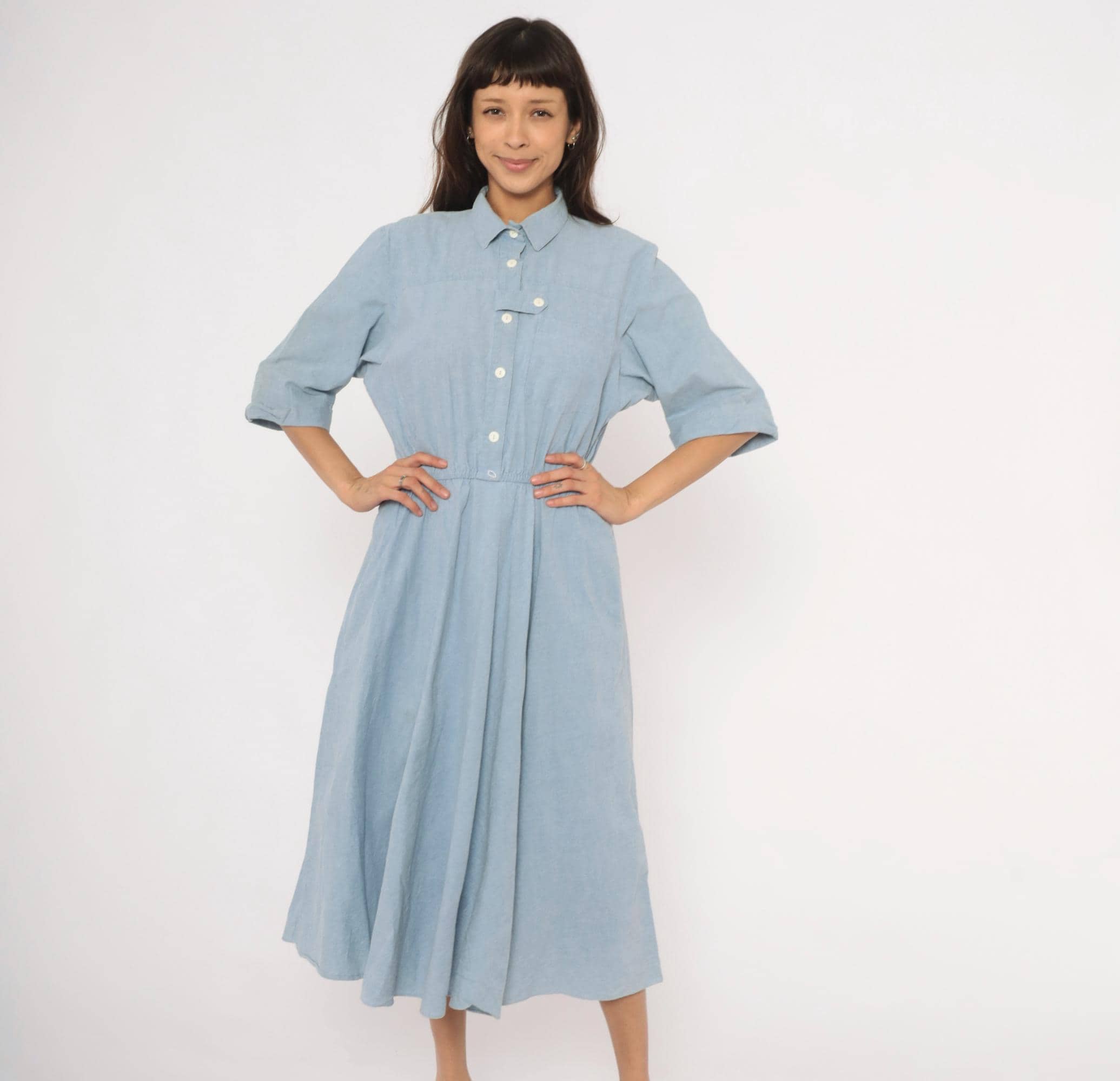 80s powder blue shirt dress from The American Shirt Dress with a pointed collar, front button placket, and chest pocket. Half-length cuffed sleeves, elastic gathered waist, and a full flared skirt falling to mid-calf length. Side seam pockets on both sides of the skirt.