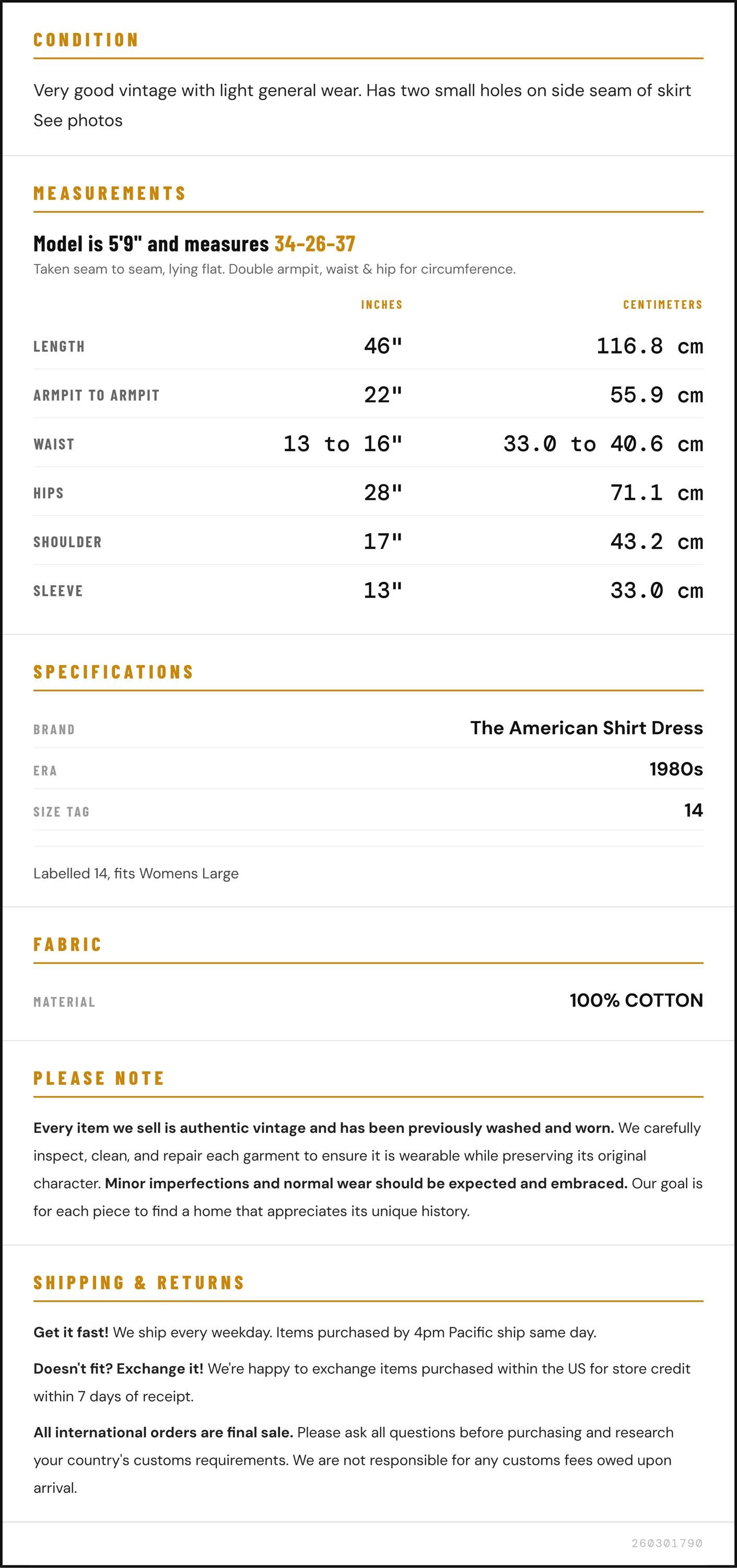 Condition: Very good vintage with light general wear. Has two small holes on side seam of skirt See photos