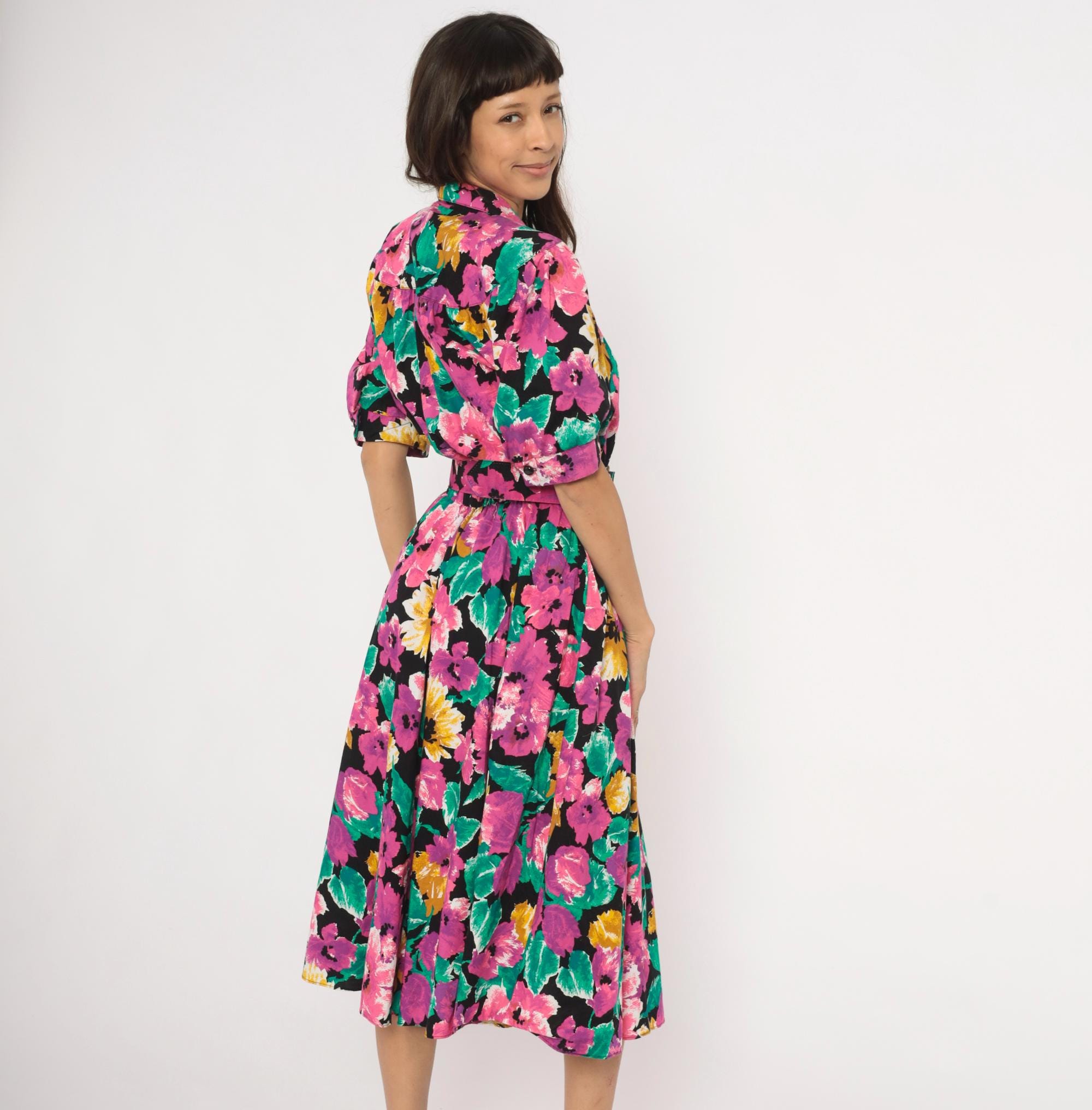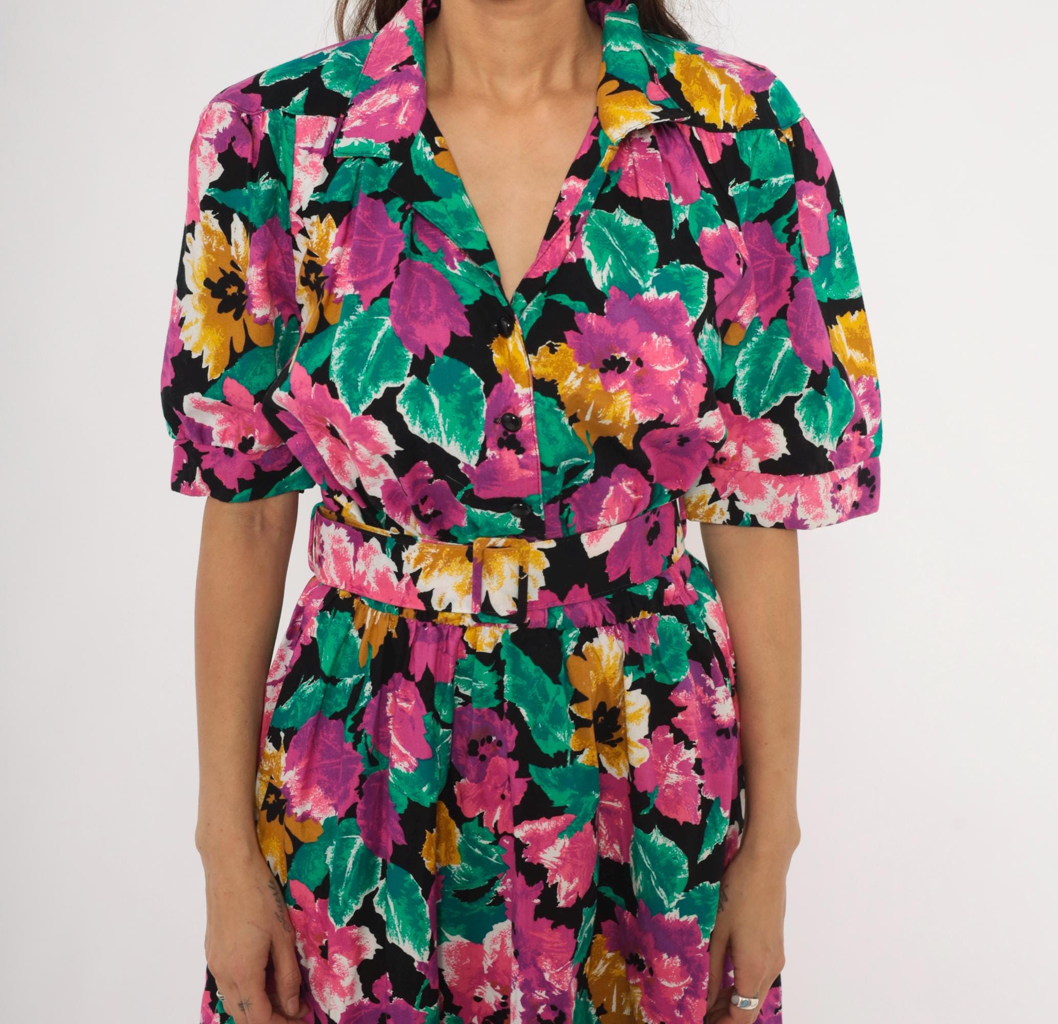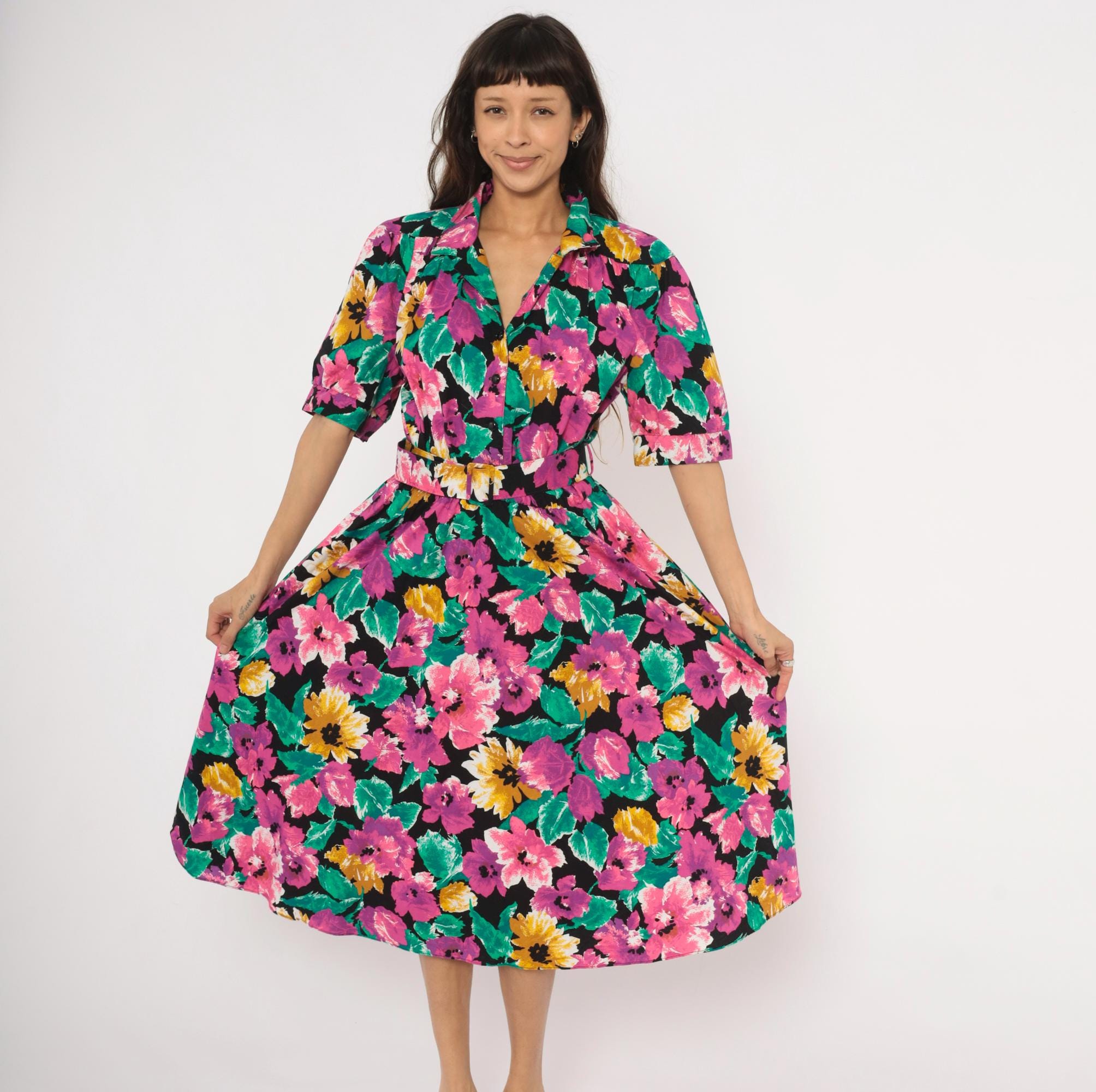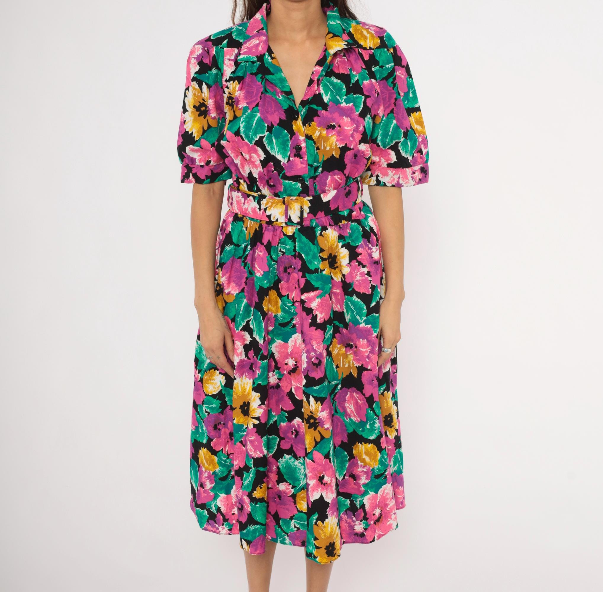 90s floral shirtdress from Ultra Dress with a bold allover flower print in magenta, pink, teal green, gold, and black. Notched lapel collar, button front closure, short cuffed sleeves, and a matching fabric belt with a rectangular buckle. Gathered waist with a full, flared midi-length skirt that falls to mid-calf.