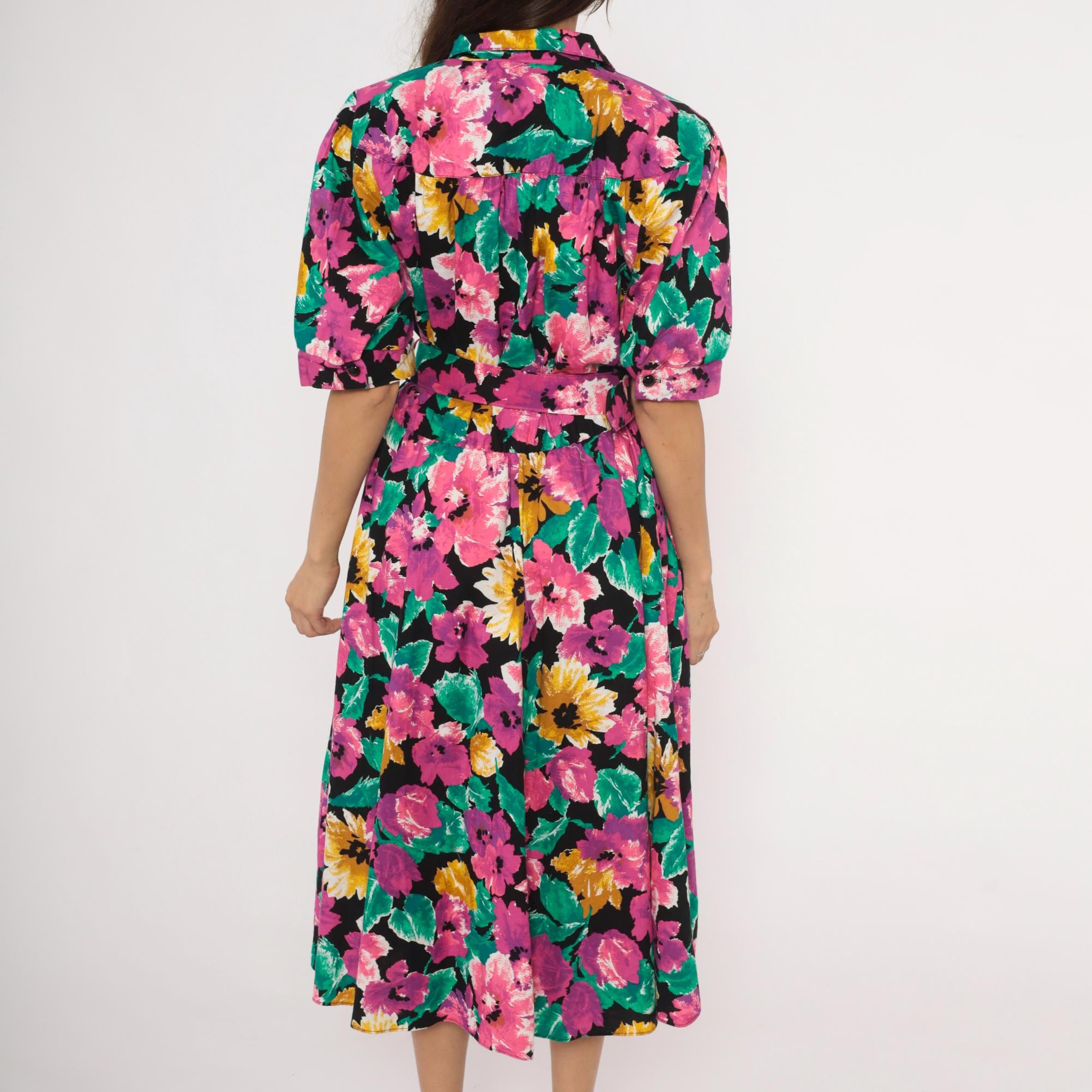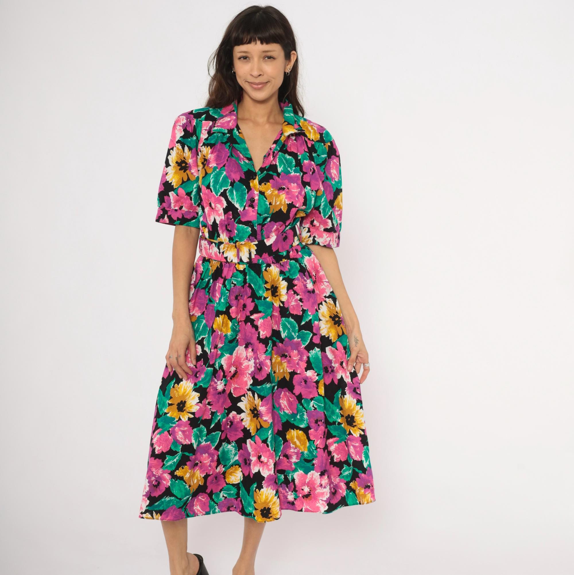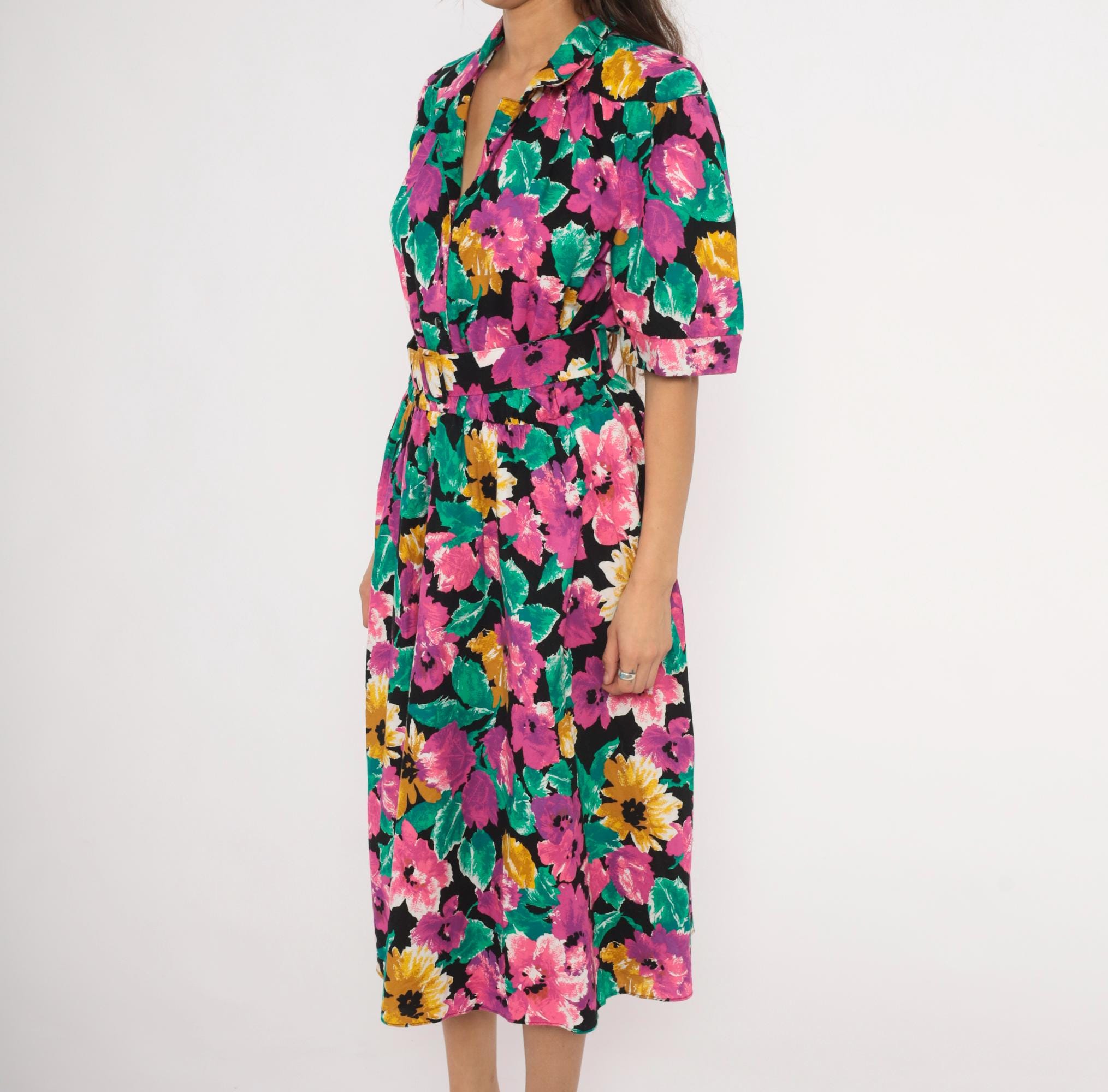 90s floral shirtdress from Ultra Dress with a bold allover flower print in magenta, pink, teal green, gold, and black. Notched lapel collar, button front closure, short cuffed sleeves, and a matching fabric belt with a rectangular buckle. Gathered waist with a full, flared midi-length skirt that falls to mid-calf.
