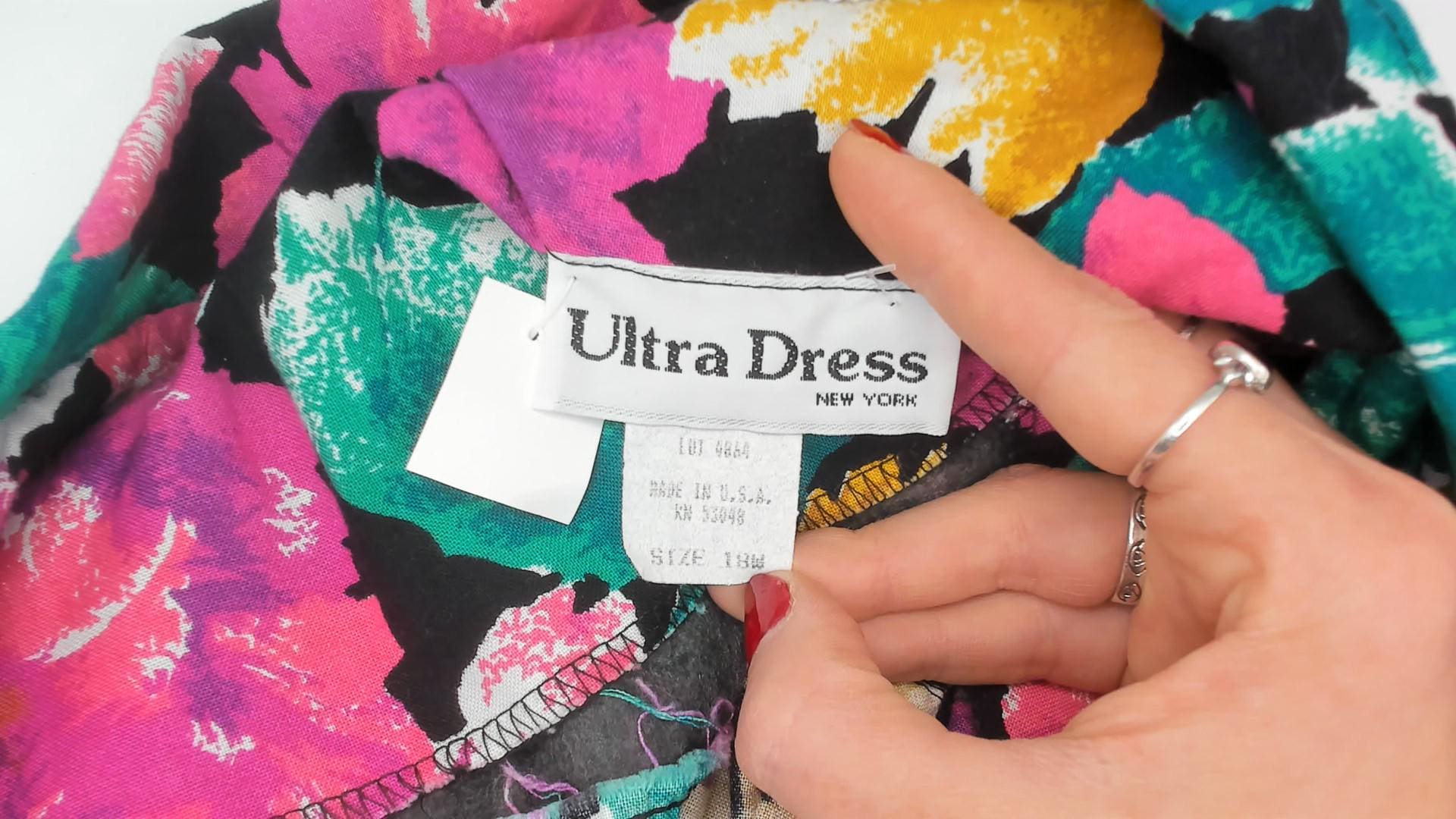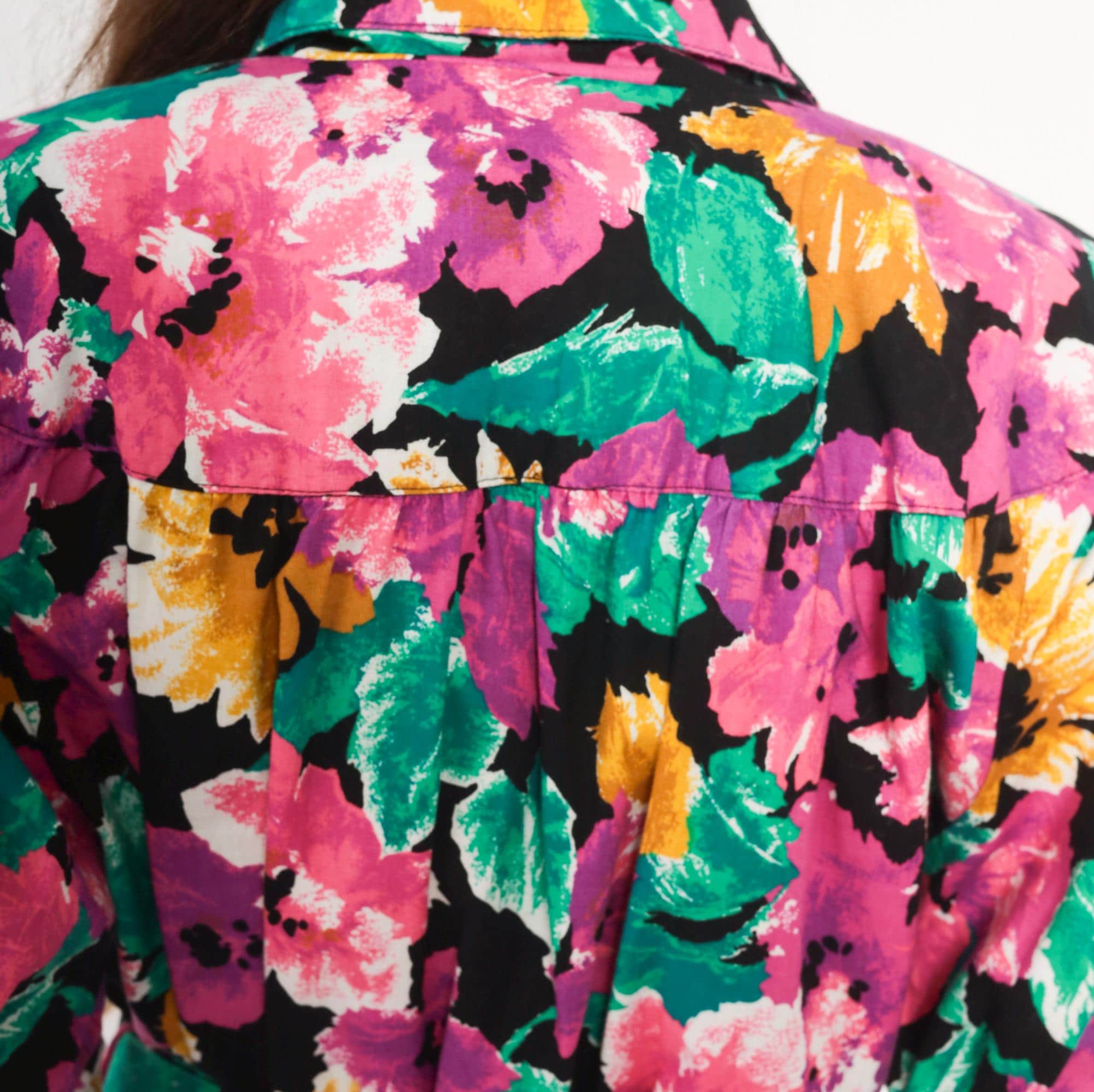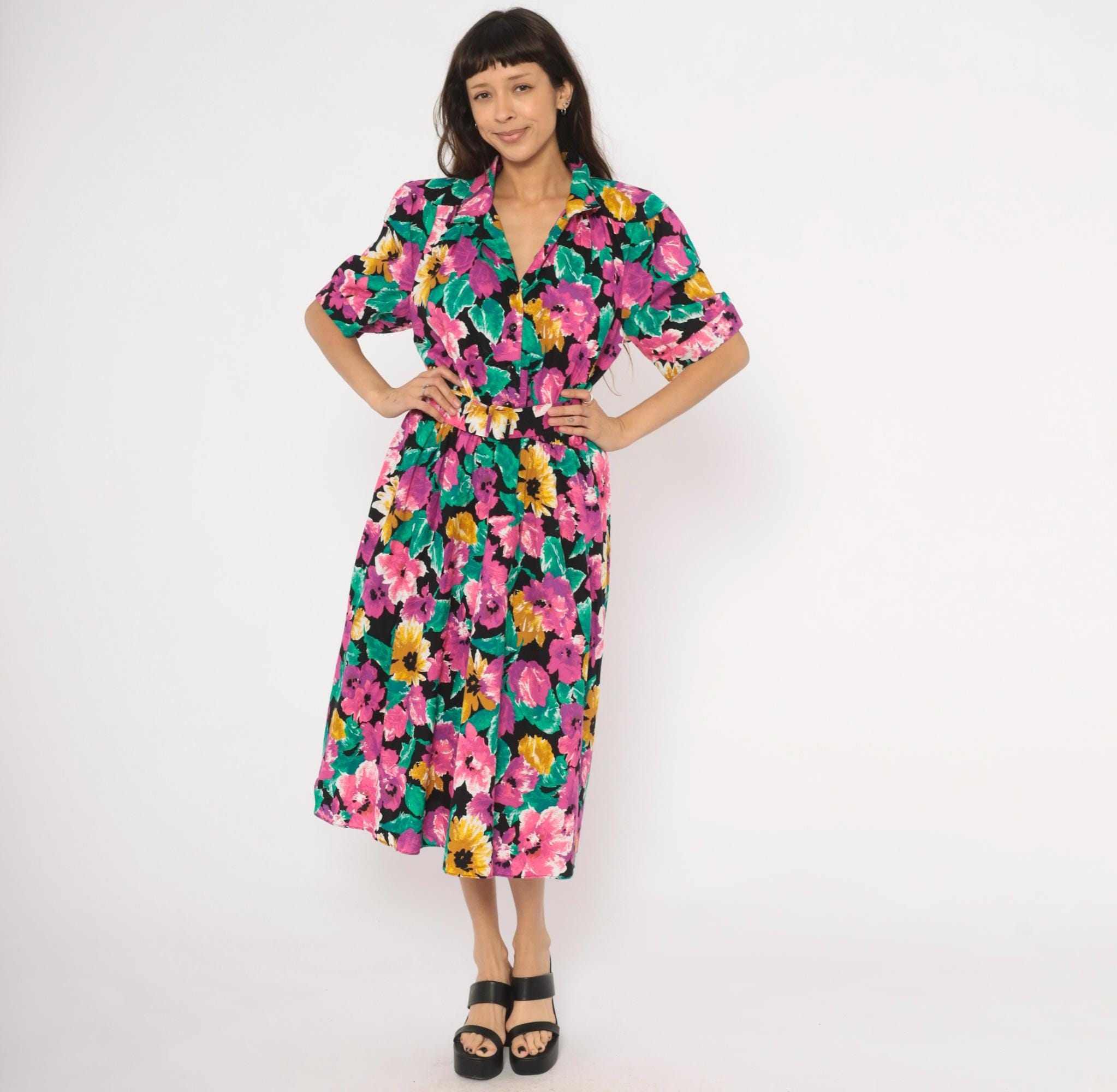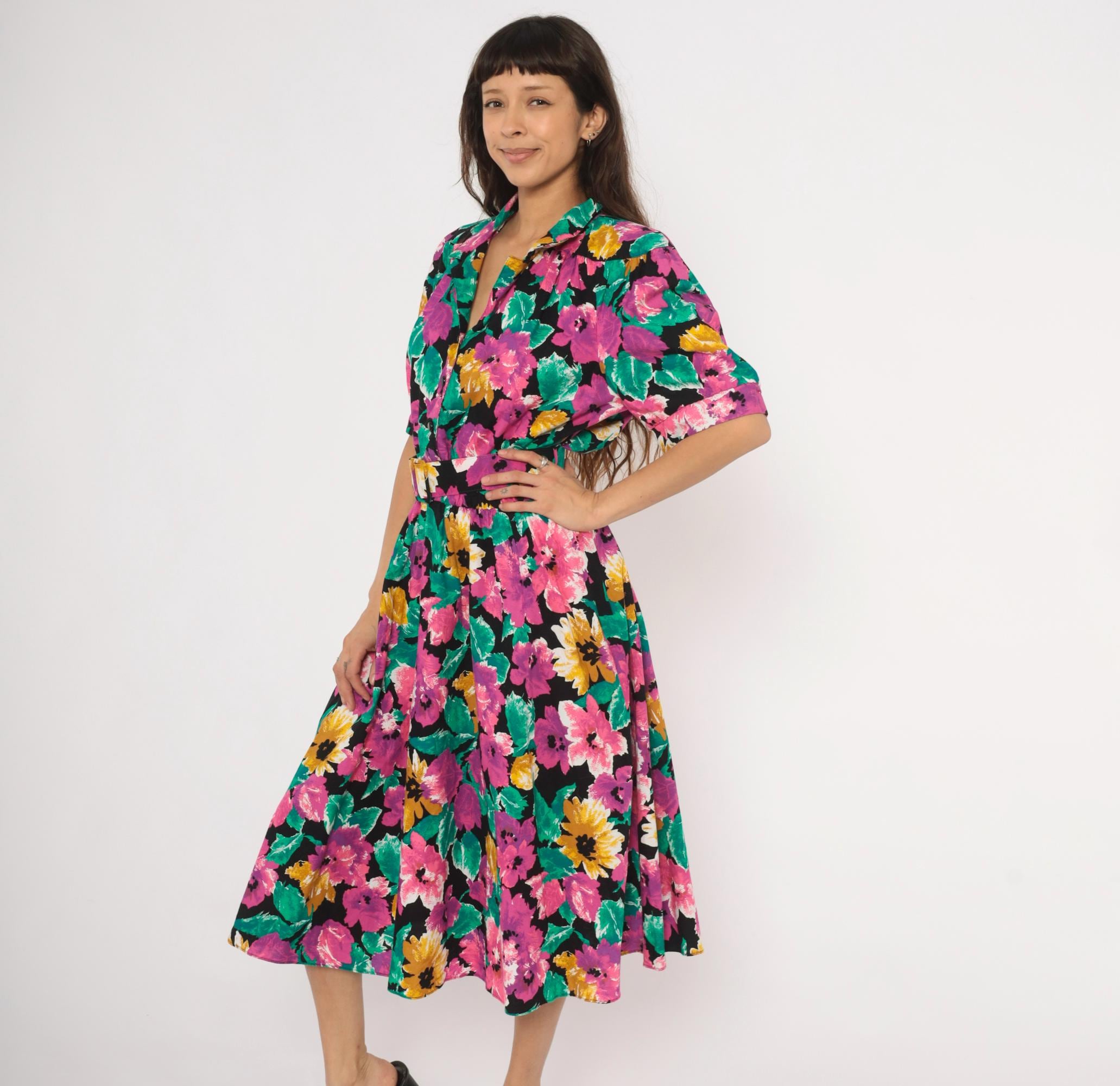 90s floral shirtdress from Ultra Dress with a bold allover flower print in magenta, pink, teal green, gold, and black. Notched lapel collar, button front closure, short cuffed sleeves, and a matching fabric belt with a rectangular buckle. Gathered waist with a full, flared midi-length skirt that falls to mid-calf.