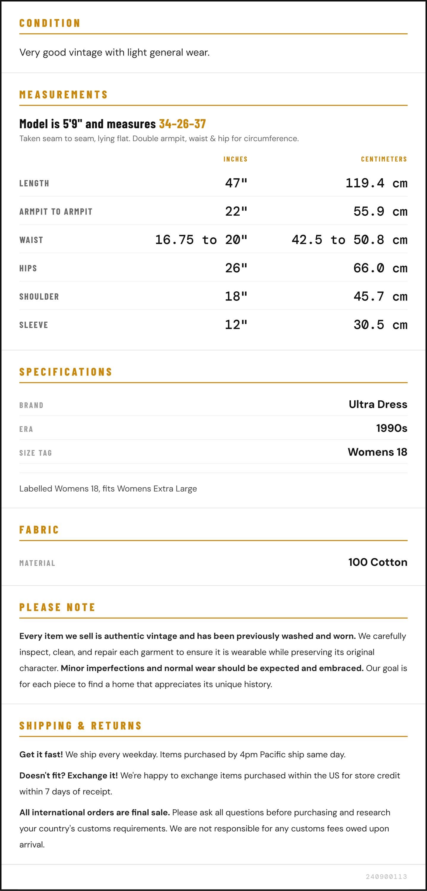 Measurements are taken laying flat and should be doubled where applicable. The "best fits" size is just an estimate, and vintage sizing can vary from modern sizing. Please use measurements to ensure proper fit. The best thing to do is measure a similar item of your own, and compare. When an item has stretch, we will list the unstretched dimensions with the stretched measurement afterwards.