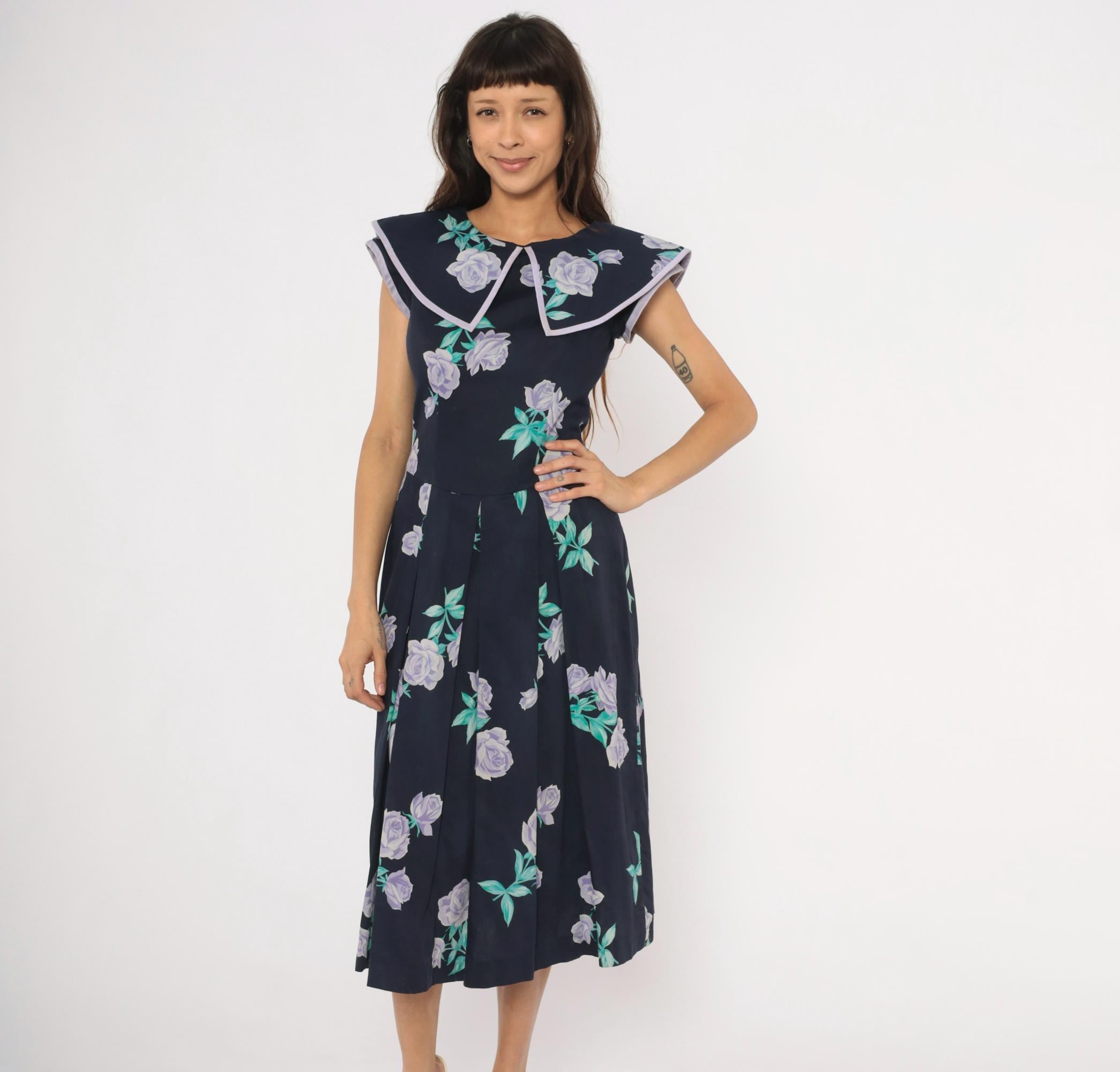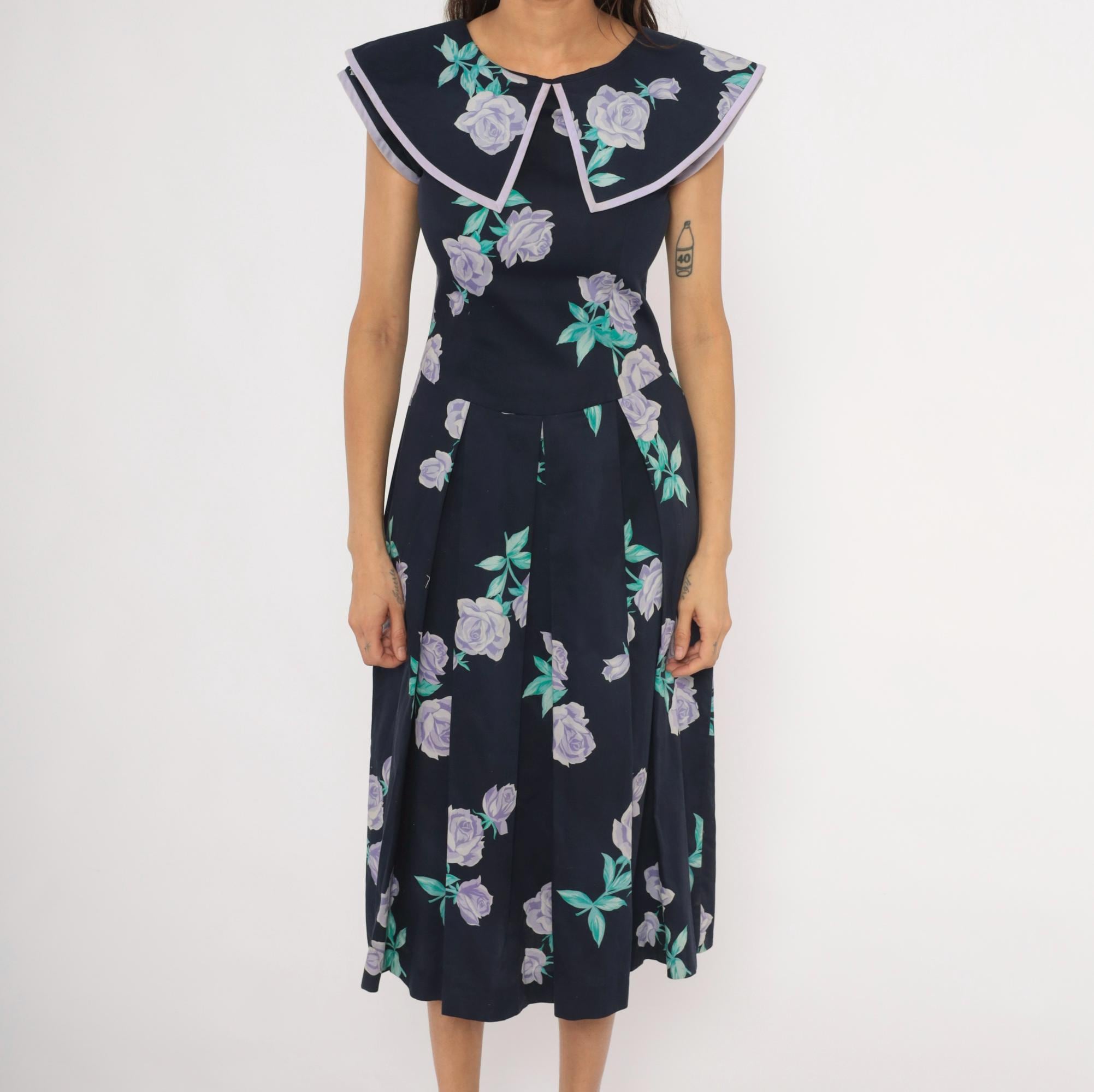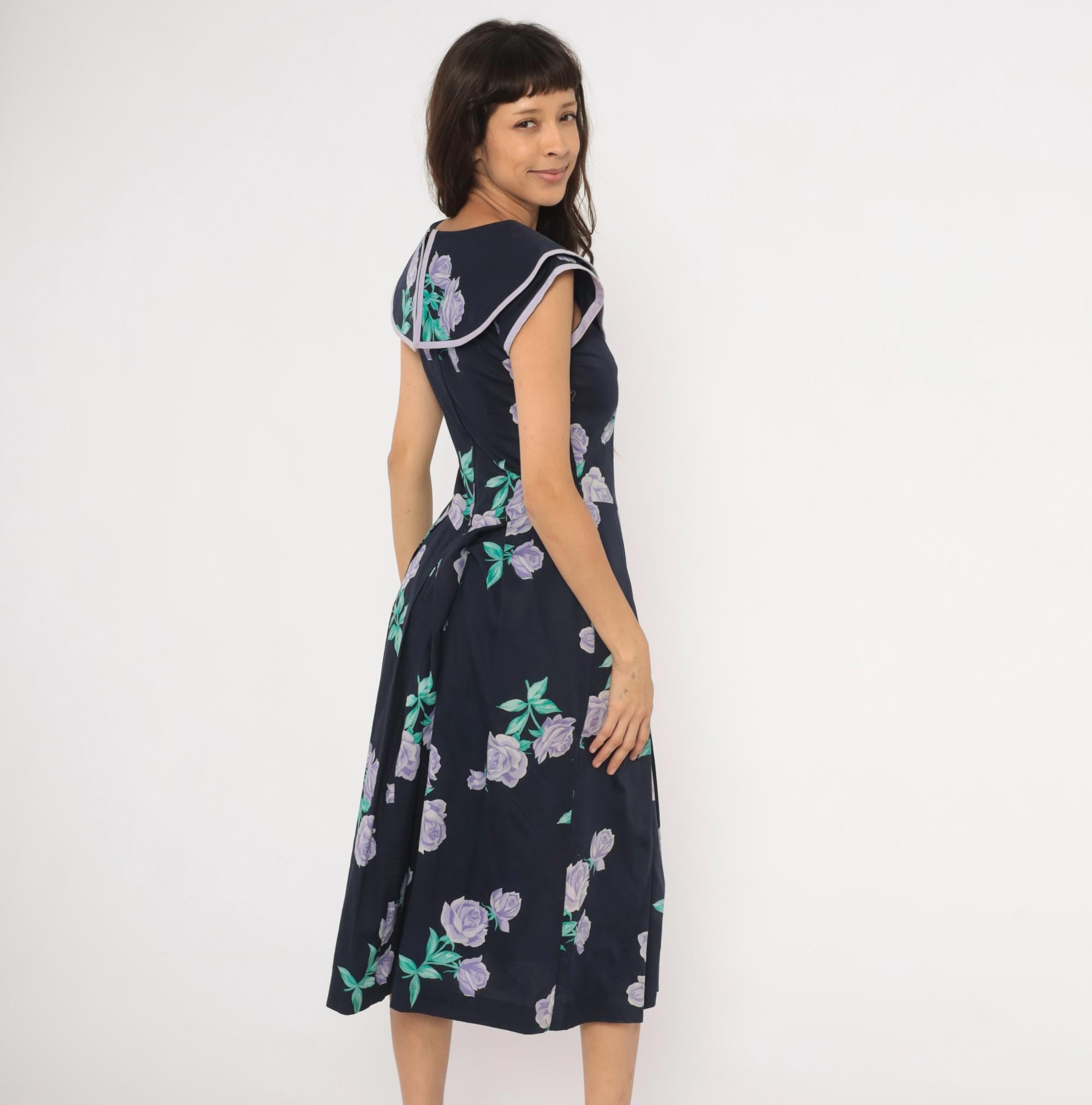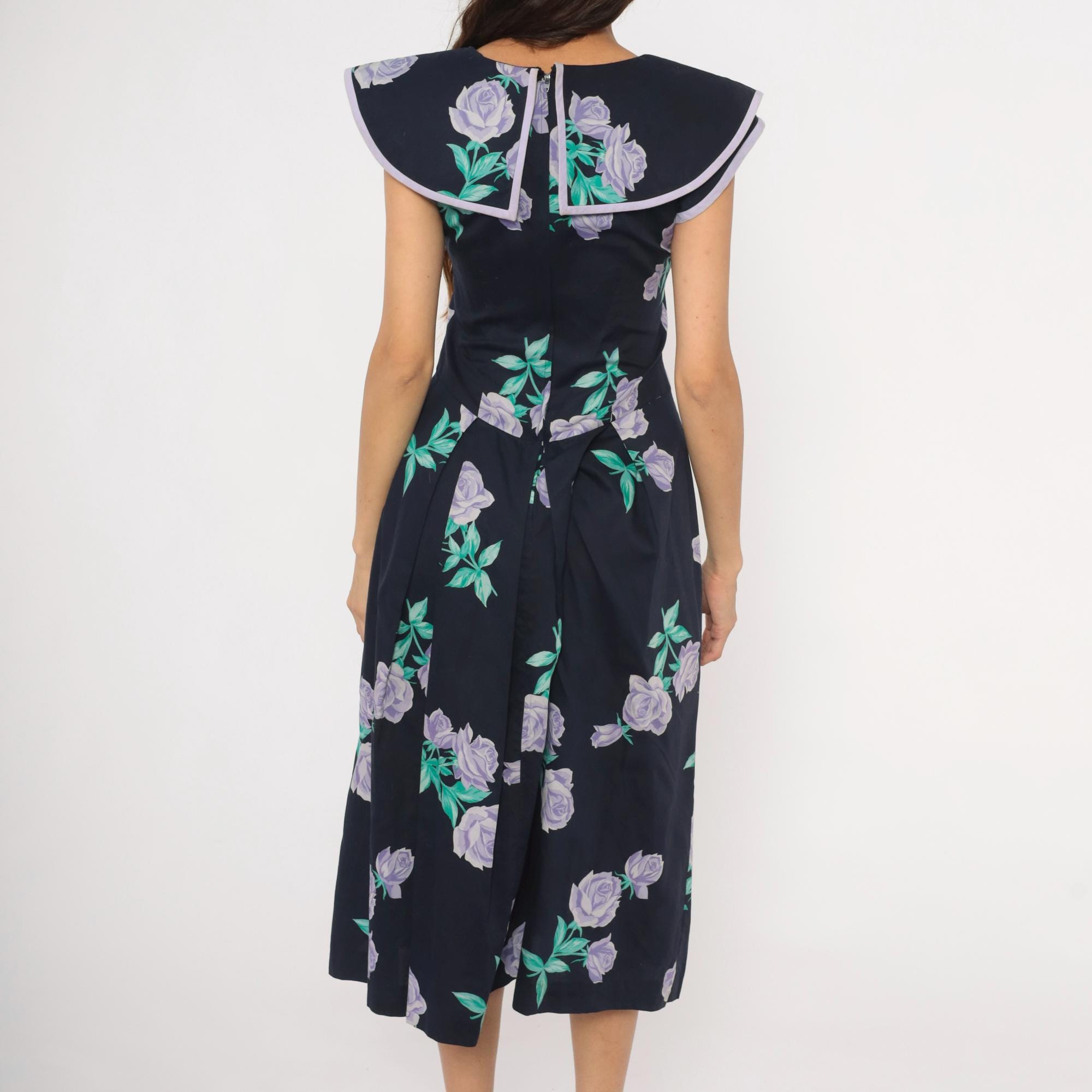 80s navy cotton dress from Kathryn Conover with lavender and purple rose print scattered across the fabric, accented by teal-green leaves. Wide sailor-style collar with pointed front and lilac piping trim extends over the shoulders. Fitted bodice with a natural waist seam, pleated A-line skirt falling to mid-calf, and back zipper closure. Sleeveless cut with cap-like coverage from the oversized collar.